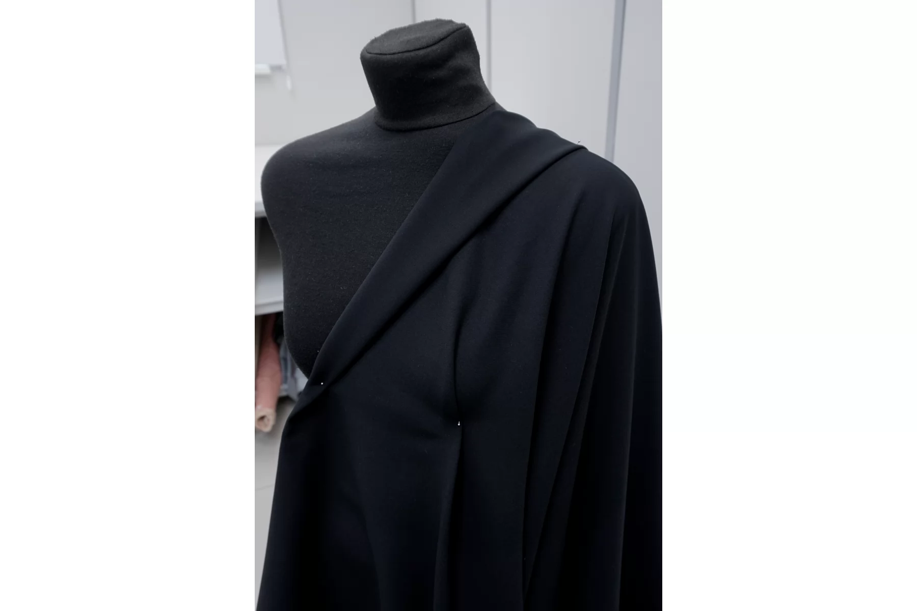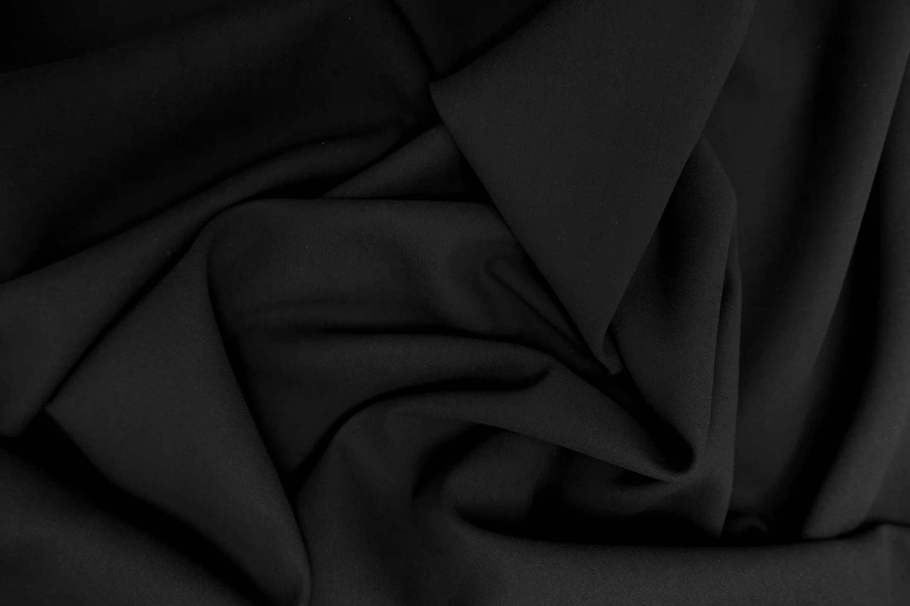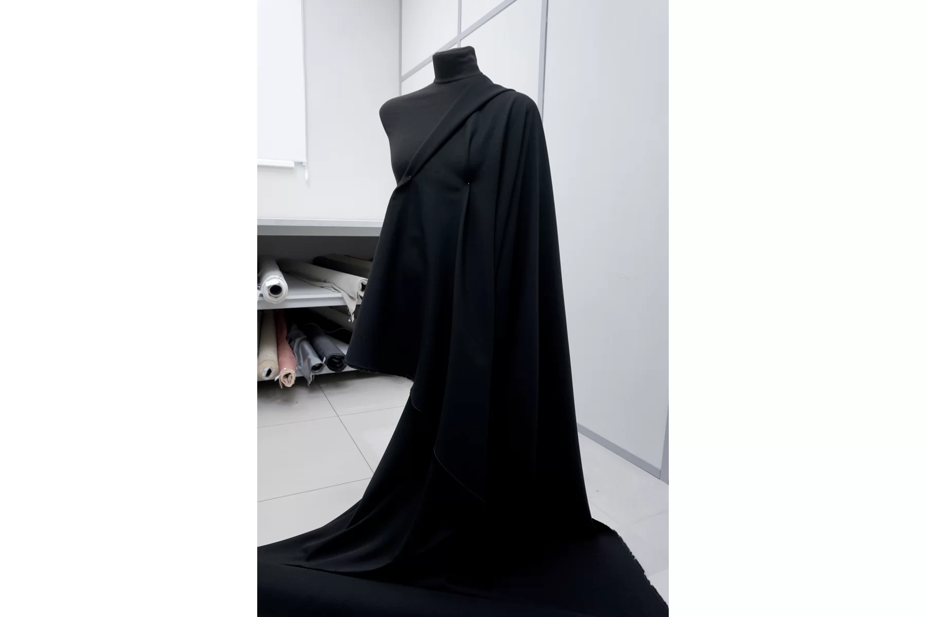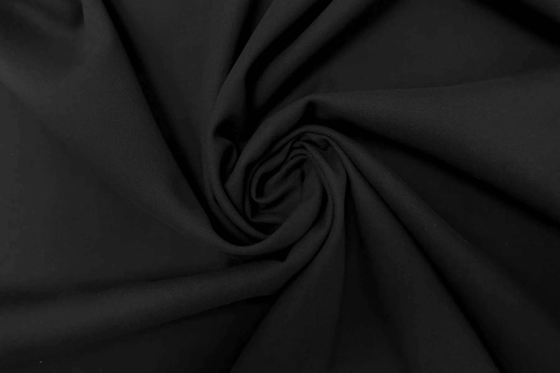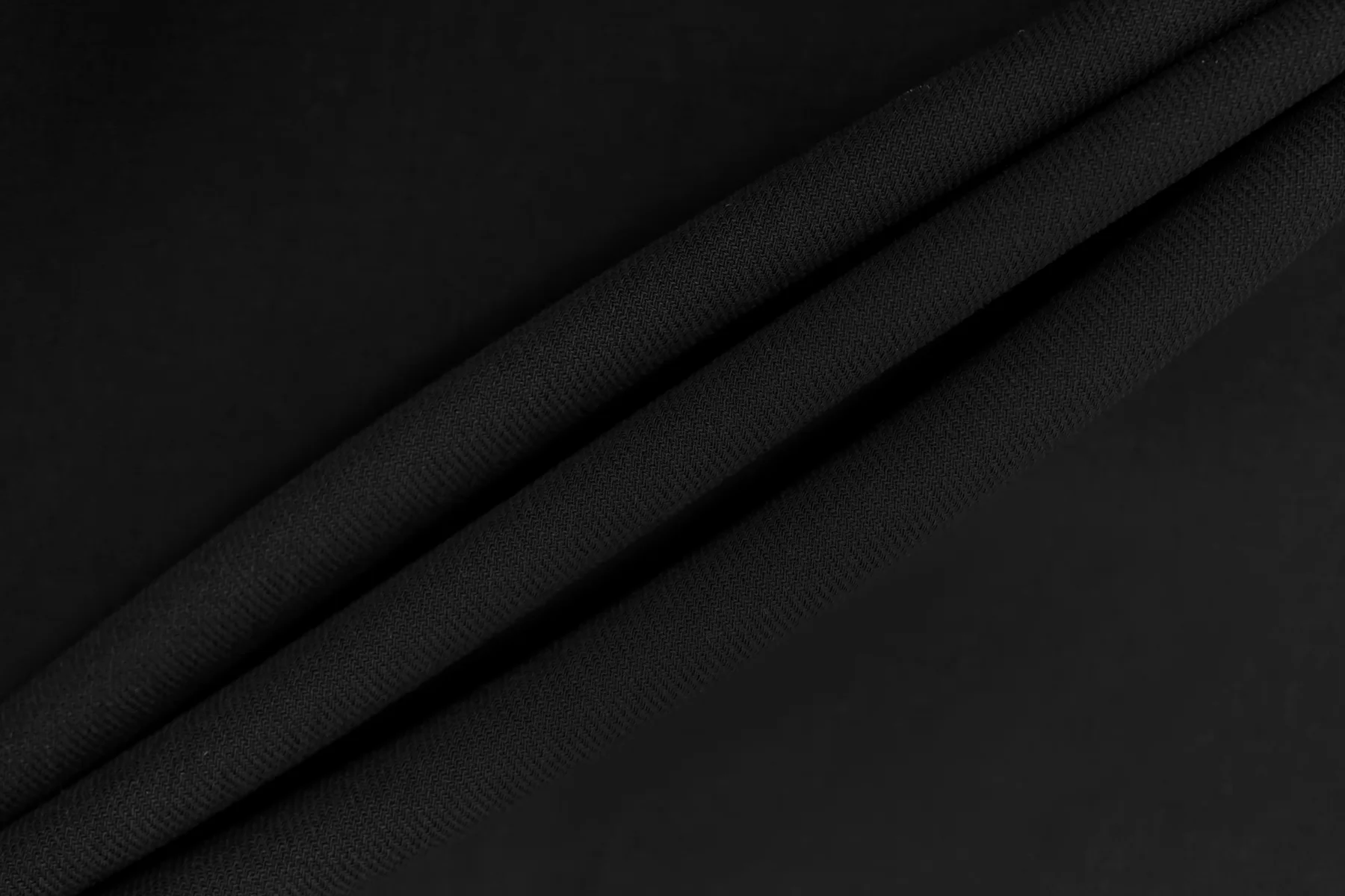 Прекрасная вискоза костюмно-плательной плотности диагонального плетения в чёрном цвете. Тактильно приятная, мягкая. Минимально просвечивает в один слой силуэт. в изделии заметно не будет. Немного тянется. Красиво смотрится в складках, ниспадающая. Сминается. Пластичная, умеренно держит форму. Шьем платья, юбки, брюки, костюмы мягкой формы. При необходимости используйте подкладочный материал. Обязательно учитывайте усадку 5-10%.