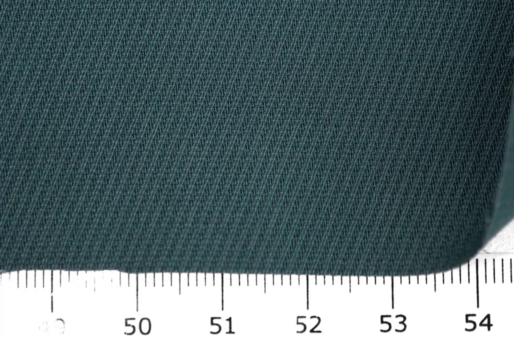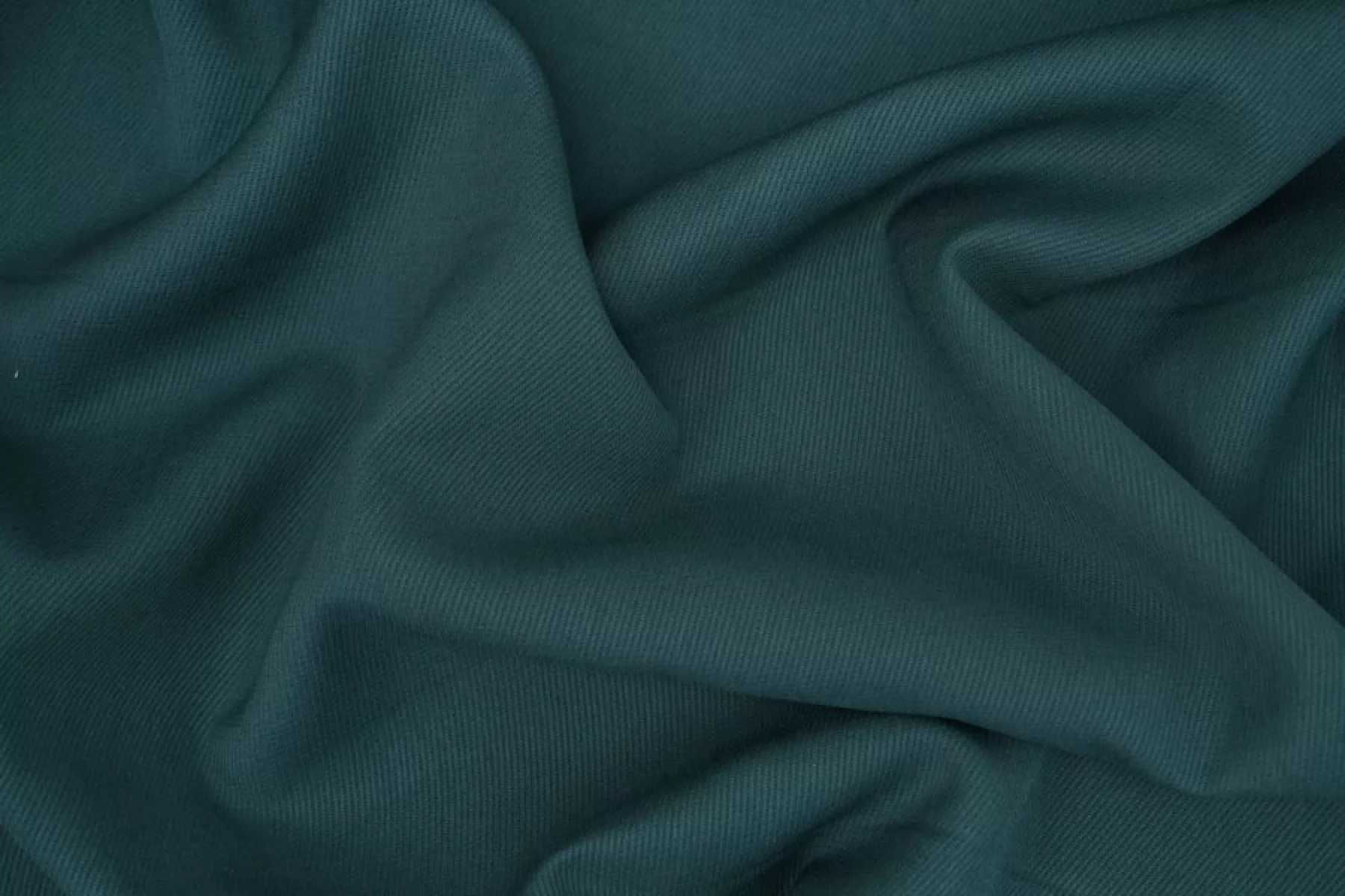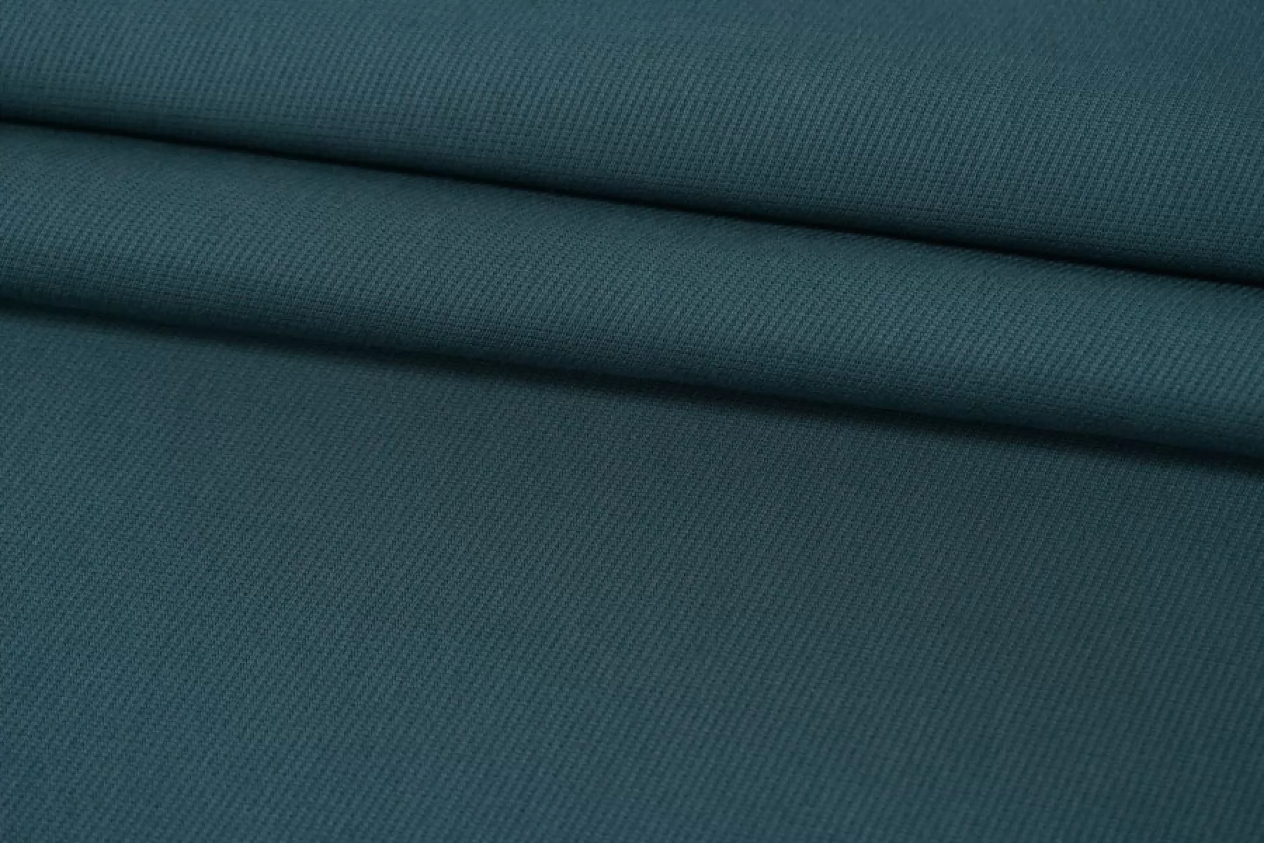 Итальянская костюмная вискоза диагонального плетения сине-зеленого оттенка. Достаточно хорошей плотности, с ярко выраженной диагональной фактурой. Пластичная, мягкая, гладкая, не тянется, не просвечивает, с матовой поверхностью. Практически не мнется. Подойдет на брючные костюмы, платья, юбки, кимоно. Учитывайте усадку порядка 5-10%.