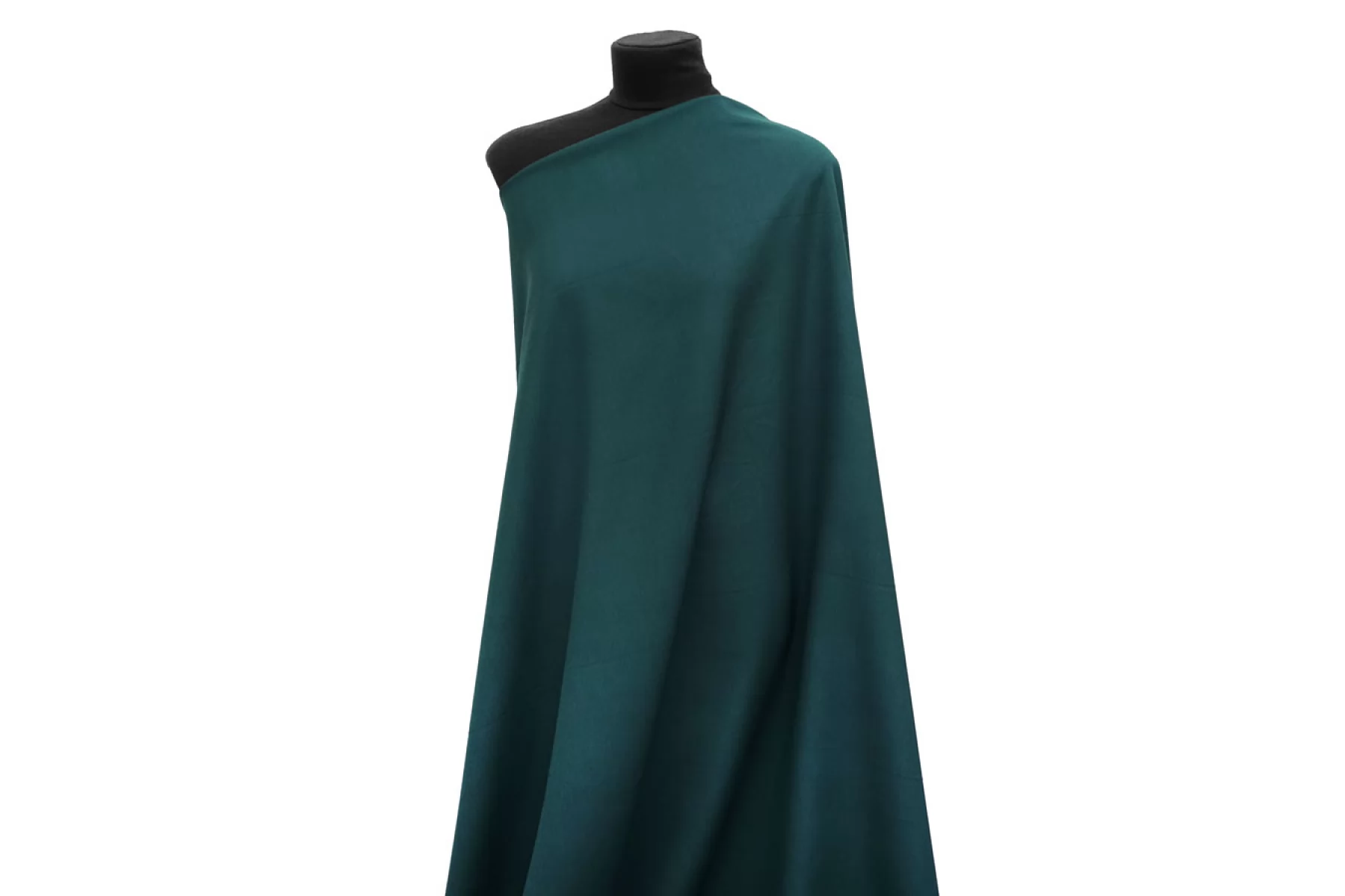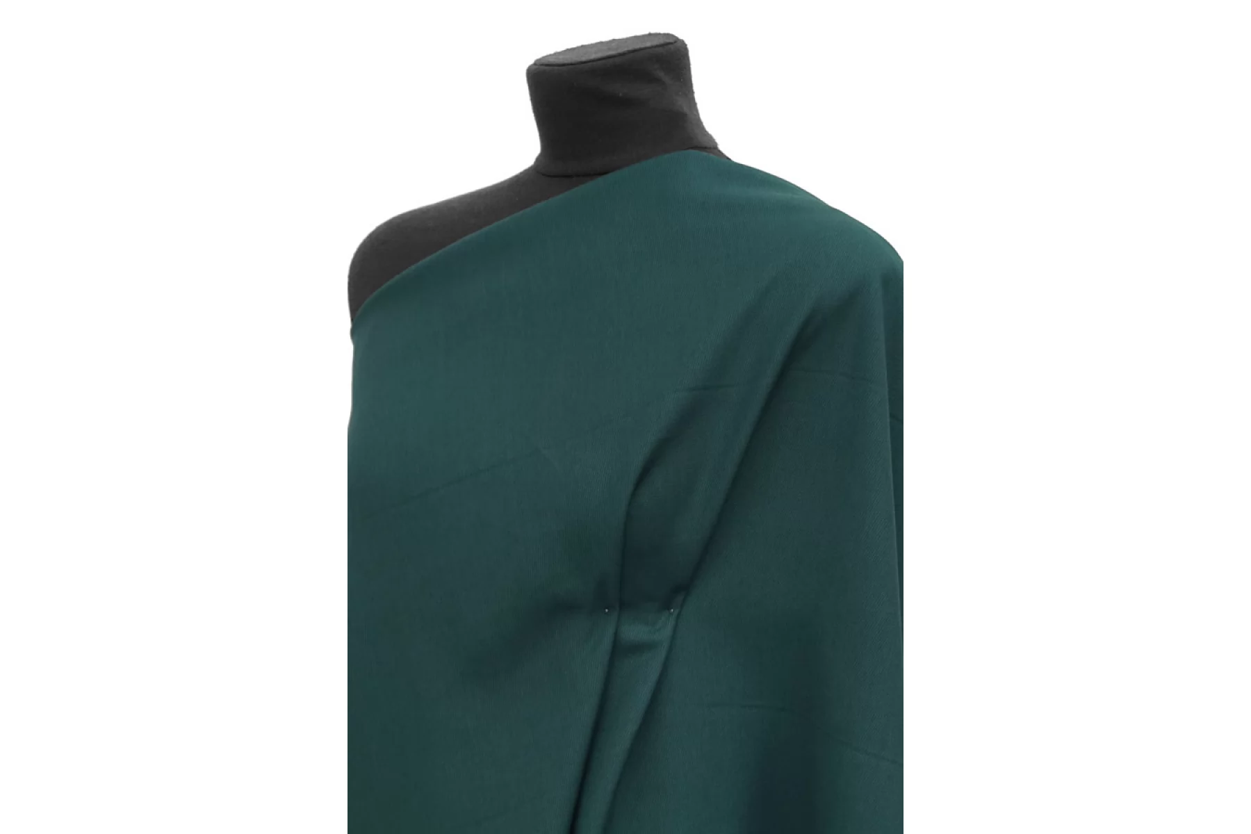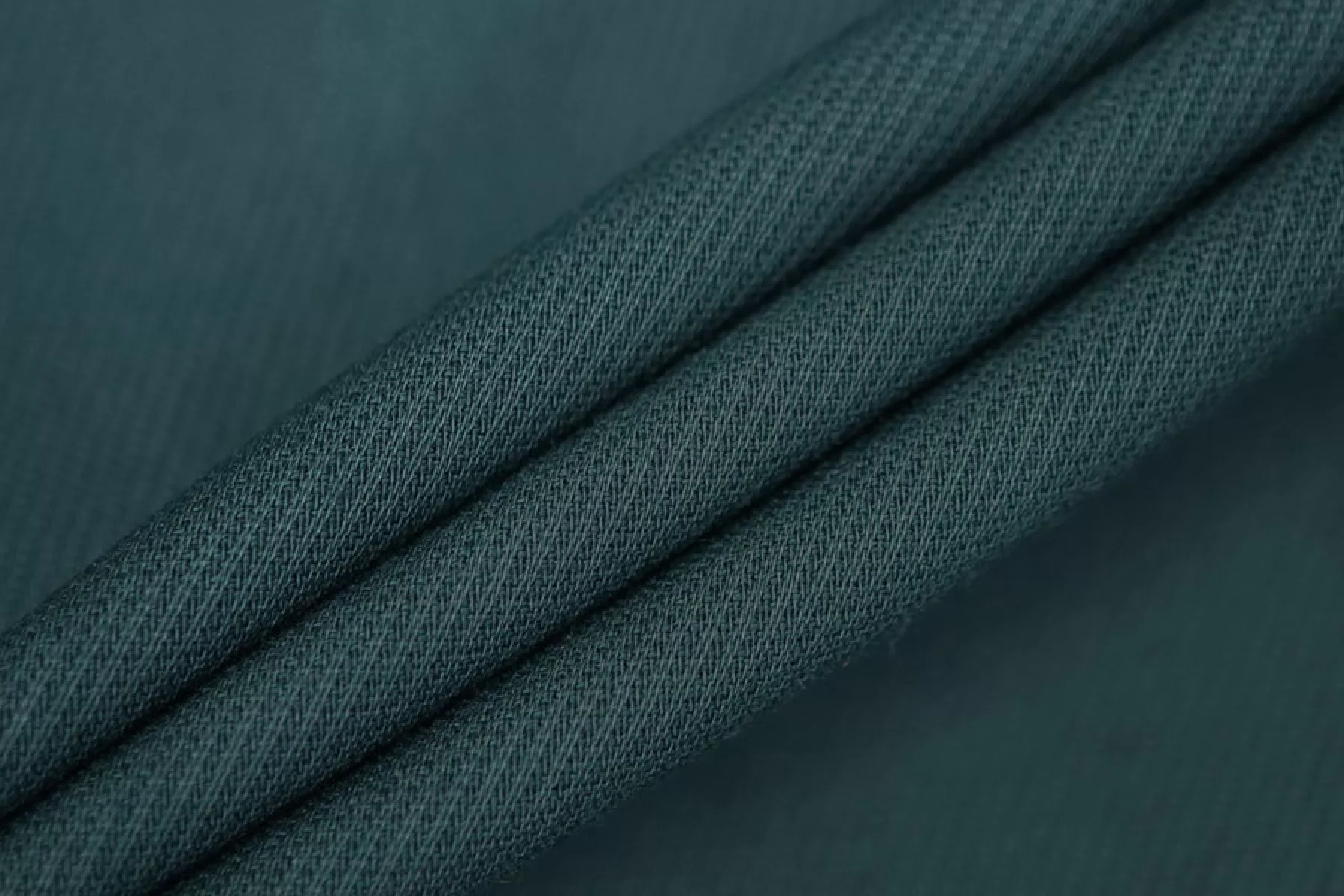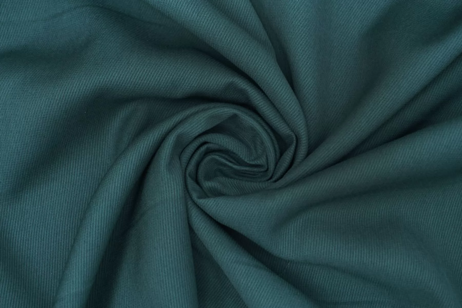 Итальянская костюмная вискоза диагонального плетения сине-зеленого оттенка. Достаточно хорошей плотности, с ярко выраженной диагональной фактурой. Пластичная, мягкая, гладкая, не тянется, не просвечивает, с матовой поверхностью. Практически не мнется. Подойдет на брючные костюмы, платья, юбки, кимоно. Учитывайте усадку порядка 5-10%.