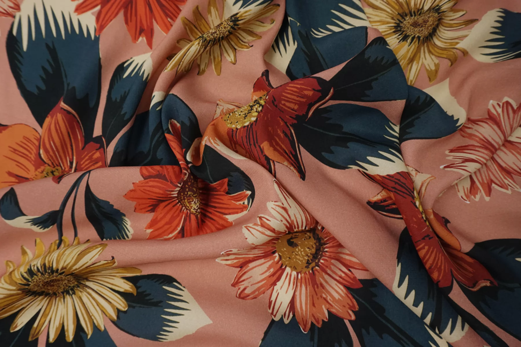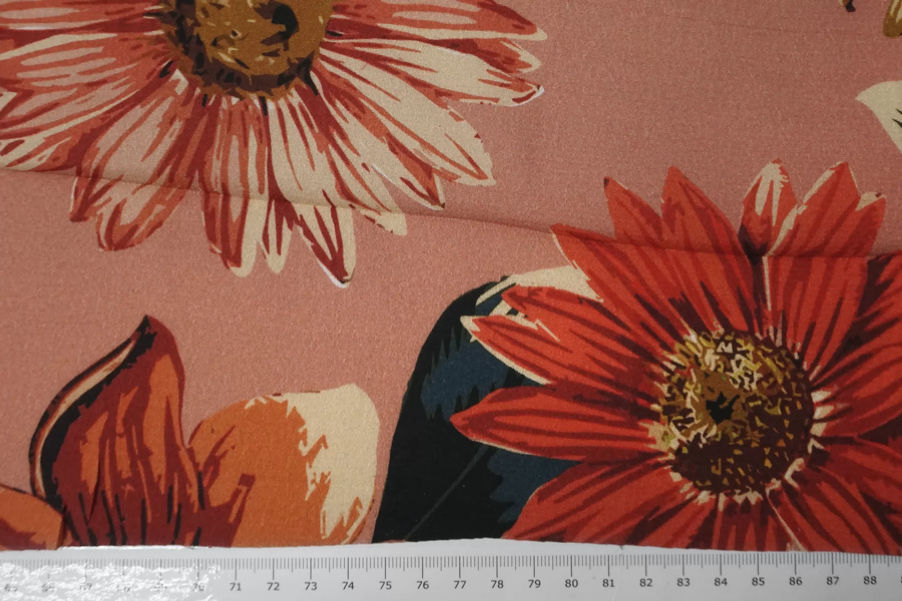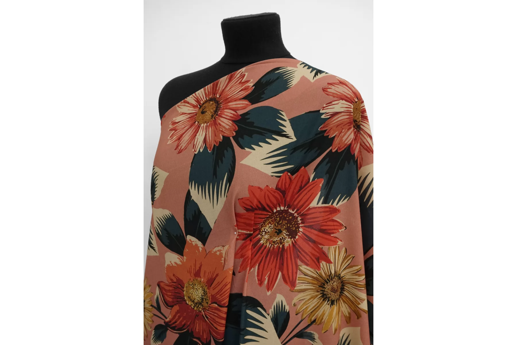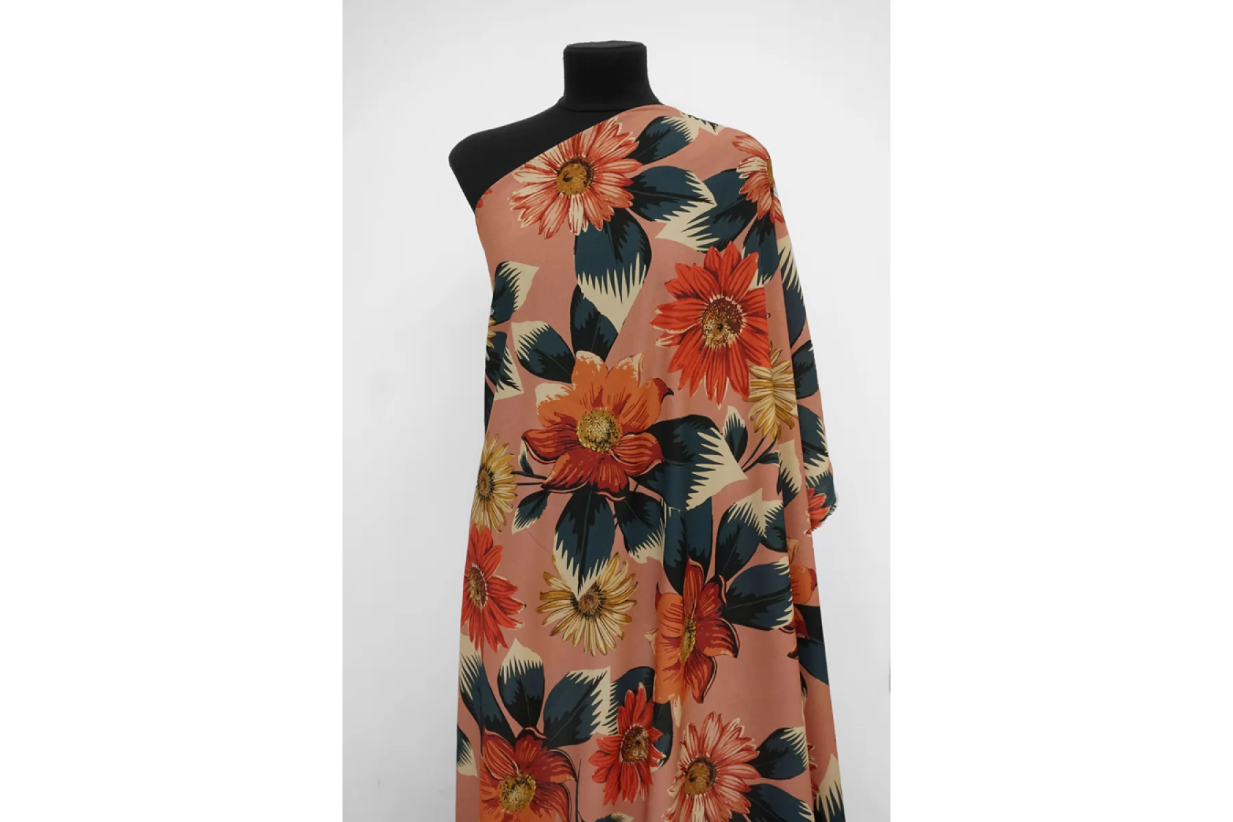 Креповая вискоза очень сложного оттенка - серо-розово-кораллового, с цветочным принтом в оттенках бледно-желтого, красного, терракотового, горчицы, серо-синего и черного. Материал тактильно слегка шероховатый, как любой креп, мягкий. Слегка просвечивает силуэт и слегка мнется. Красив в своей пластике. Пружинит за счет плетения. Форму держит совсем немного. Используем на платья, блузки или юбки. Обязательно учитывайте усадку 5-10%. При необходимости используйте подкладочный материал.