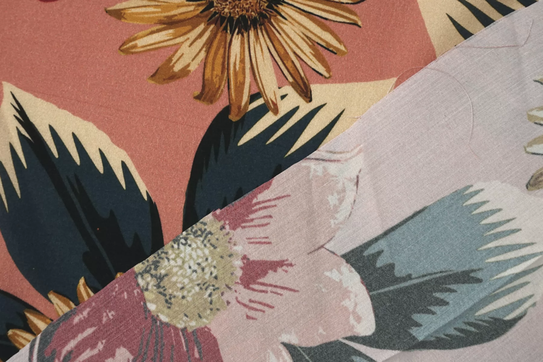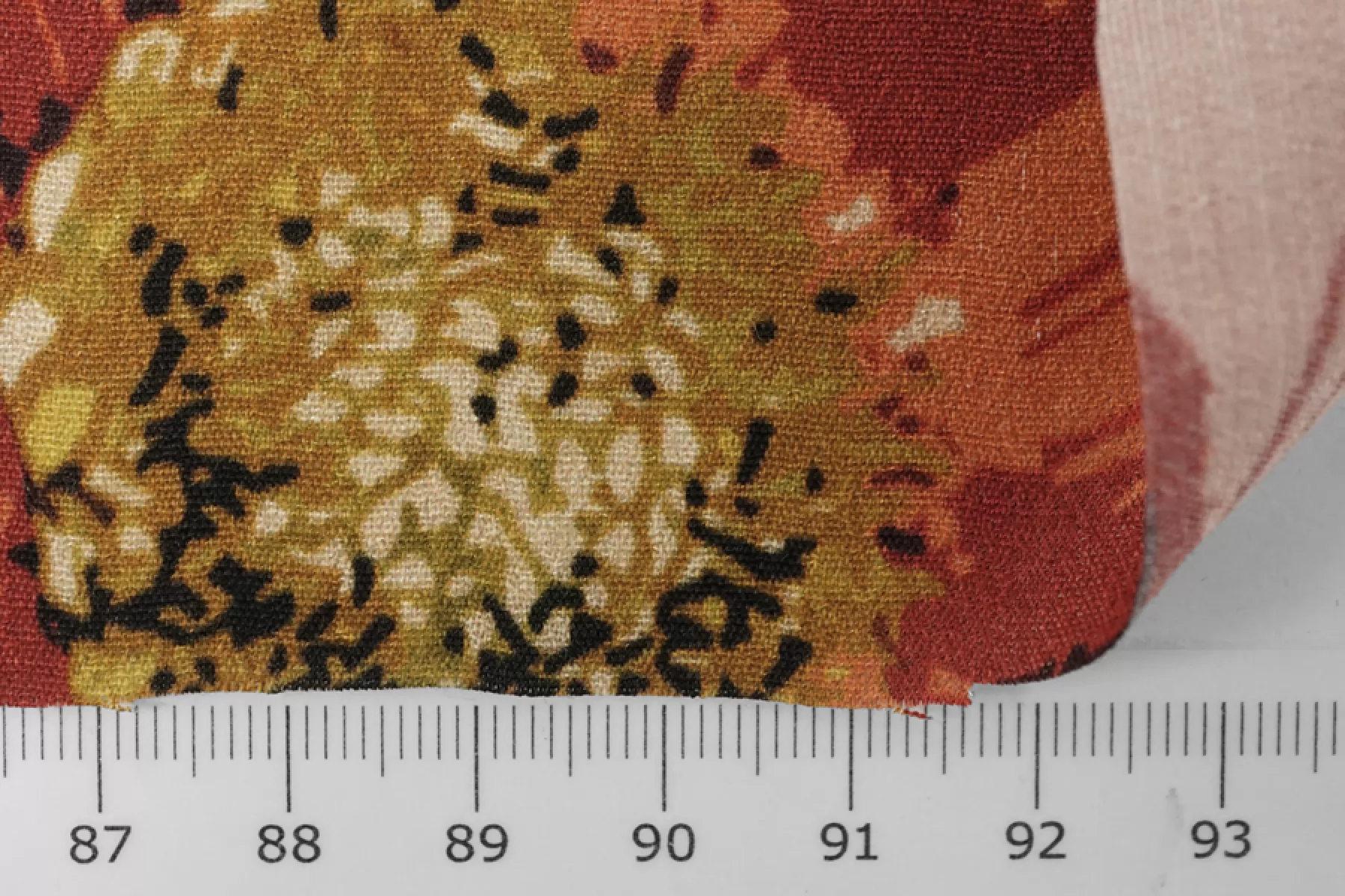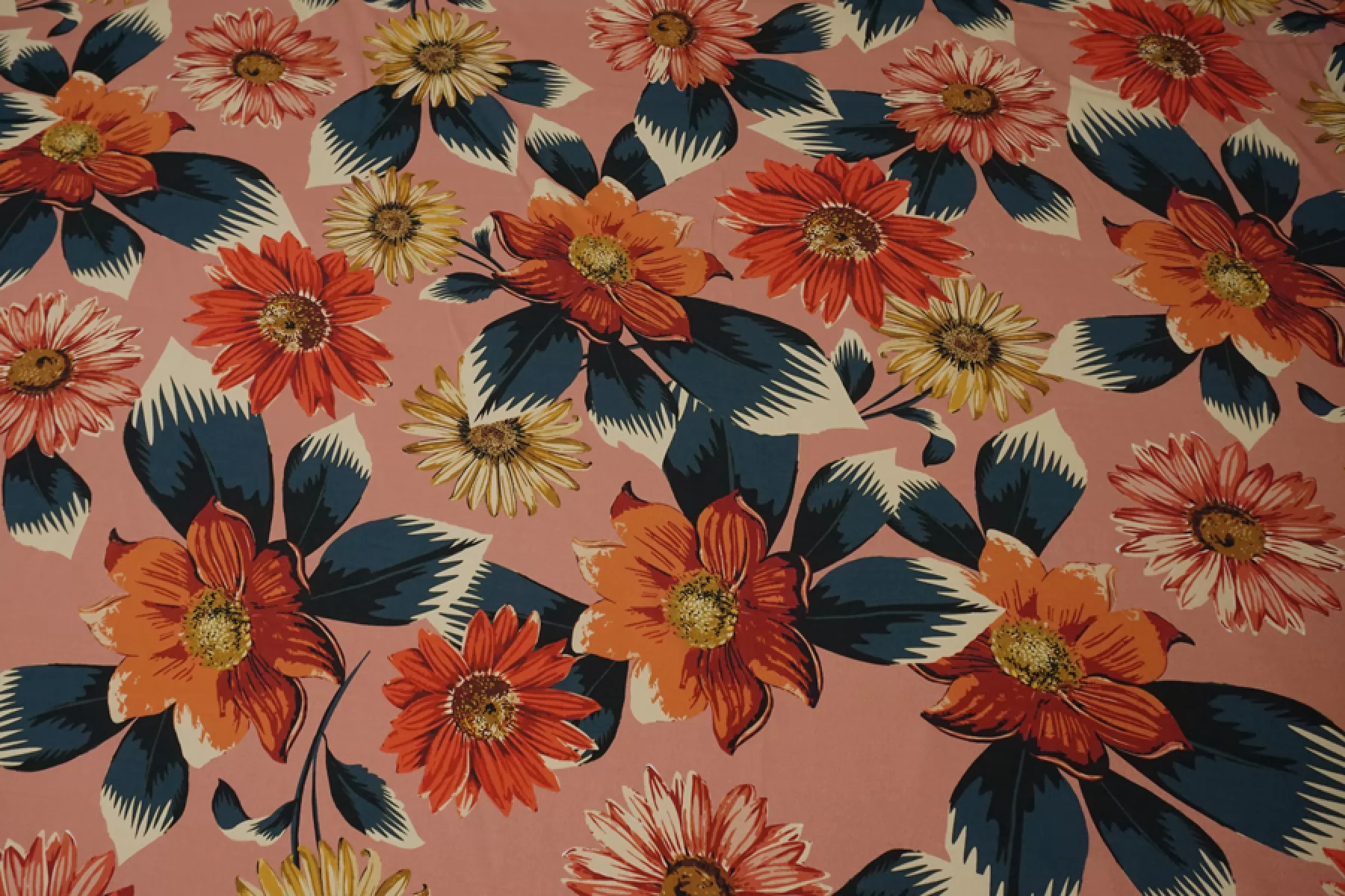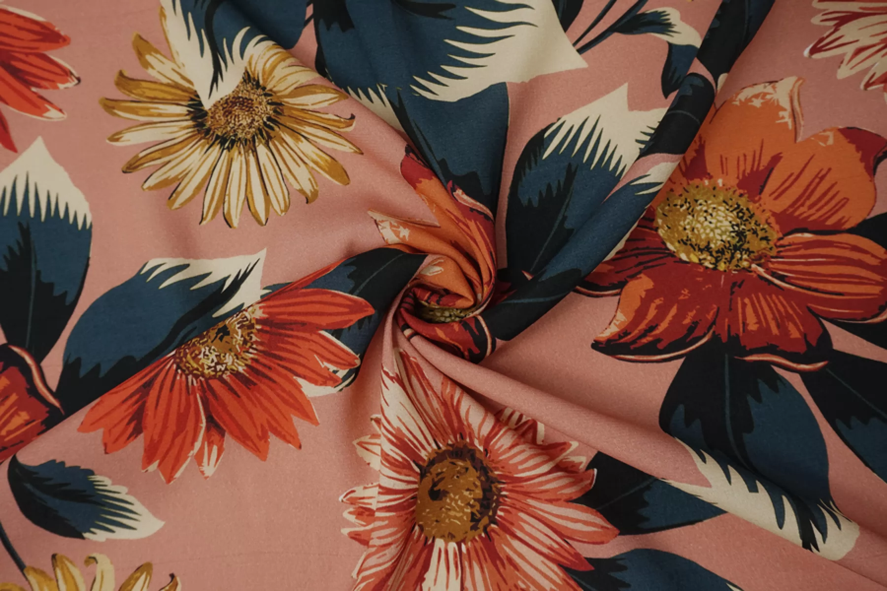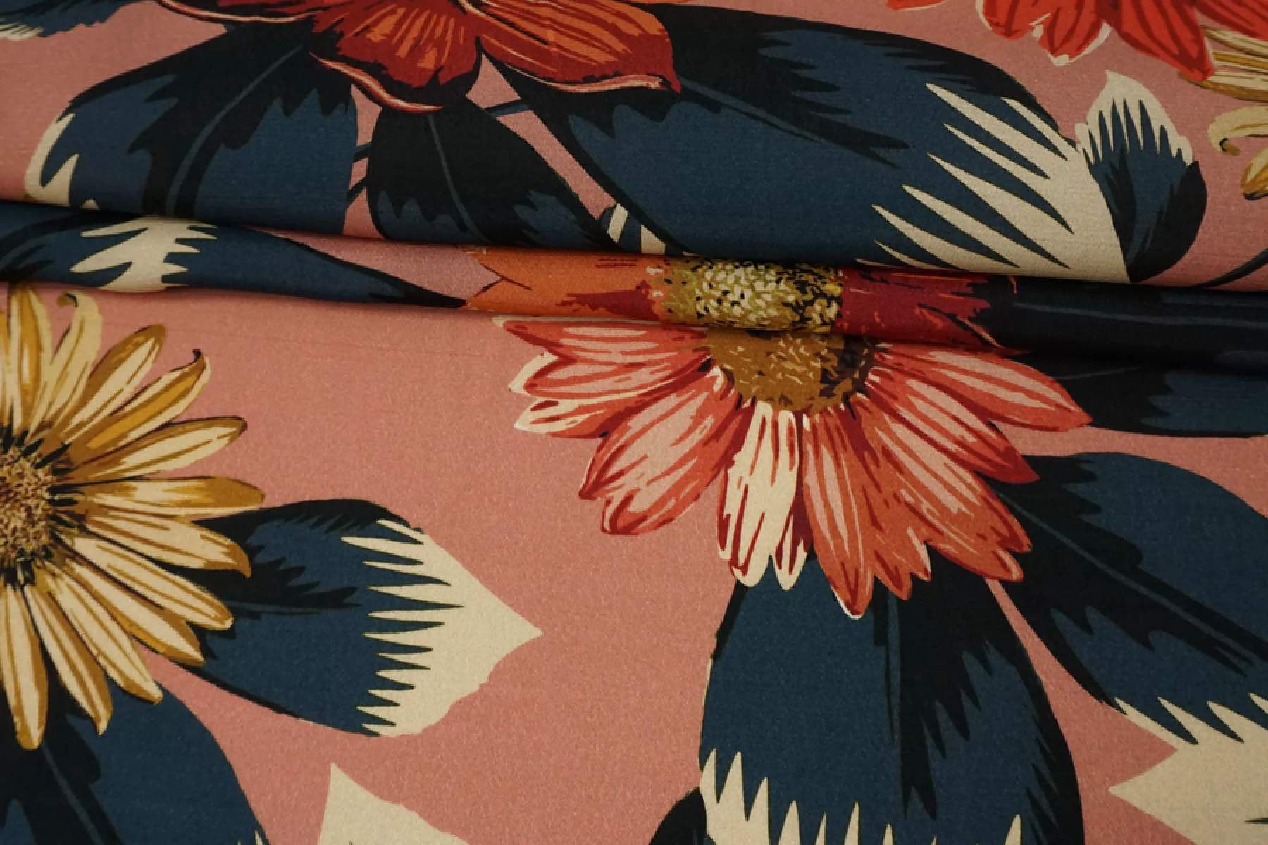 Креповая вискоза очень сложного оттенка - серо-розово-кораллового, с цветочным принтом в оттенках бледно-желтого, красного, терракотового, горчицы, серо-синего и черного. Материал тактильно слегка шероховатый, как любой креп, мягкий. Слегка просвечивает силуэт и слегка мнется. Красив в своей пластике. Пружинит за счет плетения. Форму держит совсем немного. Используем на платья, блузки или юбки. Обязательно учитывайте усадку 5-10%. При необходимости используйте подкладочный материал.