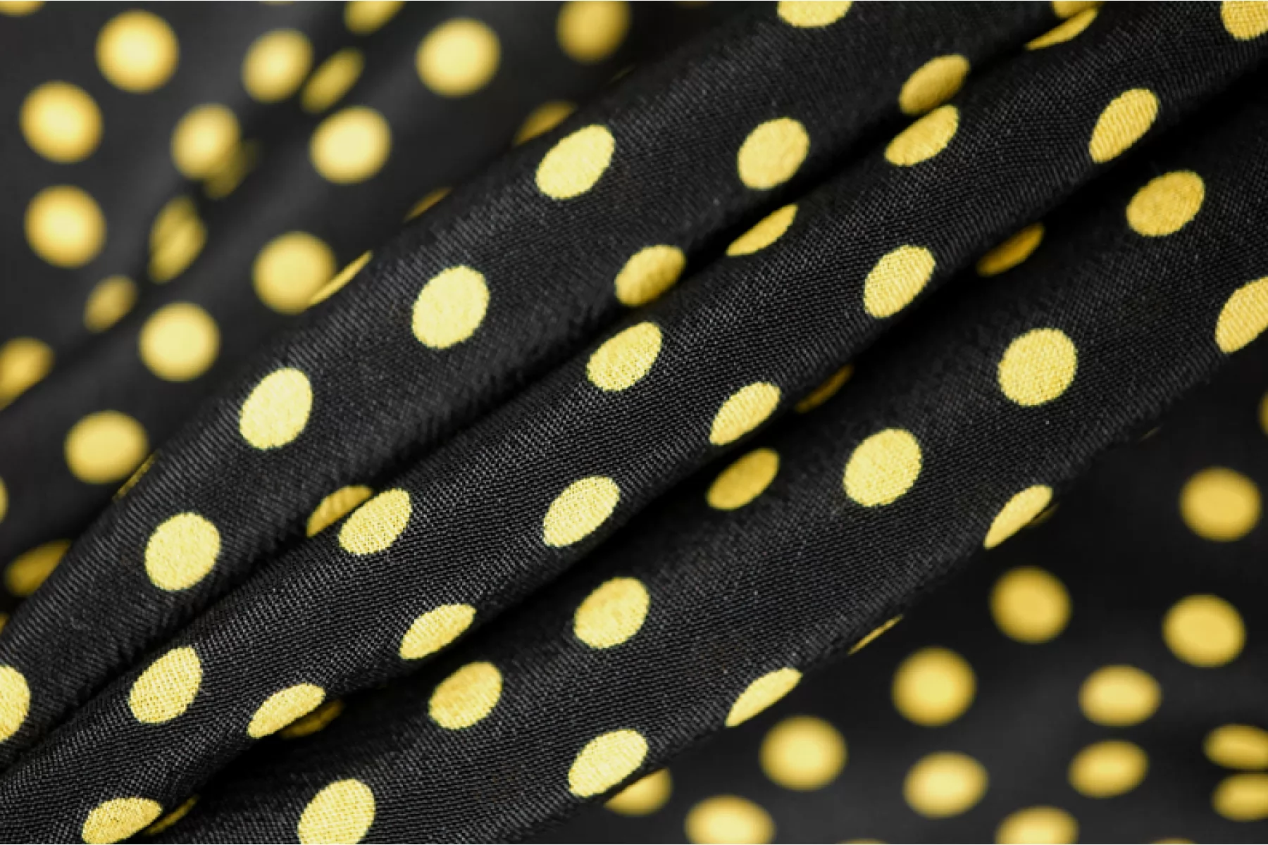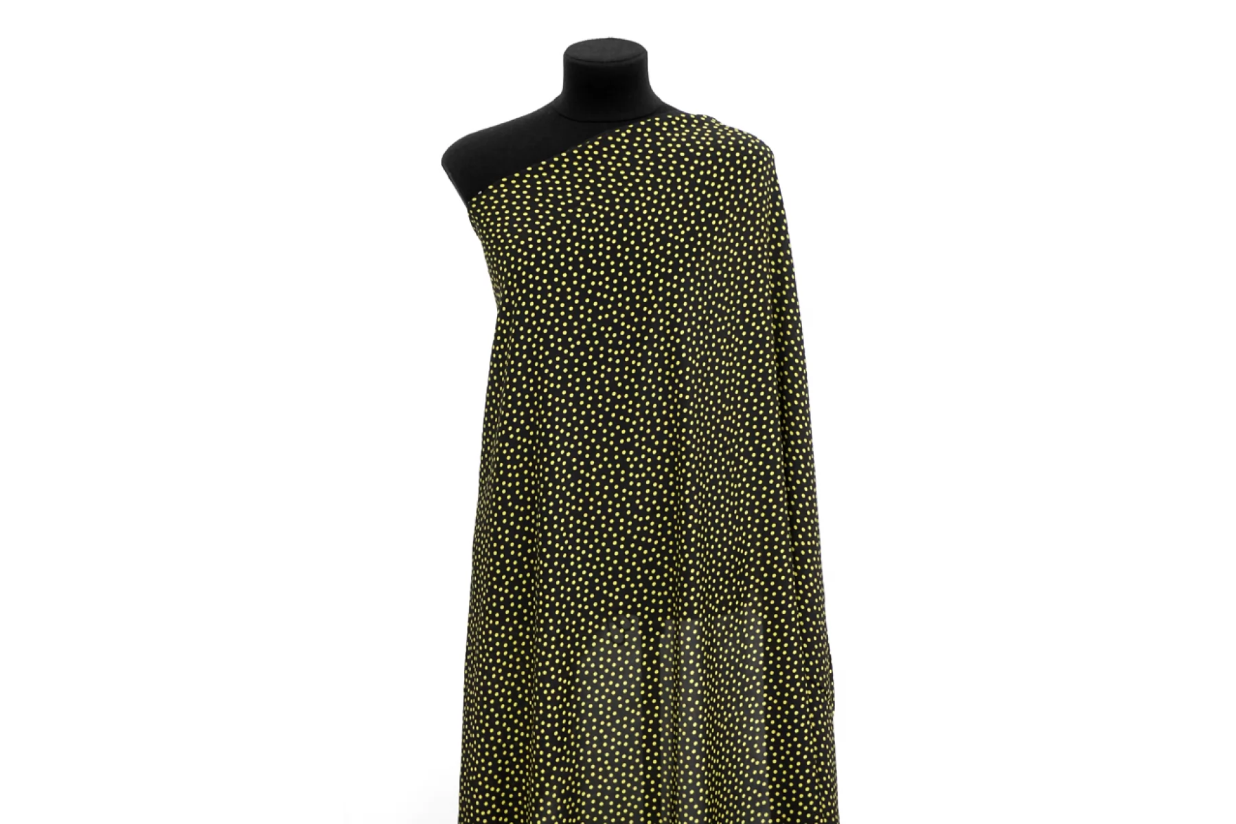 Блузочная креповая вискоза черного цвета с желтым мелким горошком. Материал тактильно мягкий и приятный, слегка шероховатый. Тонкий, не мнется. Просвечивает силуэт. Красиво смотрится в складках. Не тянется. Ткань пластичная, совсем немного держит форму. Очень классный вариант на платье, блузку или юбку. При необходимости используйте подкладочный материал. Обязательно учитывайте усадку 5-10%.