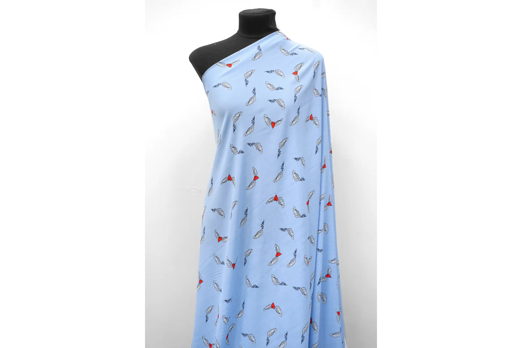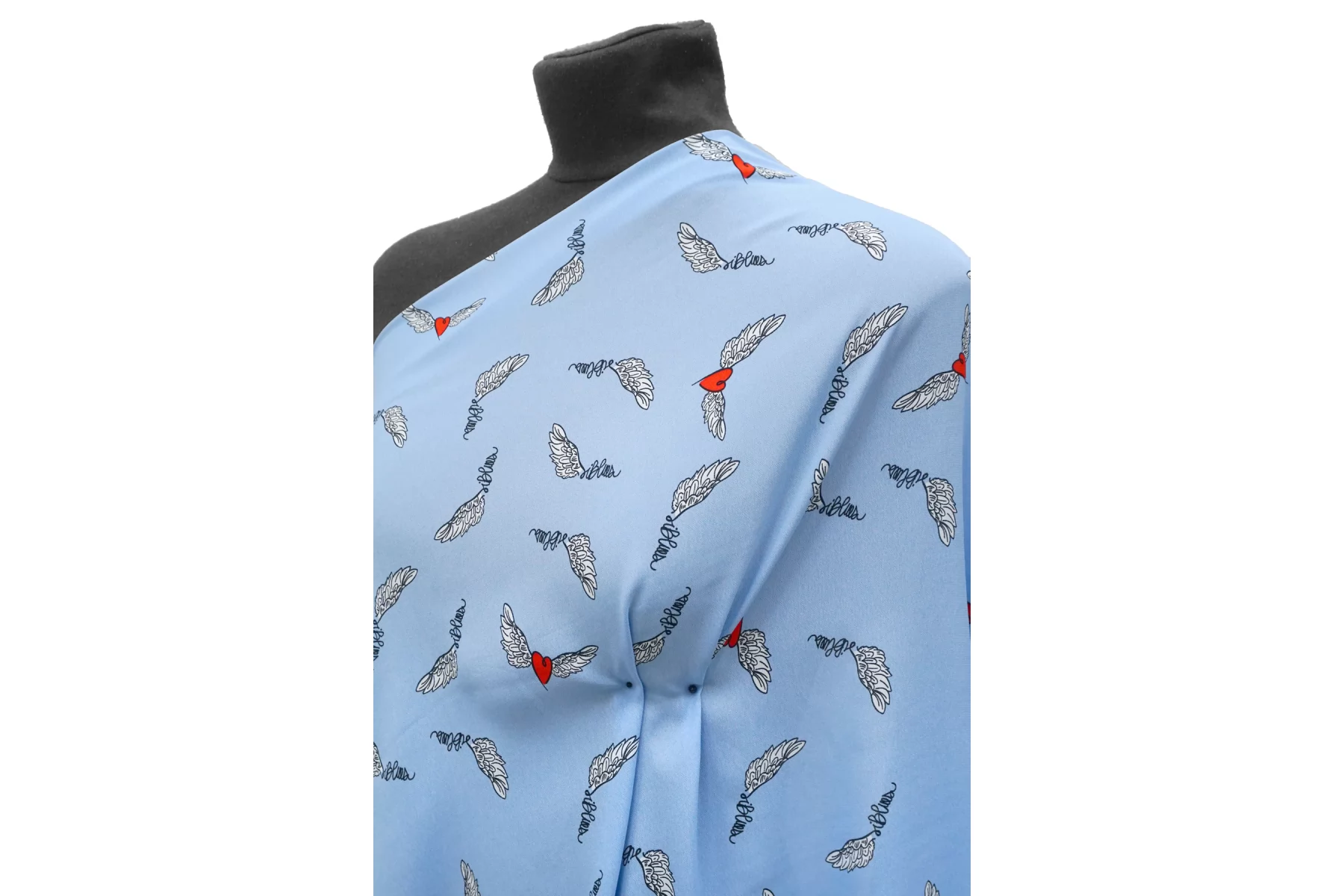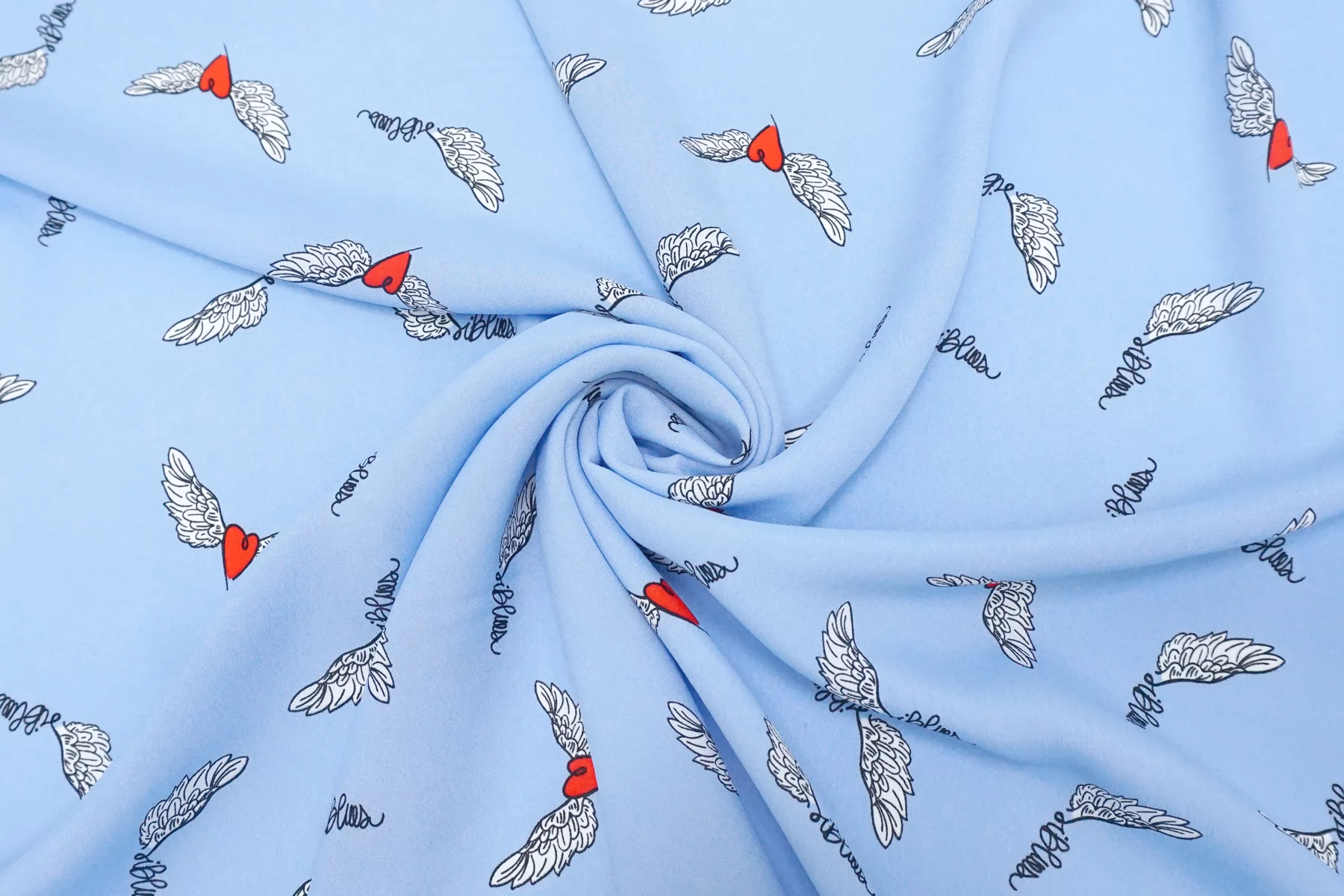 Красивая плательная вискоза крепового плетения от бренда IBlues, с принтом в виде сердечек на голубом фоне. На ощупь слегка шероховатая, холодящая. Пластичная. Немного просвечивает силуэт. Не тянется. Немного мнется. Красива в движении. Форму слегка держит. Прекрасно подойдет на платья, блузки, юбки и костюмы в пижамном стиле. При необходимости используйте подкладочный материал. Обязательно учитывайте усадку порядка 5-10%.