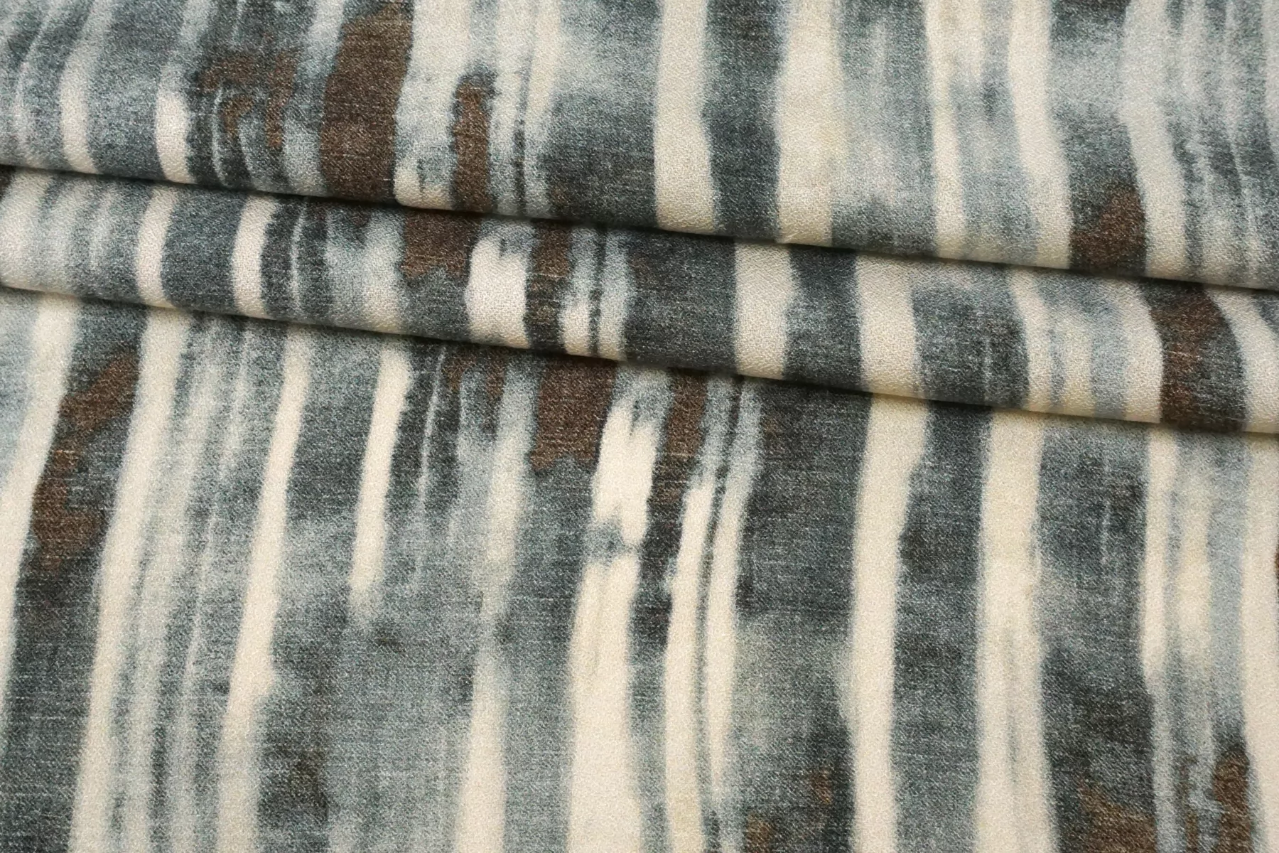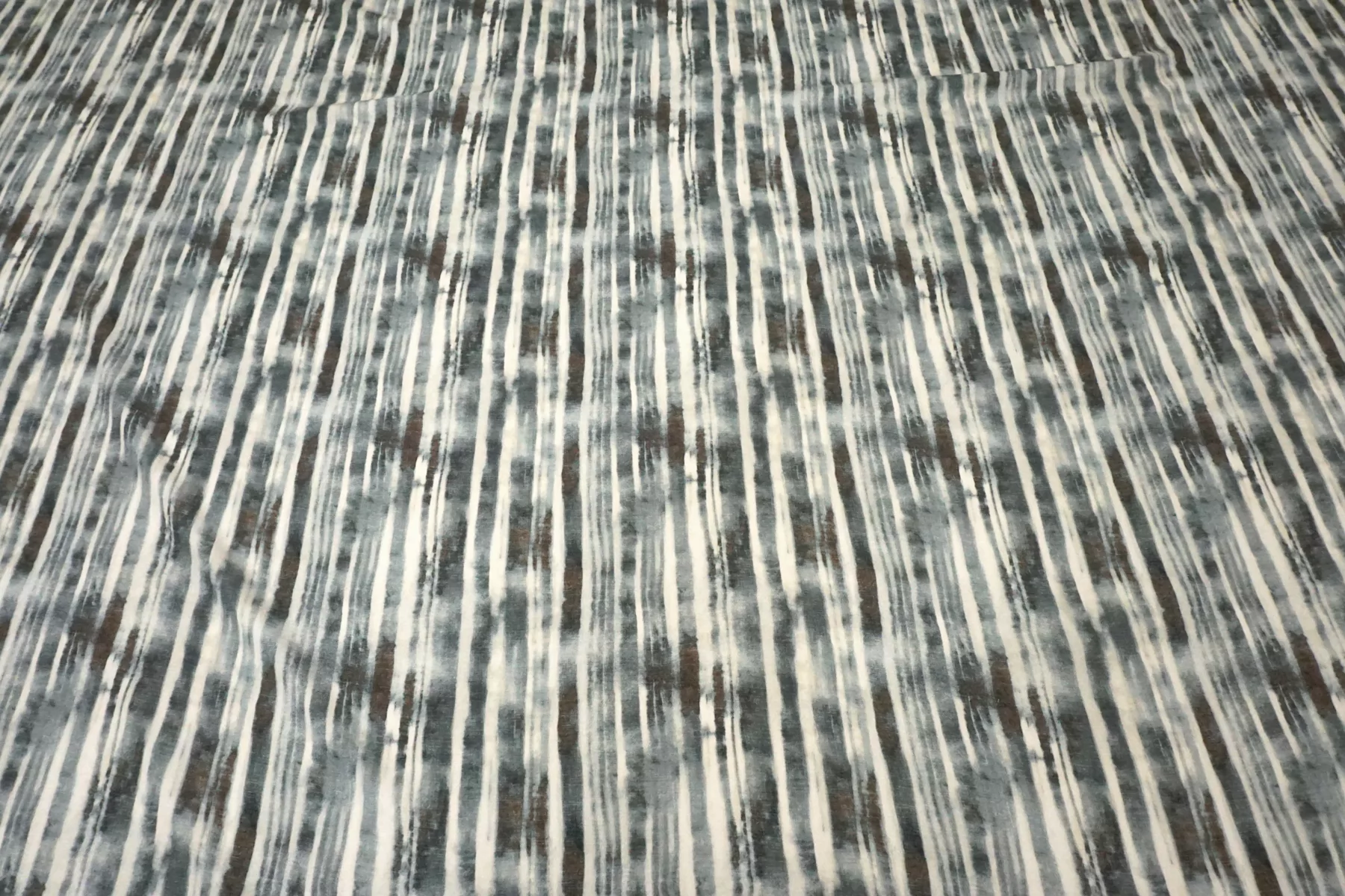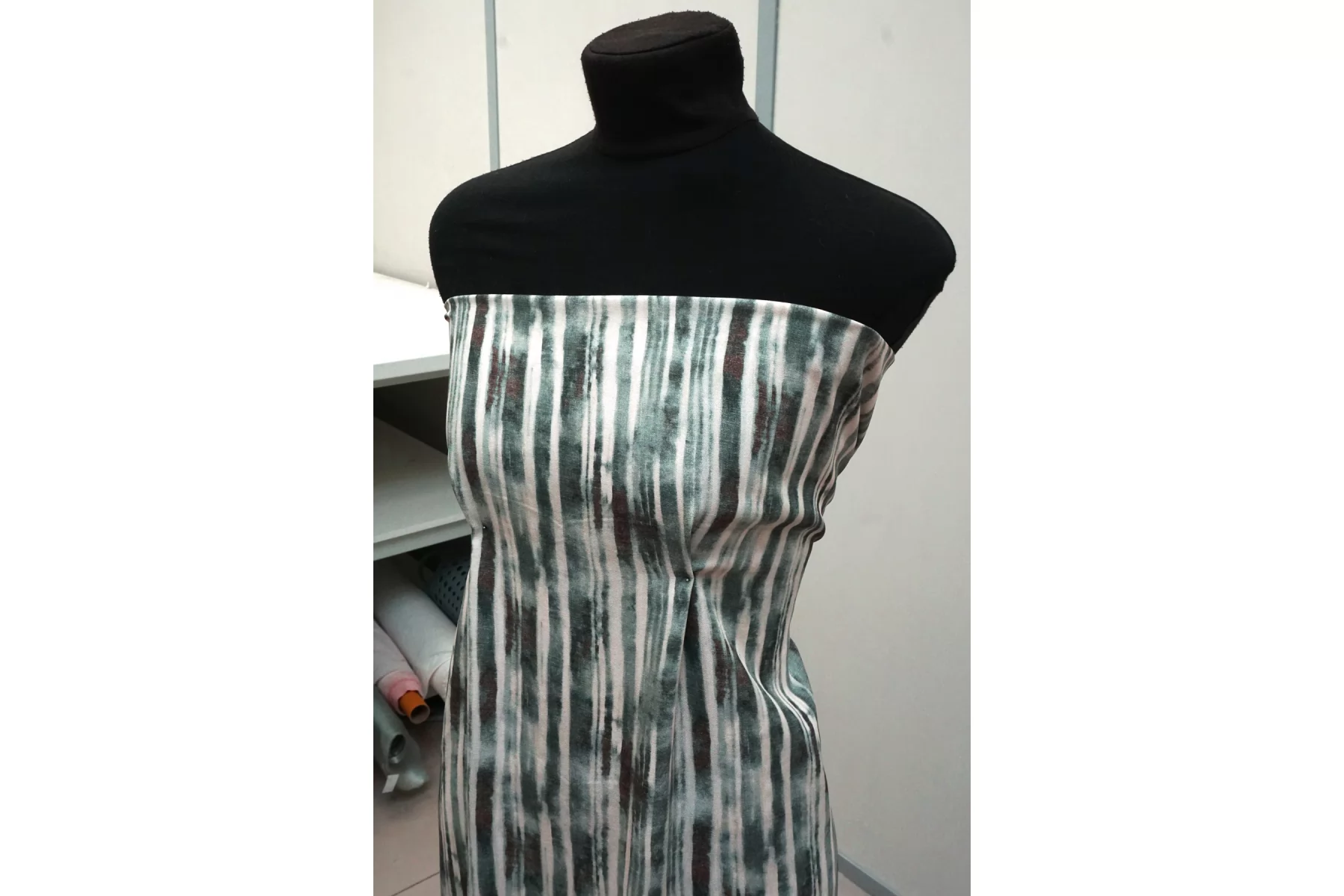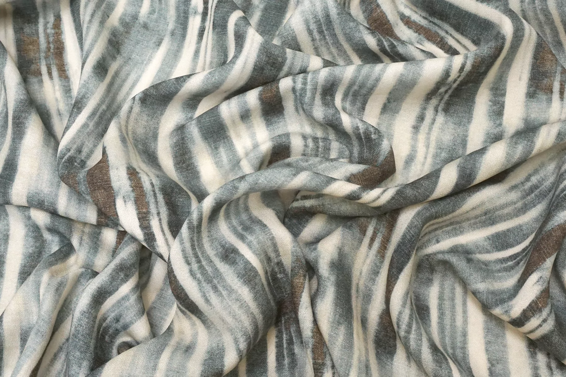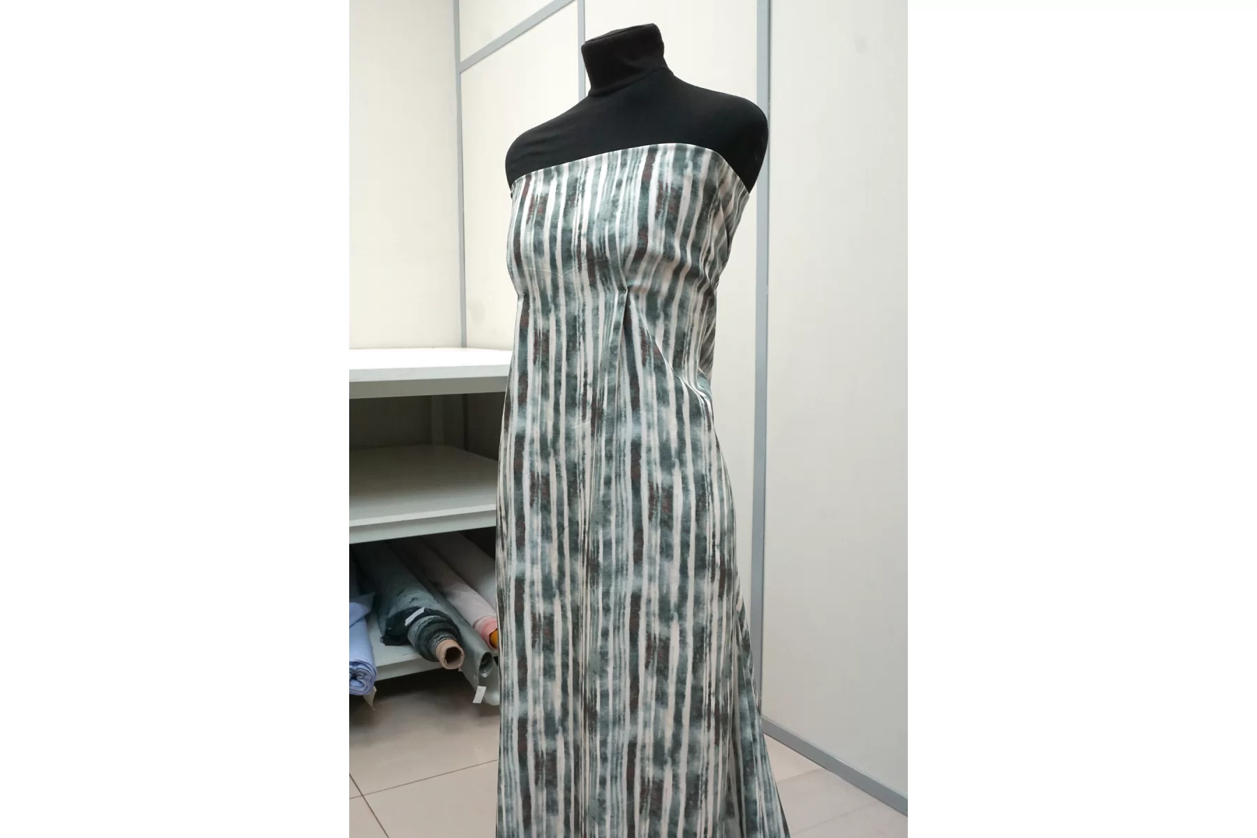 Плательная вискоза крепового плетения, плательной плотности. Принт - абстрактные полосы, сочетание серо-голубого, коричневого ,молочно-бежевого цветов. Материал очень мягкий и приятный, с характерной зернистой поверхностью. Не тянется. Сминается. Тонкий, пластичный, минимально просвечивает силуэт в один слой. Подойдет для пошива платья, топа, юбки, лёгких брюк на резинке. При работе с этой тканью советуем использовать тонкие иглы.