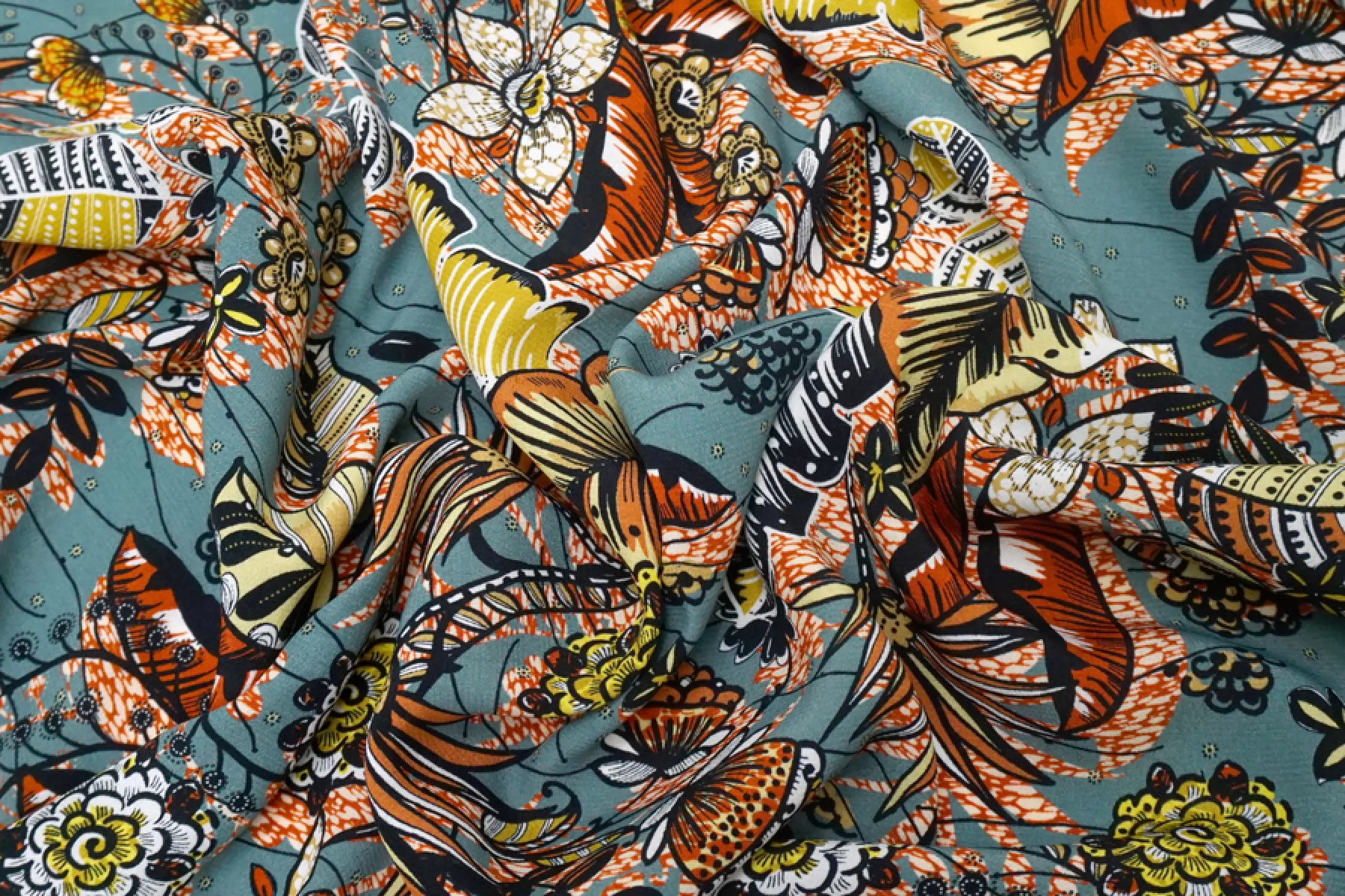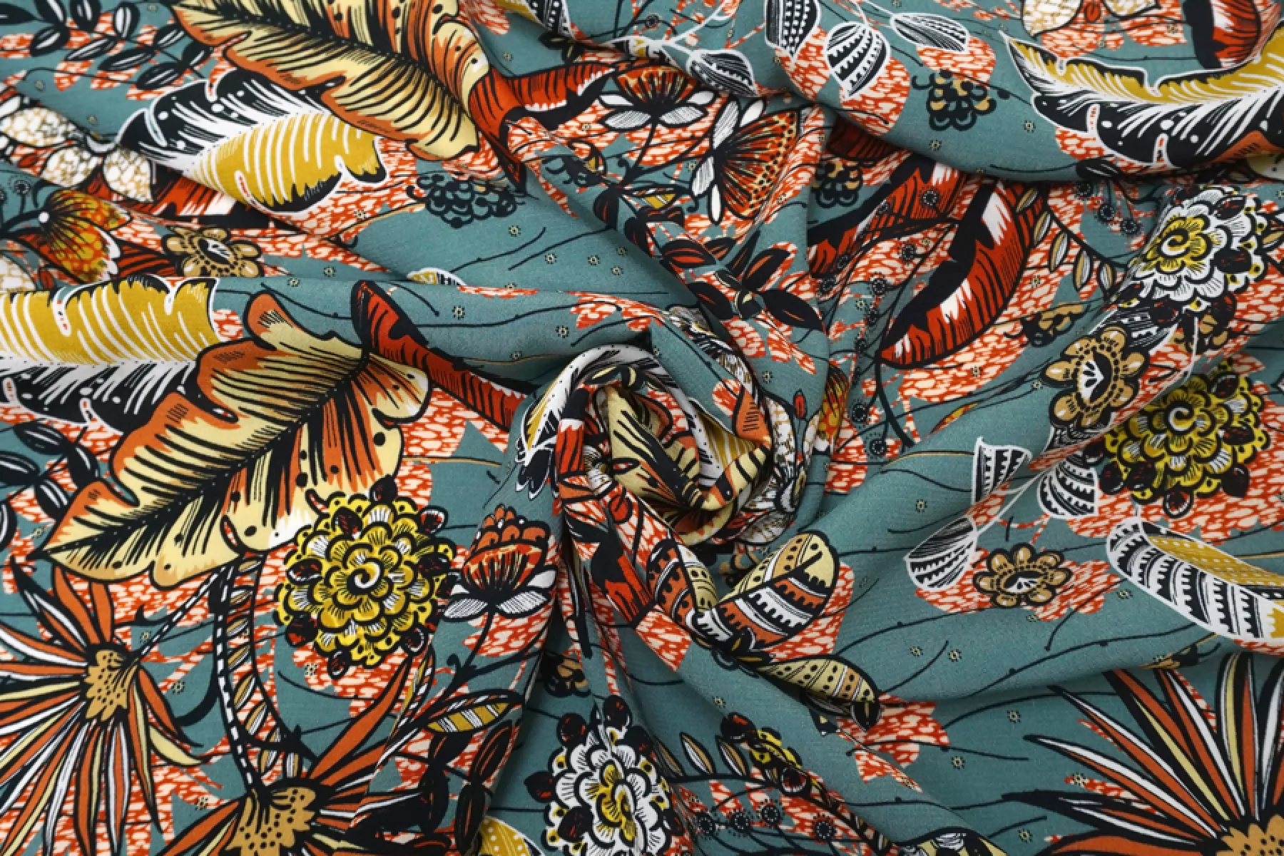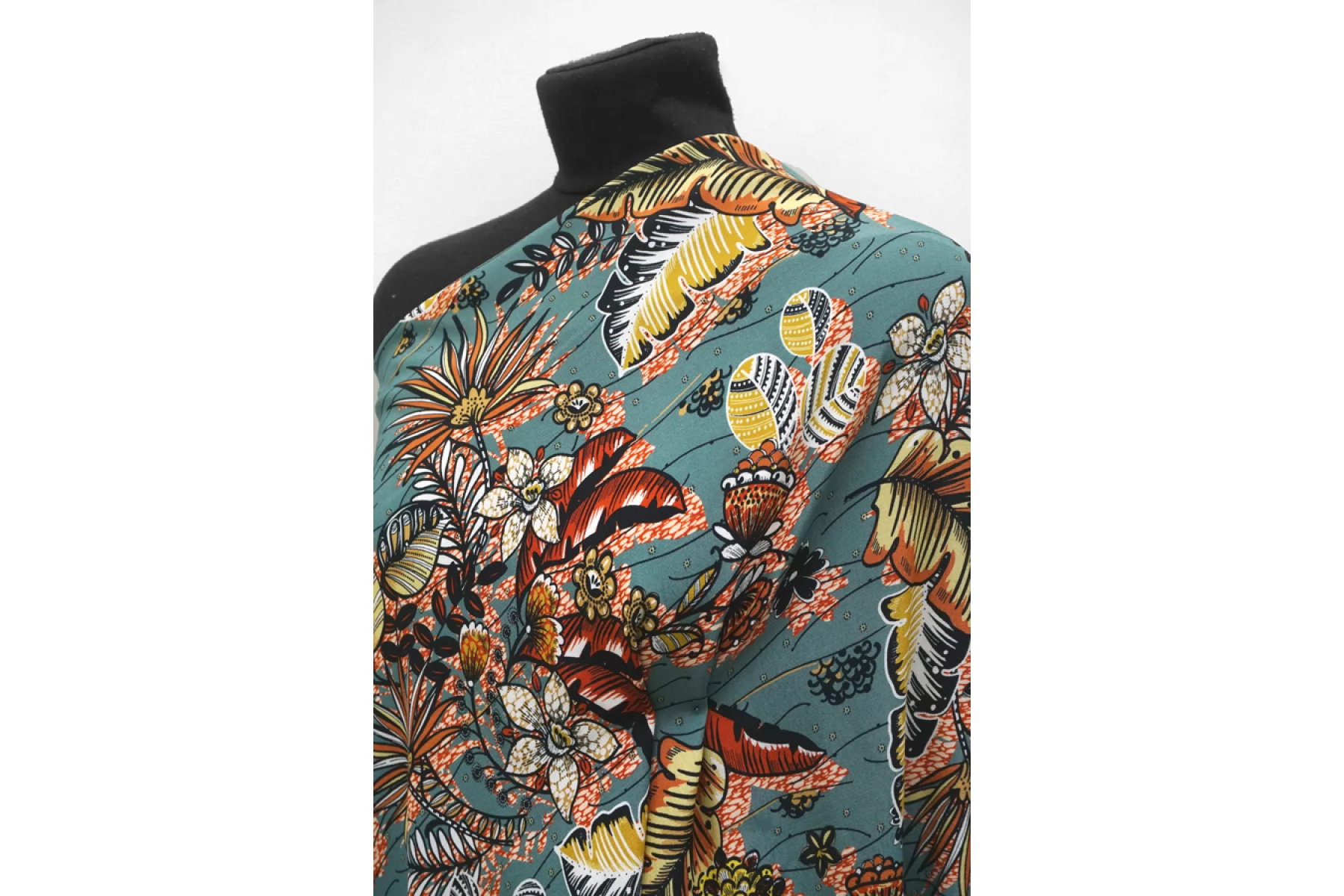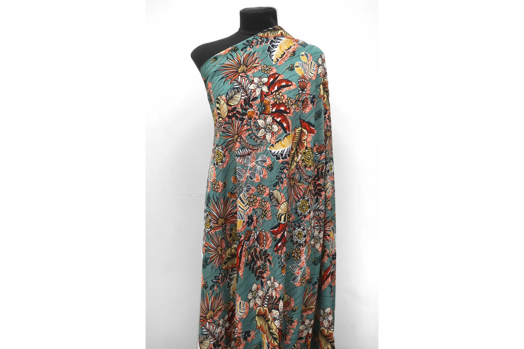 Креповая вискоза со стилизованным цветочным принтом на красивом эвкалиптовом фоне. Приятная и шероховатая наощупь. Тонкая, пластичная, красиво драпируется, форму не держит. Плетение немного пружинит. Немного просвечивает в один слой. Слегка мнется. Прекрасный вариант на летние платья, юбки, летящие брюки, блузки. Учитывайте усадку.