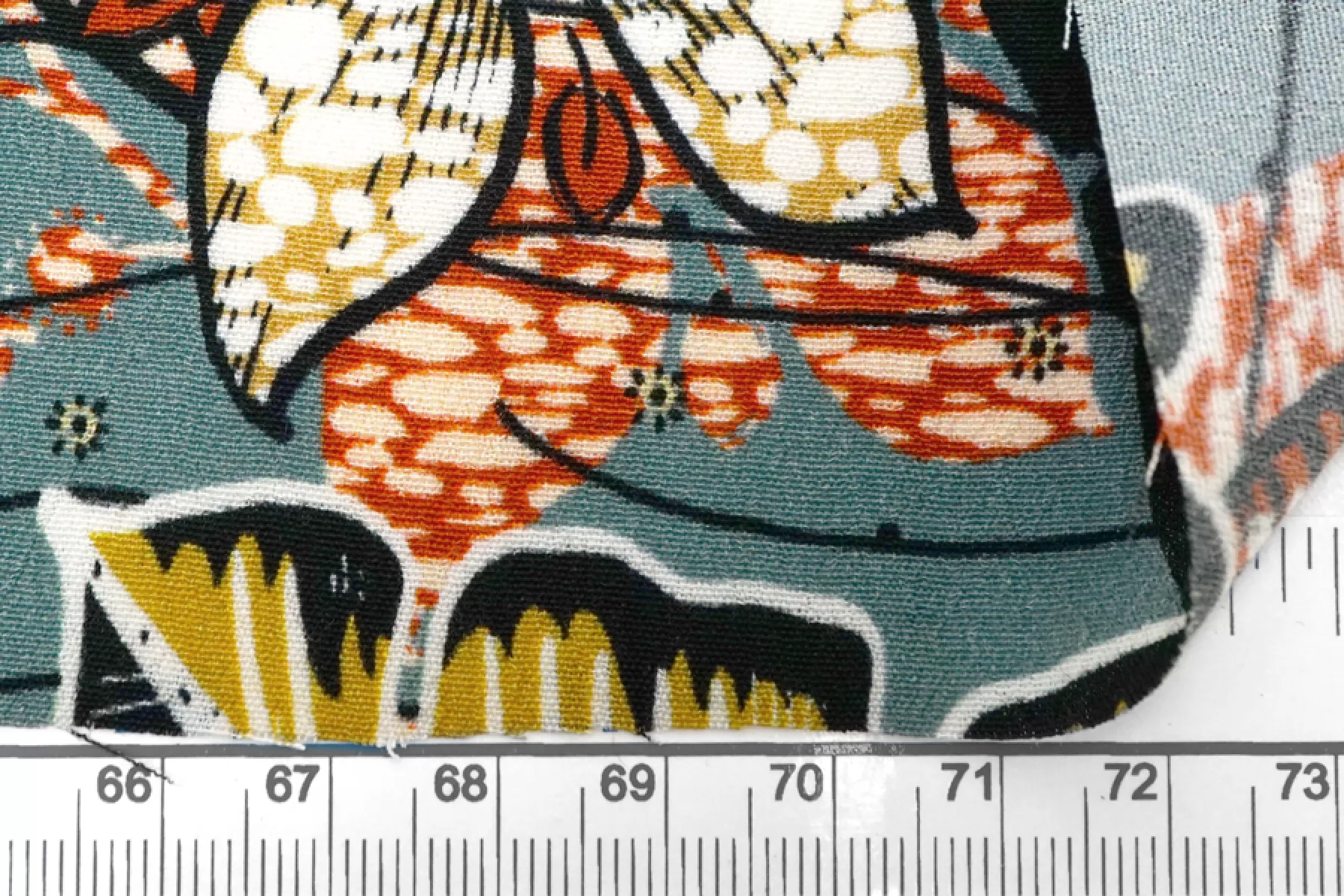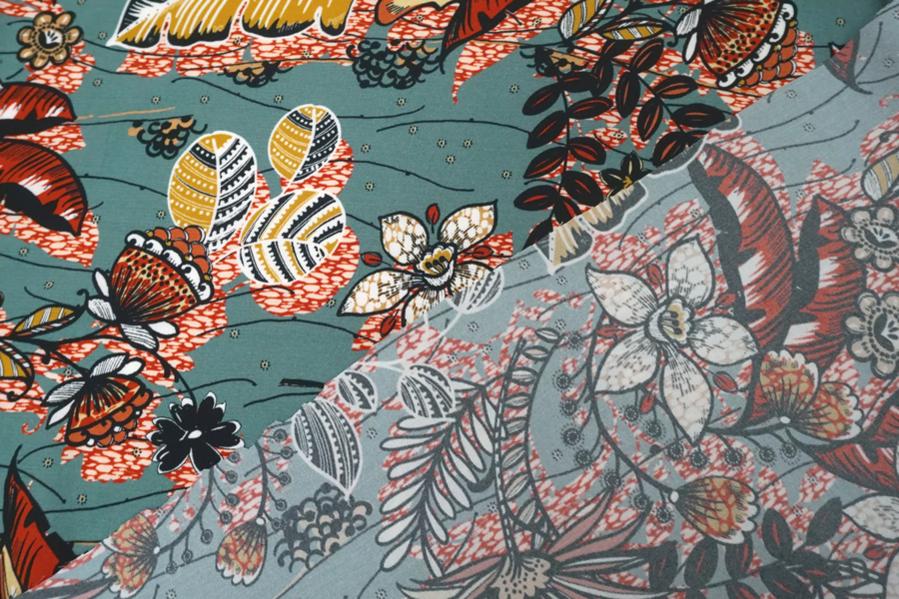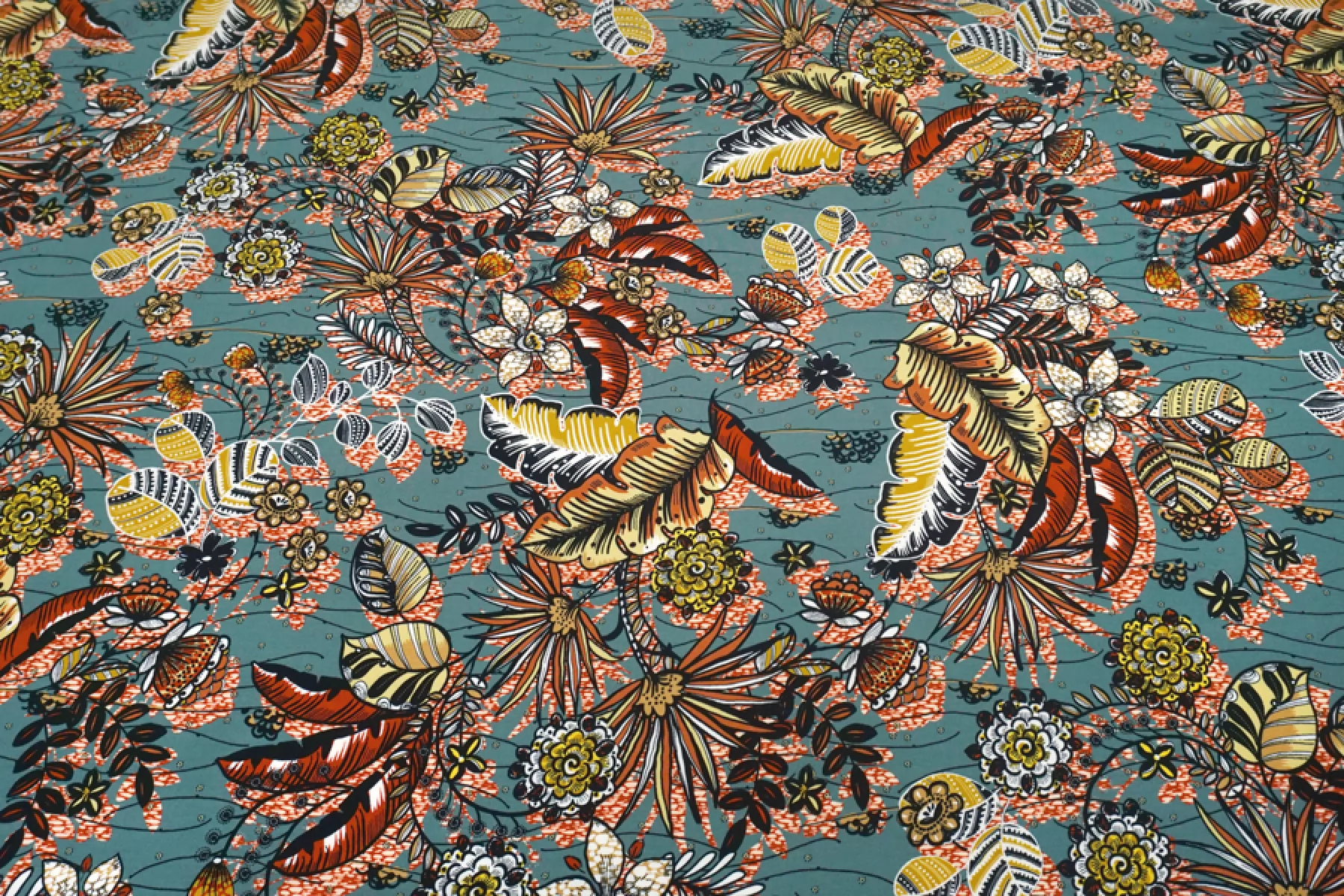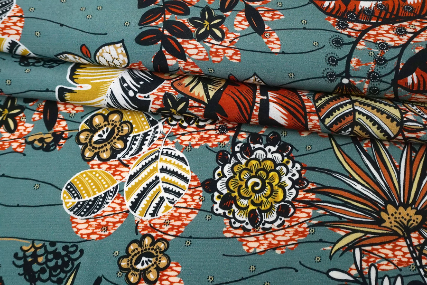 Креповая вискоза со стилизованным цветочным принтом на красивом эвкалиптовом фоне. Приятная и шероховатая наощупь. Тонкая, пластичная, красиво драпируется, форму не держит. Плетение немного пружинит. Немного просвечивает в один слой. Слегка мнется. Прекрасный вариант на летние платья, юбки, летящие брюки, блузки. Учитывайте усадку.