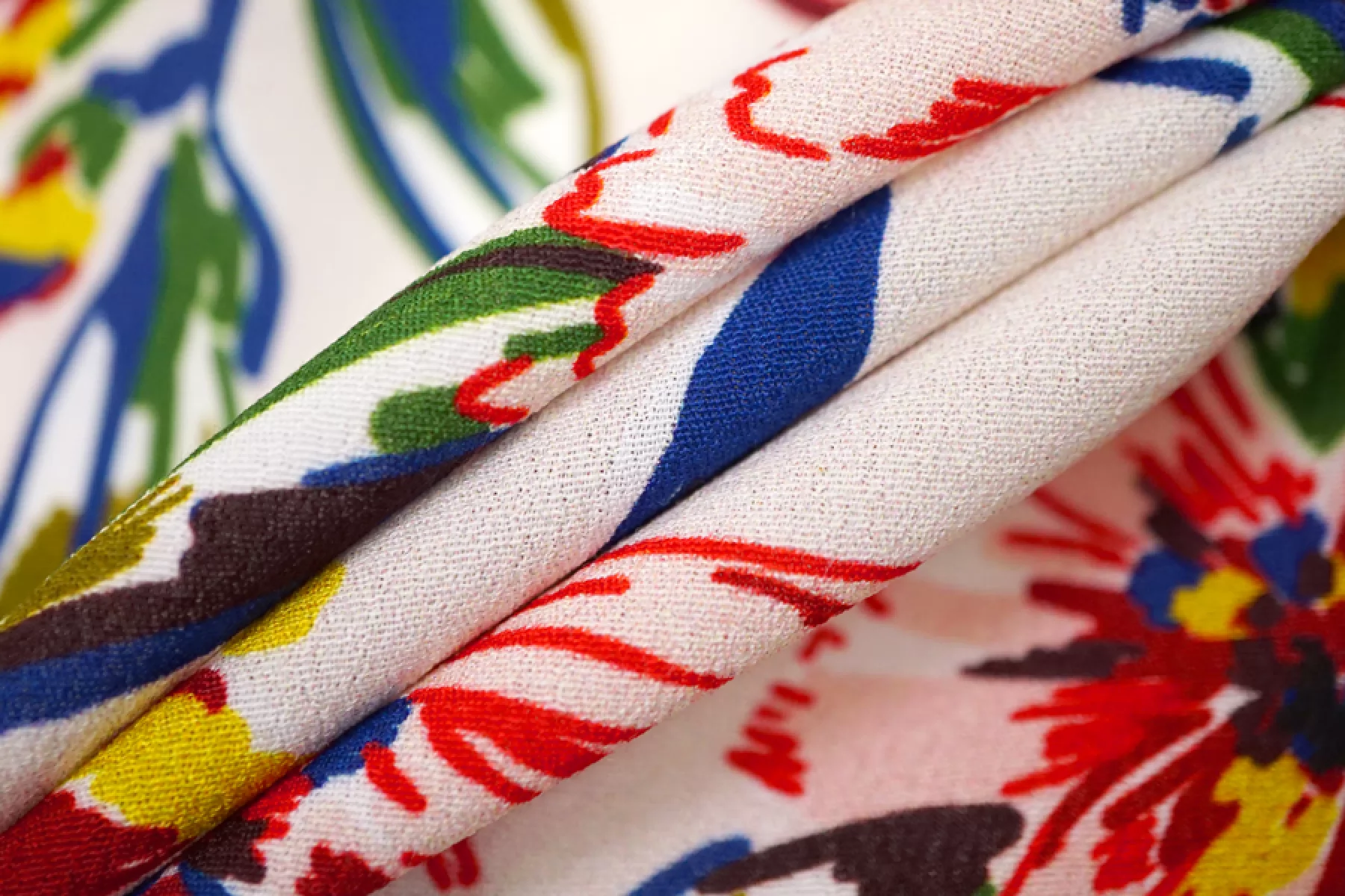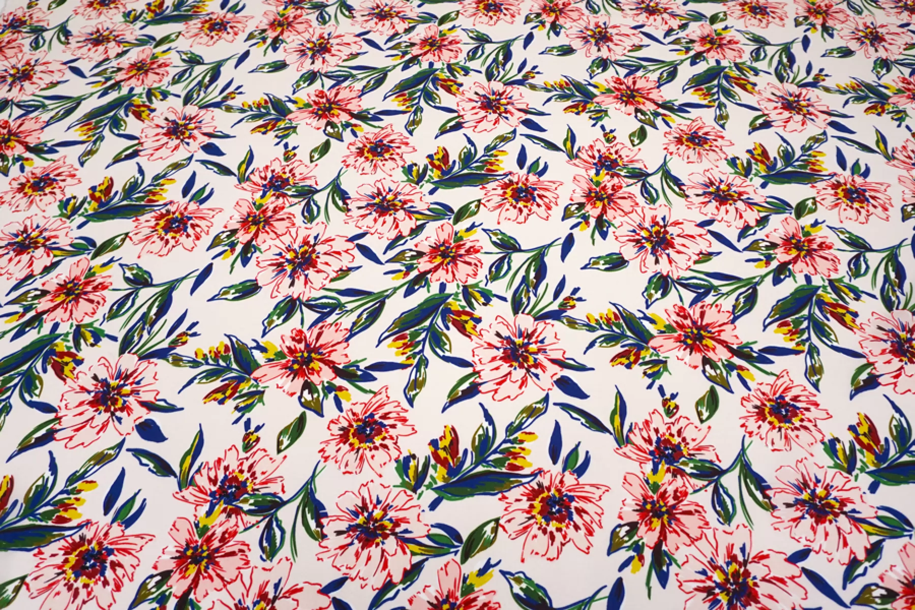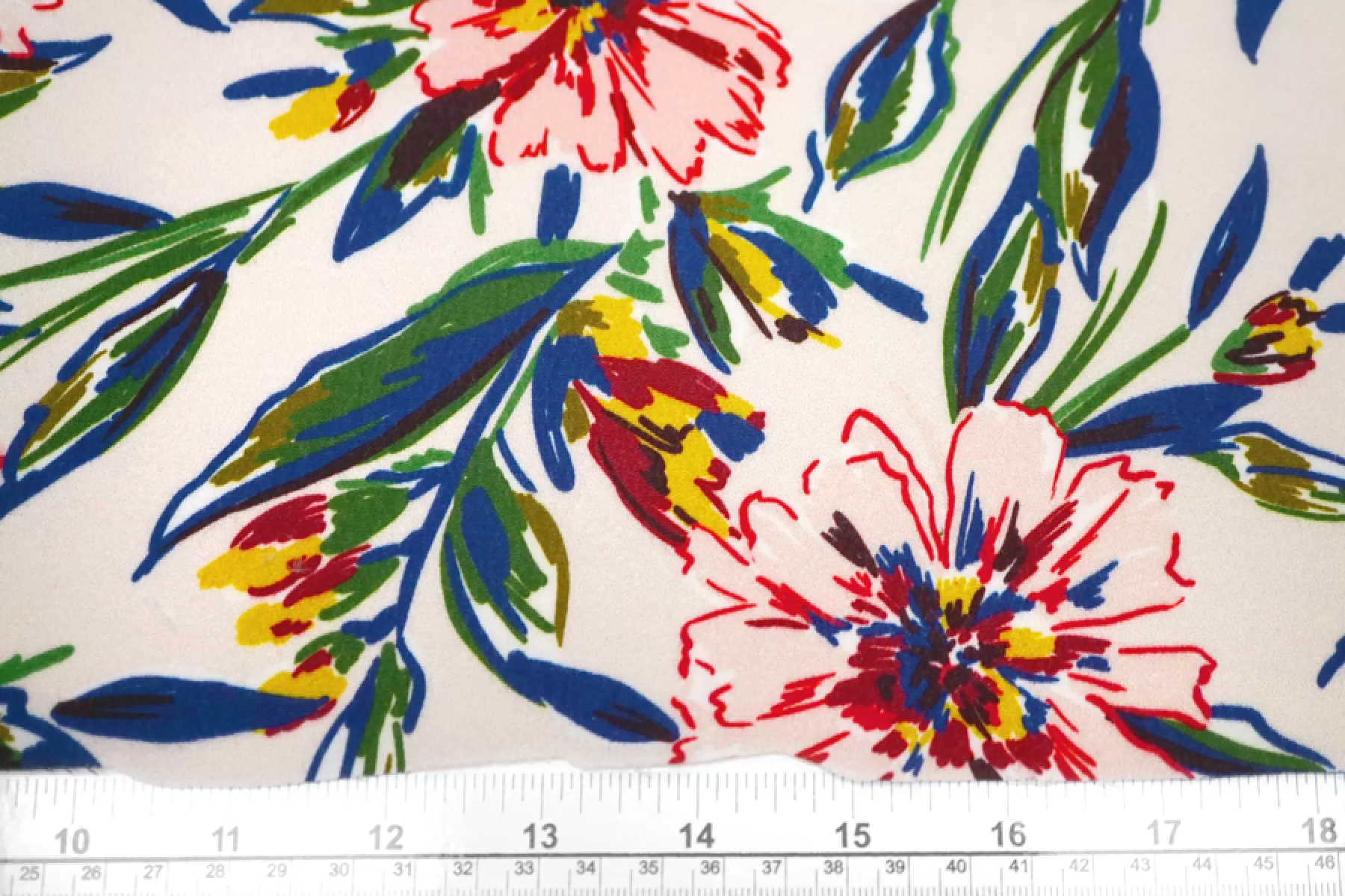 Креповая вискоза со стилизованным цветочным принтом на светлом, бело-бежевато-розоватом фоне. Приятная и шероховатая наощупь. Тонкая, пластичная, красиво драпируется, форму не держит. Плетение немного пружинит. Немного просвечивает. Слегка мнется. Прекрасный вариант на летние платья, юбки, летящие брюки, блузки. Учитывайте усадку.