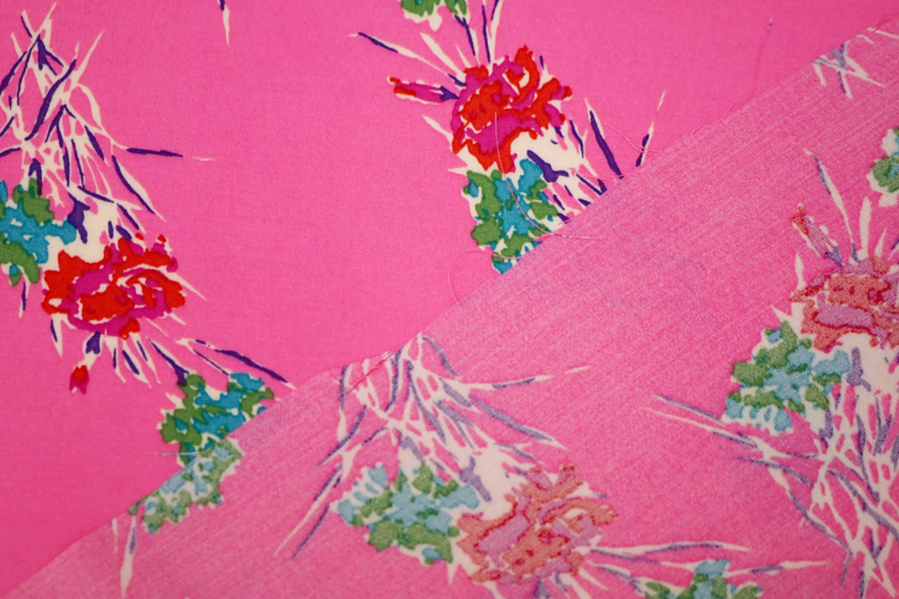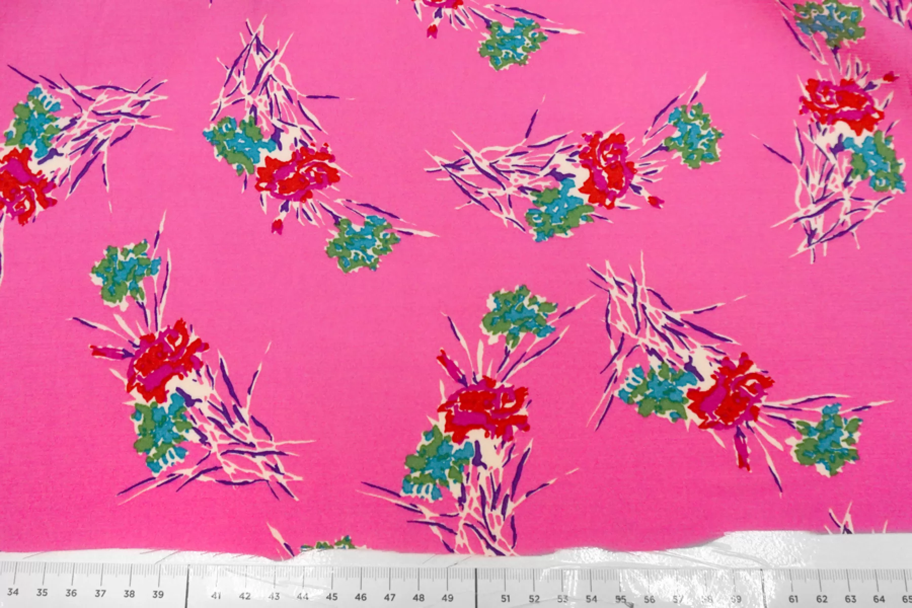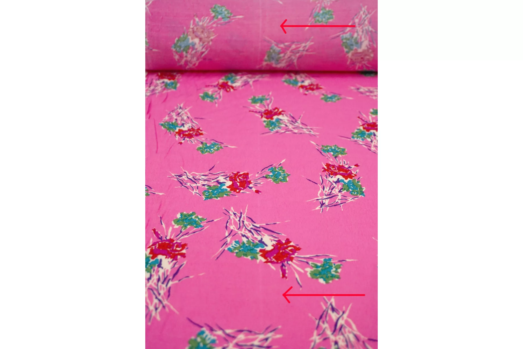 Есть полоса 14 см. от кромки. см. фото. Креповая вискоза со стилизованным цветочным принтом на холодном розовом фоне. Материал тактильно слегка шероховатый, мягкий. Слегка просвечивает силуэт и слегка мнется. Красив в своей пластике. Пружинит за счет плетения. Форму практически не держит. Используем на платья, блузки или юбки. Обязательно учитывайте усадку 5-10%.