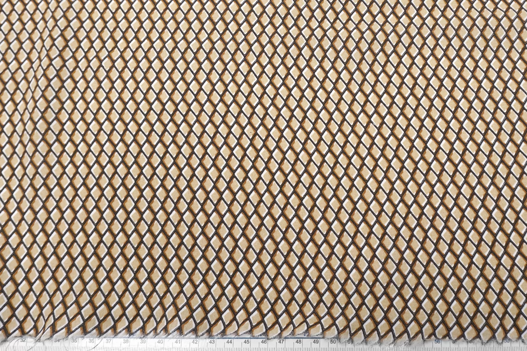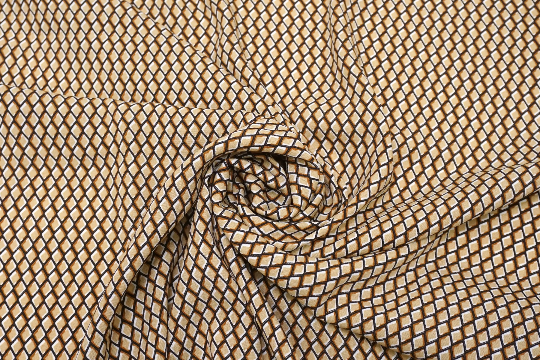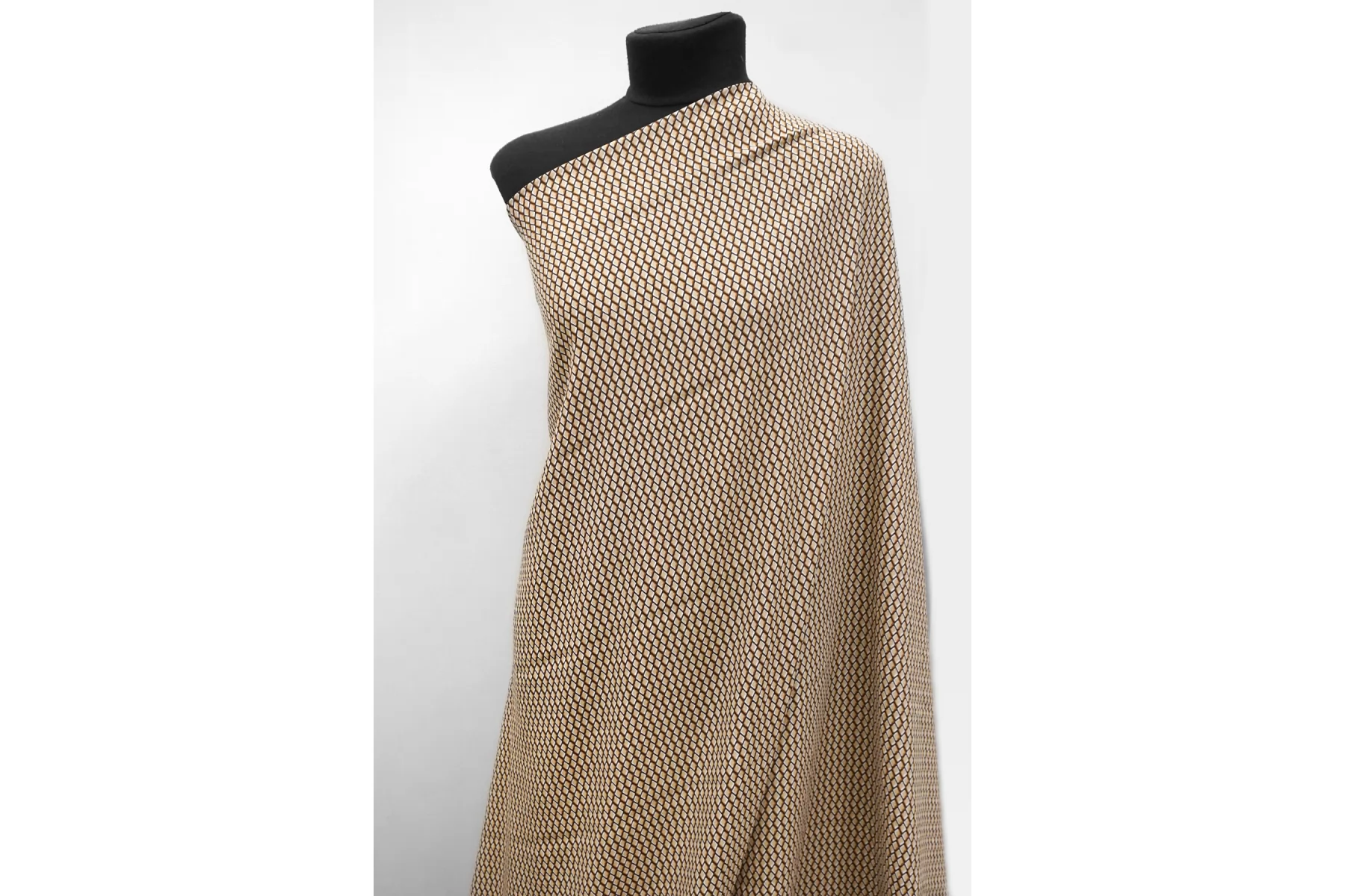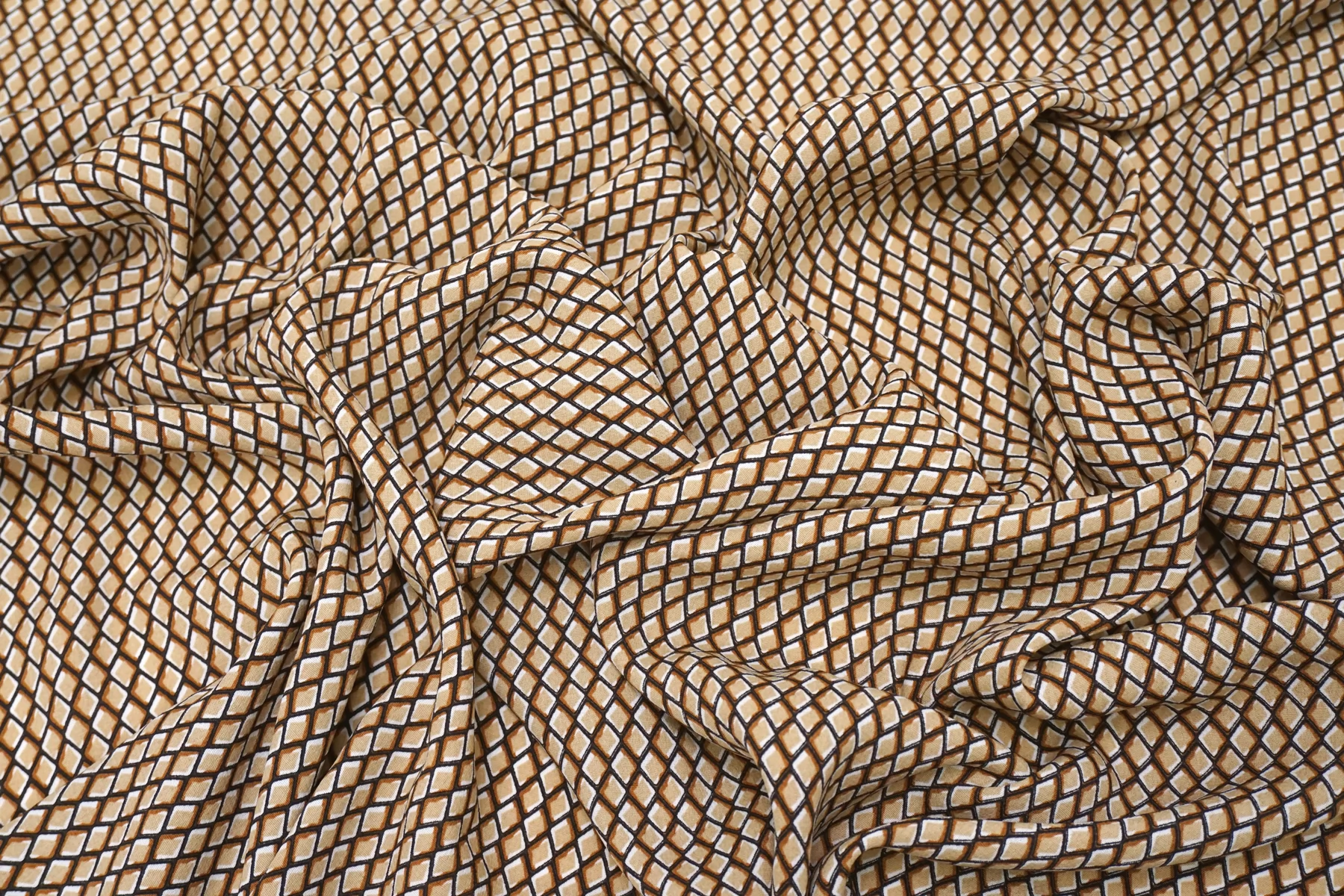 Креповая вискоза геометрическим принтом, сочетание чёрного, бежевого, коричневого и белого цвета. Напоминает принт чешуи. Приятная и шероховатая наощупь. Тонкая, пластичная, красиво драпируется, форму не держит. Плетение немного пружинит. Минимально просвечивает в один слой. Мнется. Прекрасный вариант на летние платья, юбки, летящие брюки, блузки. Учитывайте усадку.