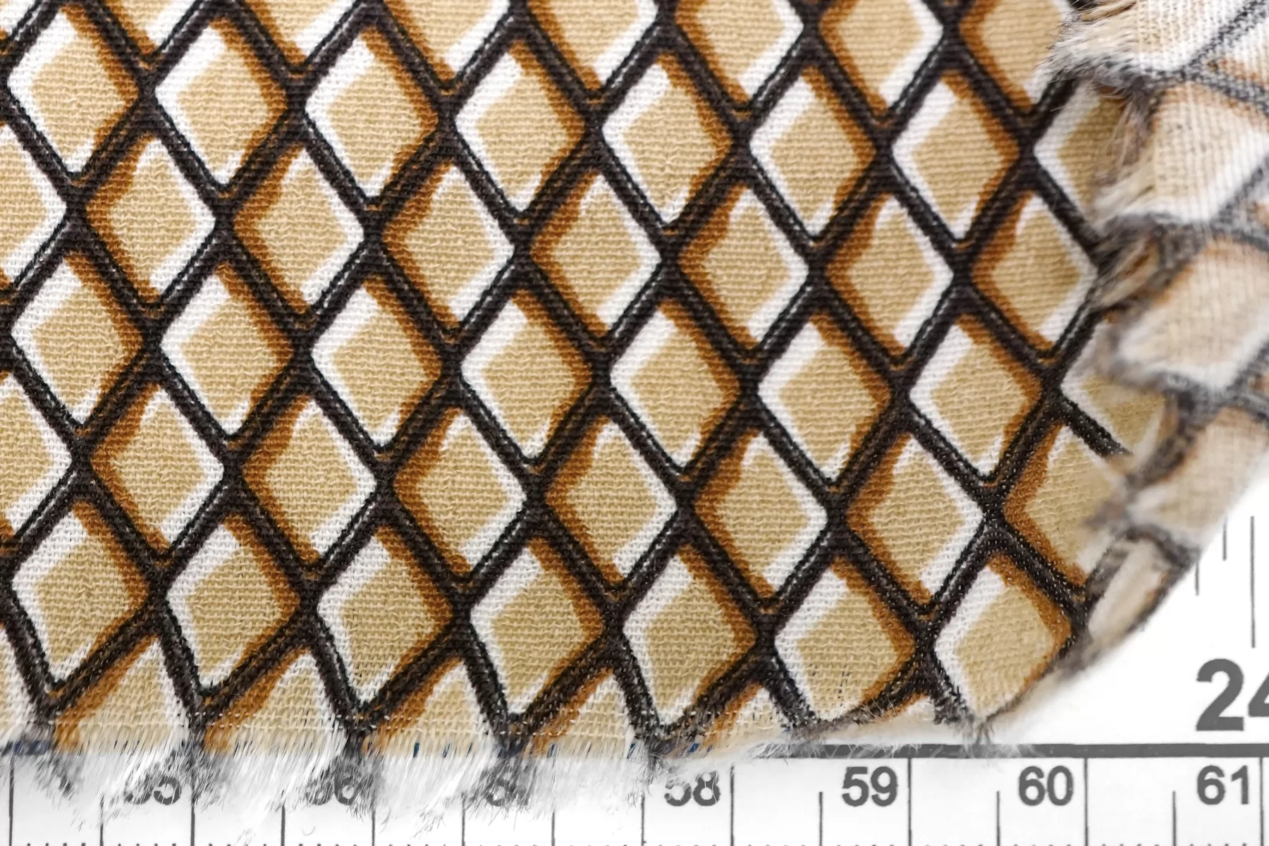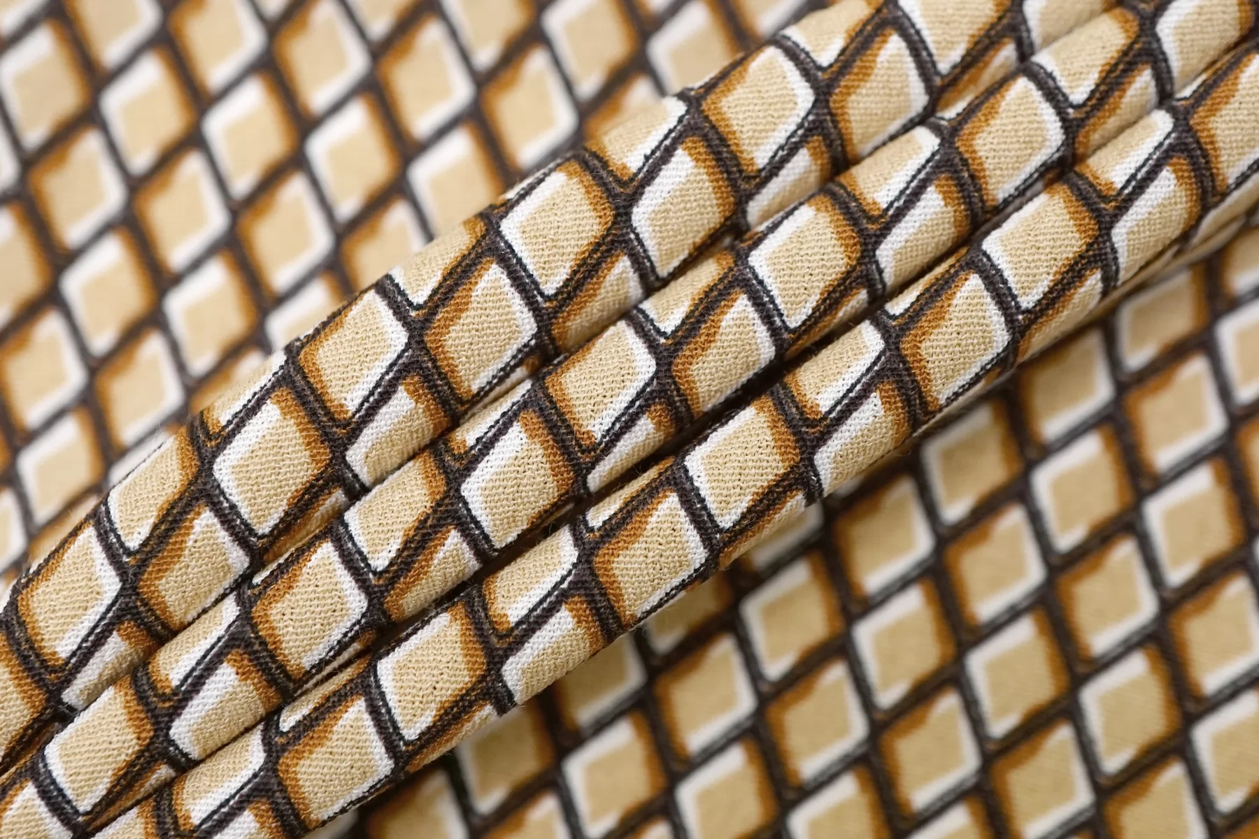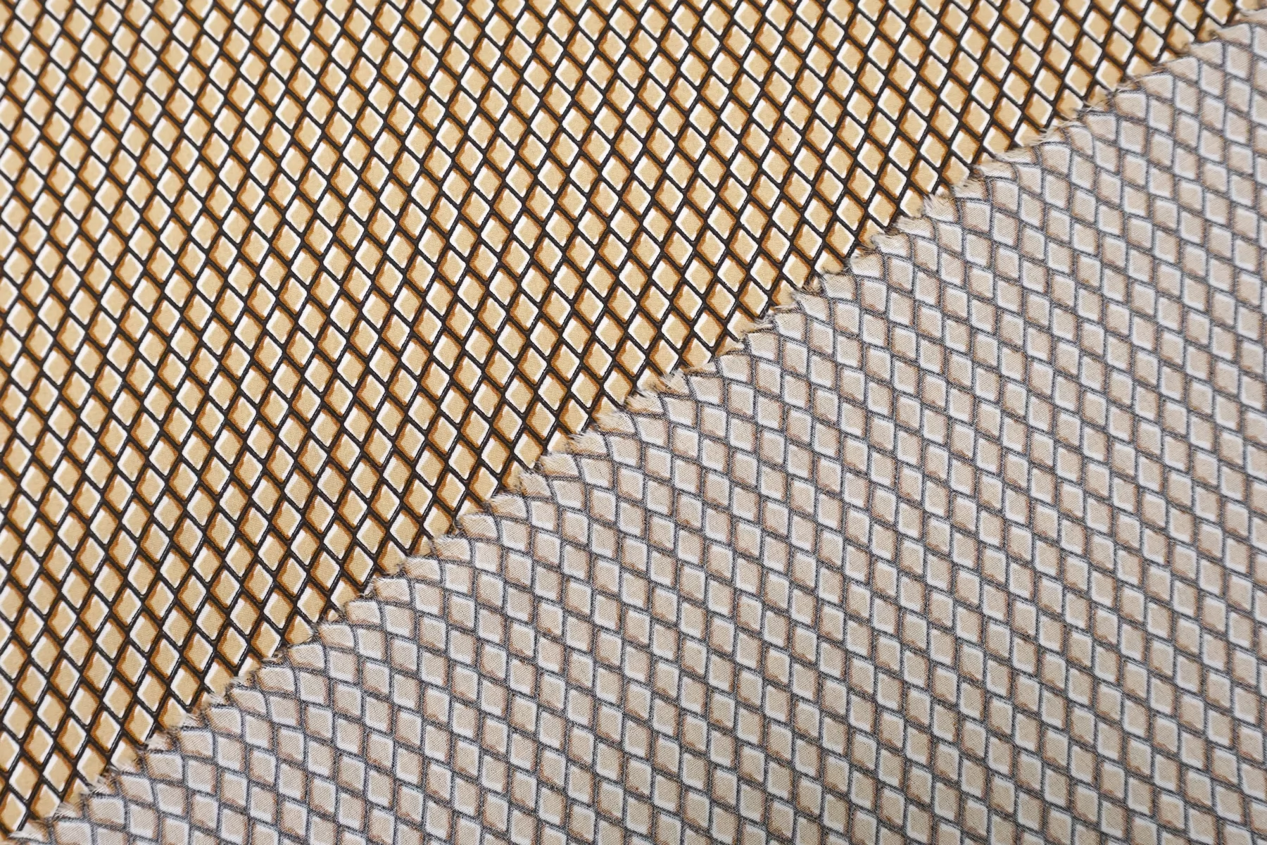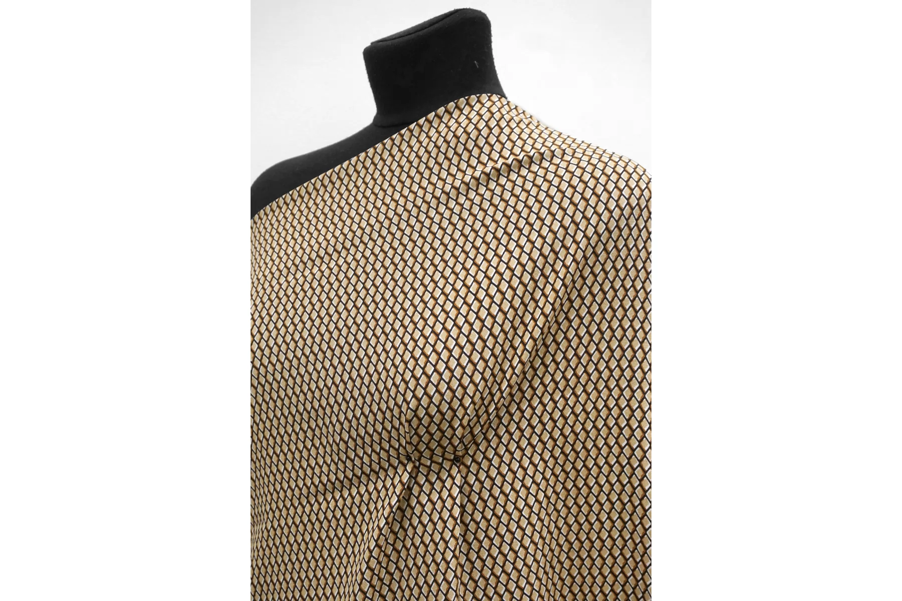 Креповая вискоза геометрическим принтом, сочетание чёрного, бежевого, коричневого и белого цвета. Напоминает принт чешуи. Приятная и шероховатая наощупь. Тонкая, пластичная, красиво драпируется, форму не держит. Плетение немного пружинит. Минимально просвечивает в один слой. Мнется. Прекрасный вариант на летние платья, юбки, летящие брюки, блузки. Учитывайте усадку.