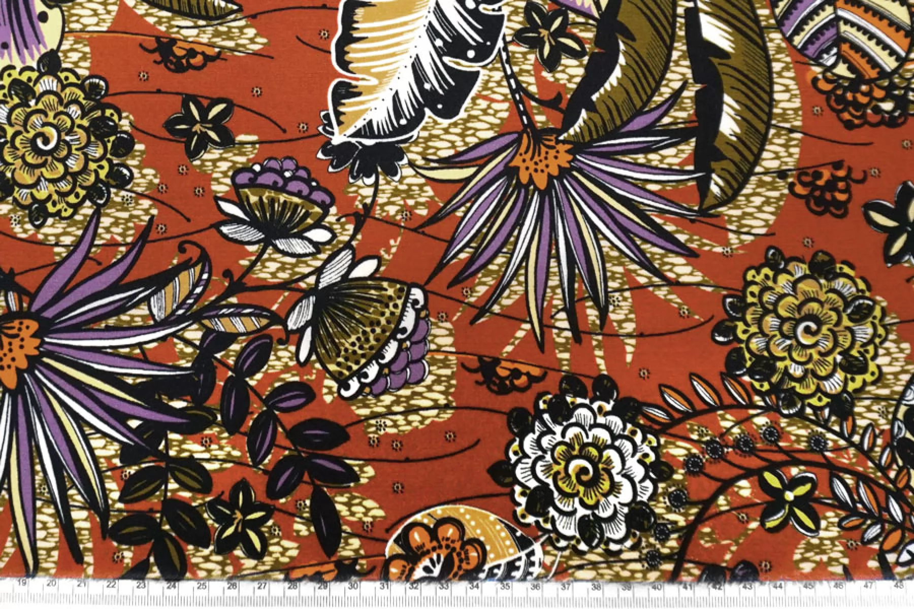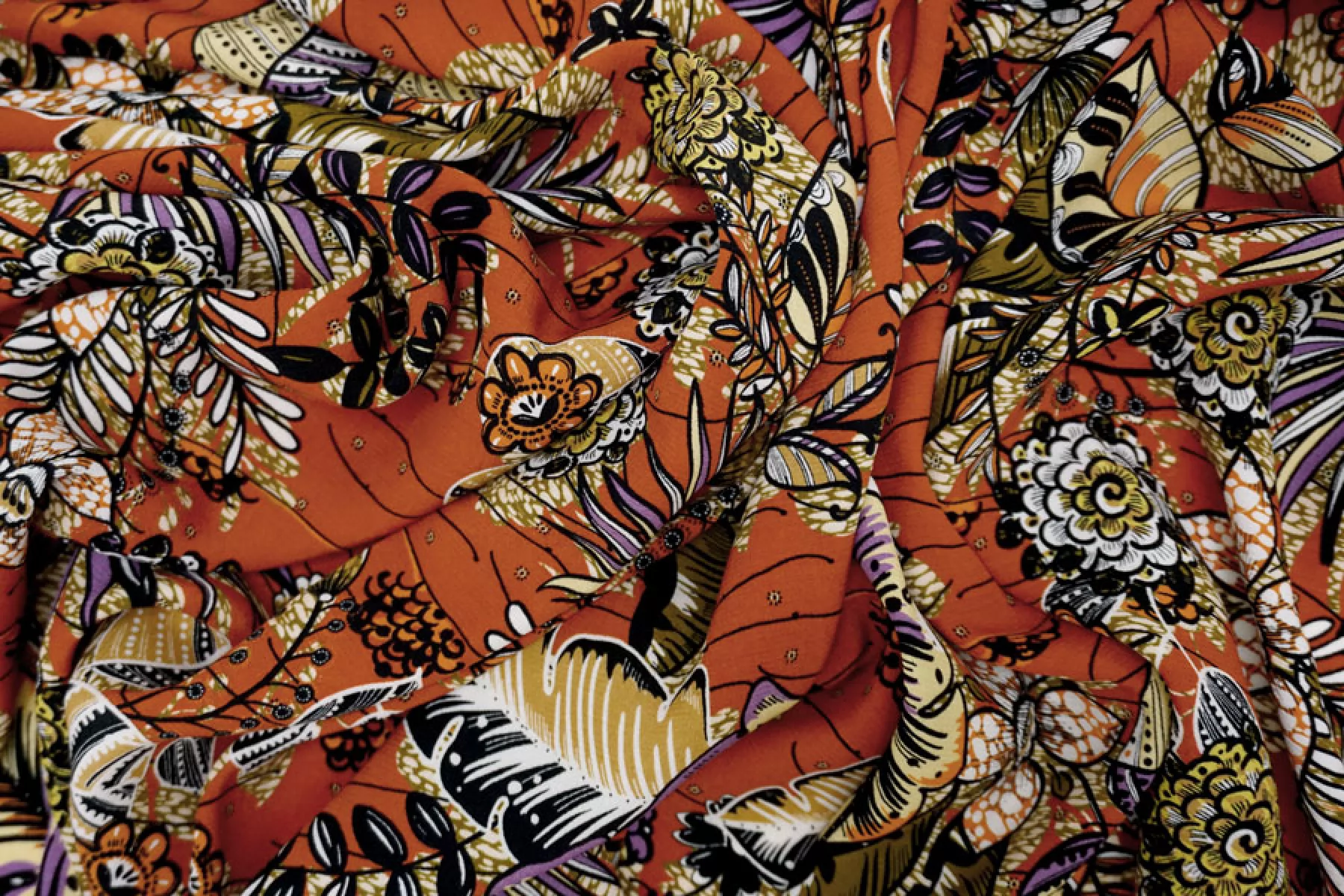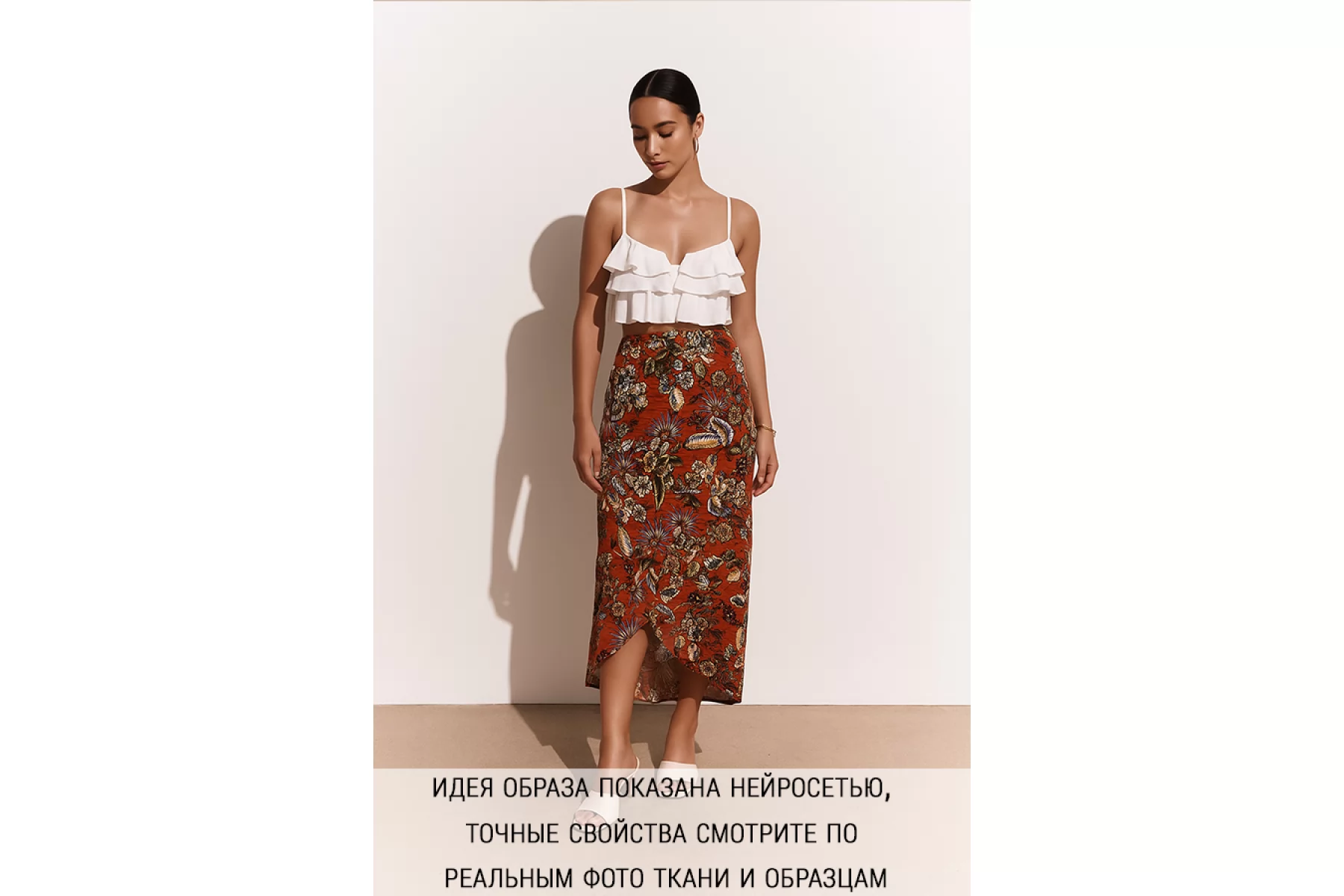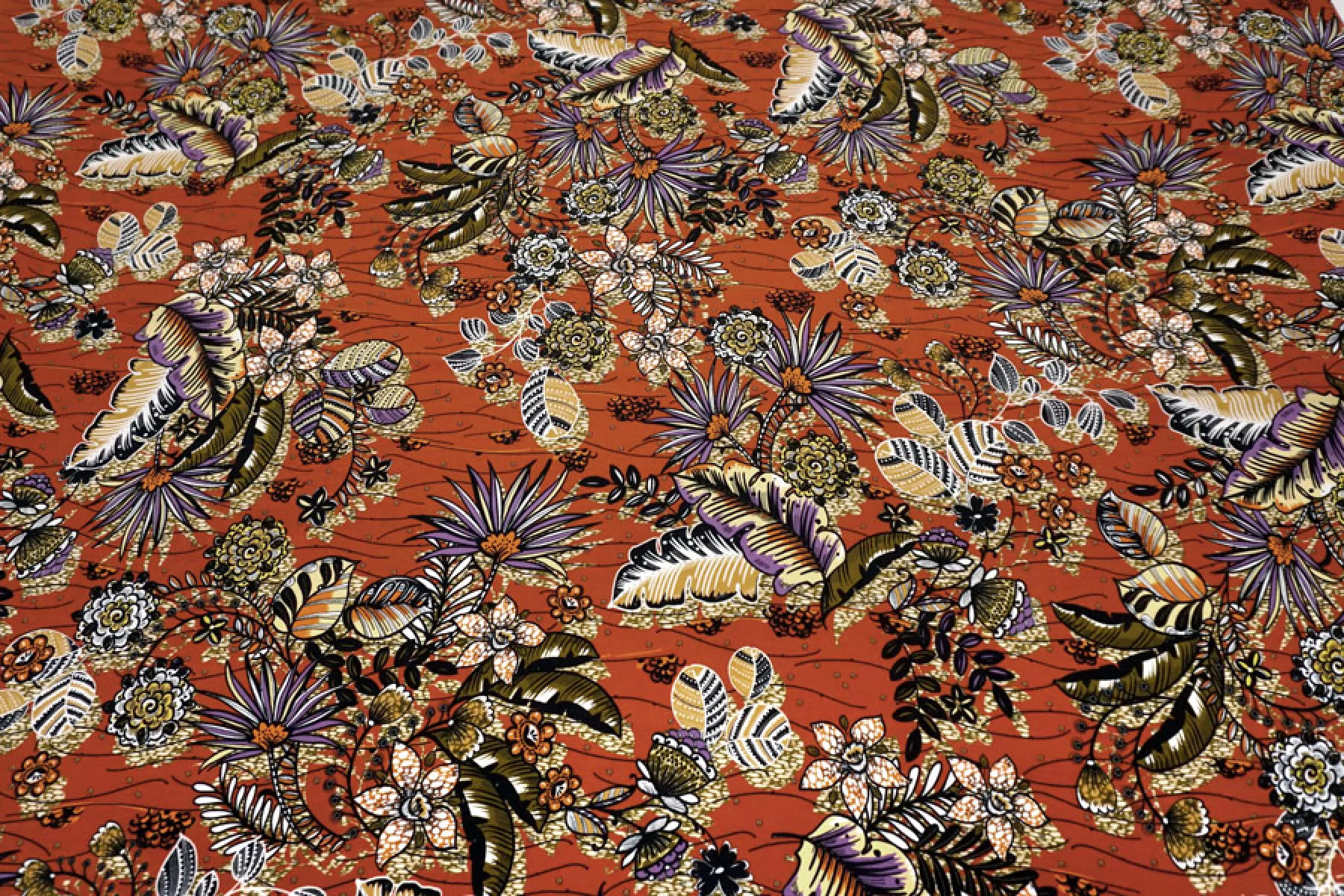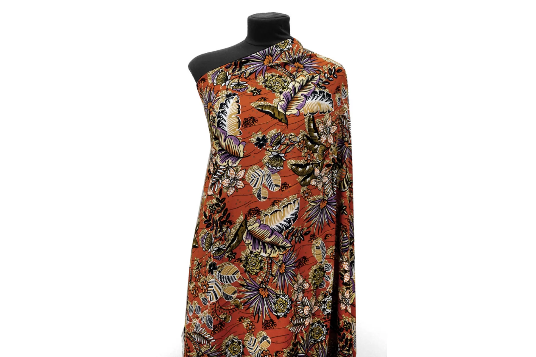 Креповая вискоза со стилизованным принтом в виде цветов и листьев на терракотовом фоне. Материал тактильно слегка шероховатый, мягкий. Слегка просвечивает силуэт и слегка мнется. Красив в своей пластике. Пружинит за счет плетения. Форму практически не держит. Используем на платья, блузки или юбки. Обязательно учитывайте усадку 5-10%.