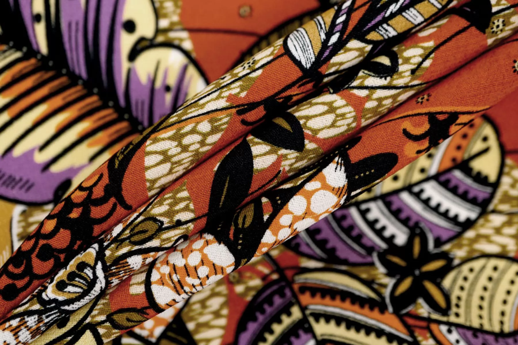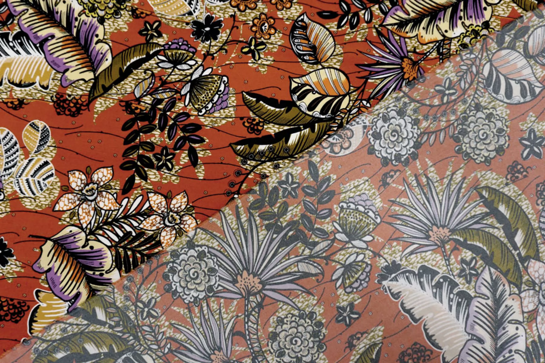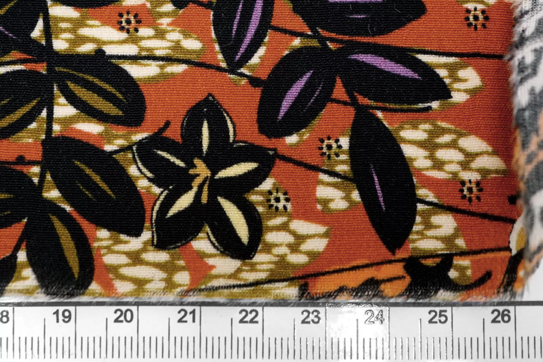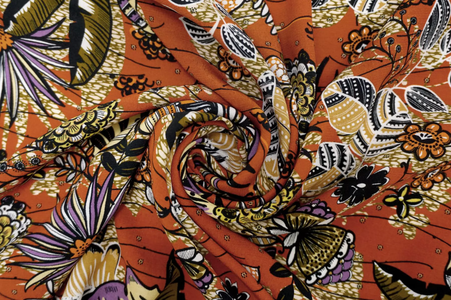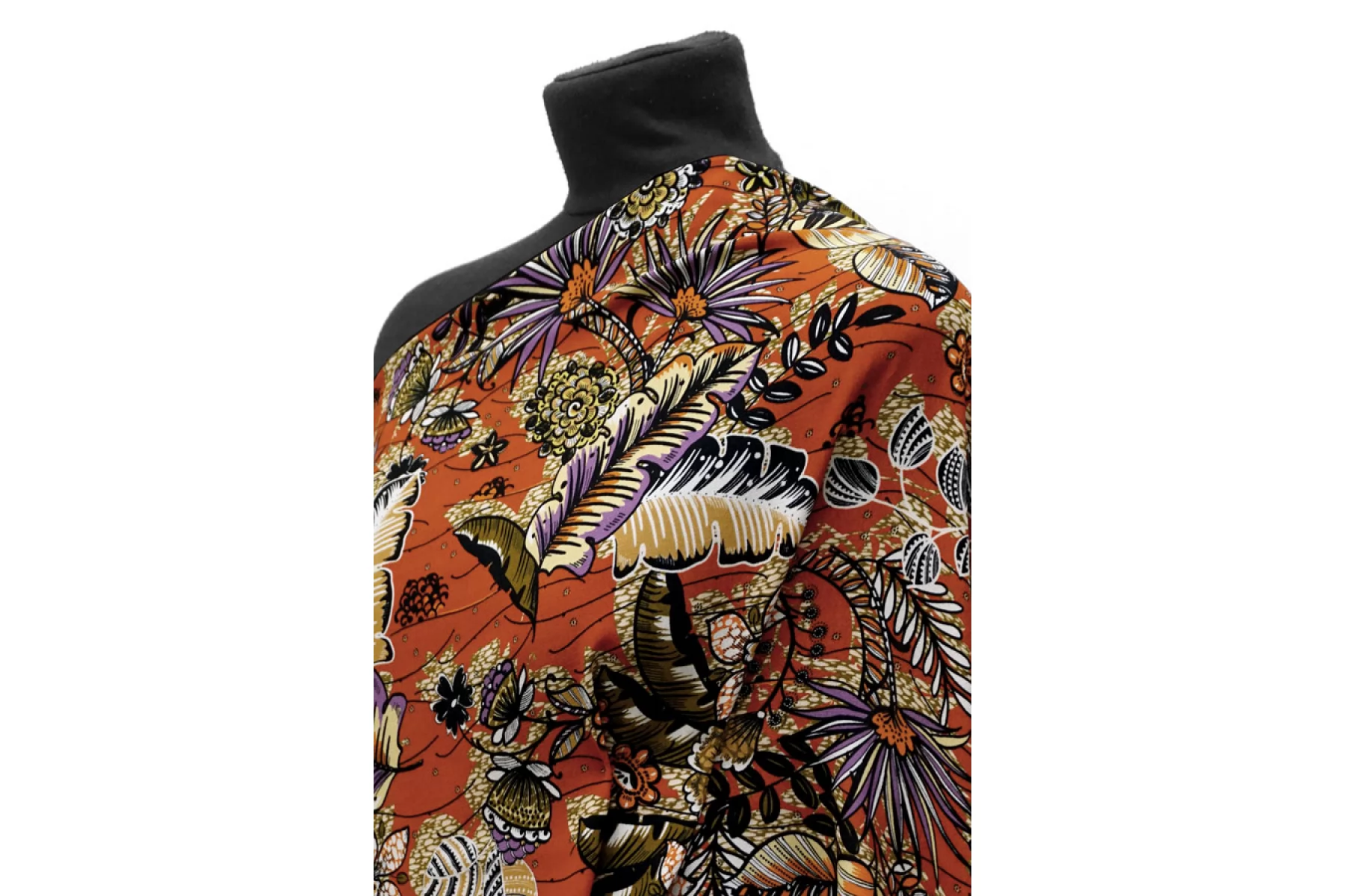 Креповая вискоза со стилизованным принтом в виде цветов и листьев на терракотовом фоне. Материал тактильно слегка шероховатый, мягкий. Слегка просвечивает силуэт и слегка мнется. Красив в своей пластике. Пружинит за счет плетения. Форму практически не держит. Используем на платья, блузки или юбки. Обязательно учитывайте усадку 5-10%.