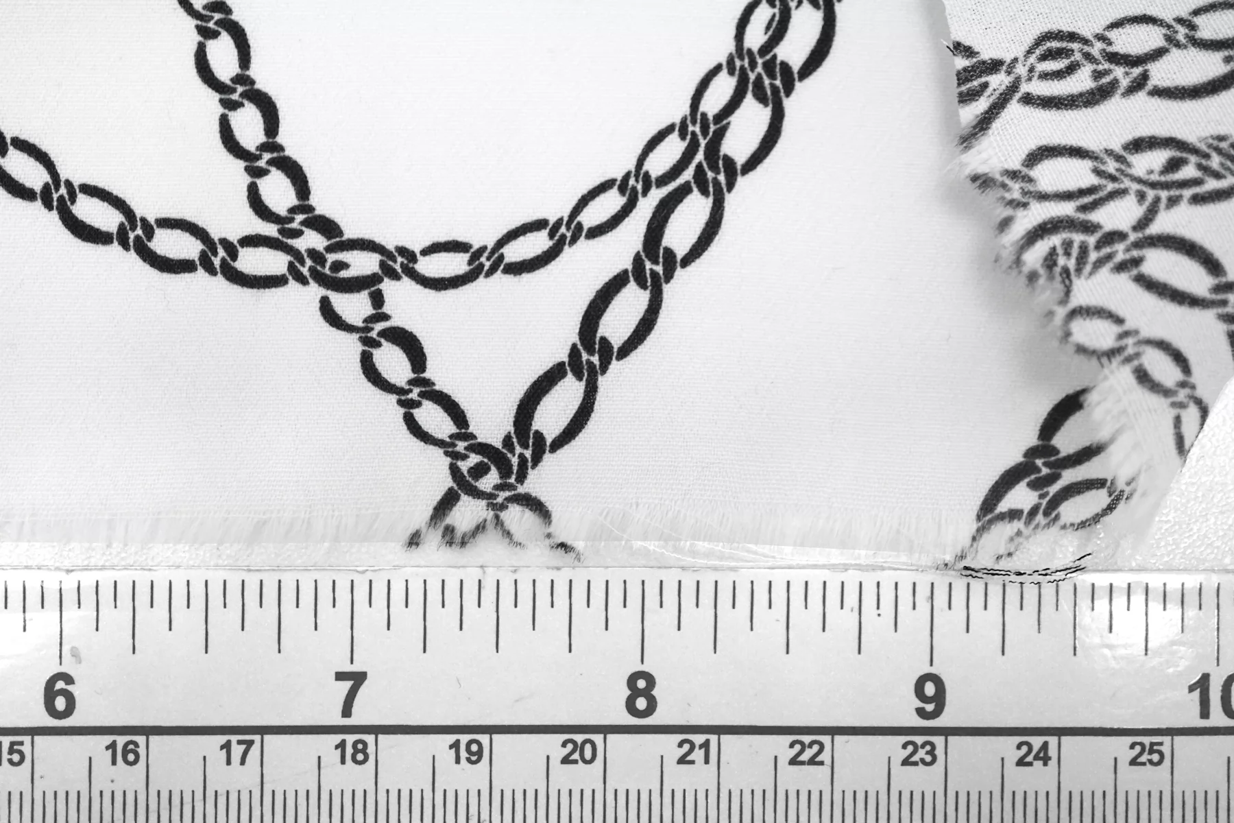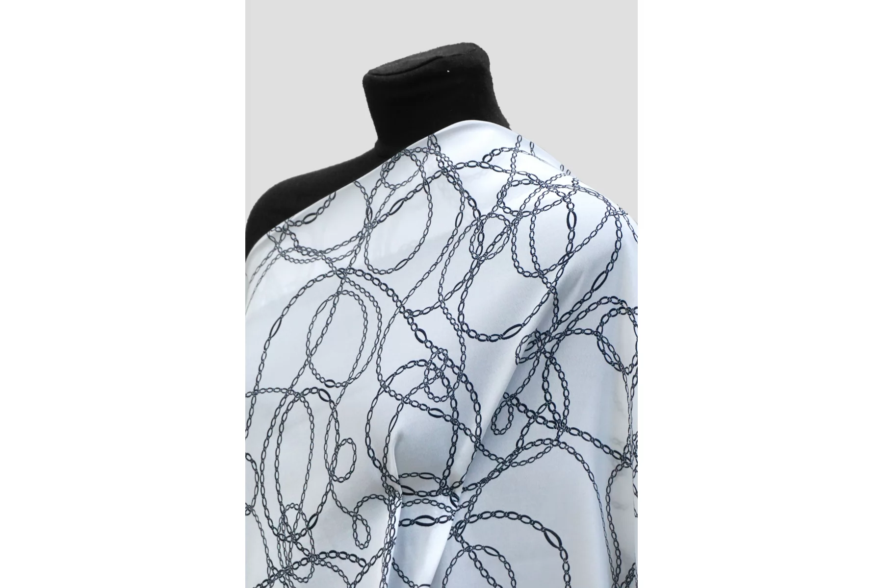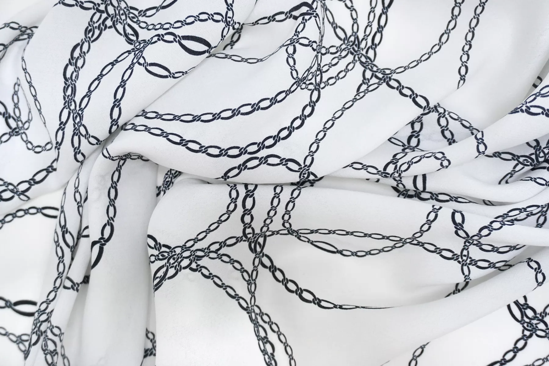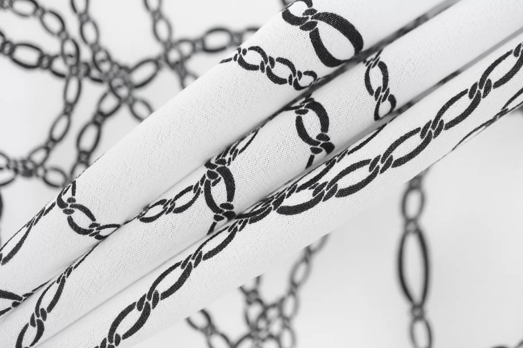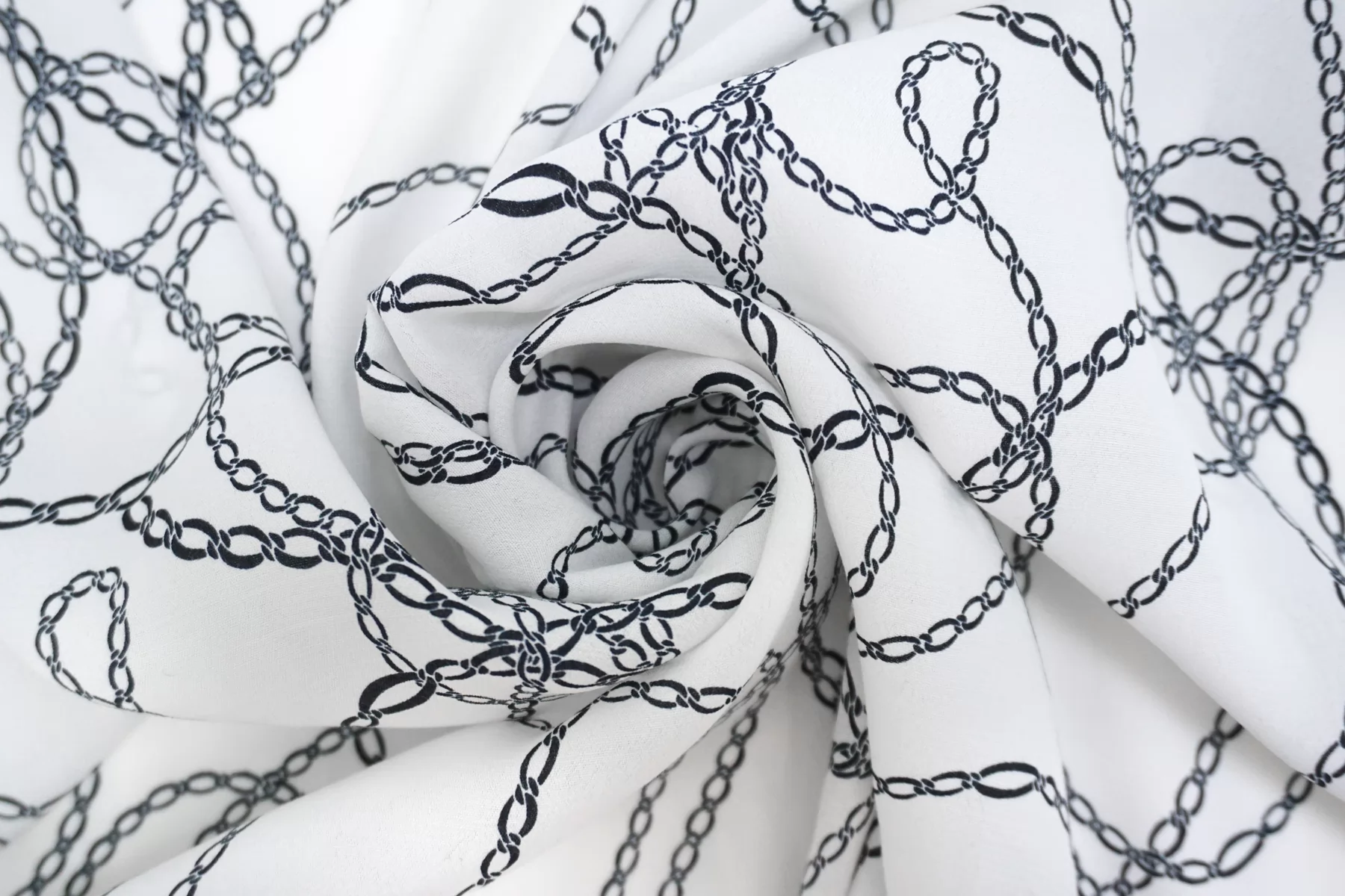 Шикарная креповая вискоза c принтом в виде чёрных цепей на белом фоне. Приятная и шероховатая наощупь. Тонкая, пластичная, холодящая красиво драпируется, форму не держит. Немного просвечивает силуэт. Немного мнется. Немножко растягивается. Отличный вариант на платья, юбки, блузки. Учитывайте возможную усадку.