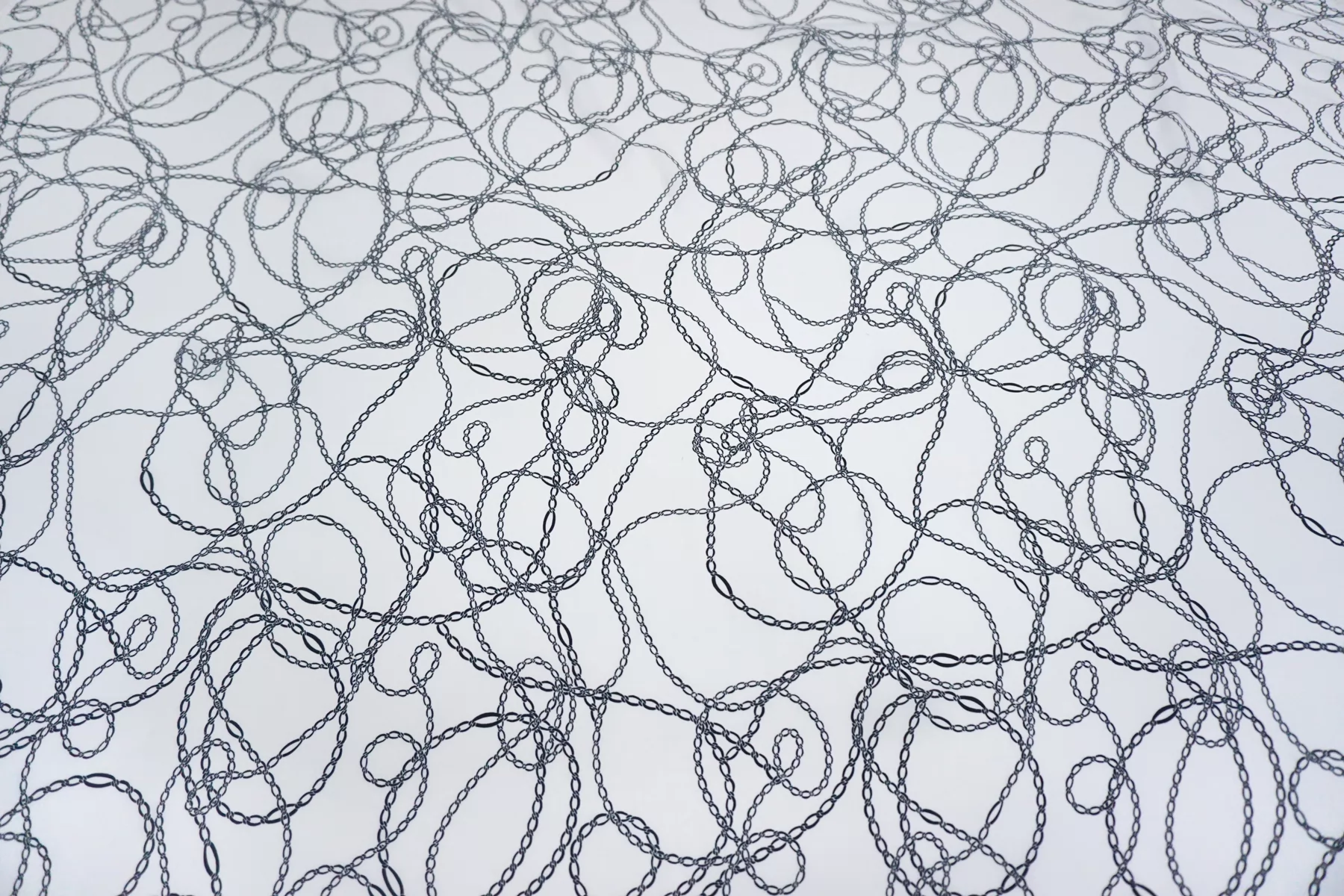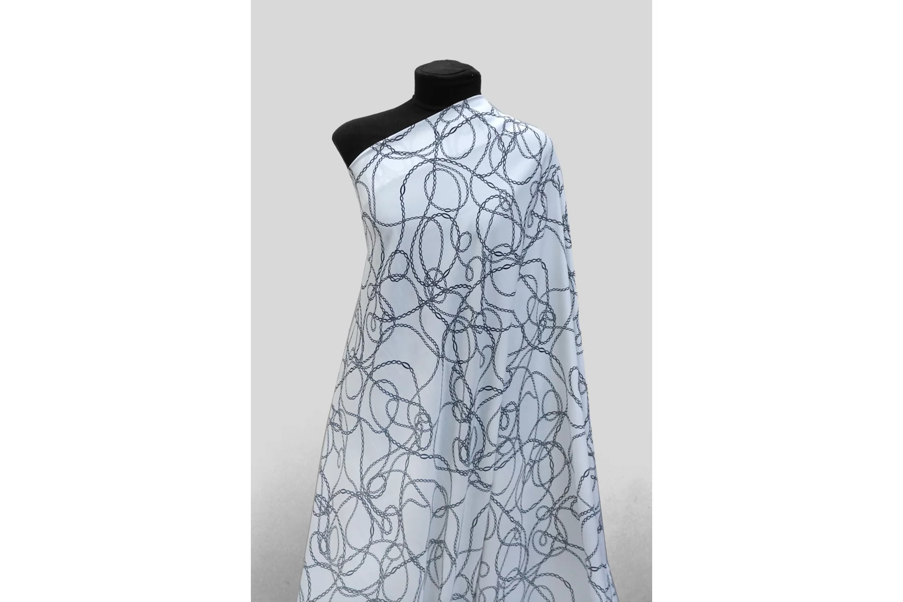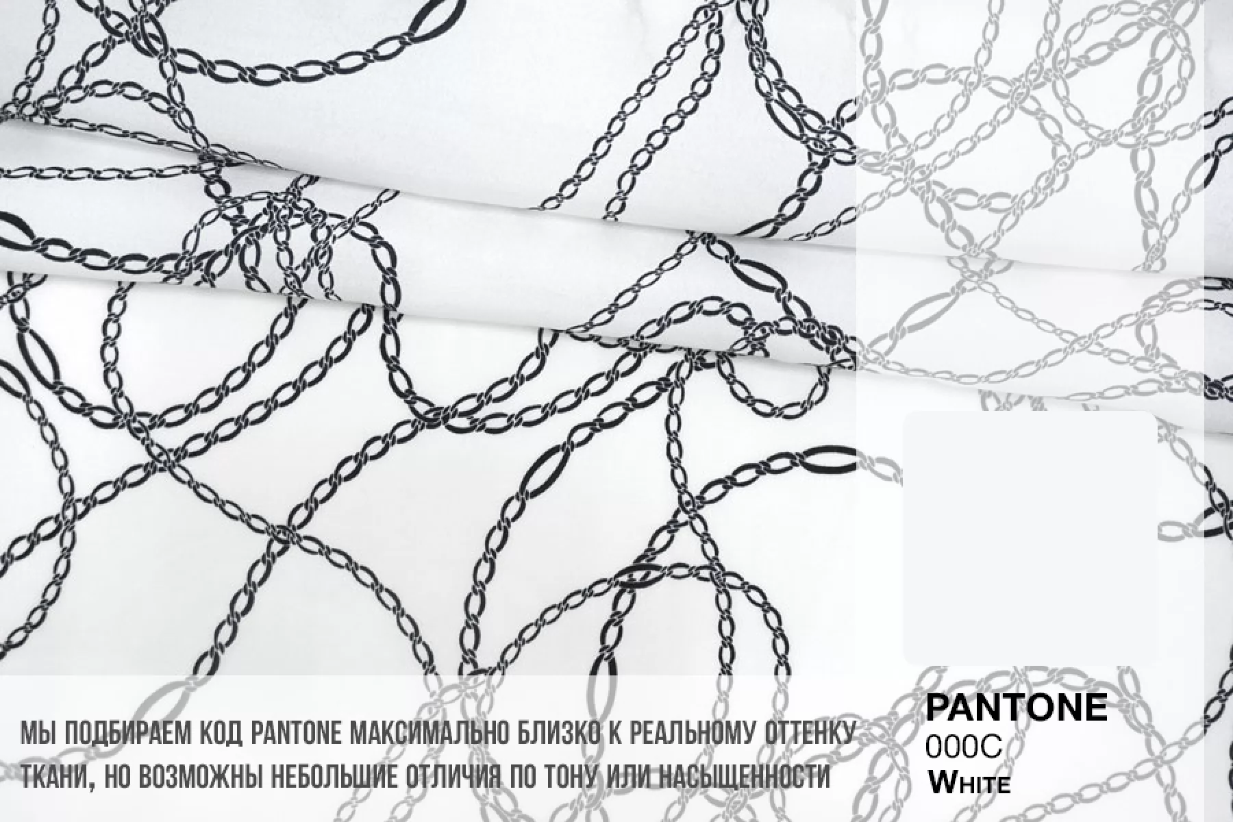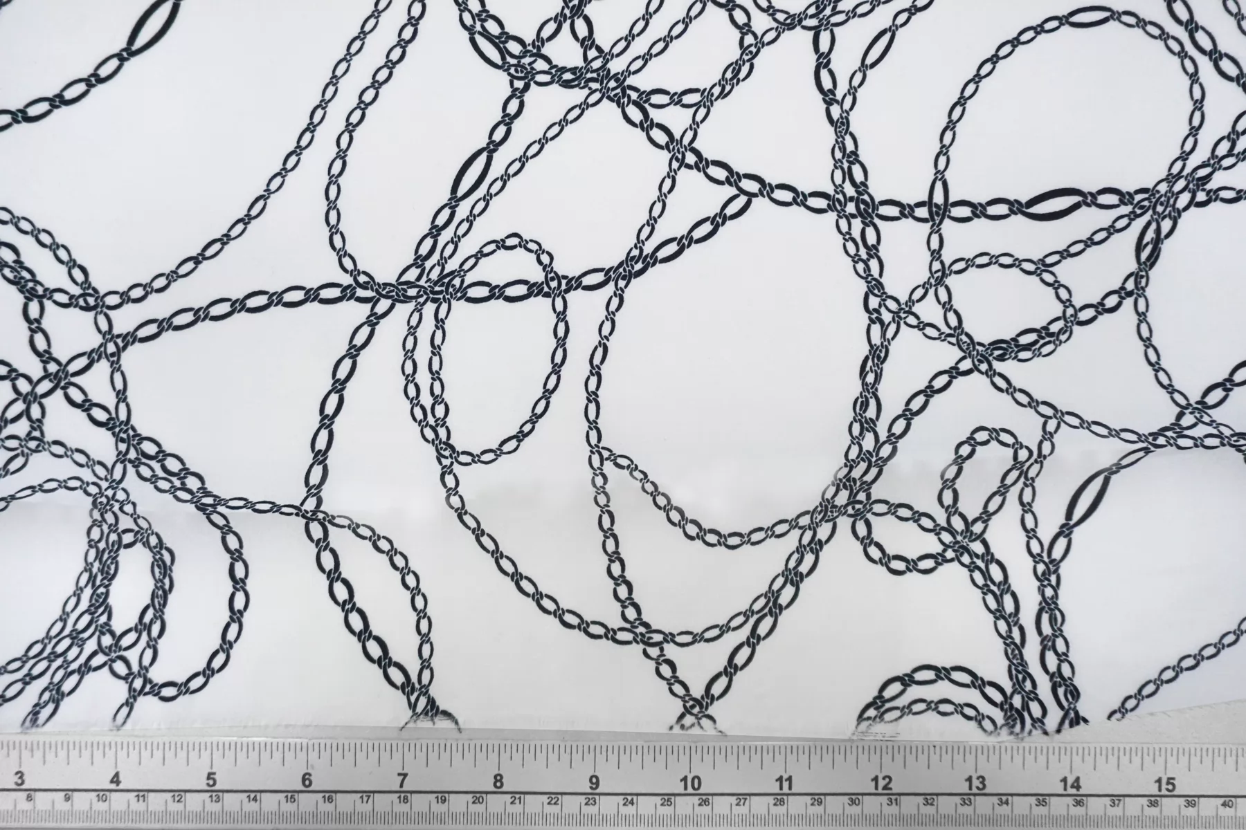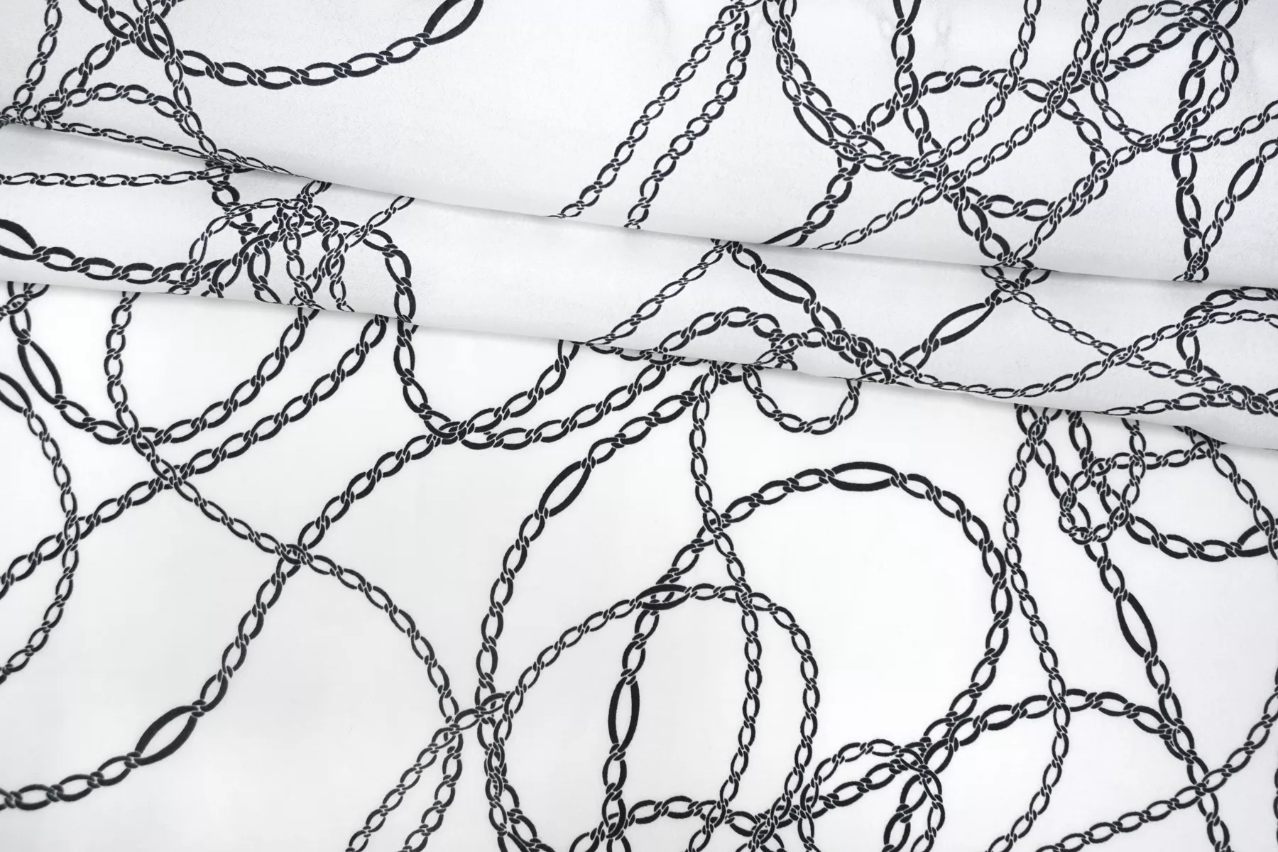 Шикарная креповая вискоза c принтом в виде чёрных цепей на белом фоне. Приятная и шероховатая наощупь. Тонкая, пластичная, холодящая красиво драпируется, форму не держит. Немного просвечивает силуэт. Немного мнется. Немножко растягивается. Отличный вариант на платья, юбки, блузки. Учитывайте возможную усадку.