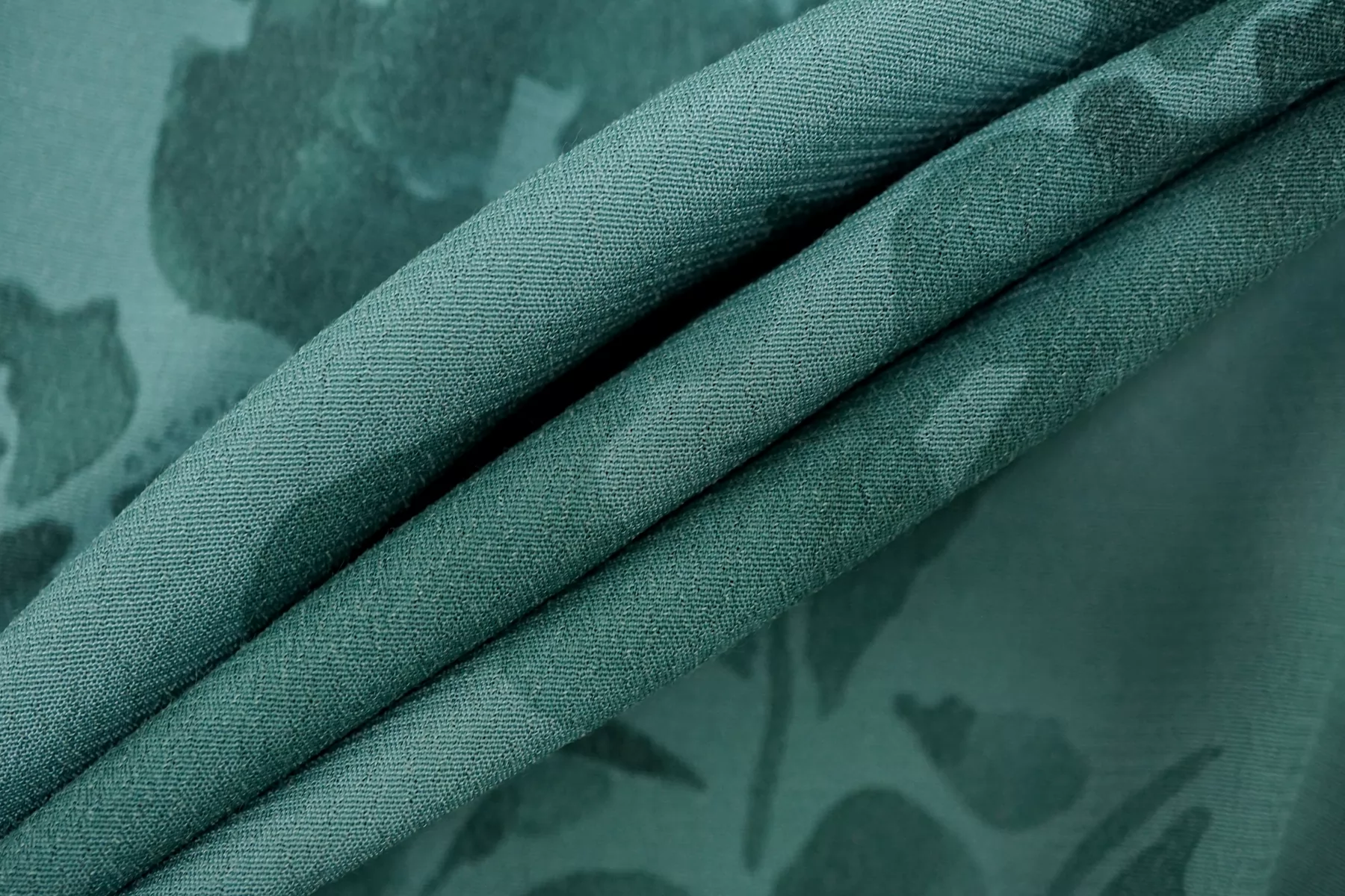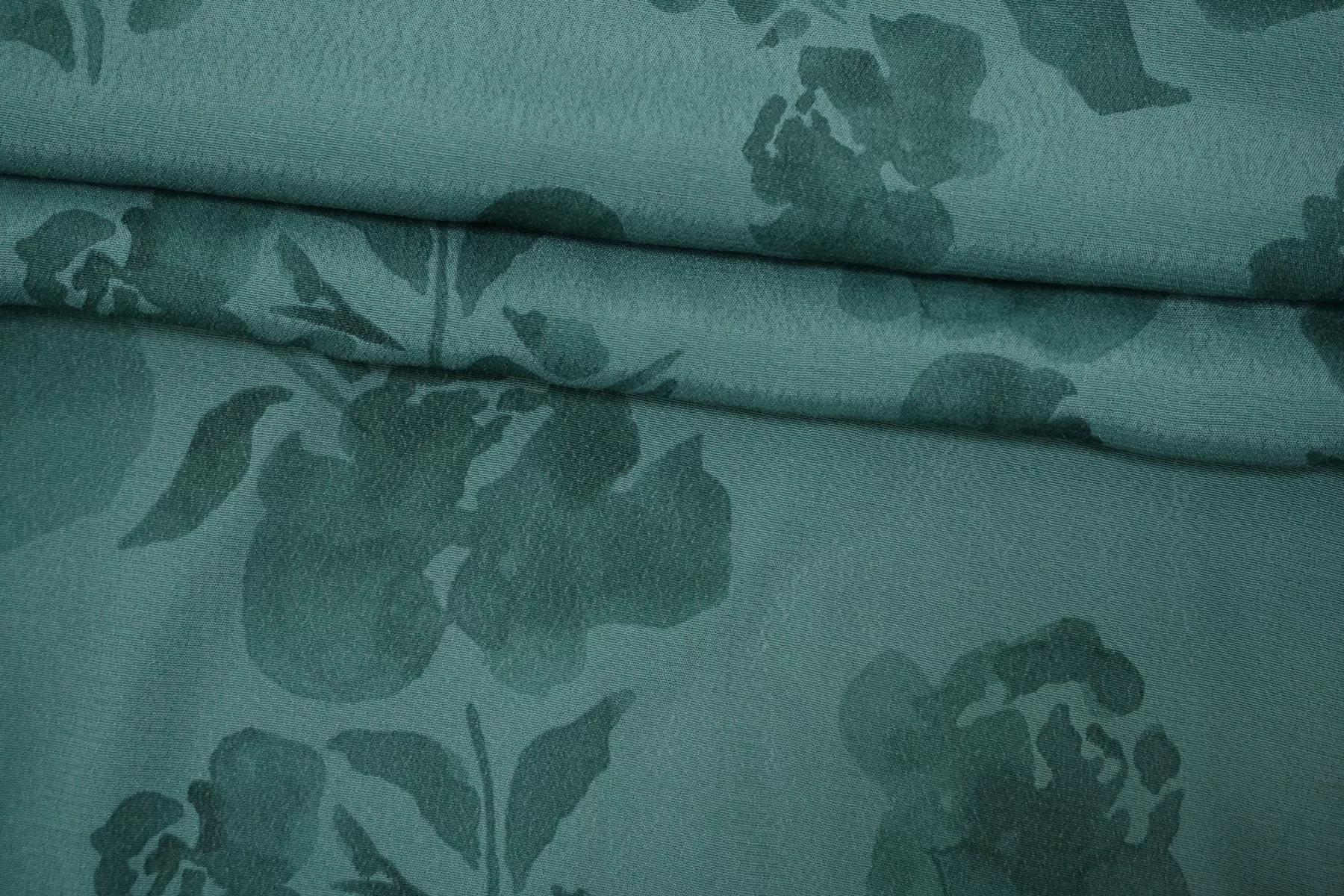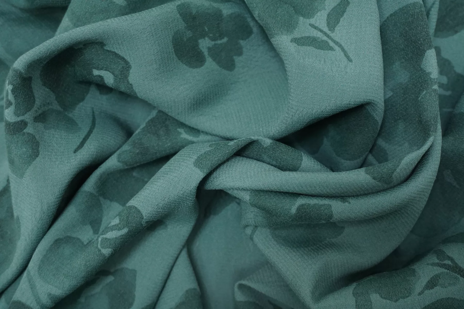 Креповая вискоза в приглушённом бирюзовом оттенке. Приятная и шероховатая наощупь. Тонкая, пластичная, красиво драпируется, форму не держит. Немного просвечивает силуэт. Тянется. Не мнется. Отличный вариант на платья, юбки, блузки. Учитывайте возможную усадку.