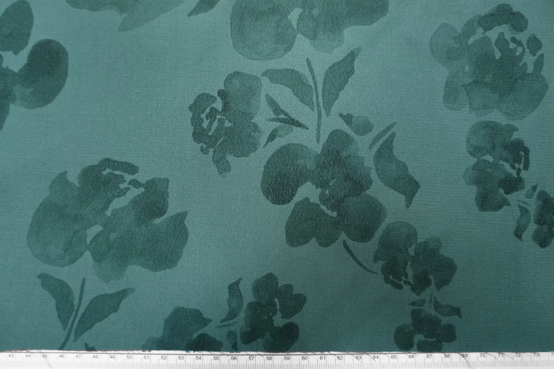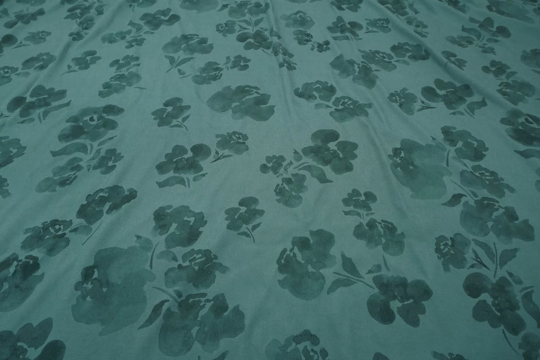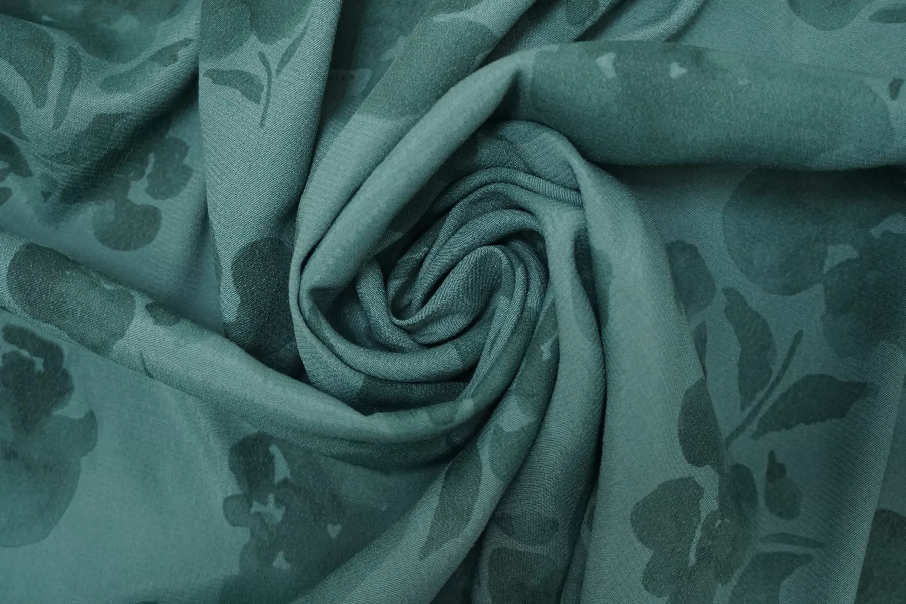 Креповая вискоза в приглушённом бирюзовом оттенке. Приятная и шероховатая наощупь. Тонкая, пластичная, красиво драпируется, форму не держит. Немного просвечивает силуэт. Тянется. Не мнется. Отличный вариант на платья, юбки, блузки. Учитывайте возможную усадку.