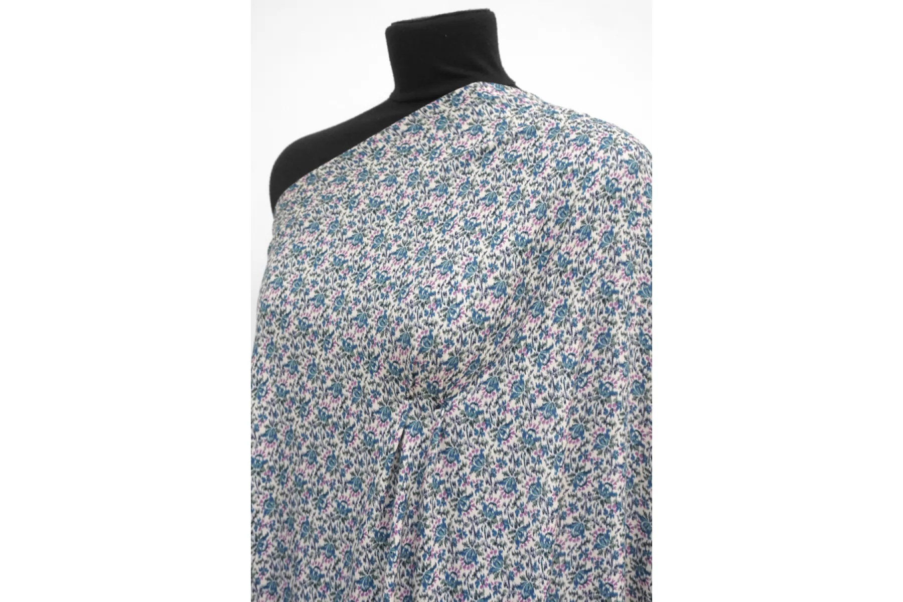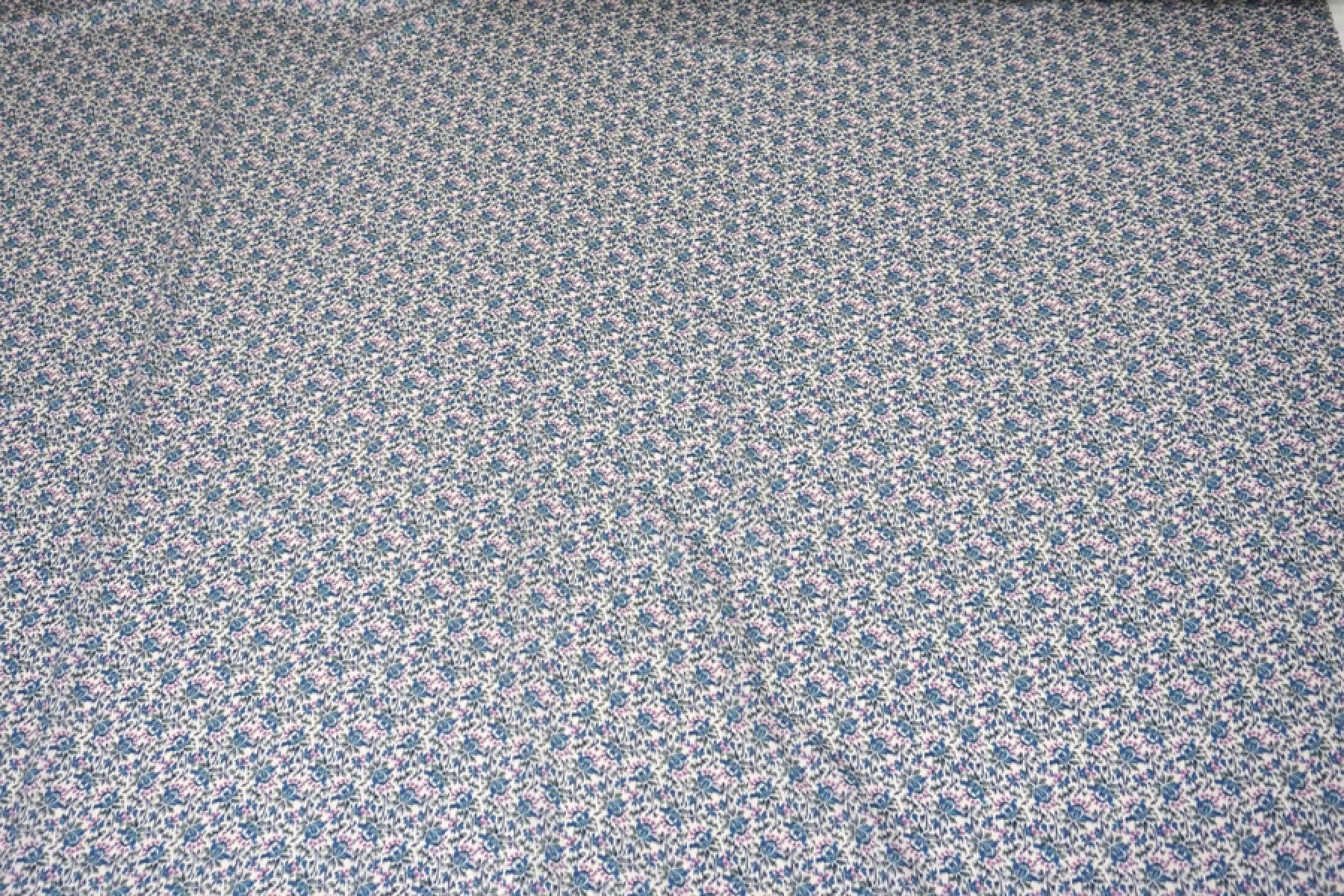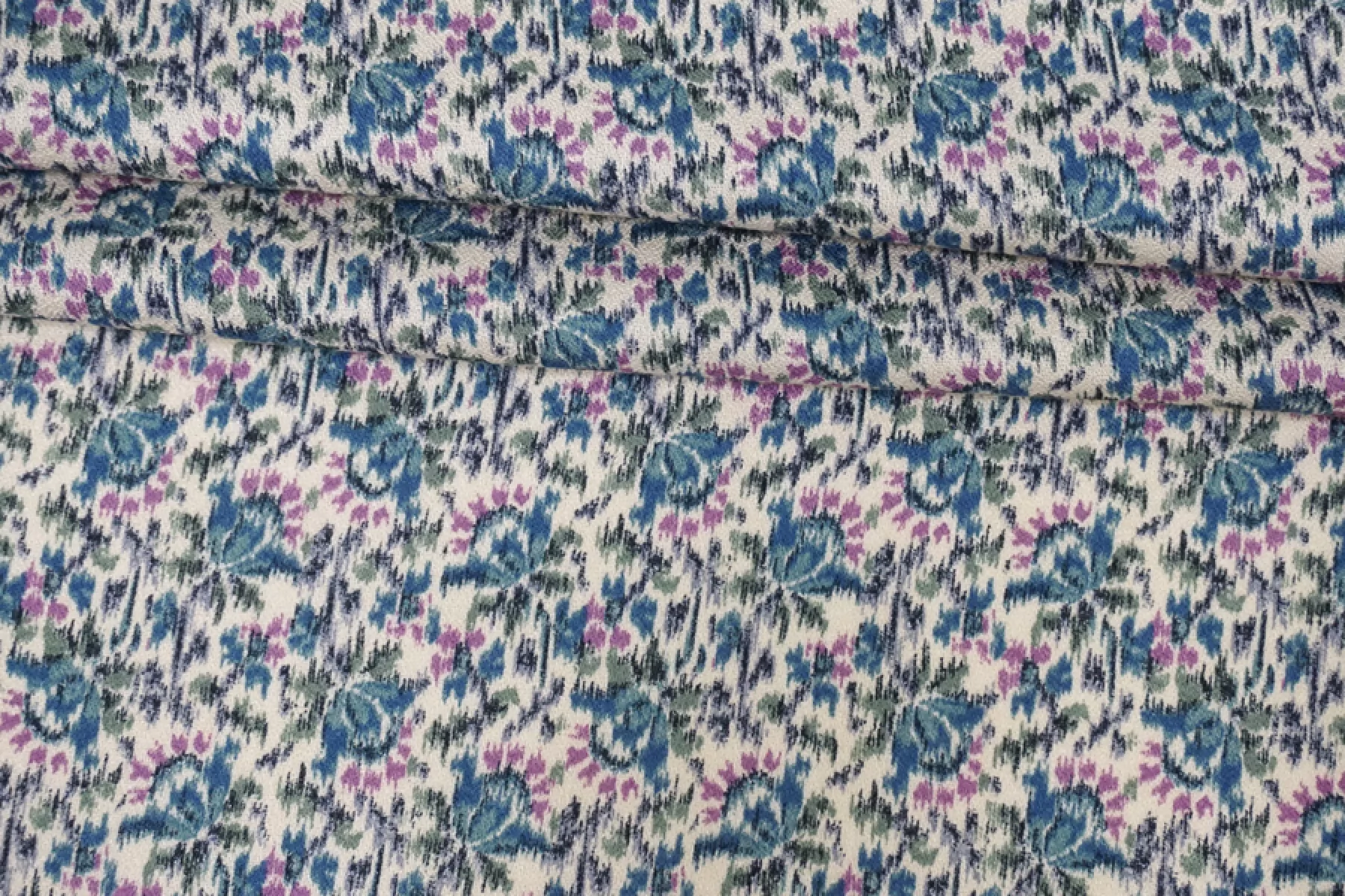 Прекрасная плательно-блузочная креповая вискоза с небольшим добавлением шерсти. В основе материала молочно-бежевый оттенок и цветочный достаточно частый принт в стиле икат, оттенков синего, зеленого и лилового. Материал тактильно слегка шероховатый, но очень мягкий и приятный. Не просвечивает силуэт. Пластичный, форму не держит. Не тянется, но очень слабо пружинит за счет плетения. Не мнется. Шьем платья, блузки или юбки, а также одежду в бельевом стиле. Обязательно учитывайте усадку 5-10%.