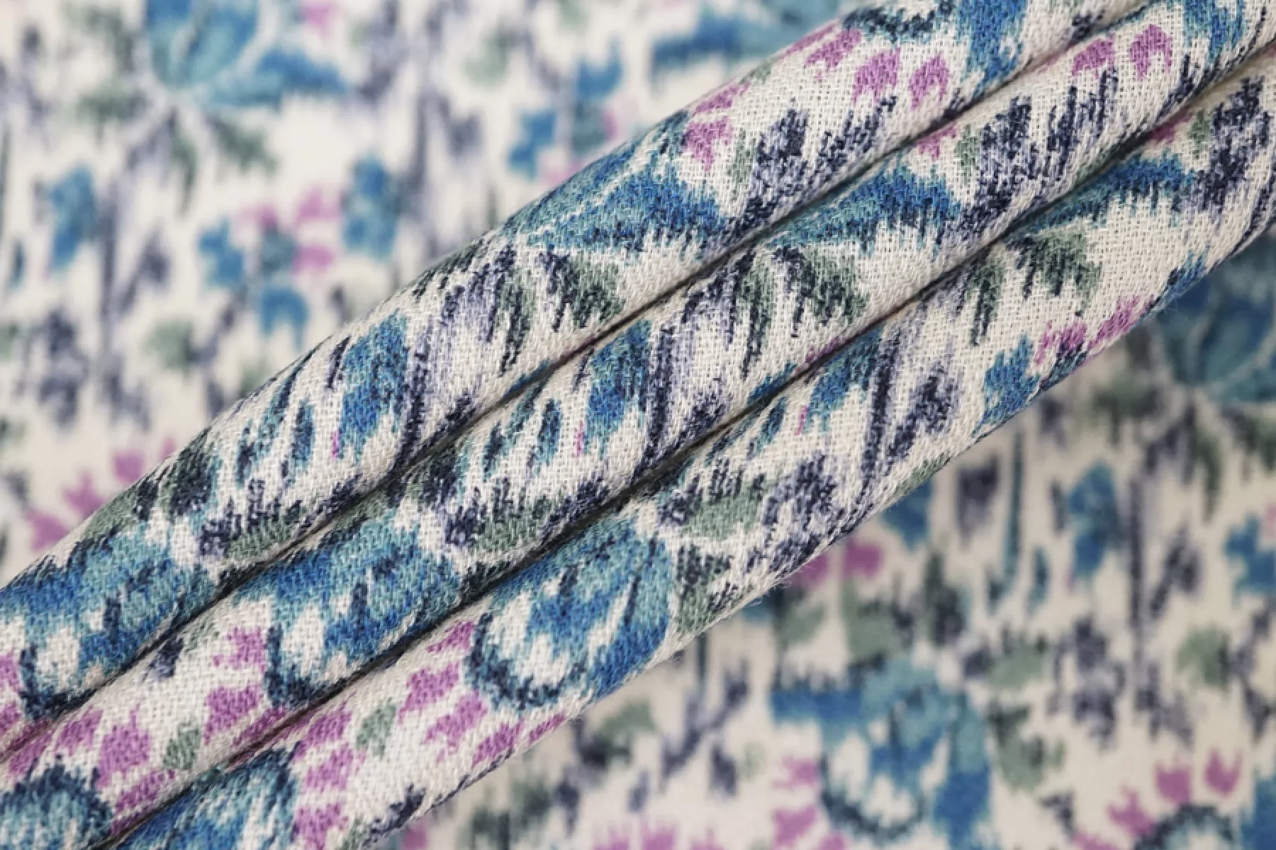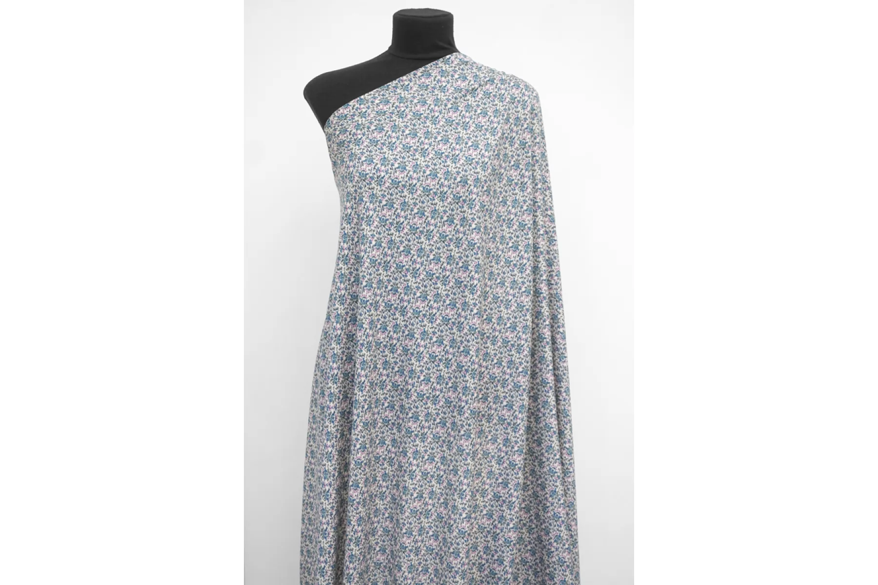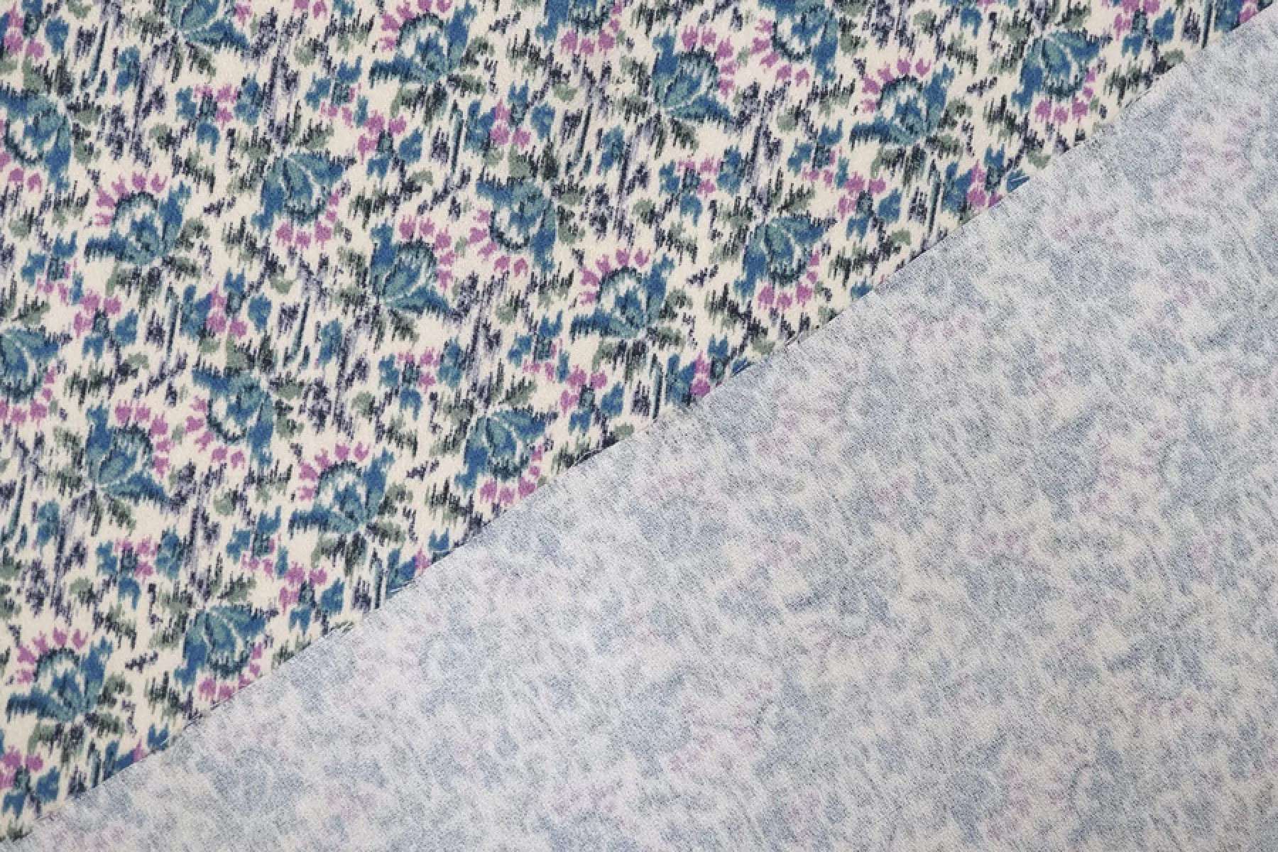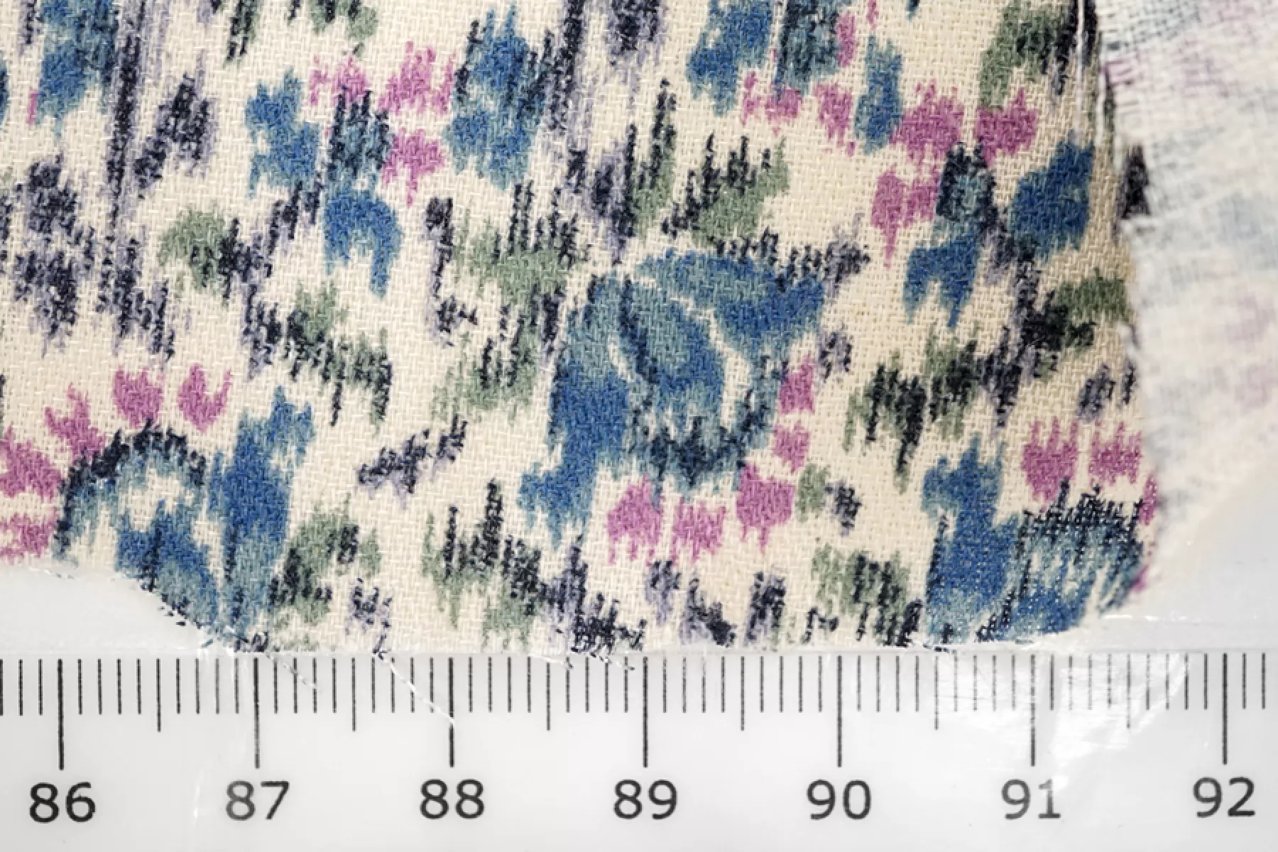 Прекрасная плательно-блузочная креповая вискоза с небольшим добавлением шерсти. В основе материала молочно-бежевый оттенок и цветочный достаточно частый принт в стиле икат, оттенков синего, зеленого и лилового. Материал тактильно слегка шероховатый, но очень мягкий и приятный. Не просвечивает силуэт. Пластичный, форму не держит. Не тянется, но очень слабо пружинит за счет плетения. Не мнется. Шьем платья, блузки или юбки, а также одежду в бельевом стиле. Обязательно учитывайте усадку 5-10%.