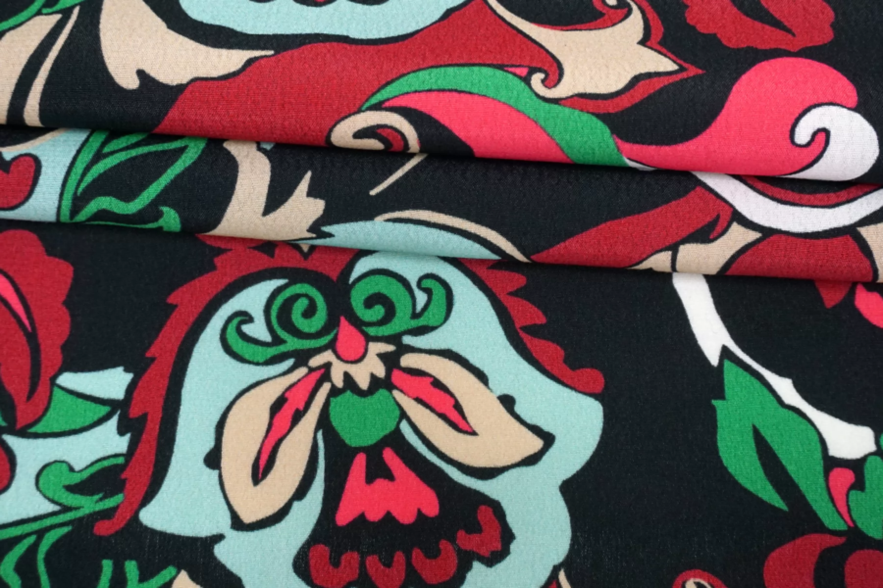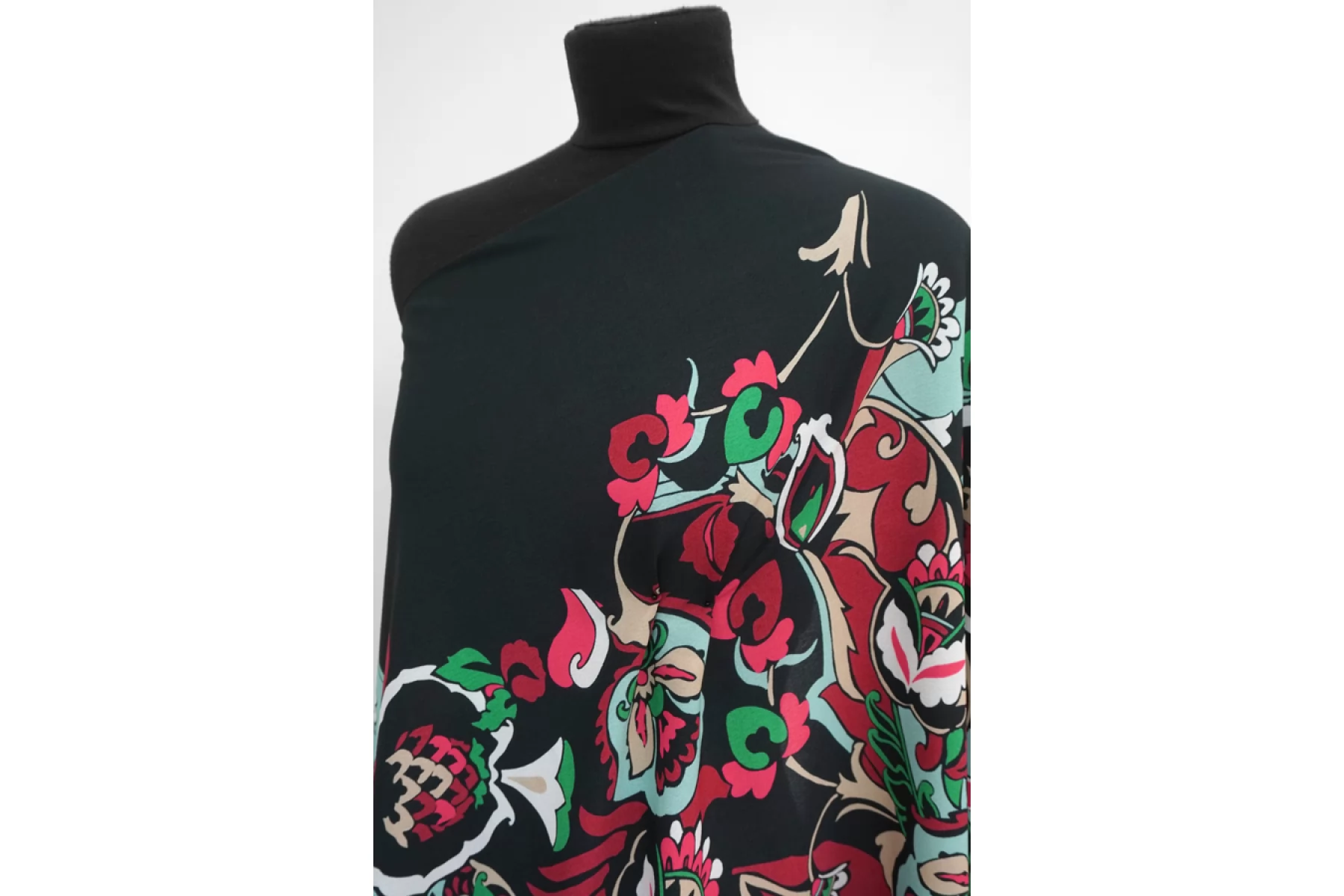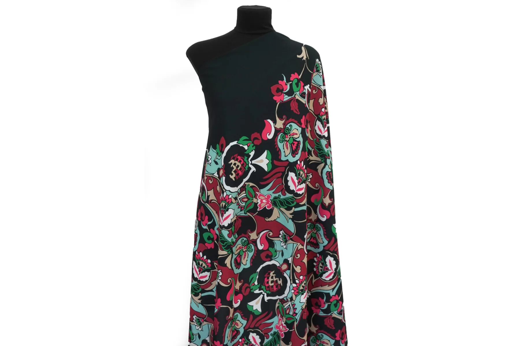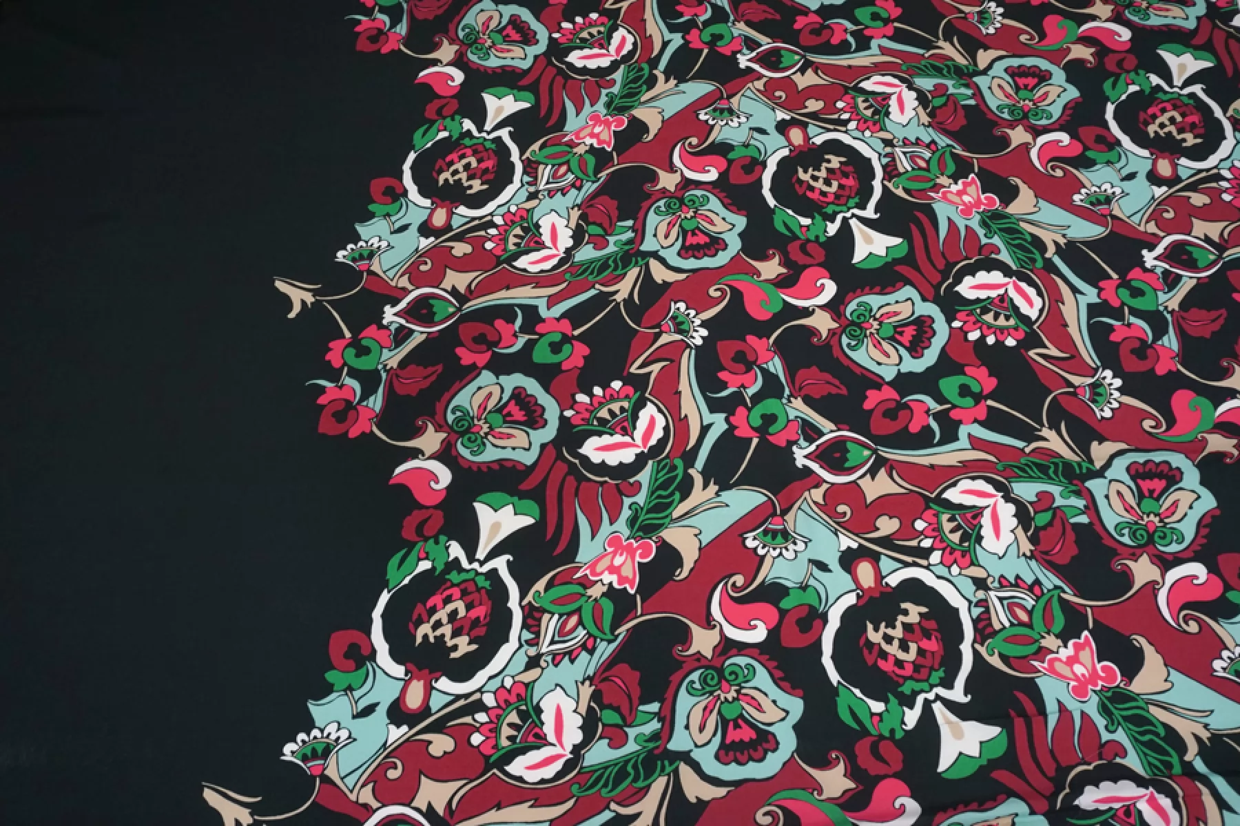 Красивая креповая вискоза припыленного темно-синего оттенка, уходящего в черный, с краевым принтом в виде орнаментального узора в оттенках зеленого, розового, бежевого, винного, светло-голубого и не только. Однотонный участок по ширине около 47 см. Несмотря на принт, кроить можно как вдоль, так и поперек. Тактильно мягкая, приятная, слегка шероховатая. Не тянется ( совсем немного пружинит за счет крепового плетения).Слегка сминается, но восстанавливается почти полностью. Форму не держит, но хороша в складках и пластике. Просвечивает силуэт, если смотреть на просвет. Прекрасно подойдет на платья, блузки или юбки. Обязательно учитывайте усадку 5-10%. При необходимости используйте подкладочный материал.