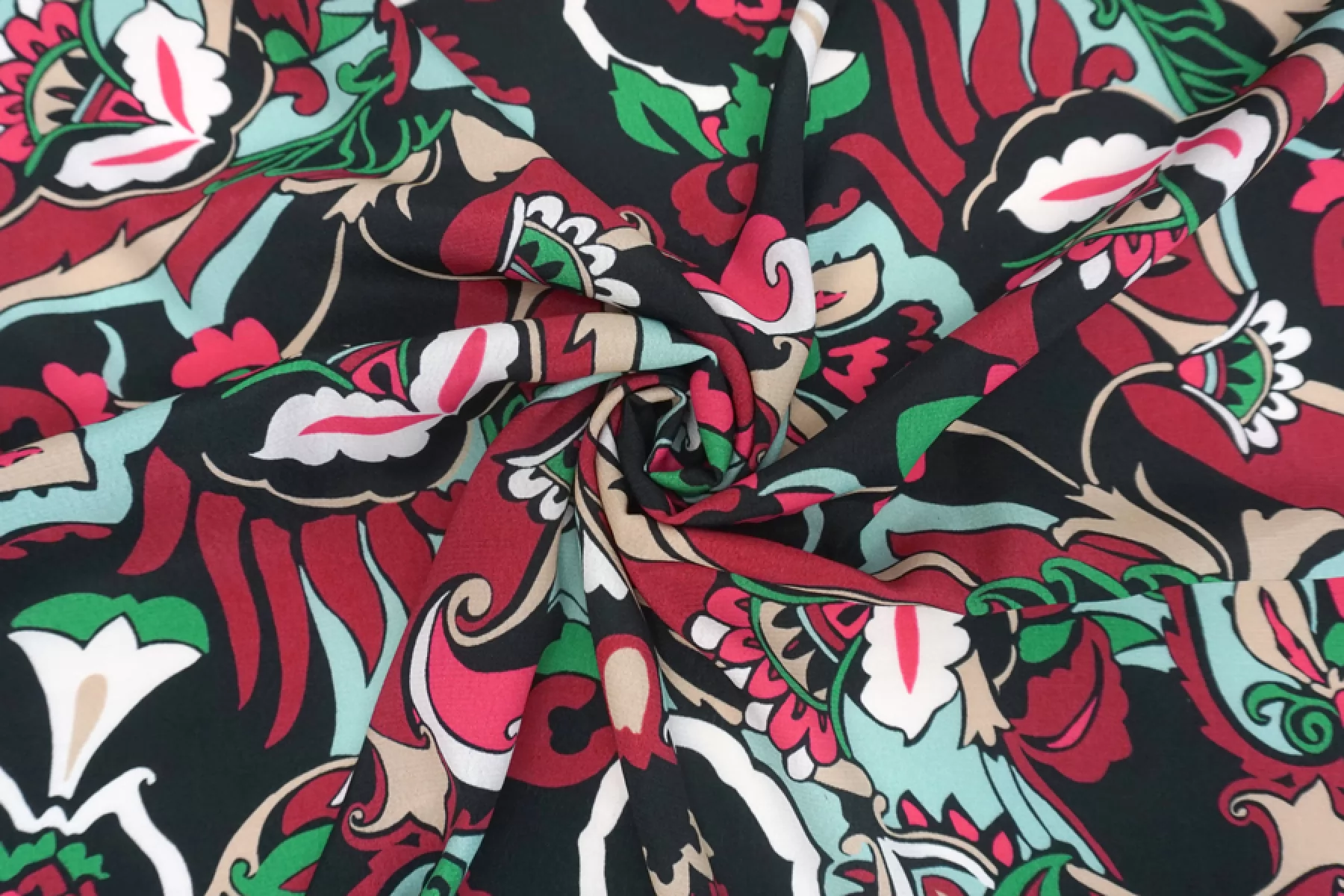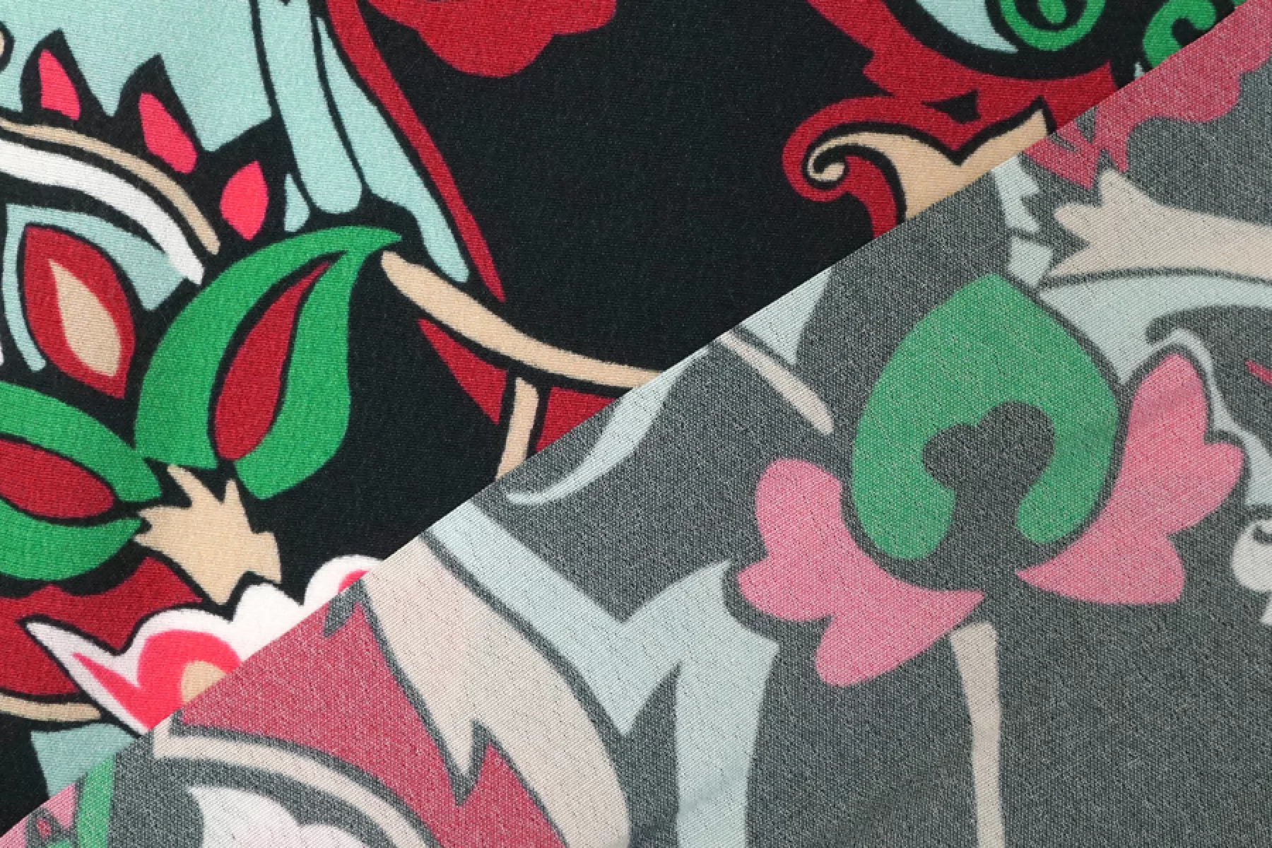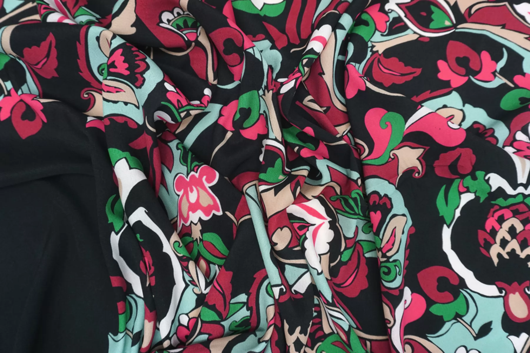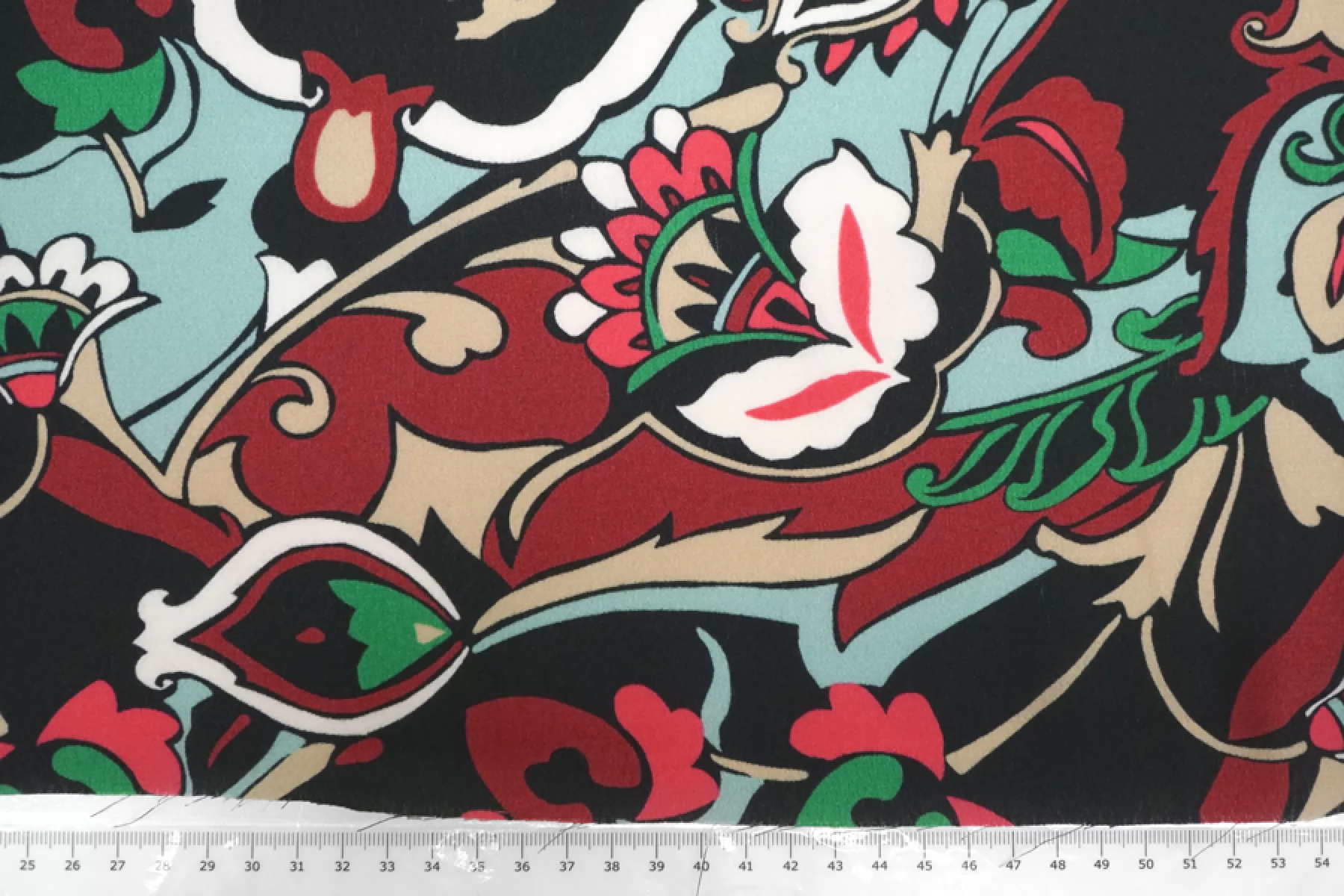 Красивая креповая вискоза припыленного темно-синего оттенка, уходящего в черный, с краевым принтом в виде орнаментального узора в оттенках зеленого, розового, бежевого, винного, светло-голубого и не только. Однотонный участок по ширине около 47 см. Несмотря на принт, кроить можно как вдоль, так и поперек. Тактильно мягкая, приятная, слегка шероховатая. Не тянется ( совсем немного пружинит за счет крепового плетения).Слегка сминается, но восстанавливается почти полностью. Форму не держит, но хороша в складках и пластике. Просвечивает силуэт, если смотреть на просвет. Прекрасно подойдет на платья, блузки или юбки. Обязательно учитывайте усадку 5-10%. При необходимости используйте подкладочный материал.