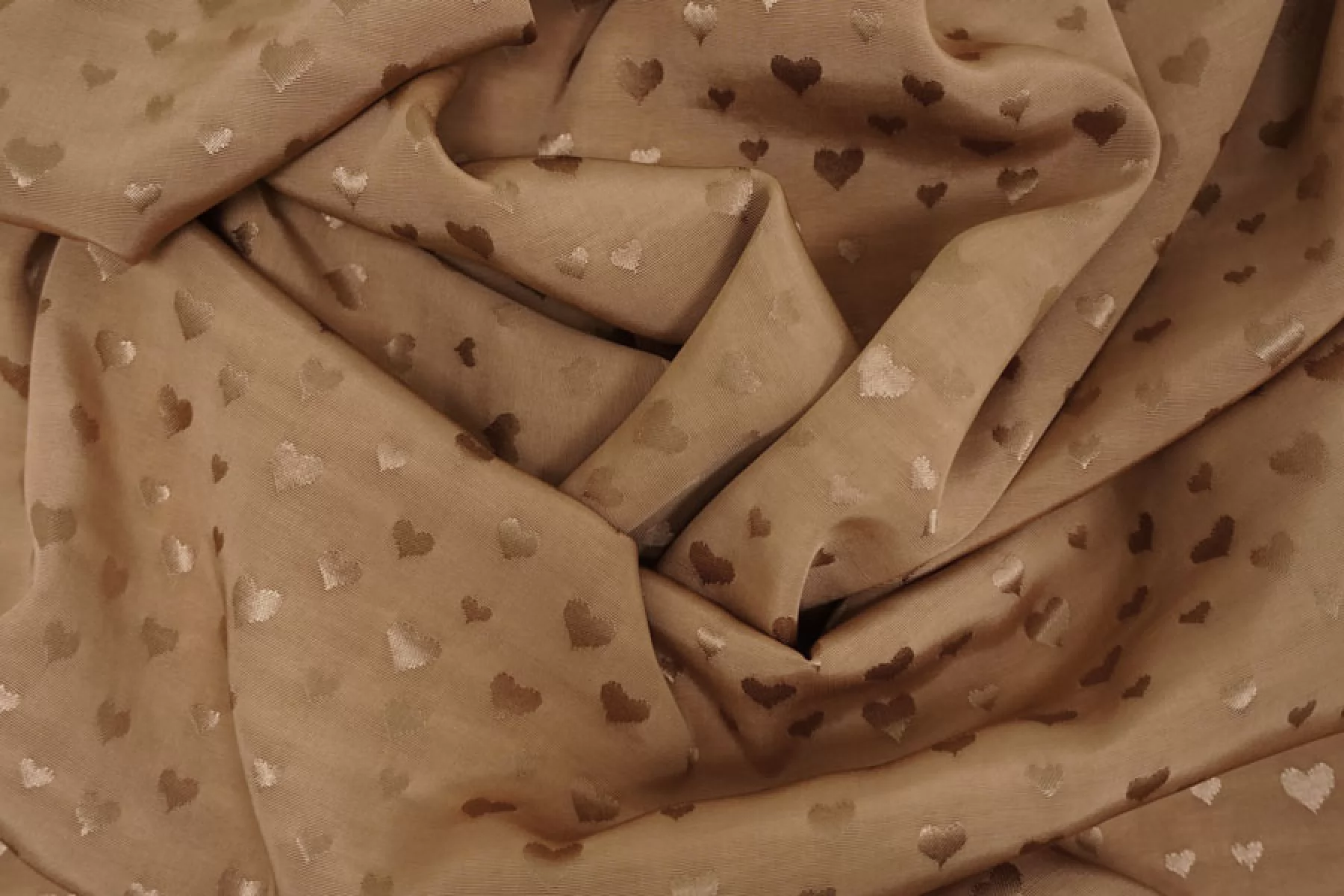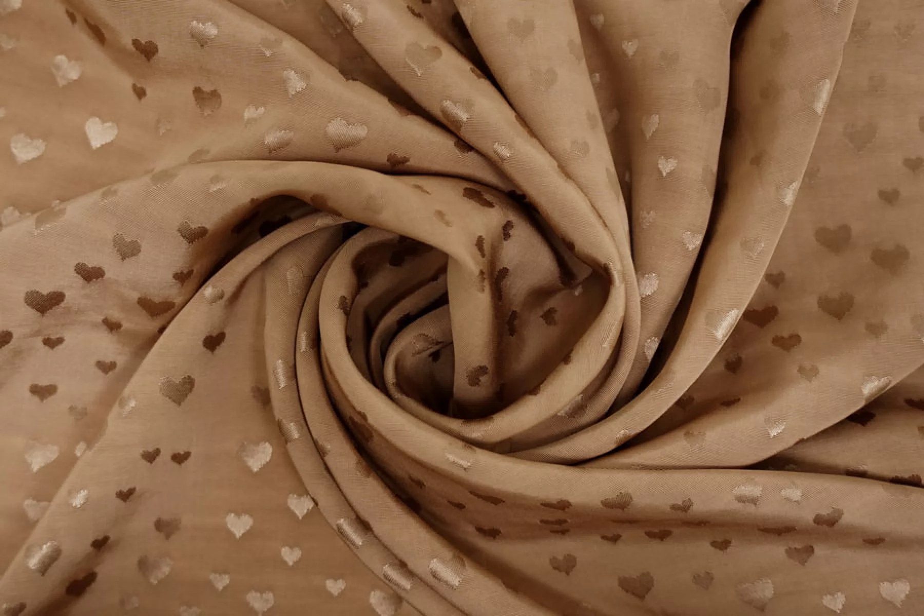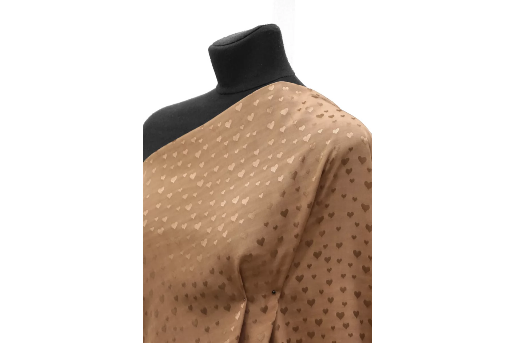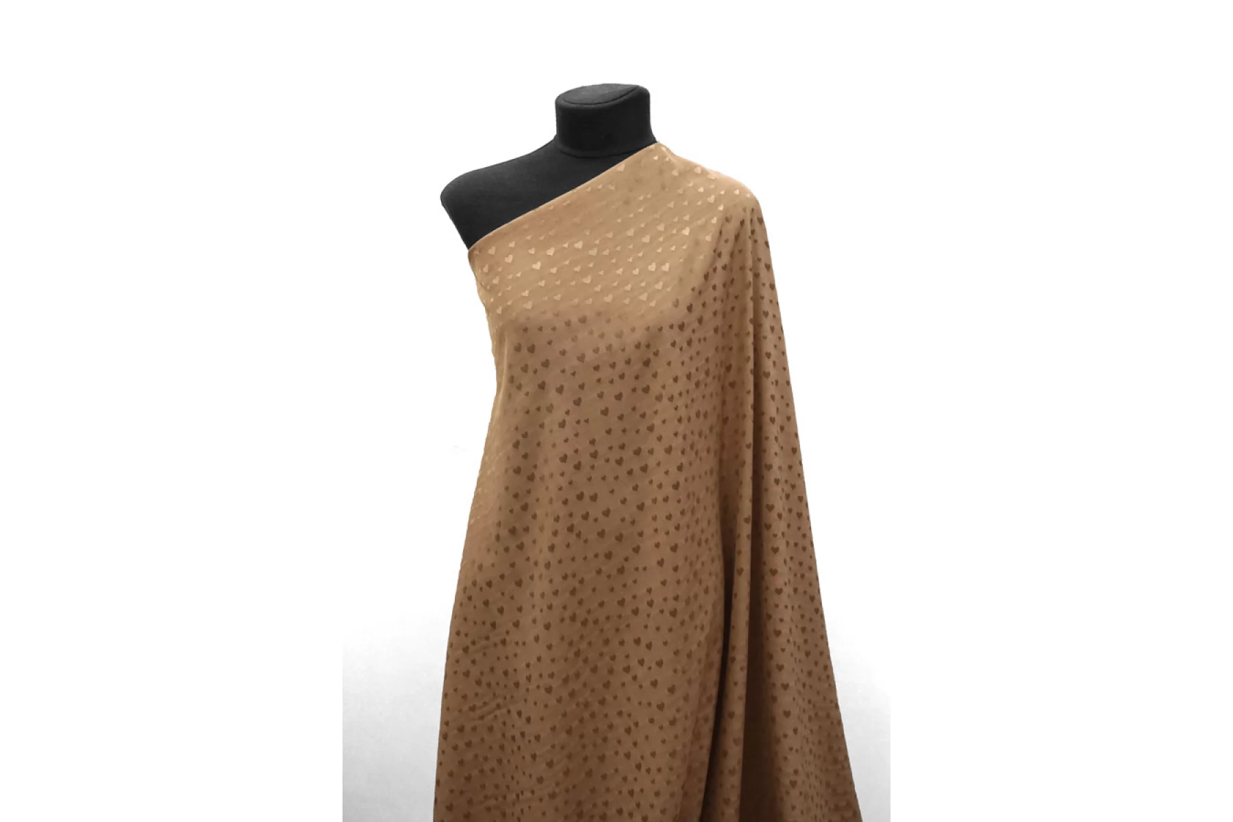 Красивая плательная вискоза крепового плетения, с жаккардовой выработкой в виде сердечек (нить с лоском). Цвет тёплый, коричневато-бежевый. Присутствует лёгкая муарность. На ощупь слегка шероховатая, холодящая. Пластичная. Минимально просвечивает силуэт. Не тянется. Немного мнется. Красива в движении. Форму слегка держит. Прекрасно подойдет на платья, блузки, юбки и костюмы в пижамном стиле. При необходимости используйте подкладочный материал. Обязательно учитывайте усадку порядка 5-10%