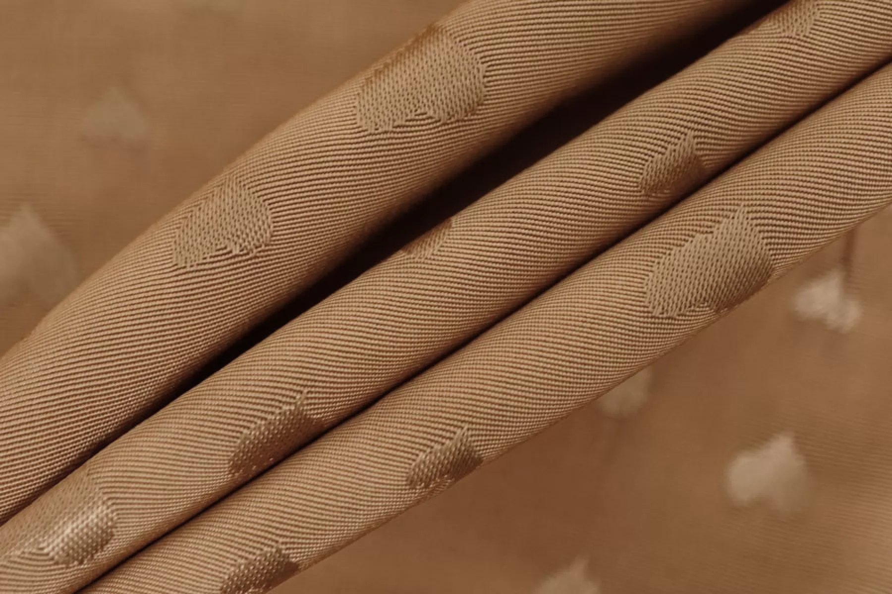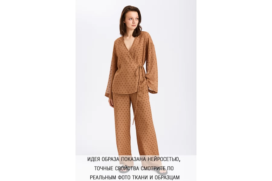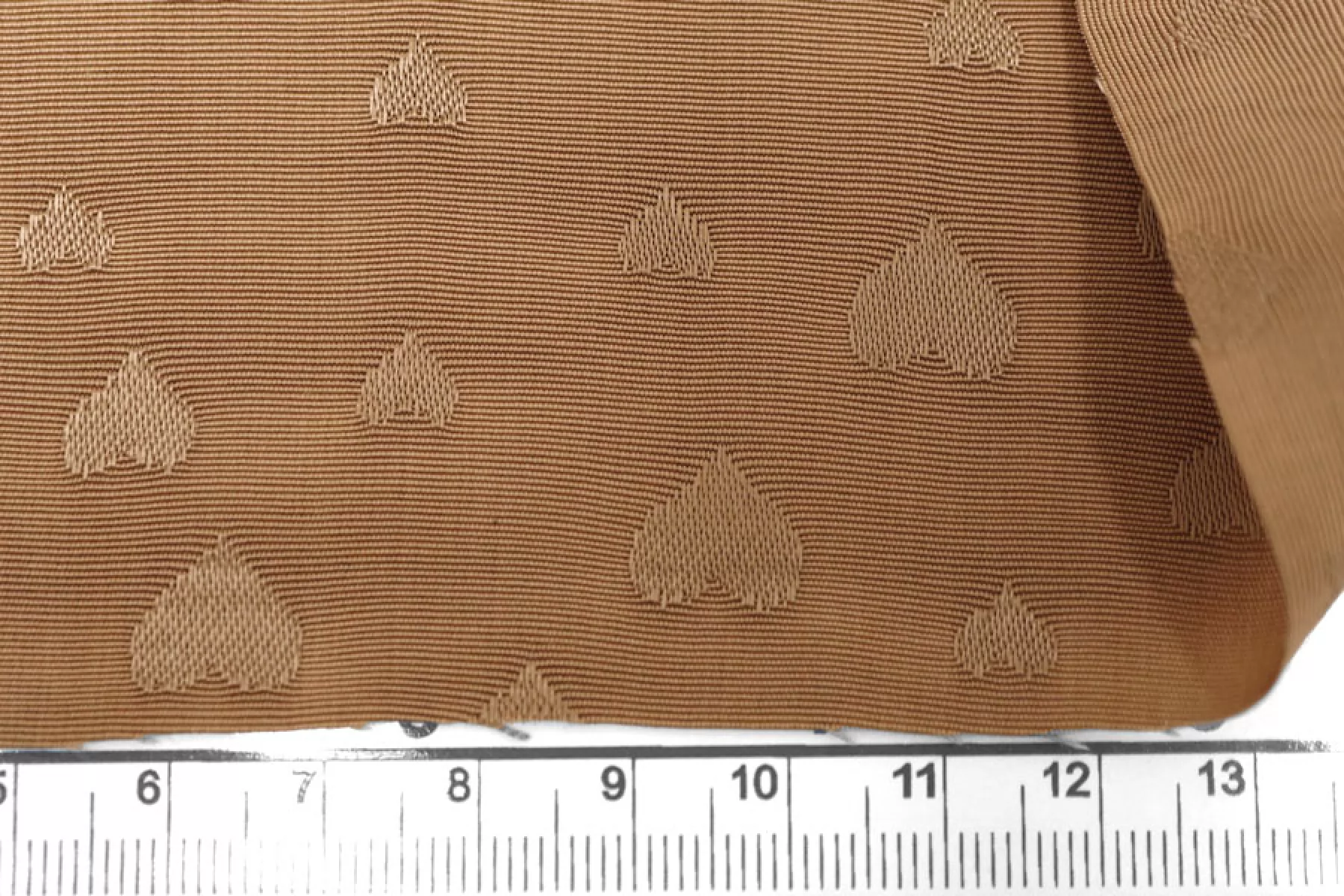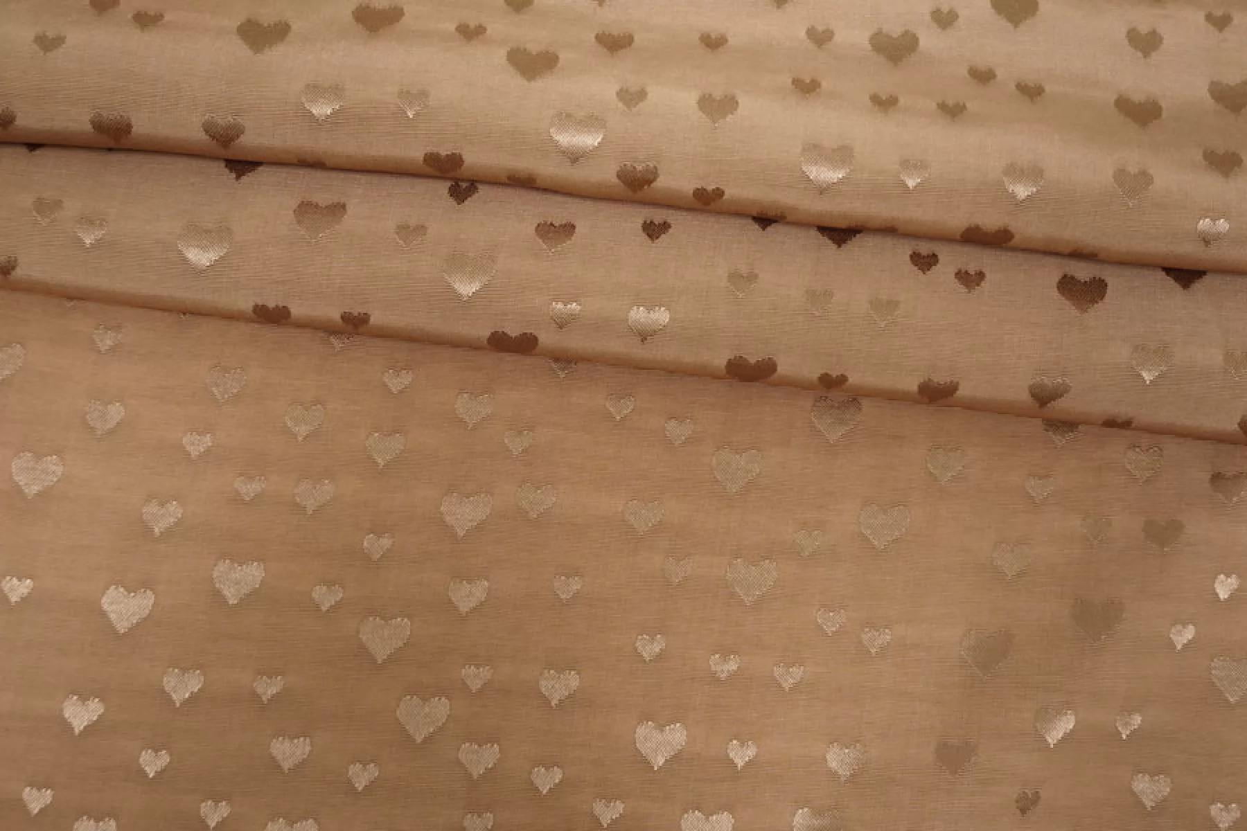 Красивая плательная вискоза крепового плетения, с жаккардовой выработкой в виде сердечек (нить с лоском). Цвет тёплый, коричневато-бежевый. Присутствует лёгкая муарность. На ощупь слегка шероховатая, холодящая. Пластичная. Минимально просвечивает силуэт. Не тянется. Немного мнется. Красива в движении. Форму слегка держит. Прекрасно подойдет на платья, блузки, юбки и костюмы в пижамном стиле. При необходимости используйте подкладочный материал. Обязательно учитывайте усадку порядка 5-10%