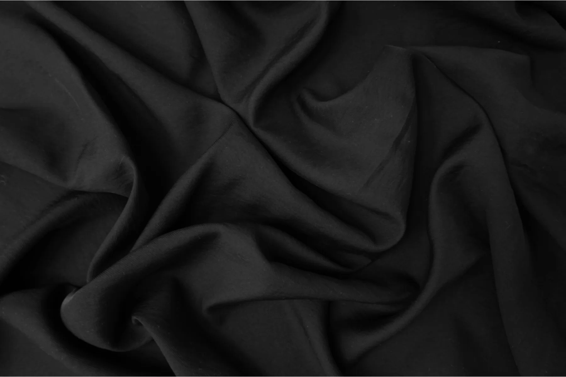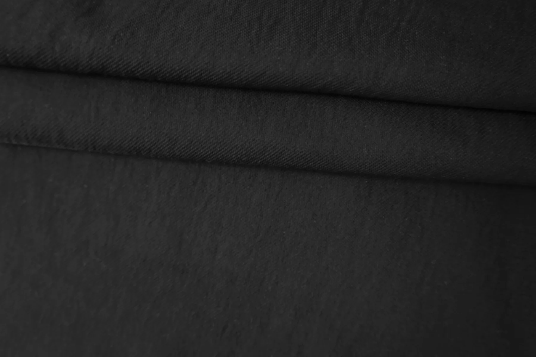 Плательно-блузочная вискоза на капроне диагонально плетения черного цвета. Тонкая, но плотная. Тактильно ткань приятная, слегка шероховатая. Немного виден силуэт на просвет. Хорошо держит форму в округлой складке. Не тянется. Вариант на платья, блузки, рубашки, свободные брюки. При необходимости используйте подкладочный материал. Обязательно учитывайте усадку материала на 5-10%.