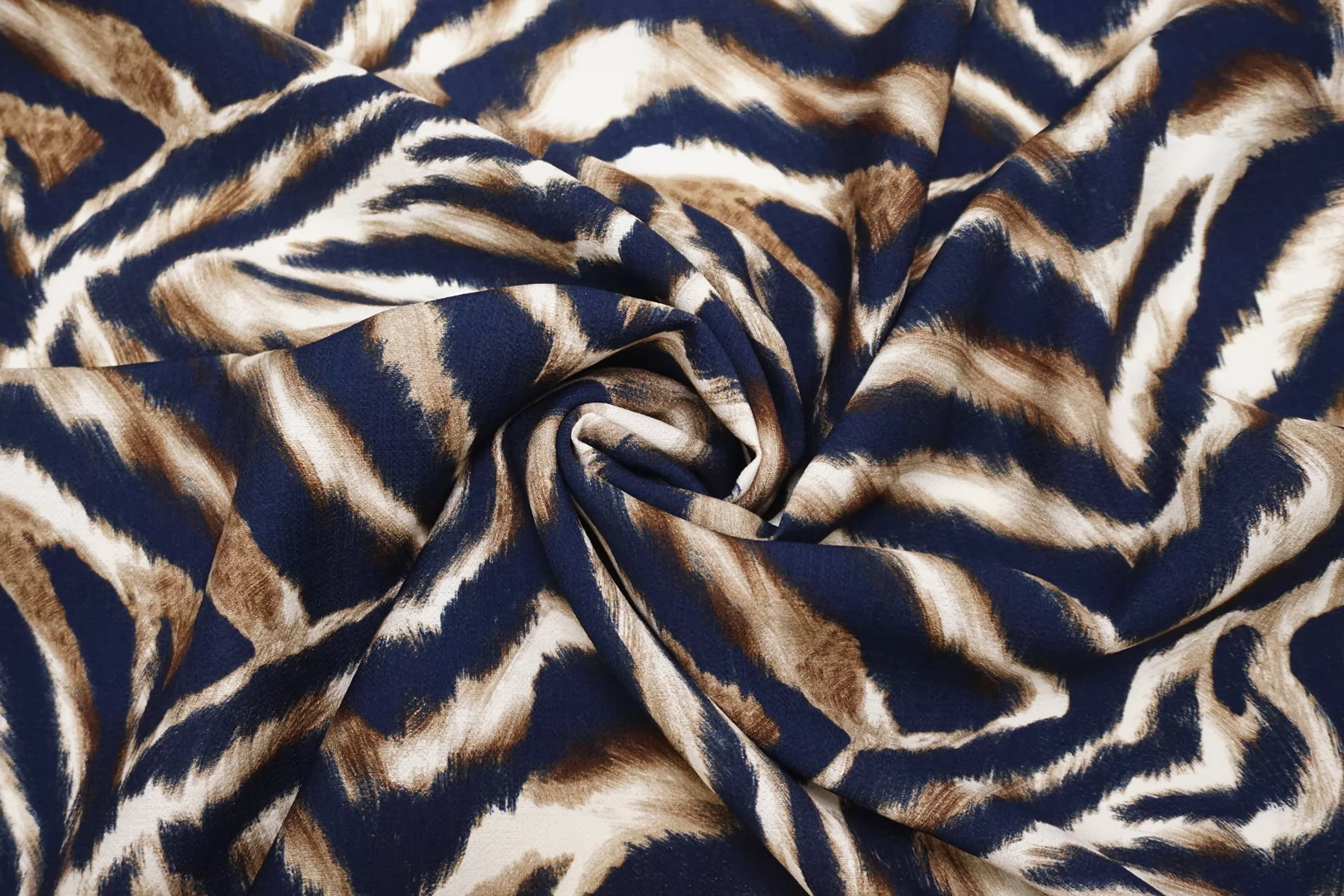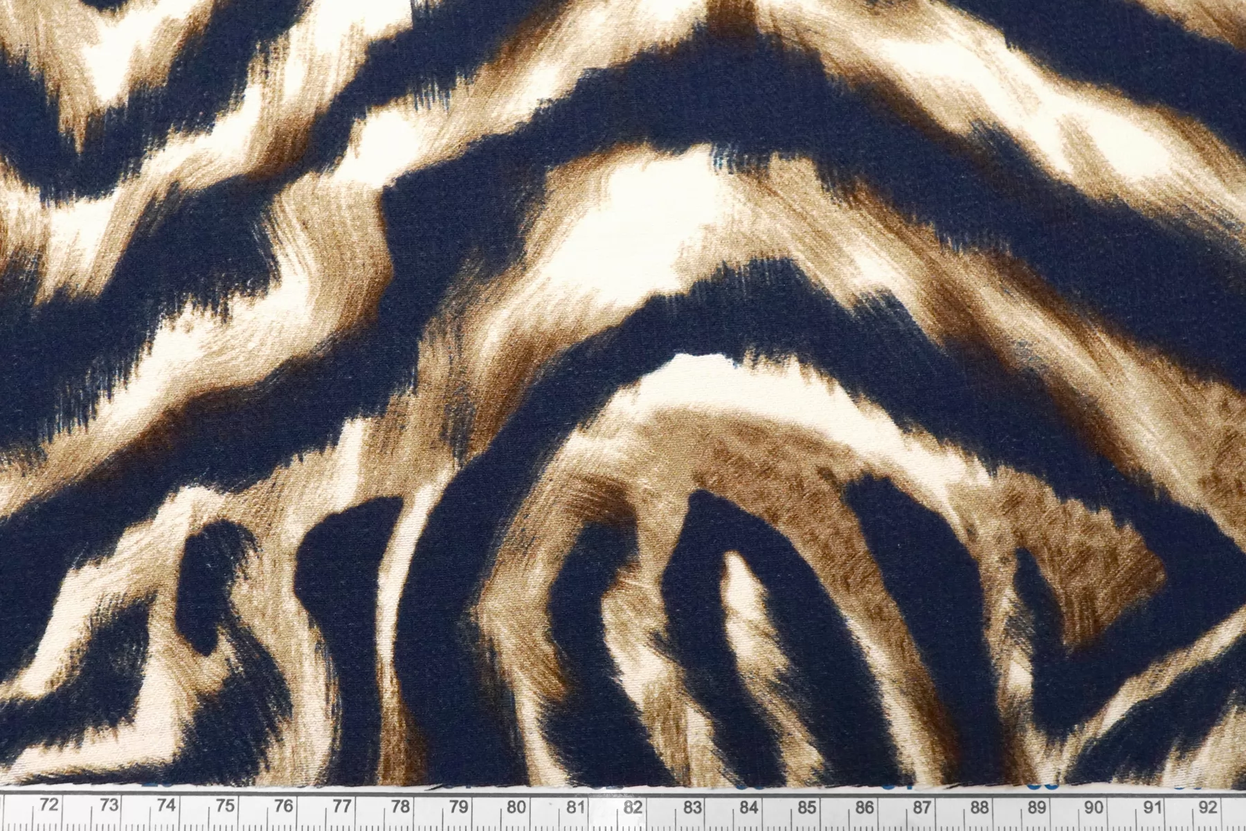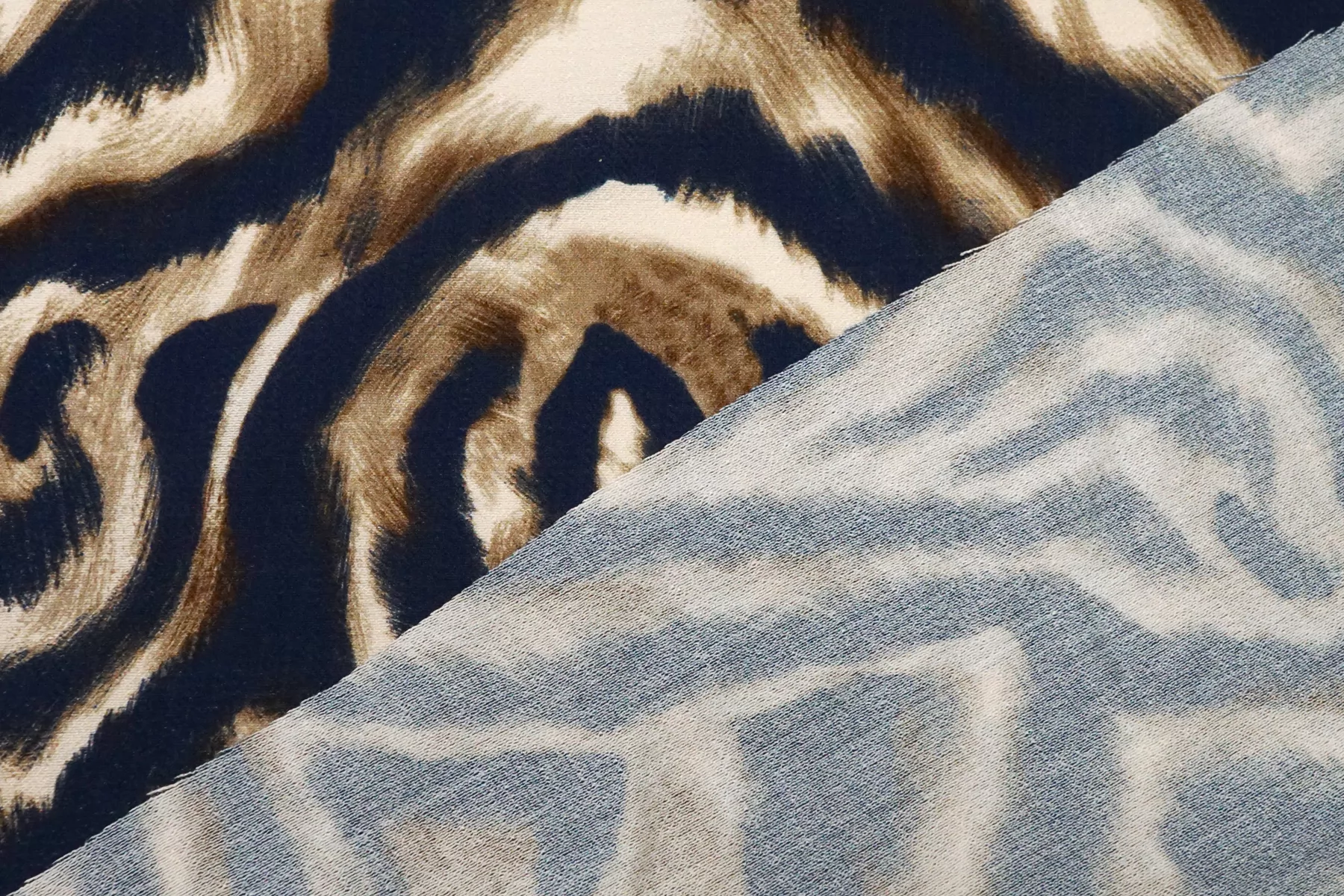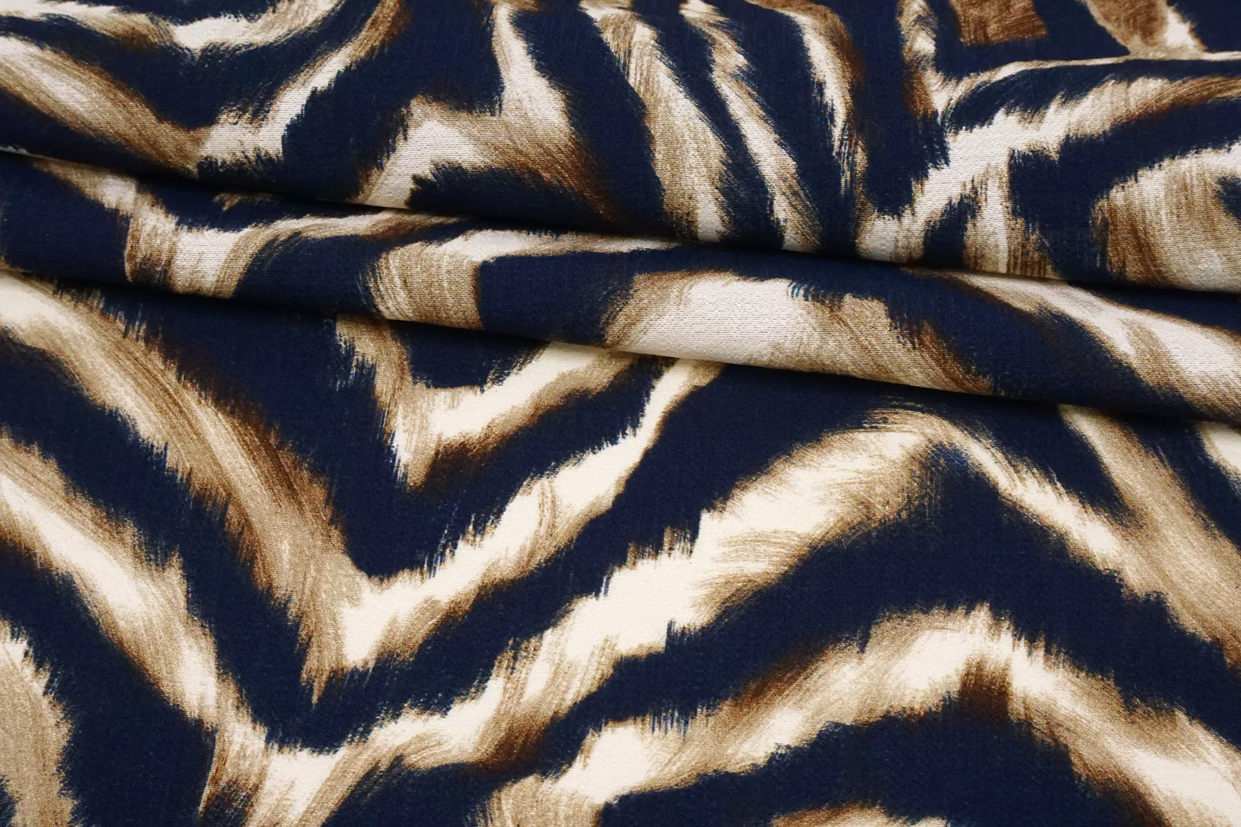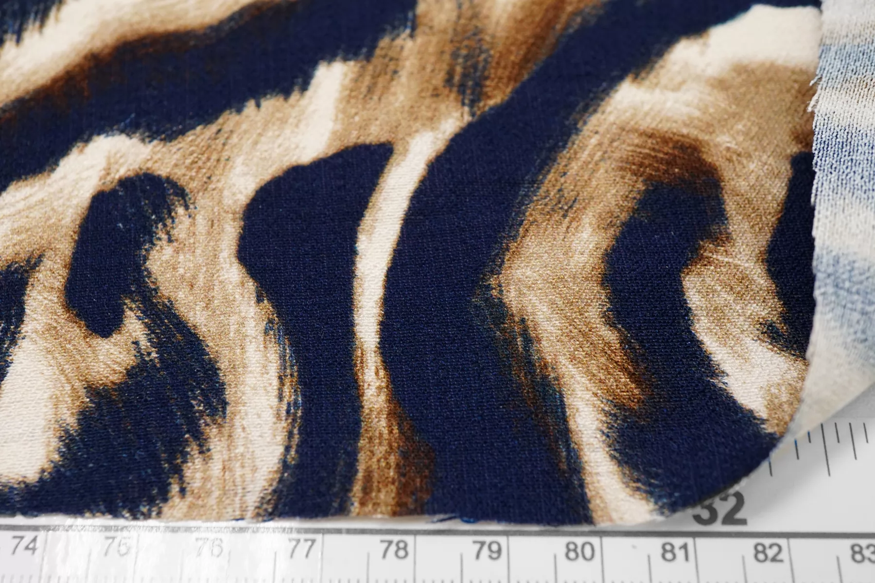 Итальянская плательная вискоза на капроне, принт стилизован под мех, использован тёмно-синий, белый, и бежево-коричневый цвет. Не тянется, пластичная. Немного просвечивает. Подойдет на платье, рубашку, юбку, можно на свободные брюки.