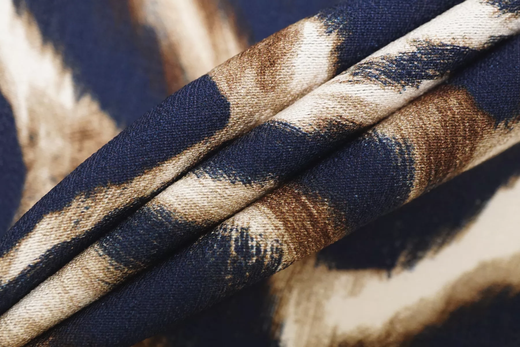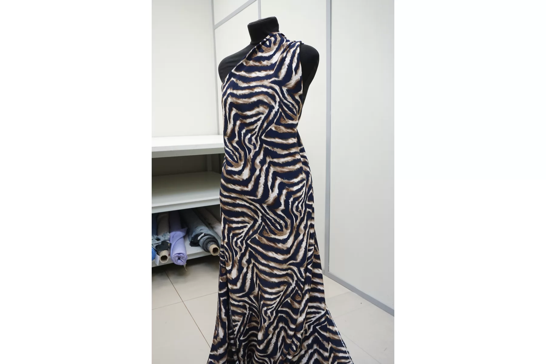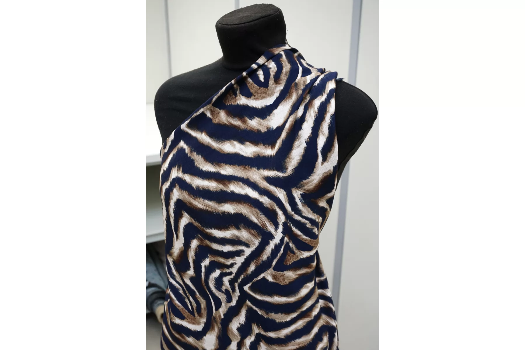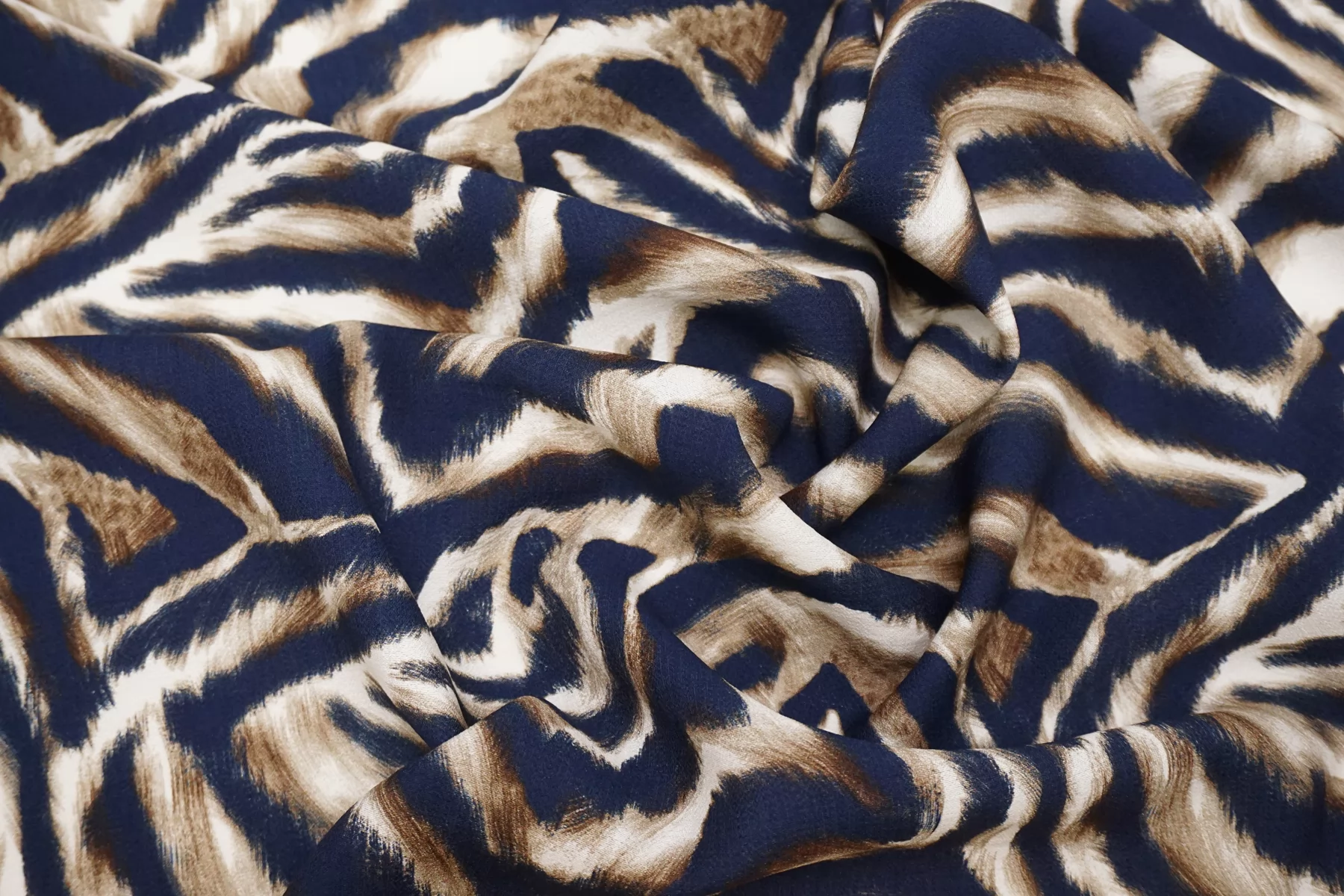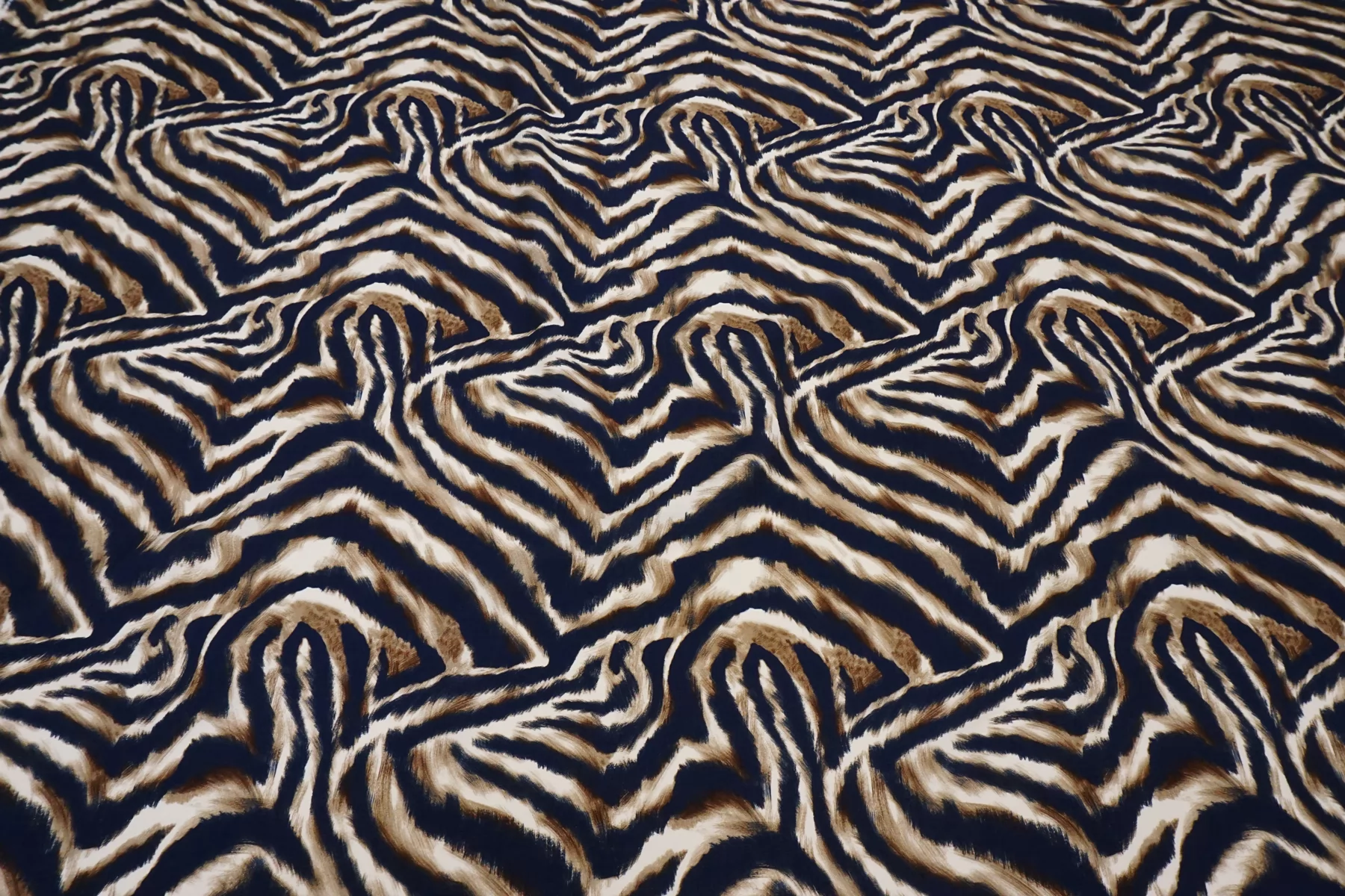 Итальянская плательная вискоза на капроне, принт стилизован под мех, использован тёмно-синий, белый, и бежево-коричневый цвет. Не тянется, пластичная. Немного просвечивает. Подойдет на платье, рубашку, юбку, можно на свободные брюки.