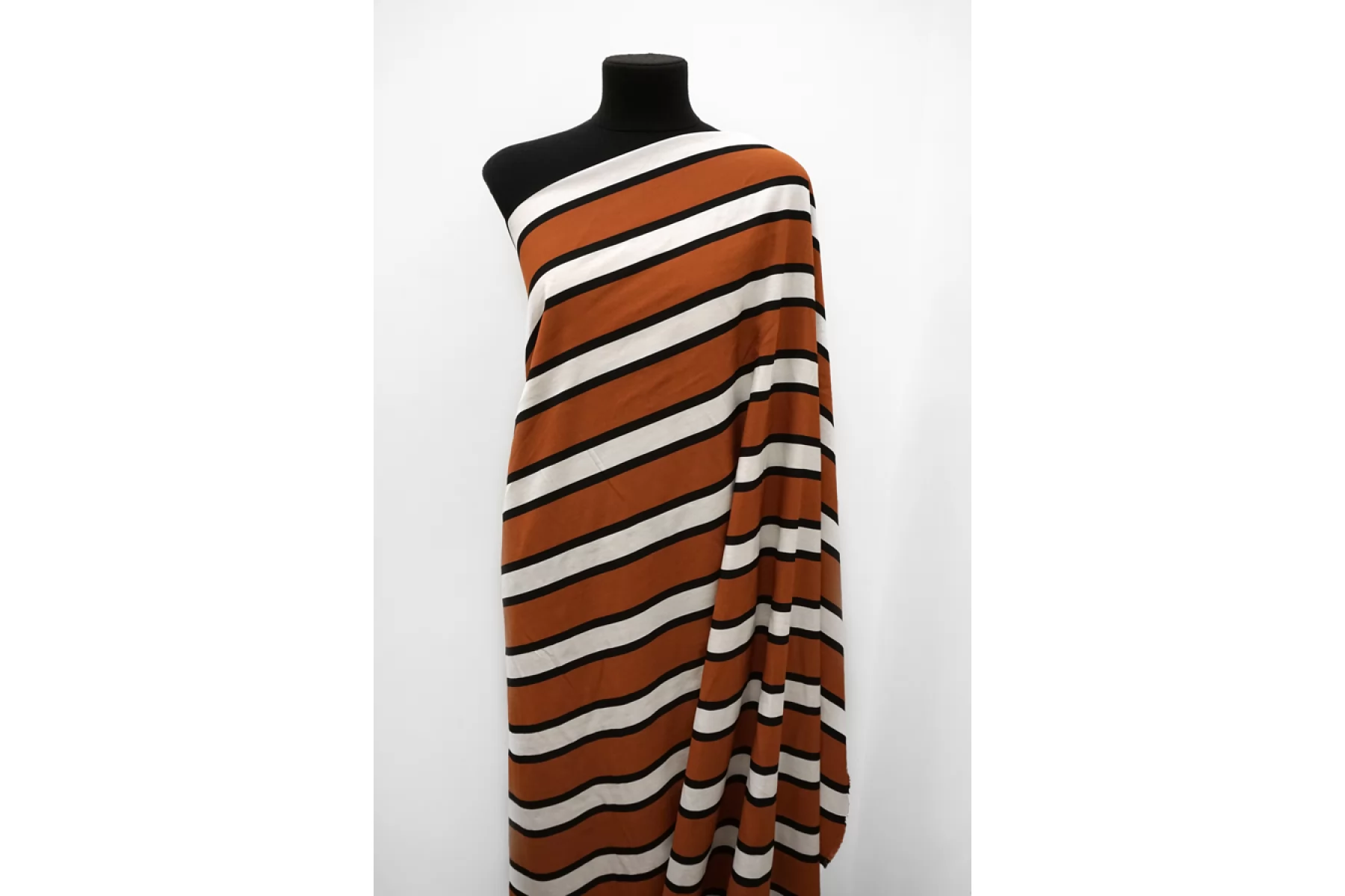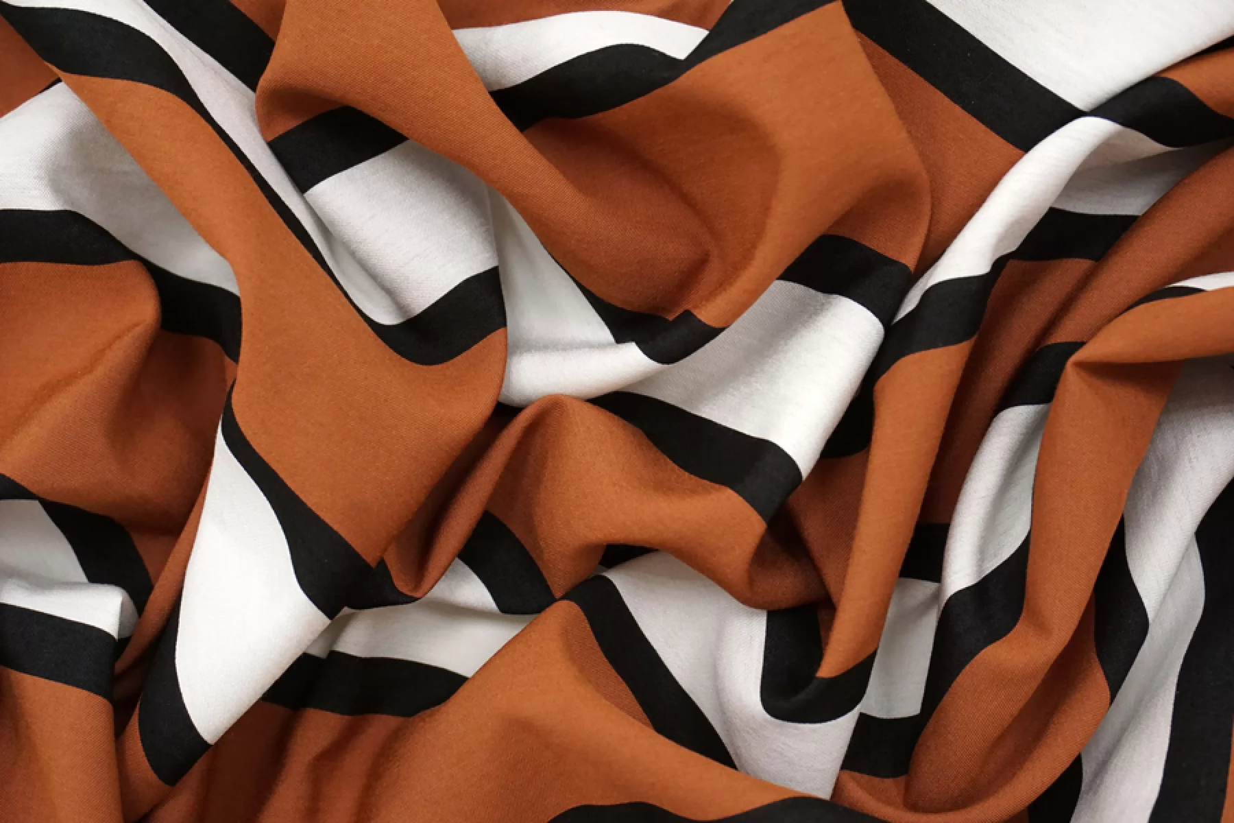 Итальянская плательная вискоза на капроне в полоску белого, черного и красновато-коричневого цвета. Не тянется, не просвечивает, пластичная. Подойдет на платье, рубашку, комбинезон, юбку, можно на свободные брюки.