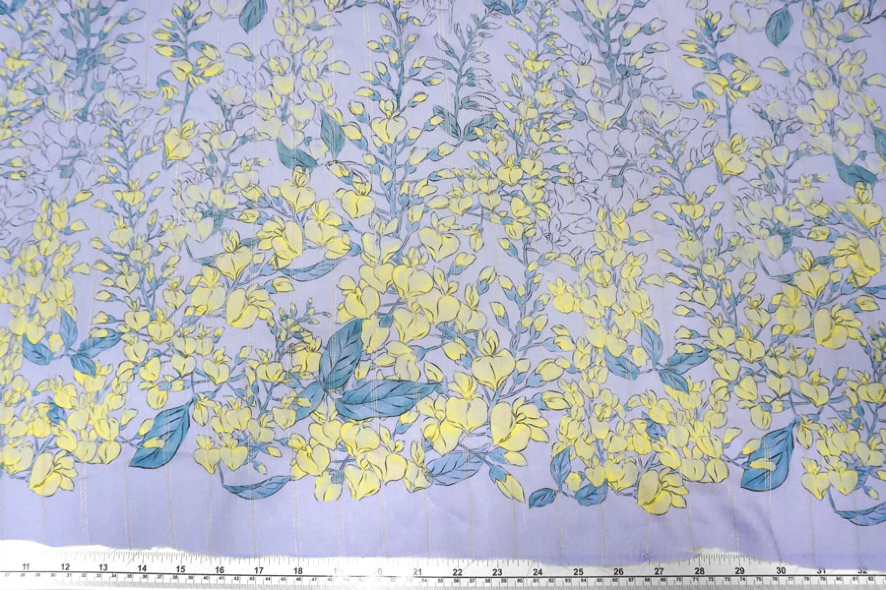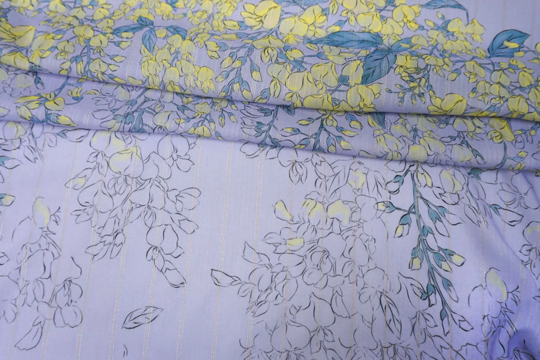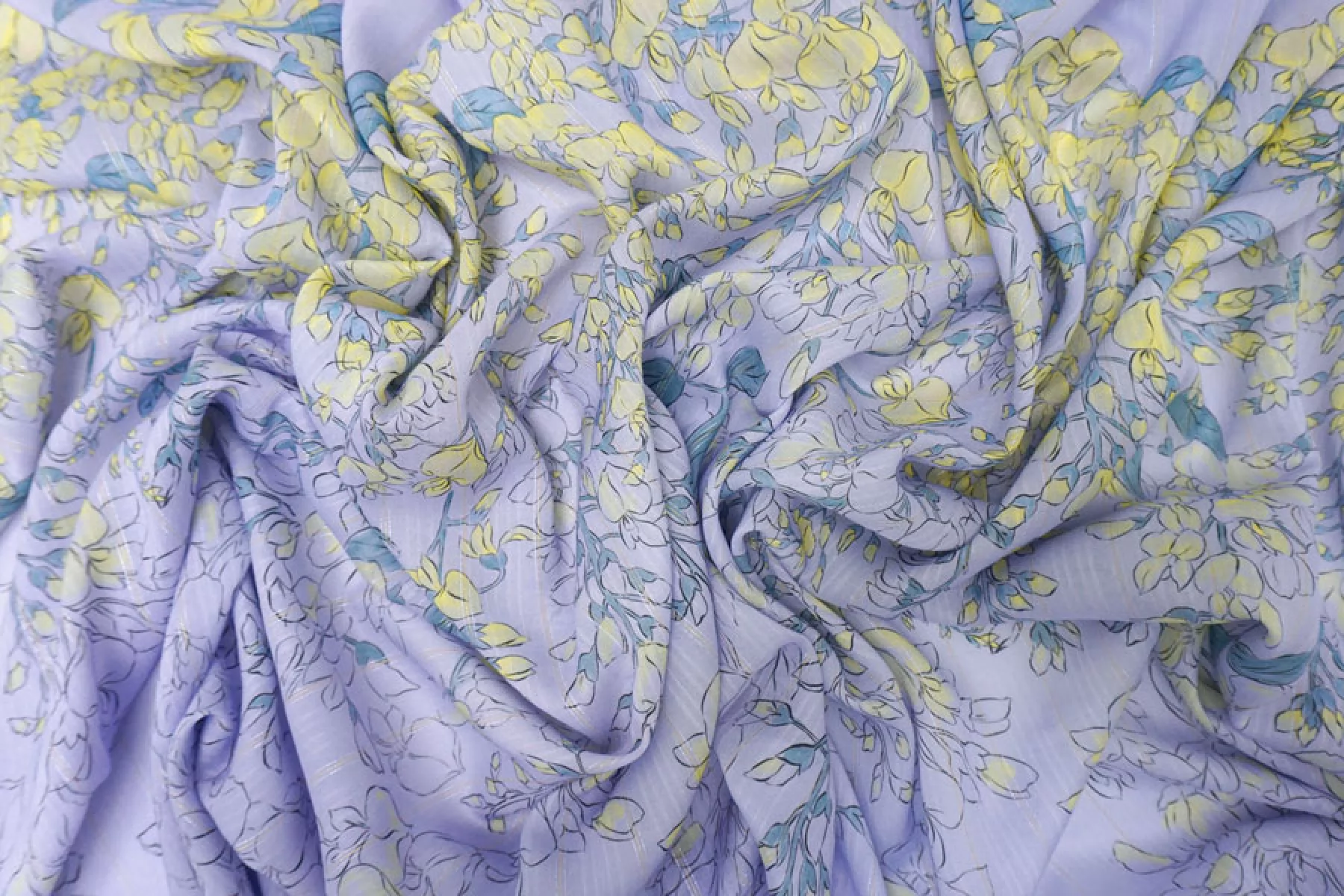 Цена указана за метр! Размер купона - 90 см. Цена за купон - 1647 руб. Тонкая вискоза, с красивым цветочным принтом, желтые цветы с бирюзовой листвой на ненасыщенном сиреневом фоне, плюс полосами вплетен серебристый и золотистый люрекс. Пластичная, легкая, тонкая, форму не держит. Тактильно слегка шероховатая, но без колкости и грубости, наоборот приятный холодящий эффект. Не тянется, полупрозрачная. Немного мнется. Отлично подойдет на легкие летние платья, топы, юбки, блузки. При необходимости используйте подкладочный материал. Обязательно учитываем усадку порядка 5-10%. При пошиве используйте тонкие иглы и булавки.