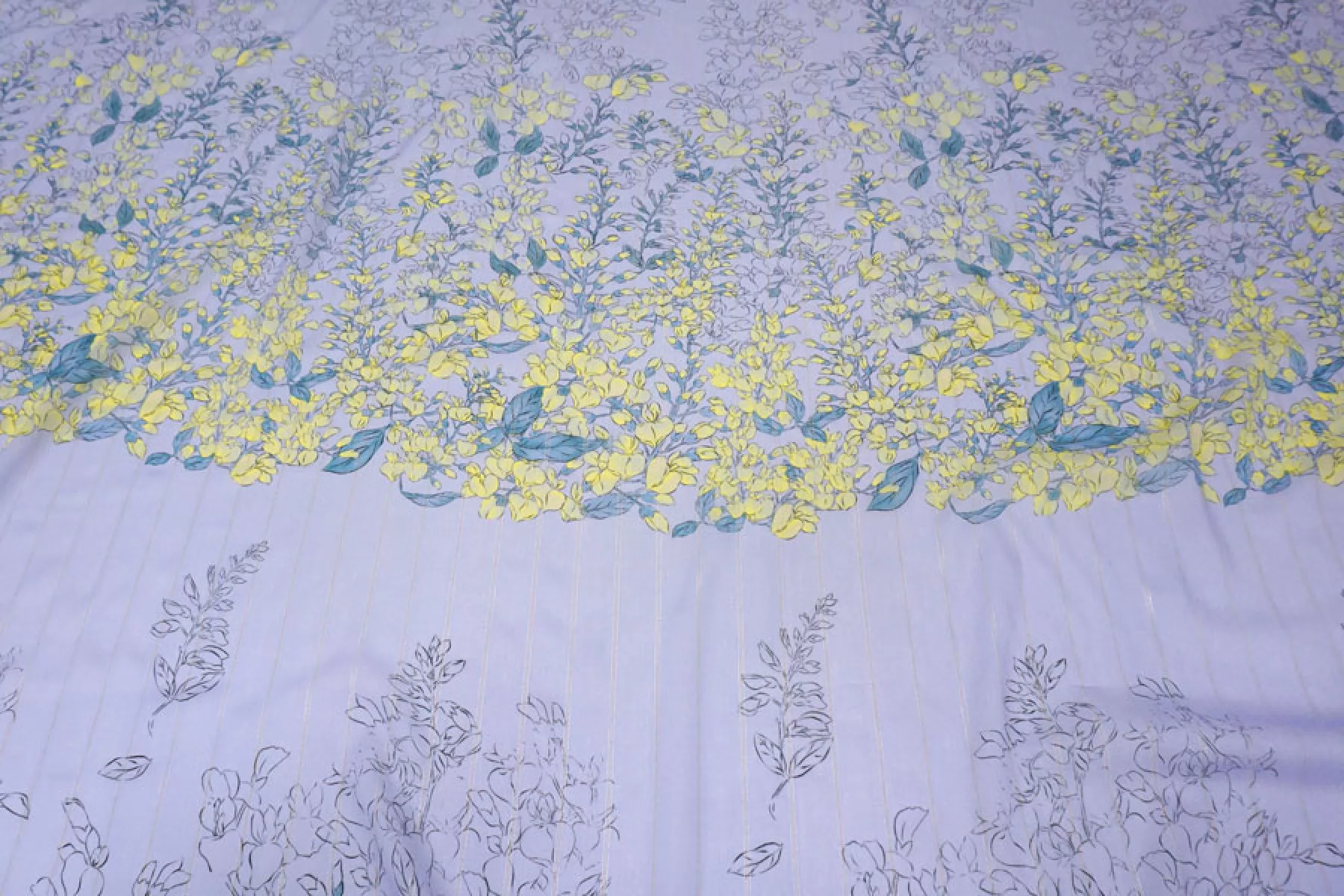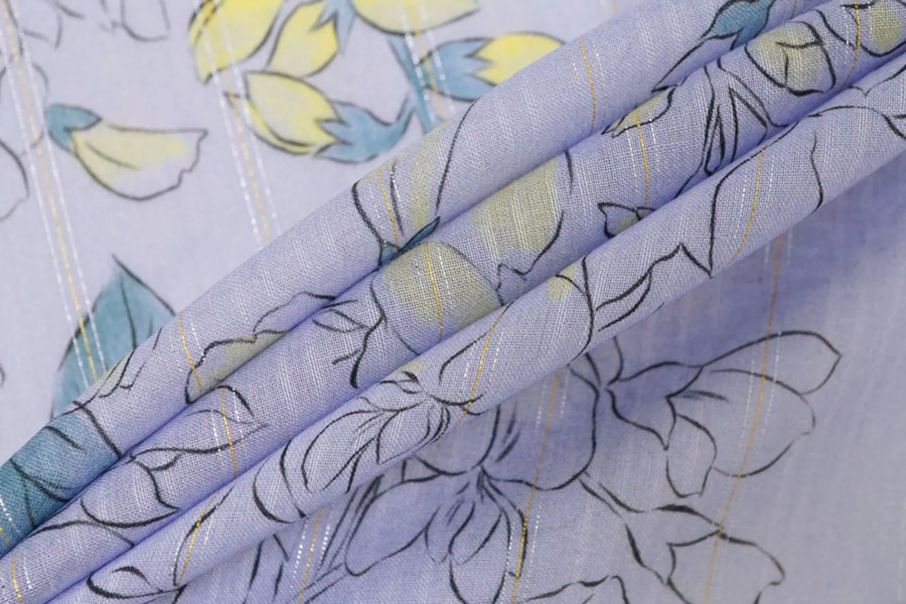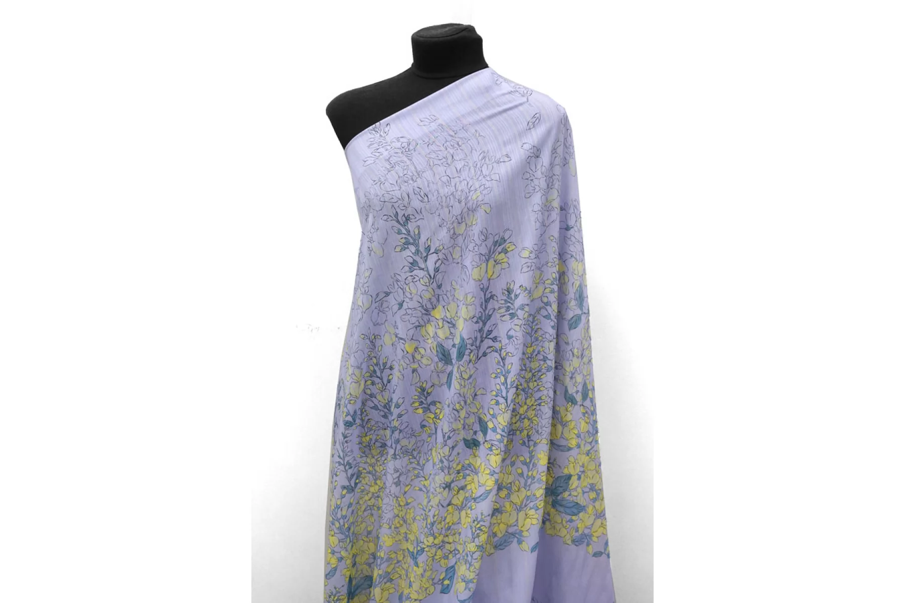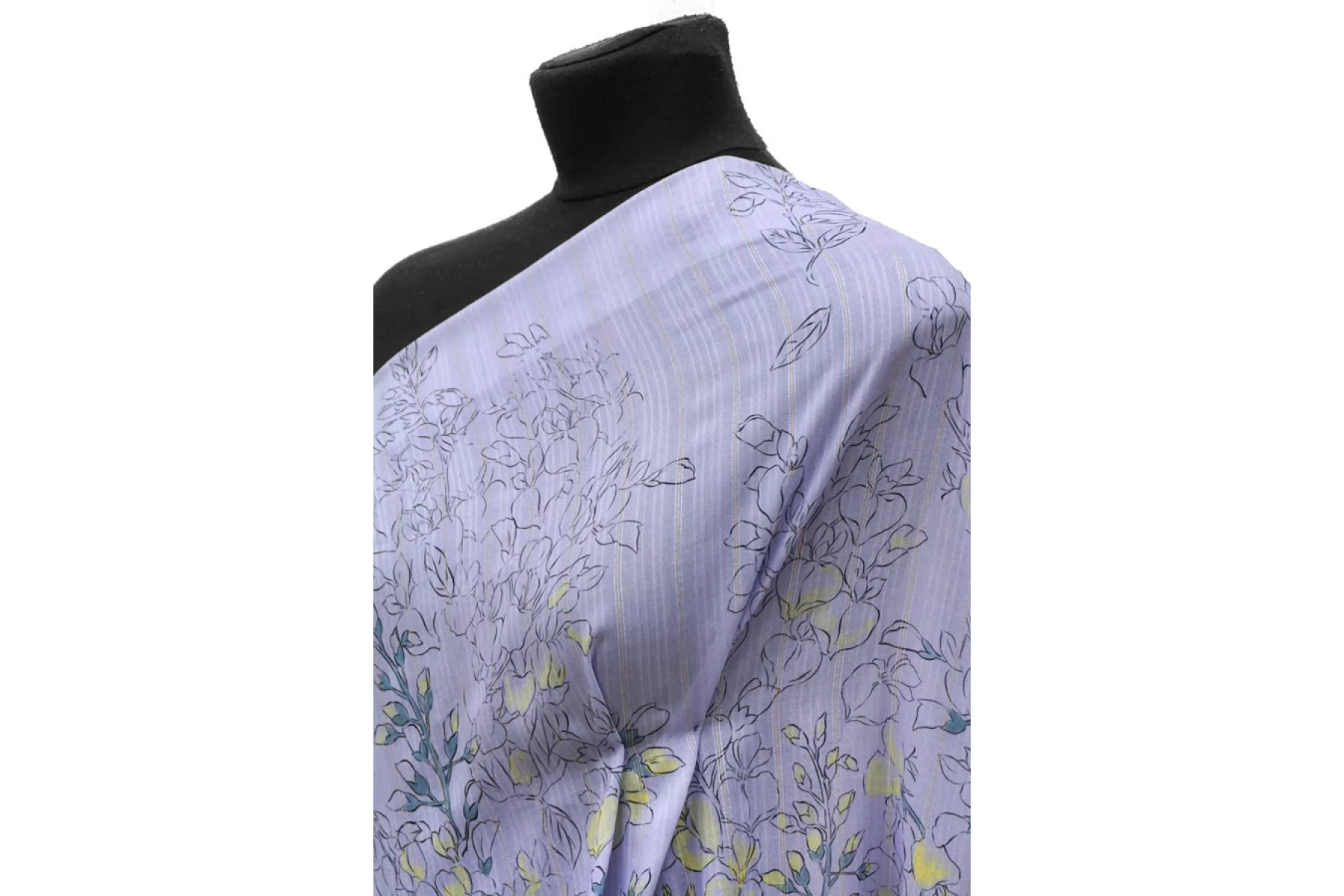 Цена указана за метр! Размер купона - 90 см. Цена за купон - 1647 руб. Тонкая вискоза, с красивым цветочным принтом, желтые цветы с бирюзовой листвой на ненасыщенном сиреневом фоне, плюс полосами вплетен серебристый и золотистый люрекс. Пластичная, легкая, тонкая, форму не держит. Тактильно слегка шероховатая, но без колкости и грубости, наоборот приятный холодящий эффект. Не тянется, полупрозрачная. Немного мнется. Отлично подойдет на легкие летние платья, топы, юбки, блузки. При необходимости используйте подкладочный материал. Обязательно учитываем усадку порядка 5-10%. При пошиве используйте тонкие иглы и булавки.