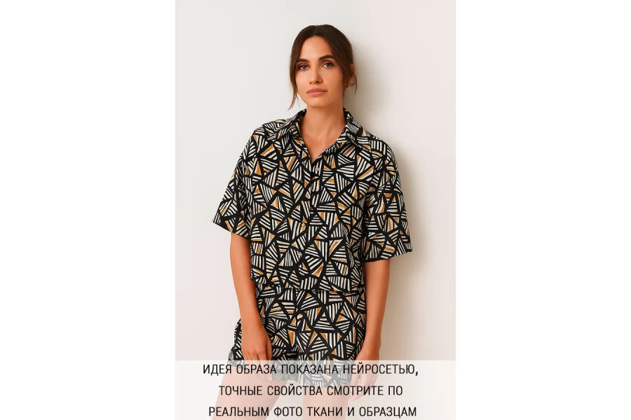Плательно-блузочная вискоза, штапель, черного цвета с интересным принтом в абстрактном геометрическом стиле элементов молочного и желтого, акцентного, оттенков . Тактильно вискоза приятная, мягкая и тонкая, плотная по плетению. Не тянется. Слегка просвечивает силуэт, если смотреть на просвет. Хорошо драпируется и немного держит форму. Красива в складке и своей пластике. Отличный вариант на платья, блузки, юбки и не только. При необходимости используйте подкладочный материал. Обязательно учитывайте усадку 5-10%