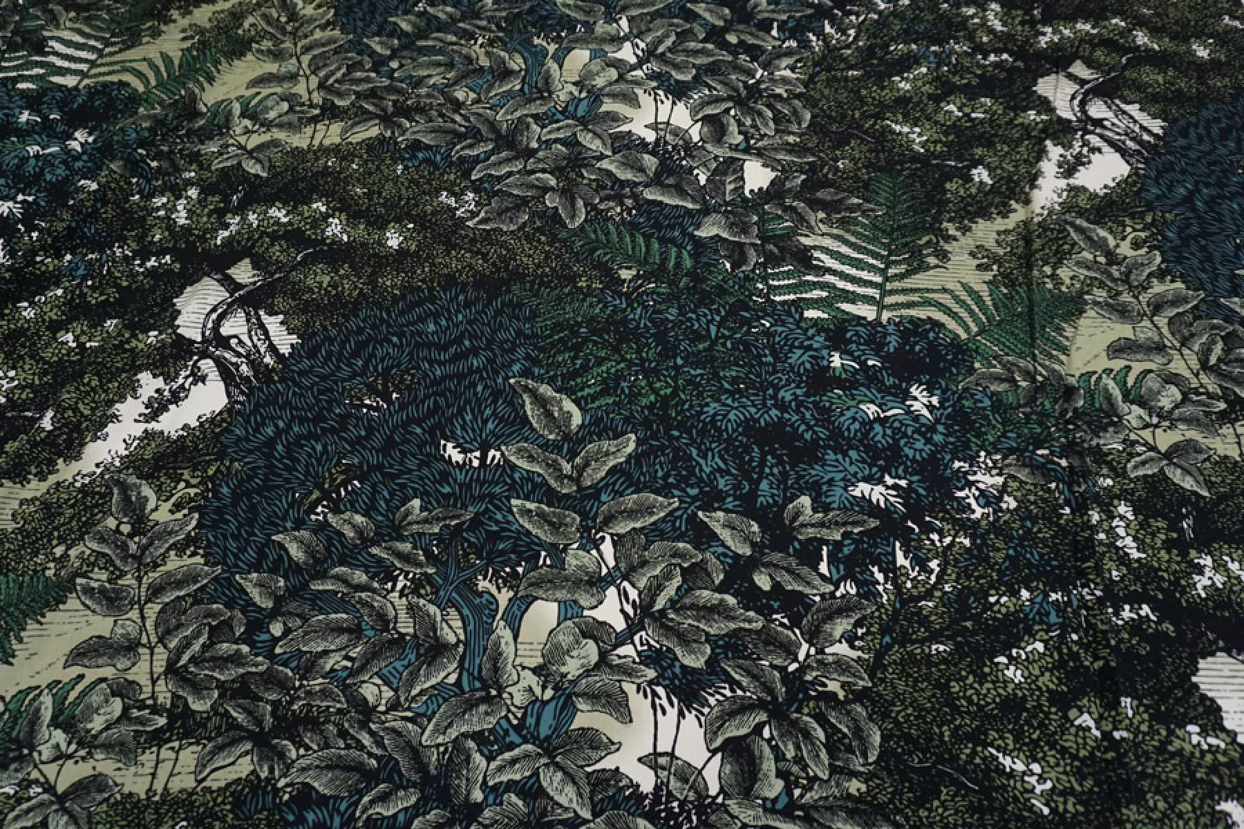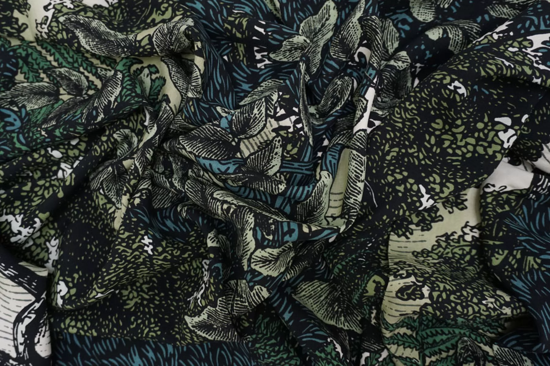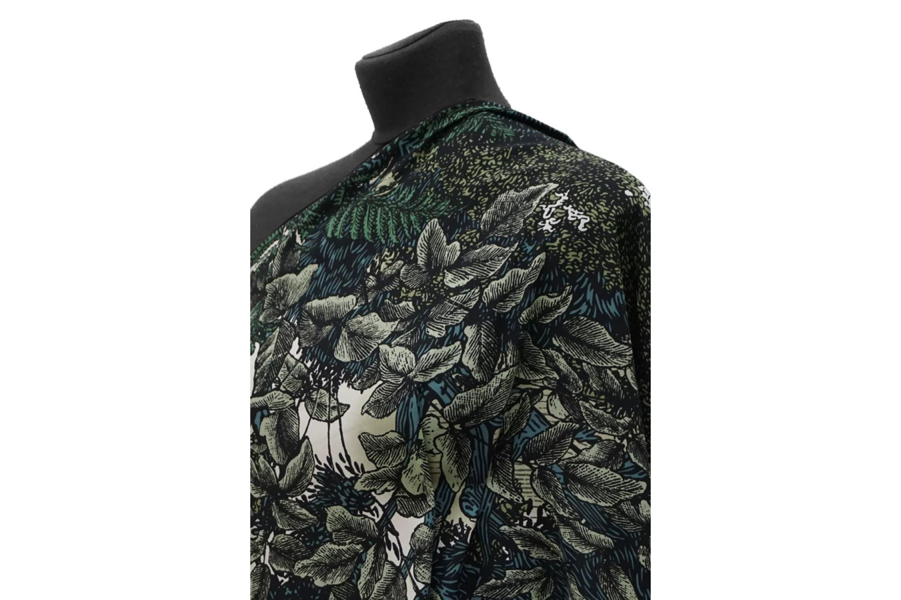 Плательная вискоза с принтом в виде густой растительности, цвета принта: черный, белый и оттенки зеленого. Легкая, тонкая, мягкая, пластичная. Не держит форму, мнется, немного просвечивает в один слой. Прекрасный вариант для летней одежды: платья, блузки, юбки, топа. Обязательно учитывайте усадку 5-10%.