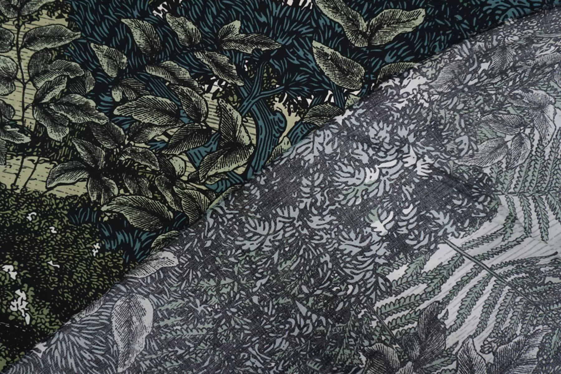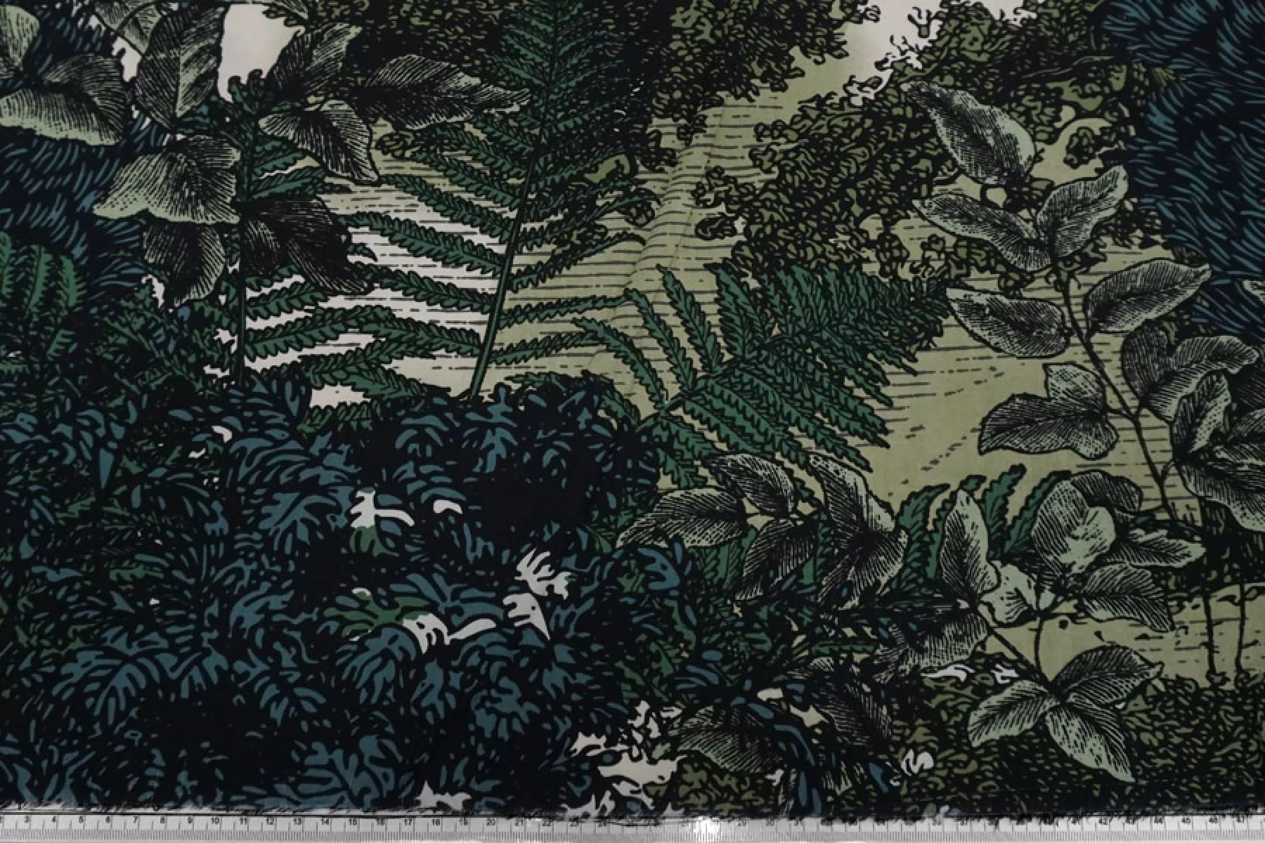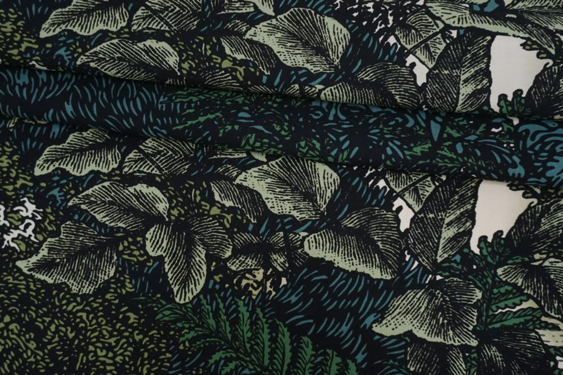 Плательная вискоза с принтом в виде густой растительности, цвета принта: черный, белый и оттенки зеленого. Легкая, тонкая, мягкая, пластичная. Не держит форму, мнется, немного просвечивает в один слой. Прекрасный вариант для летней одежды: платья, блузки, юбки, топа. Обязательно учитывайте усадку 5-10%.