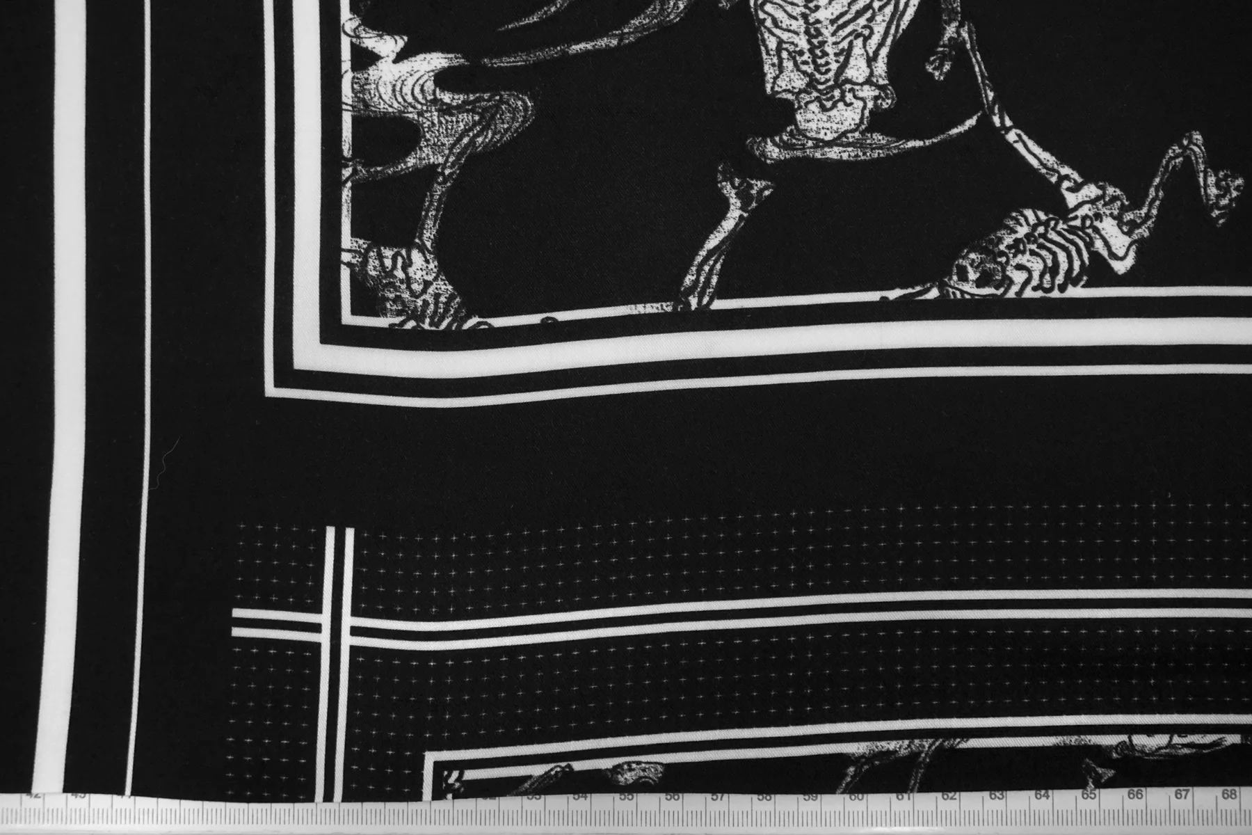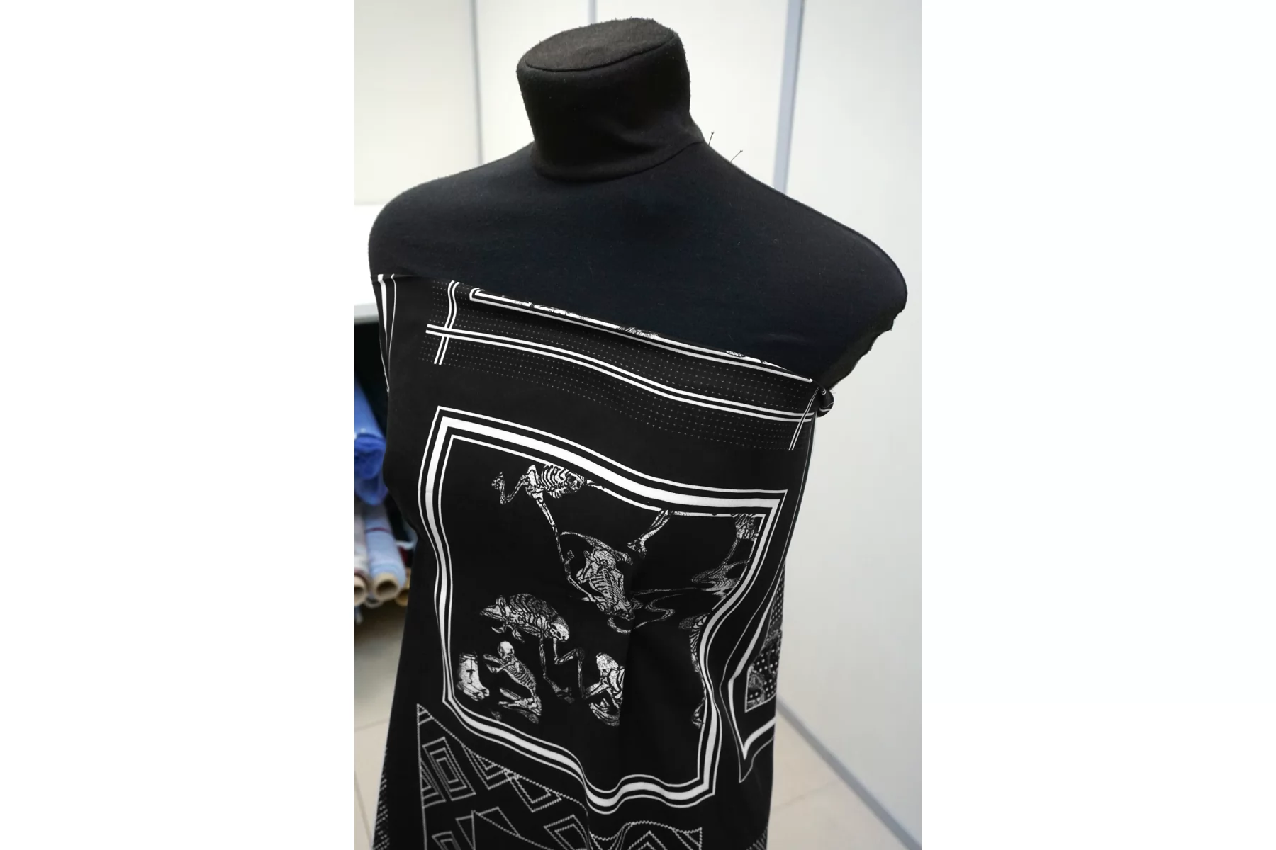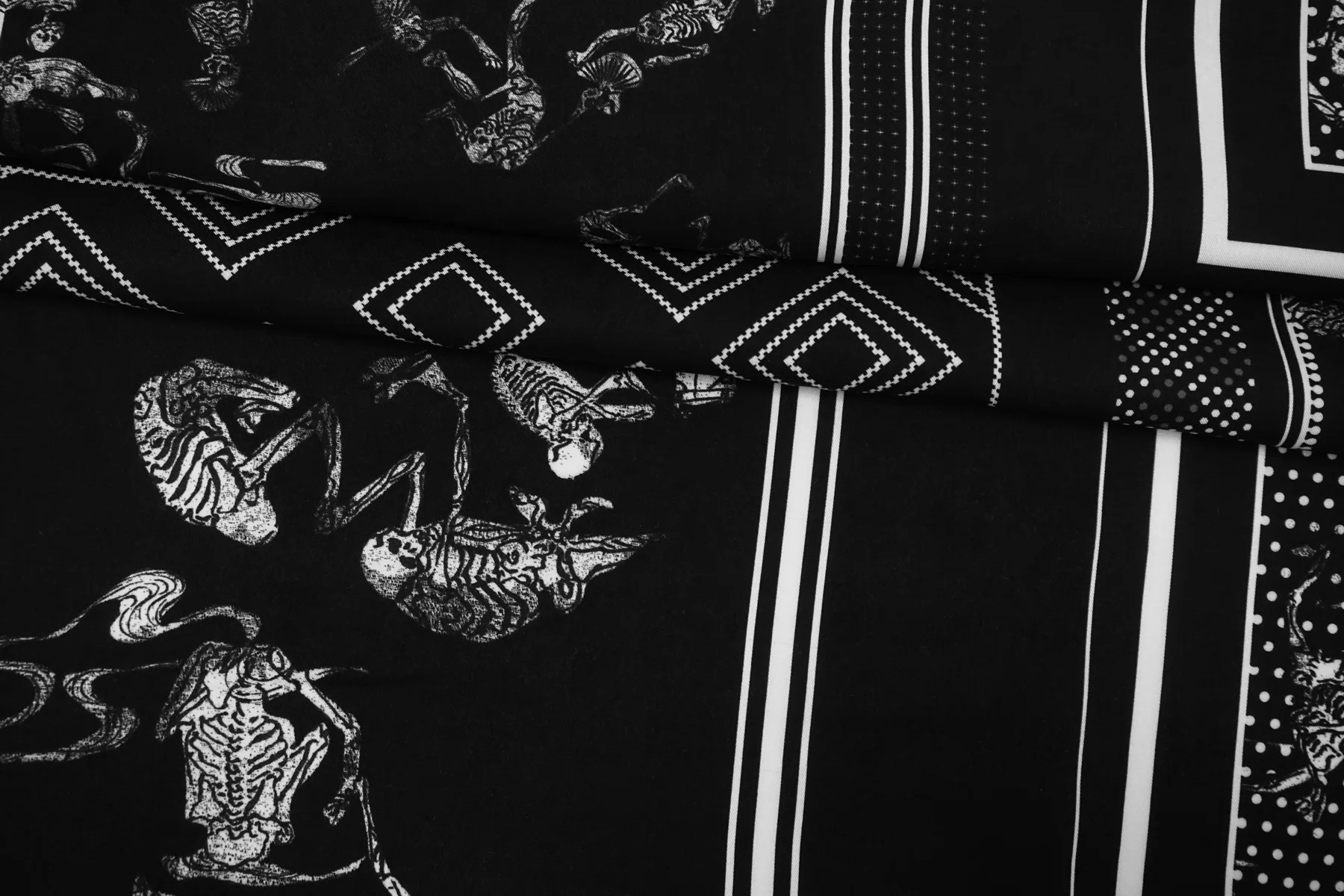 Плательная вискоза плательной плотности с чёрно-белым принтом со скелетами и квадратами. У принта есть раппорт 86 см.. Материал очень мягкий и приятный. Не тянется. Сминается. Тонкий, пластичный, не просвечивает. Подойдет для пошива платья, топа, юбки, струящихся брюк на резинке. При работе с этой тканью советуем использовать тонкие иглы.