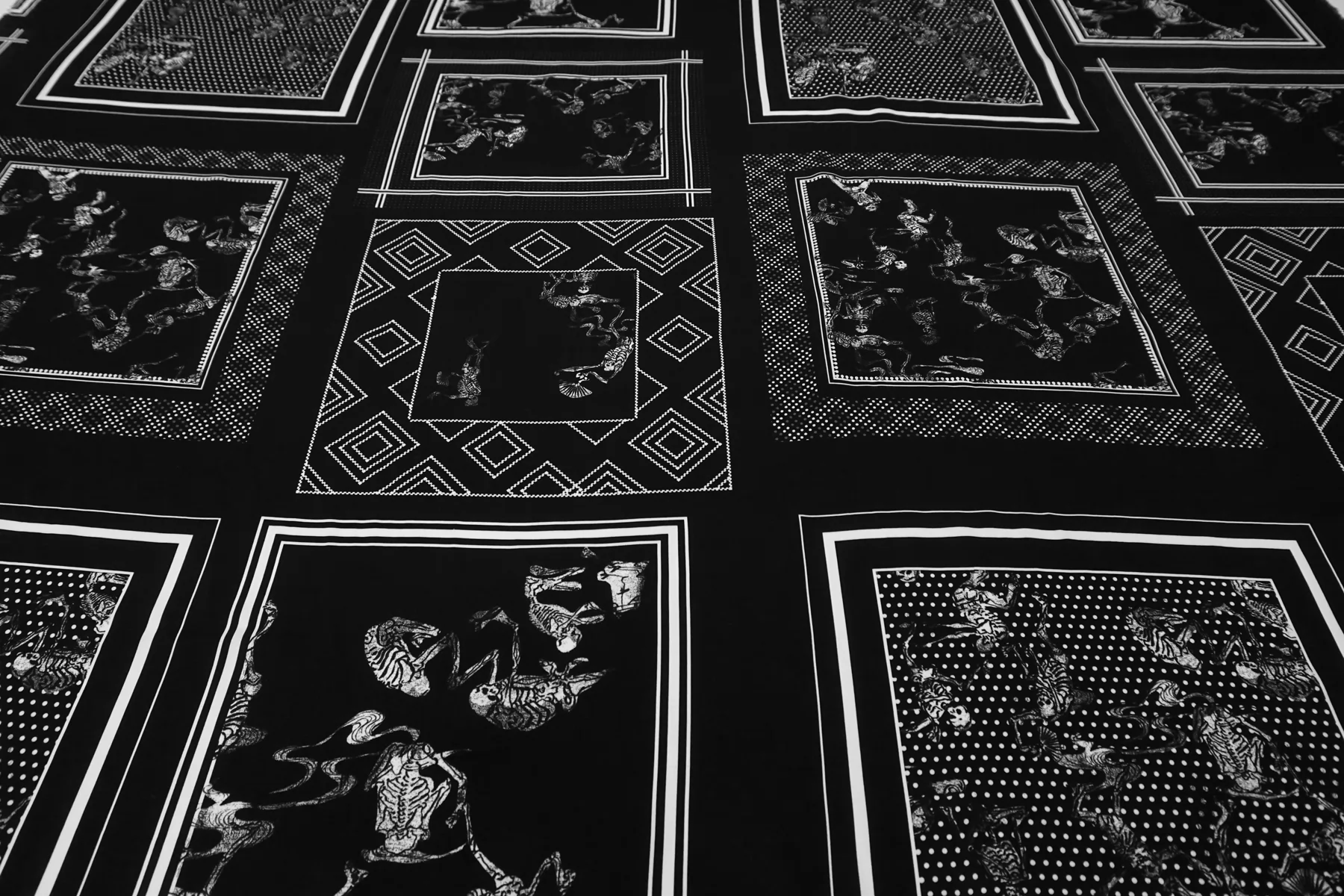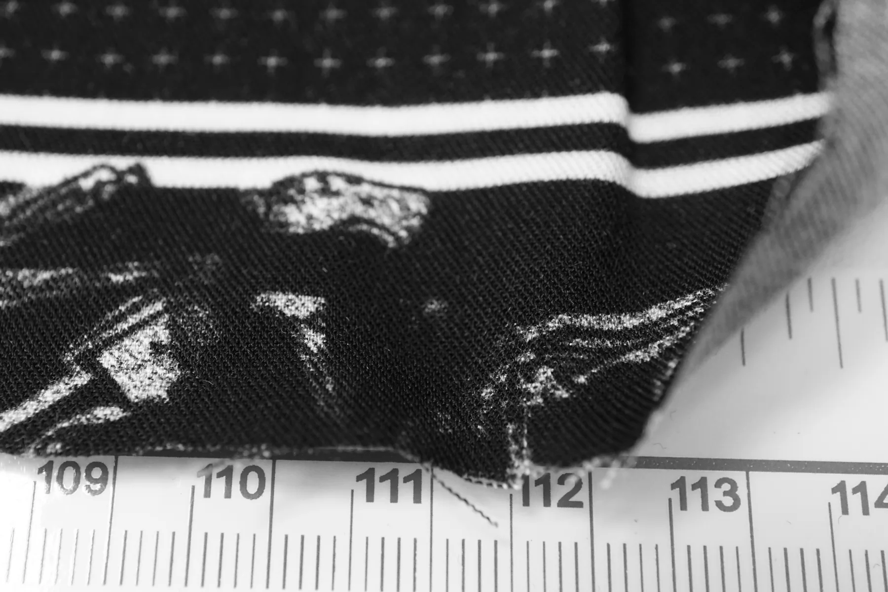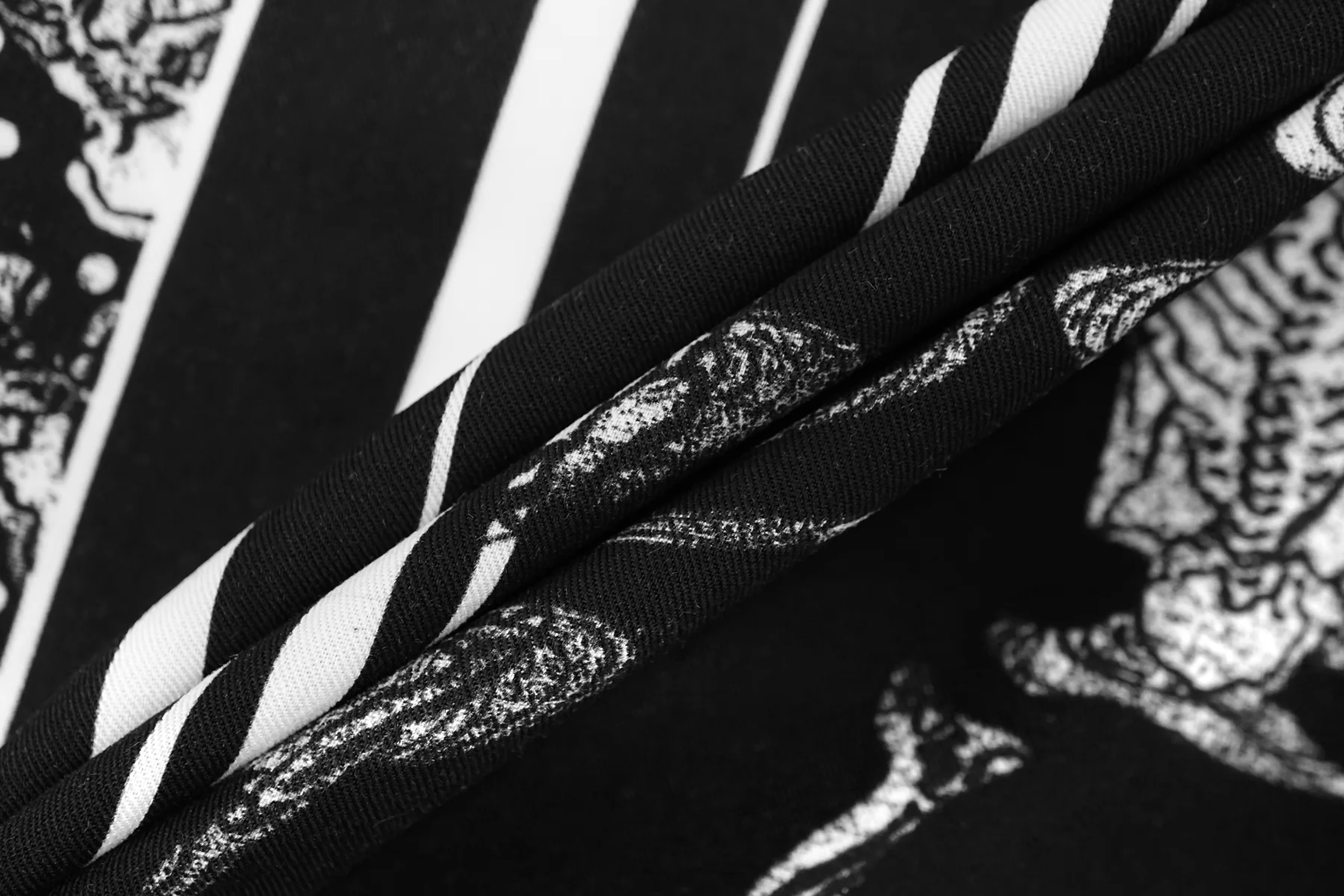 Плательная вискоза плательной плотности с чёрно-белым принтом со скелетами и квадратами. У принта есть раппорт 86 см.. Материал очень мягкий и приятный. Не тянется. Сминается. Тонкий, пластичный, не просвечивает. Подойдет для пошива платья, топа, юбки, струящихся брюк на резинке. При работе с этой тканью советуем использовать тонкие иглы.