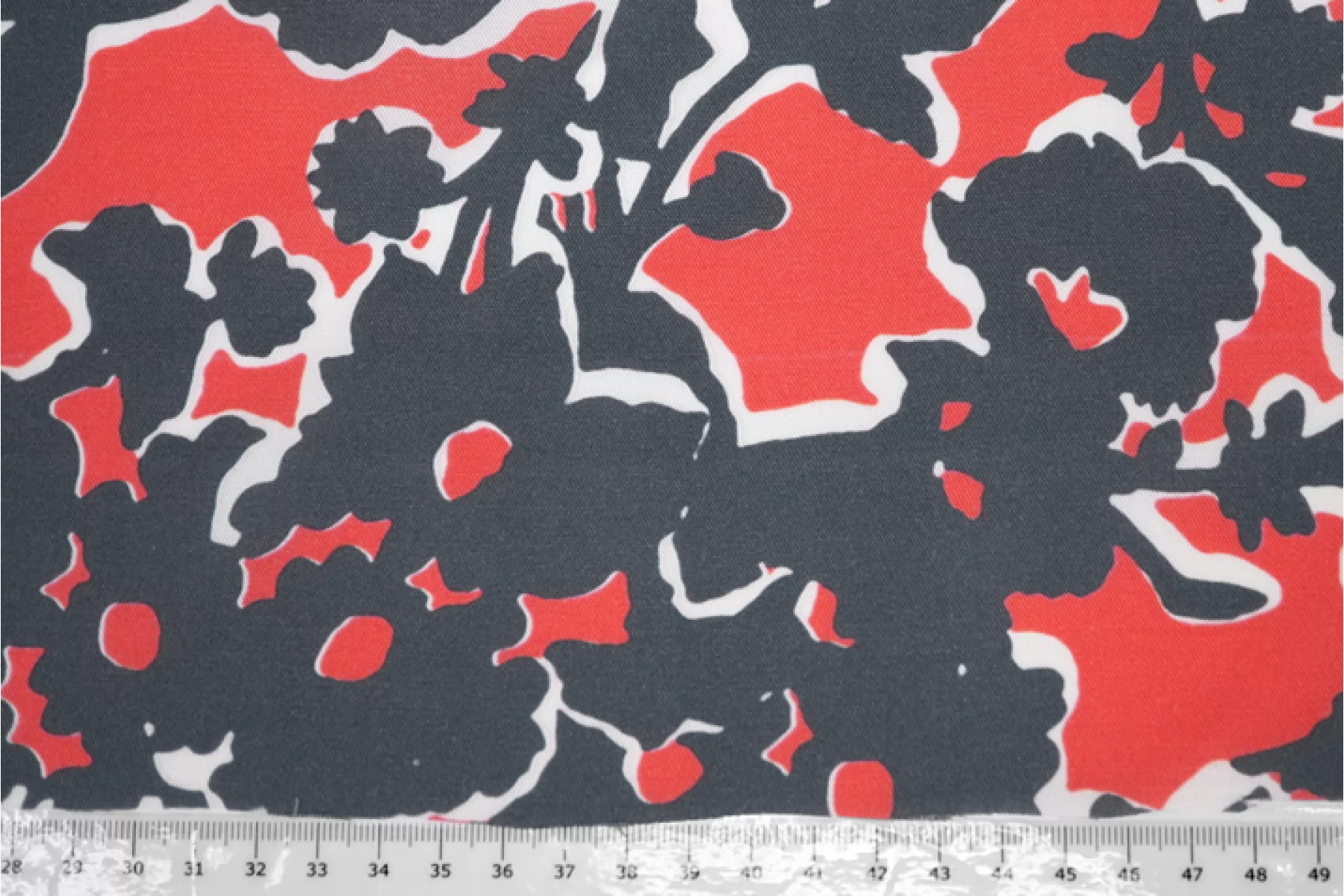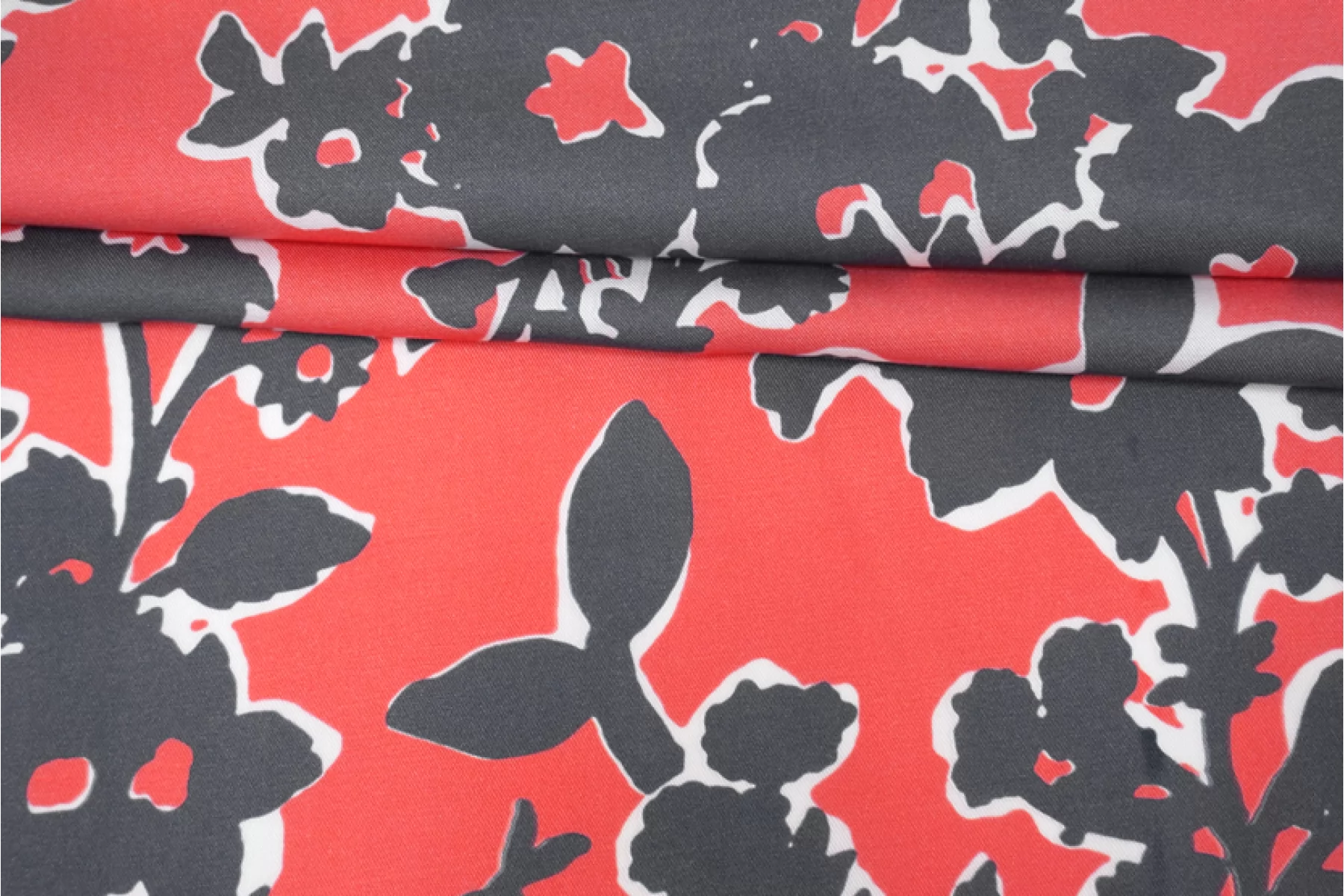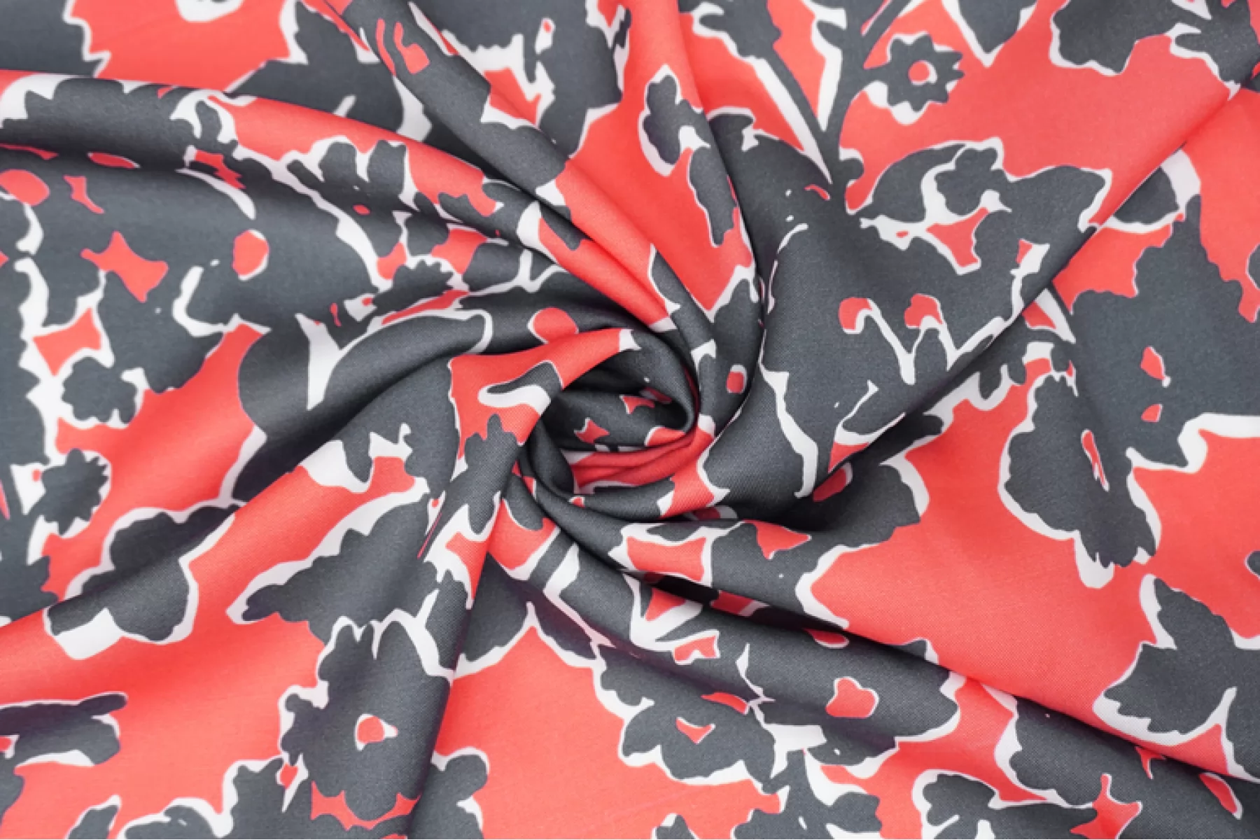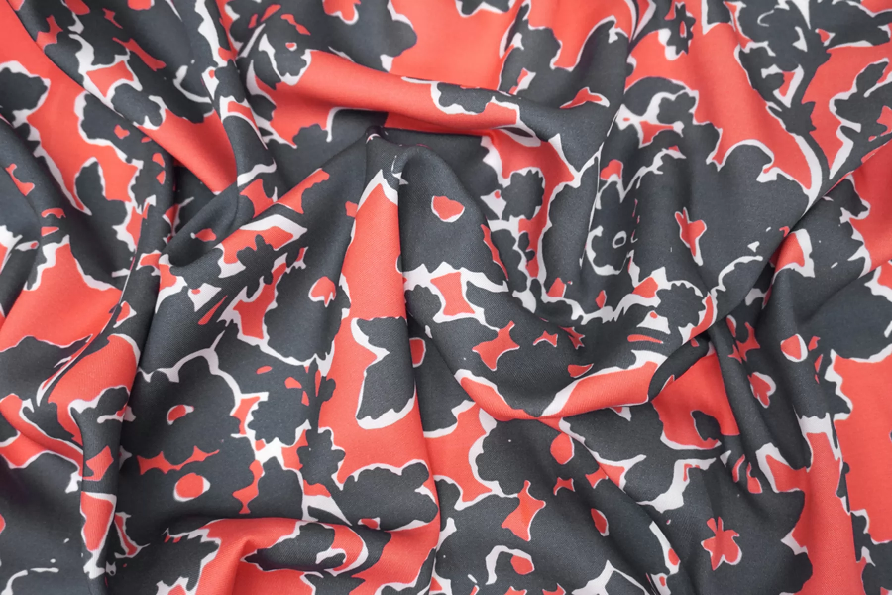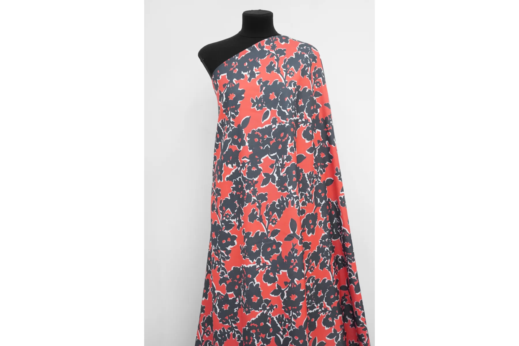 Плательная холодящая вискоза диагонального плетения кораллово-красного оттенка с достаточно крупным цветочным принтом в серо-белой гамме. Тактильно материал очень мягкий и приятный. Плотненький. Не тянется. Совсем немного просвечивает контур силуэта, если смотреть прямо на просвет. Форму держит совсем немного. Слегка мнется, а также красива в своей пластике и красиво струится. Шьем рубашки, платья, сарафаны, юбки и не только. Обязательно учитывайте усадку 5-10%.