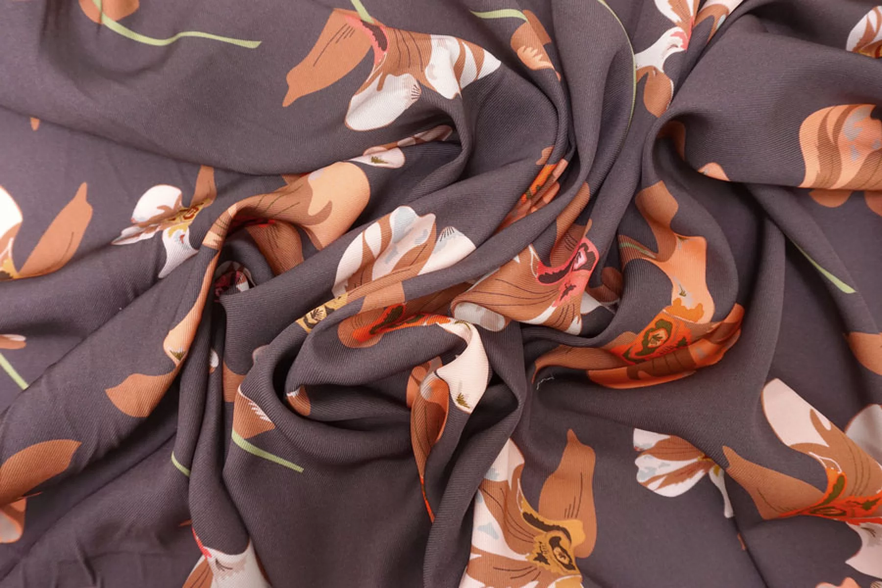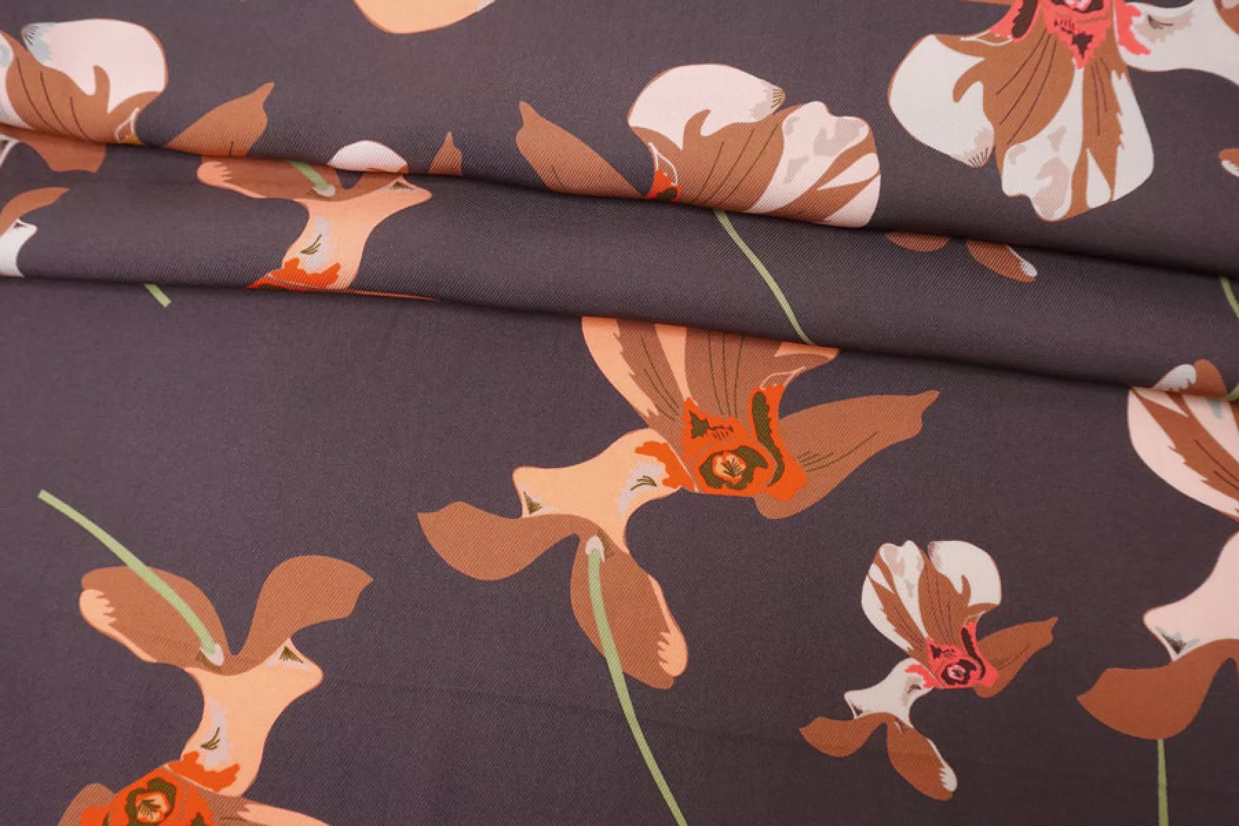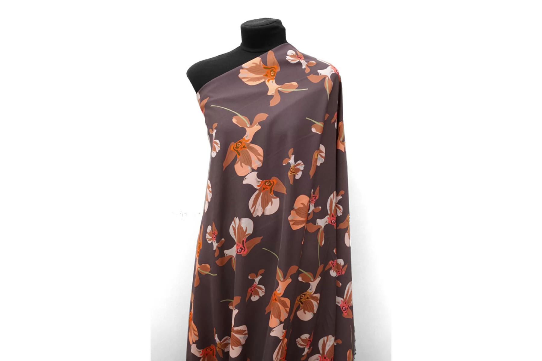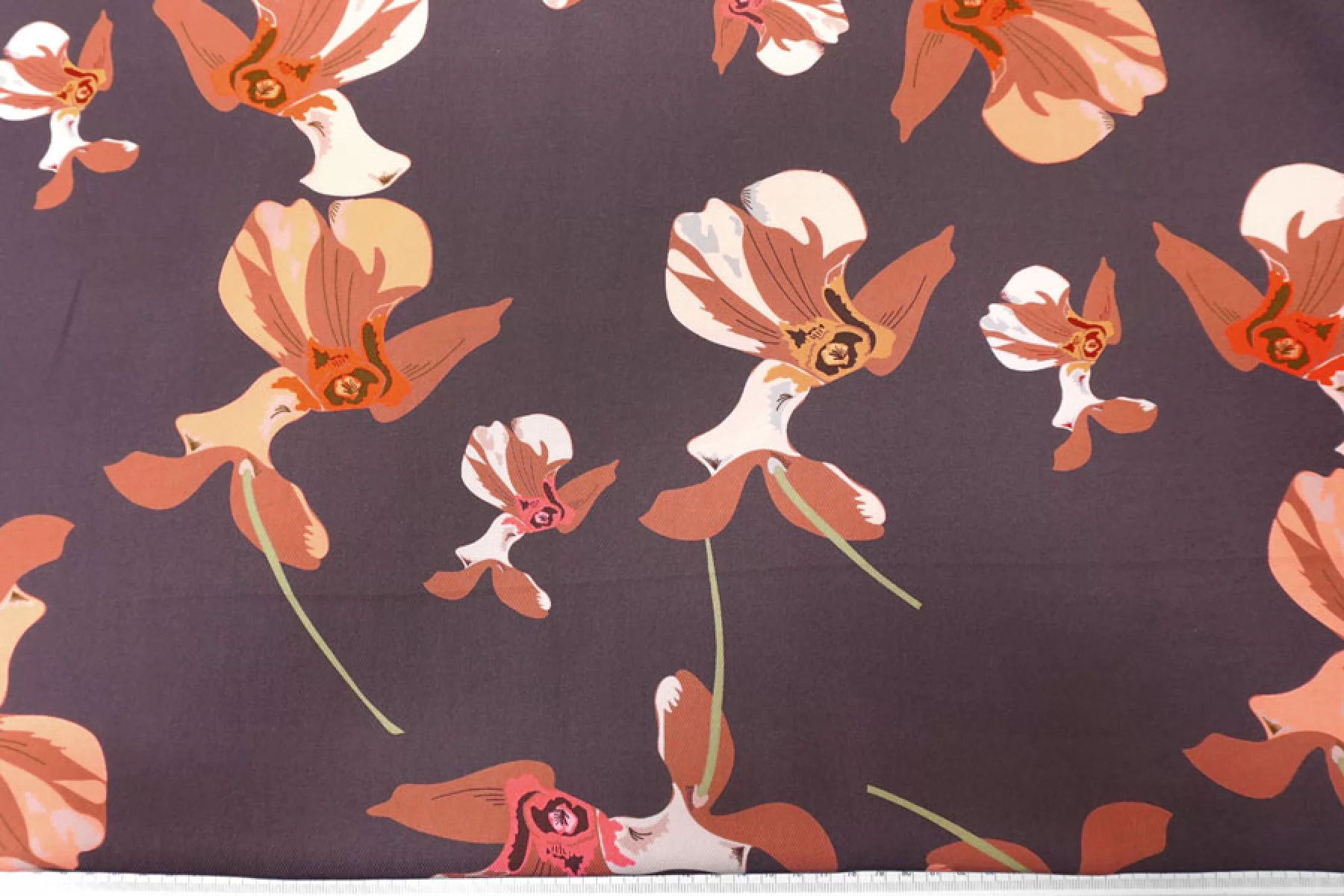 Итальянская плательная вискоза диагонального плетения с со стилизованным цветочным принтом на припыленном фиолетовом фоне. Цвета принта: персиковый, оранжевый, кофейный, бледно-розовый, бледно-горчичный, серый, зеленый, розовый. Довольно плотная, с ниспадающей пластикой. Не просвечивает, не тянется. Подойдет для пошива платья, юбки, брюк, костюмов в пижамном стиле (рубашка + шорты/брюки). При работе с этой тканью советуем использовать тонкие иглы и нитки.
