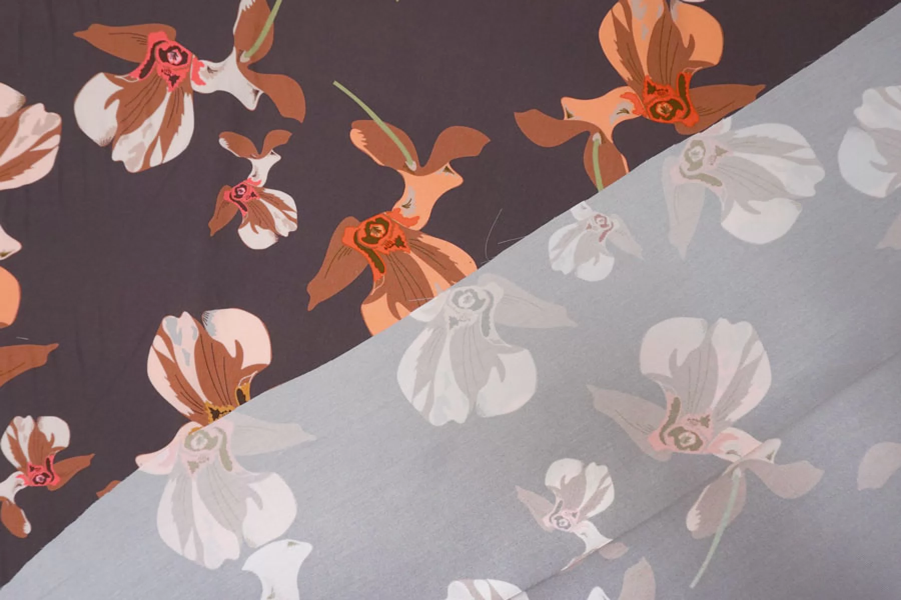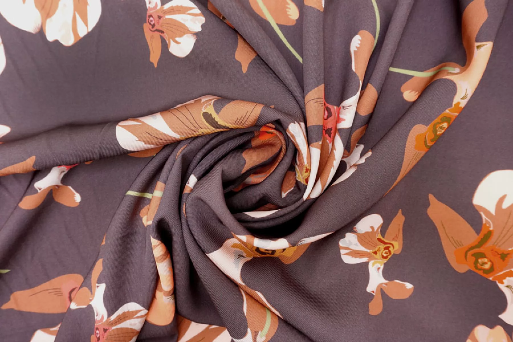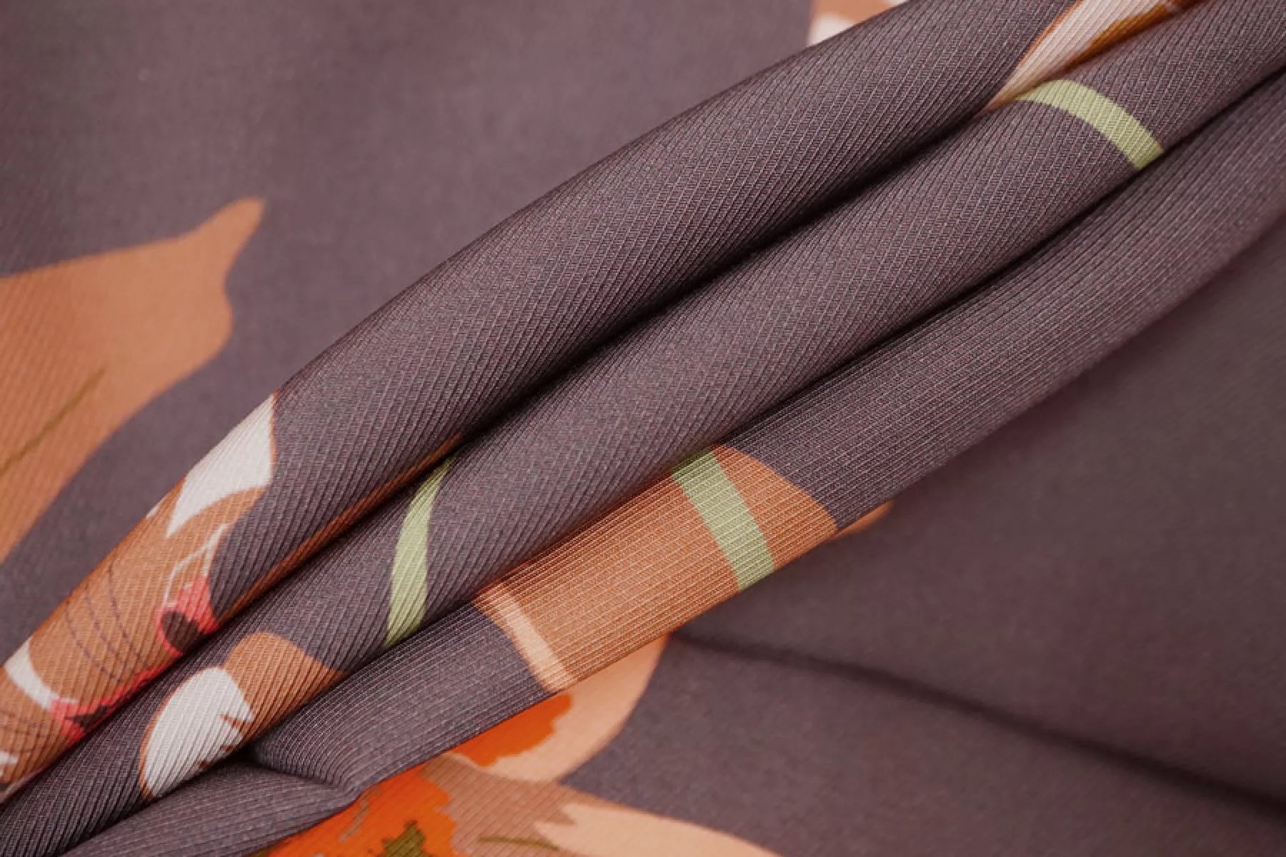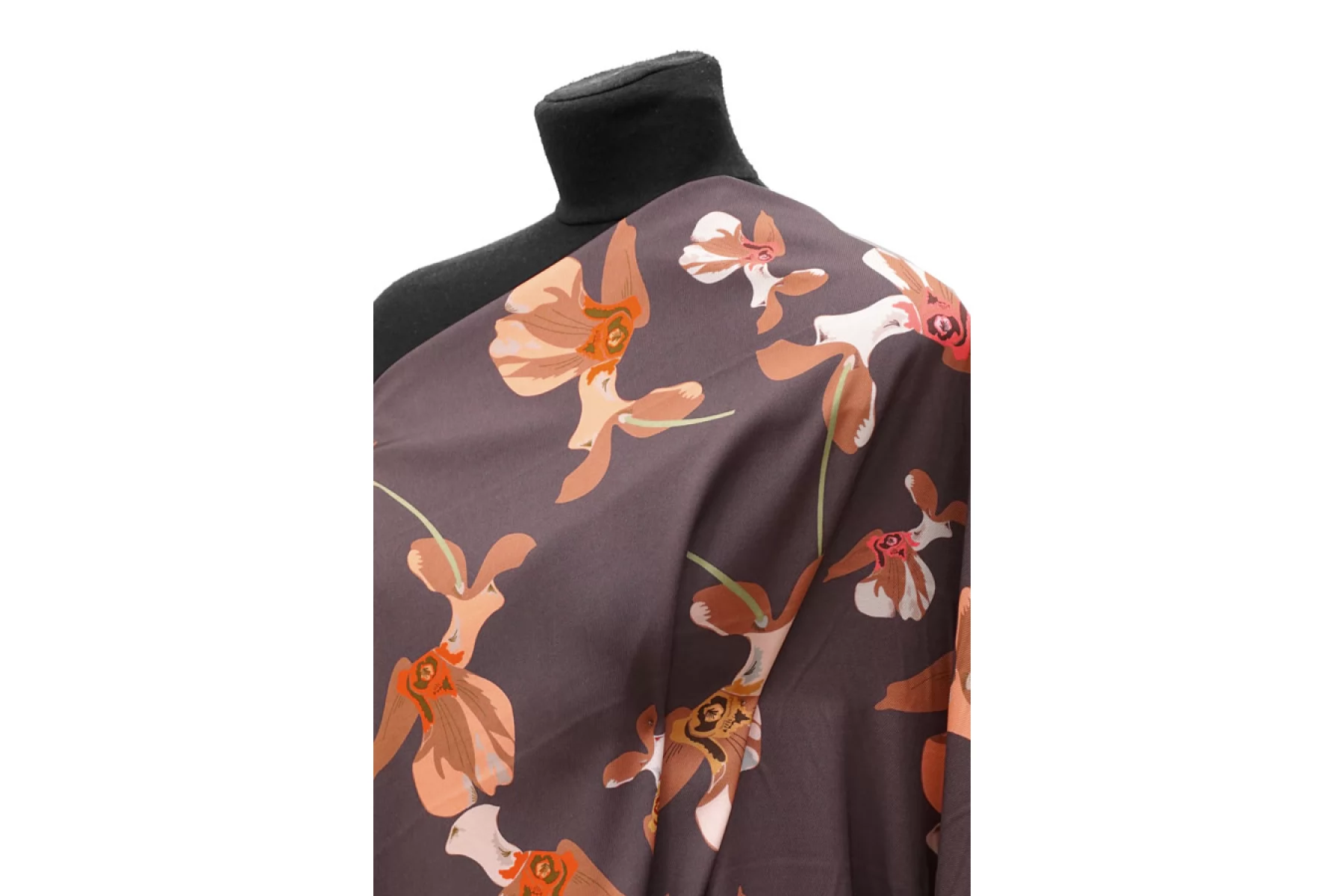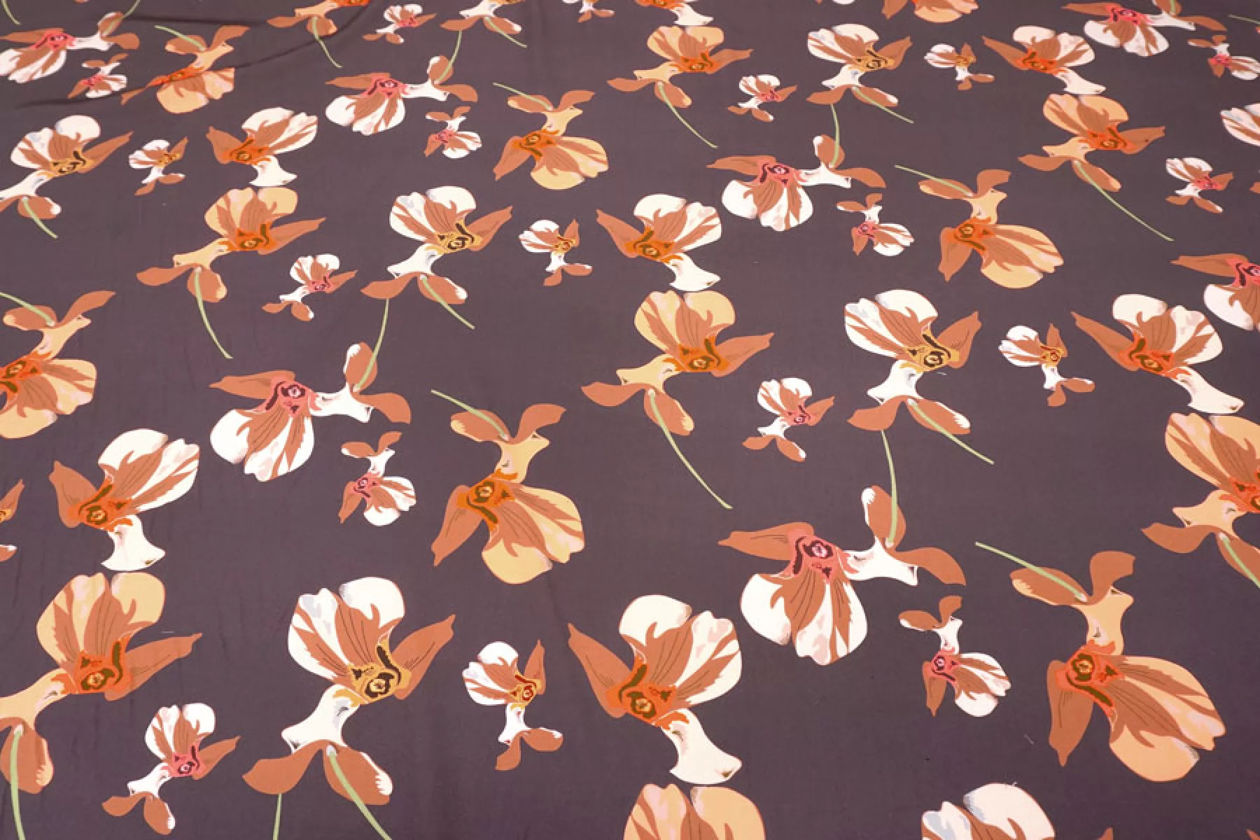 Итальянская плательная вискоза диагонального плетения с со стилизованным цветочным принтом на припыленном фиолетовом фоне. Цвета принта: персиковый, оранжевый, кофейный, бледно-розовый, бледно-горчичный, серый, зеленый, розовый. Довольно плотная, с ниспадающей пластикой. Не просвечивает, не тянется. Подойдет для пошива платья, юбки, брюк, костюмов в пижамном стиле (рубашка + шорты/брюки). При работе с этой тканью советуем использовать тонкие иглы и нитки.