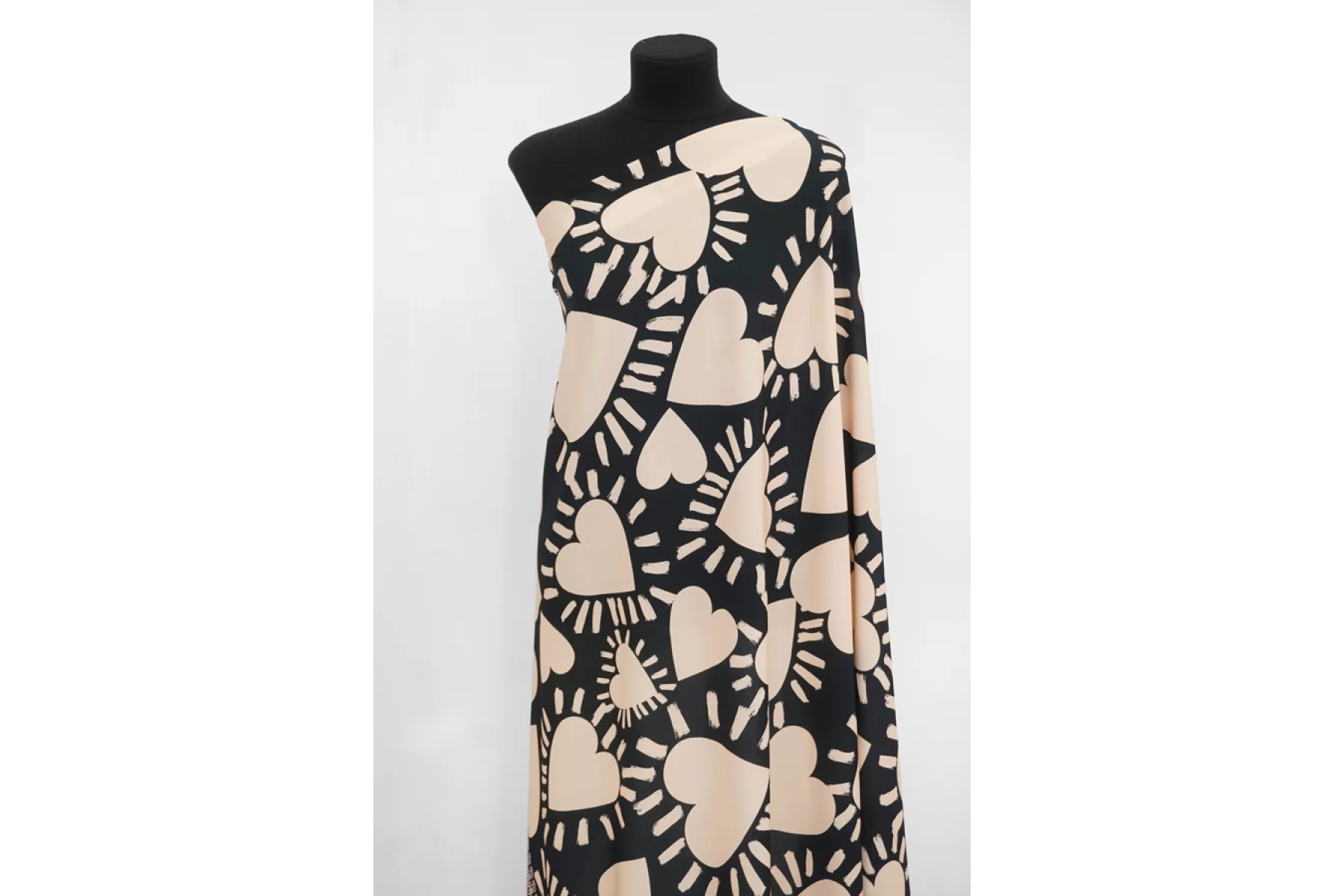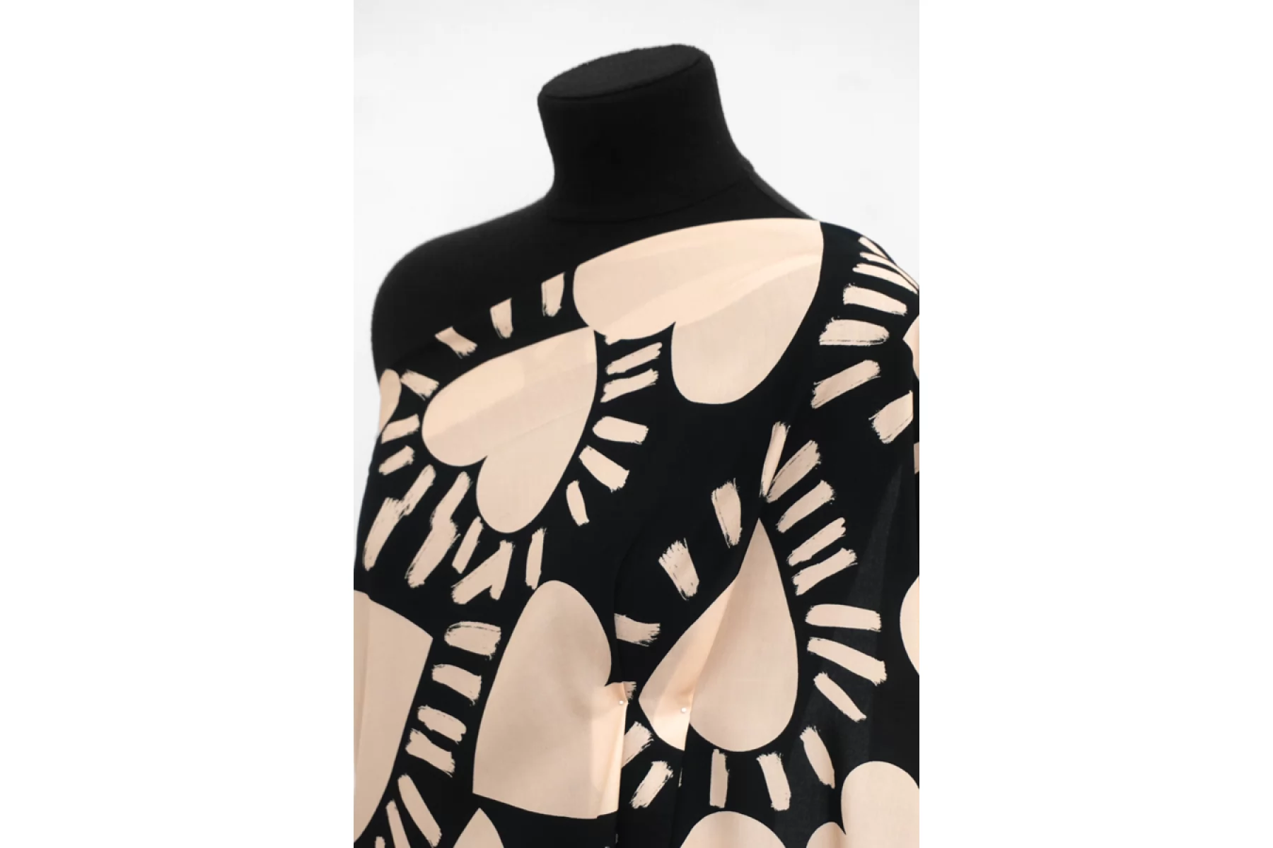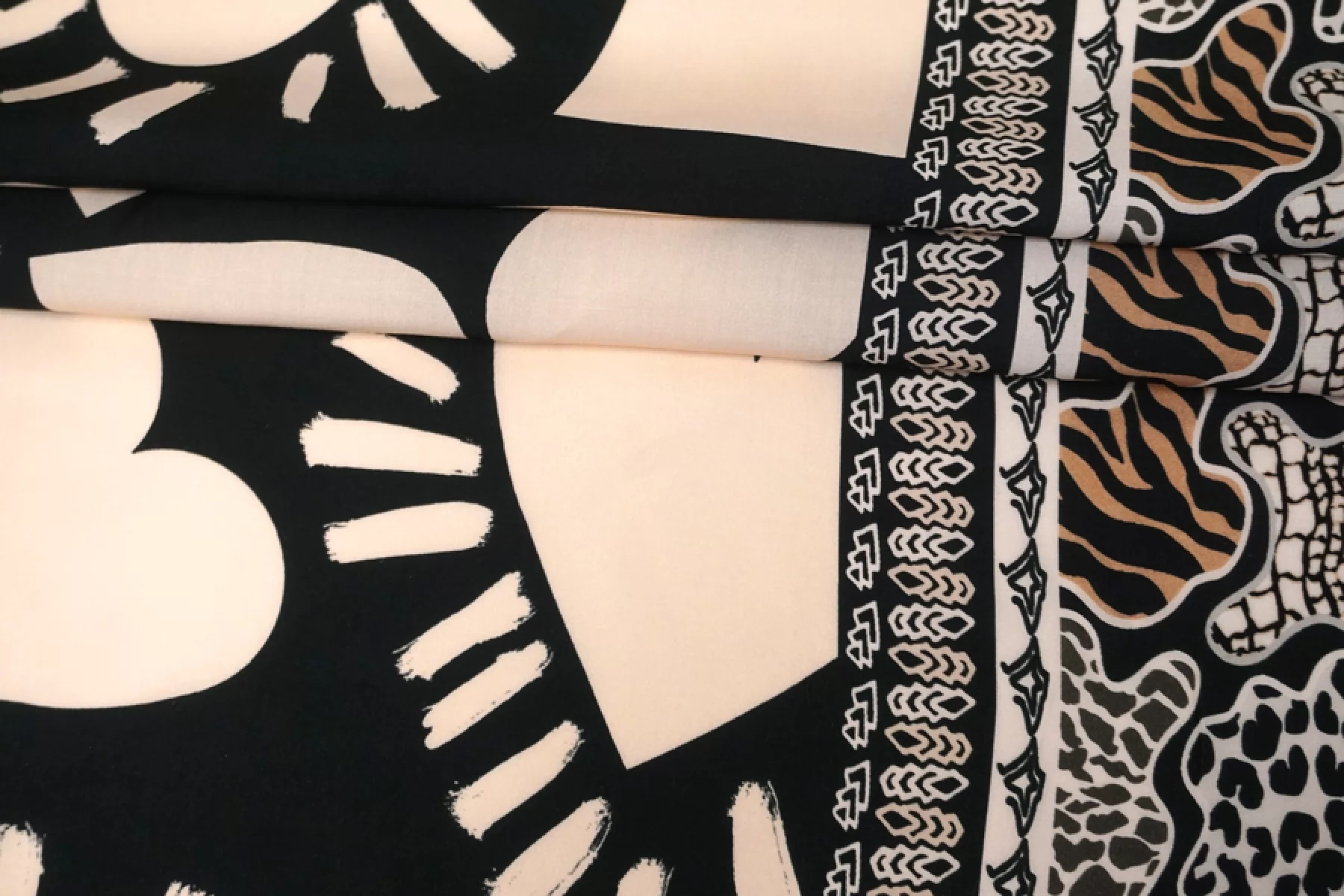 Классная и необычная плательно-блузочная вискоза, штапель, черного цвета с принтом в виде крупных сердец, а также бордюров с обеих сторон по кромке ( около 19 см ) в виде абстрактных полос и анималистичных пятен зебры, жирафа, рептилии и леопарда. Смотрится нестандартно и интересно. Кроить можно в любом направлении. Тактильно материал приятный и мягкий. Не тянется, слегка просвечивает силуэт на просвет. Хорошо драпируется и совсем немного держит форму. Плетение плотное. Используем на платья, рубашки, юбки и не только. При необходимости используйте подкладочный материал. Обязательно учитывайте усадку 5-10%