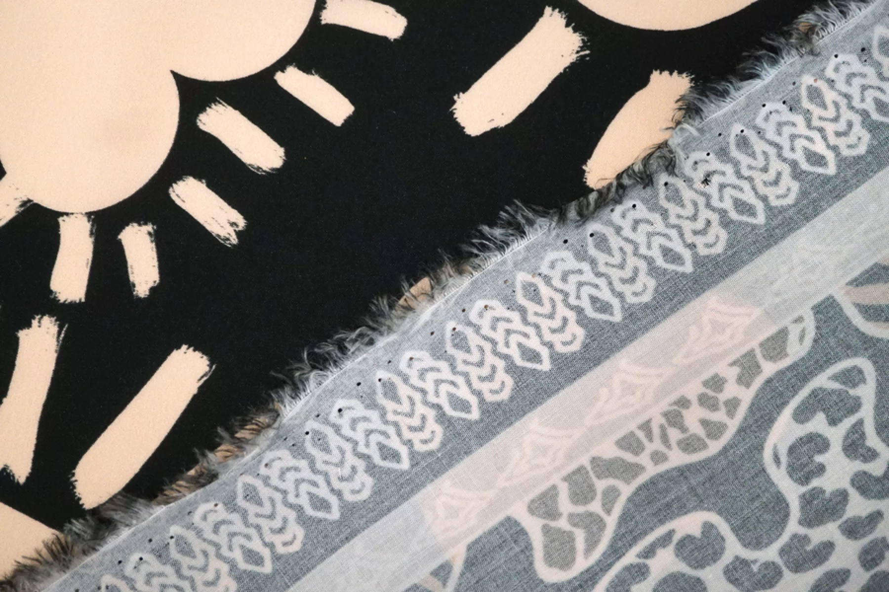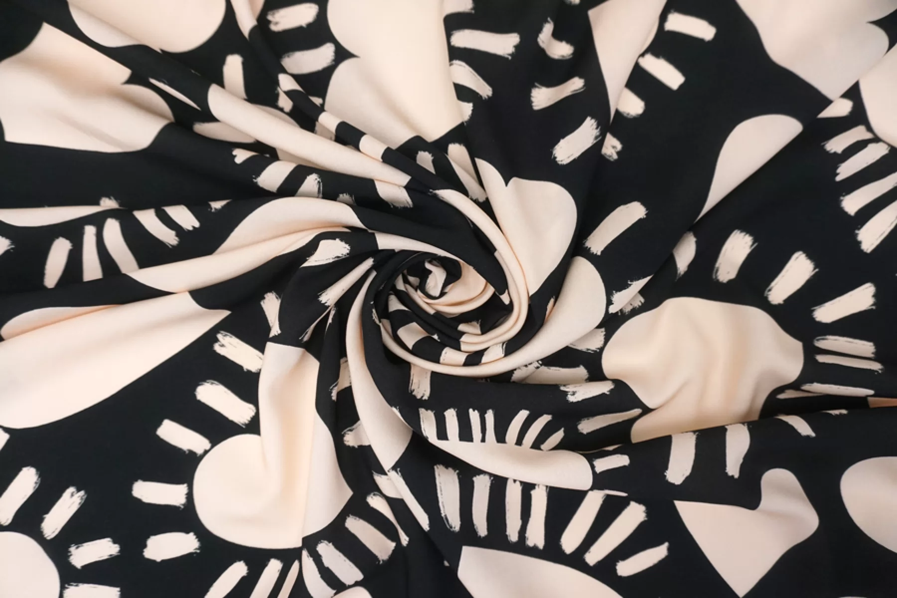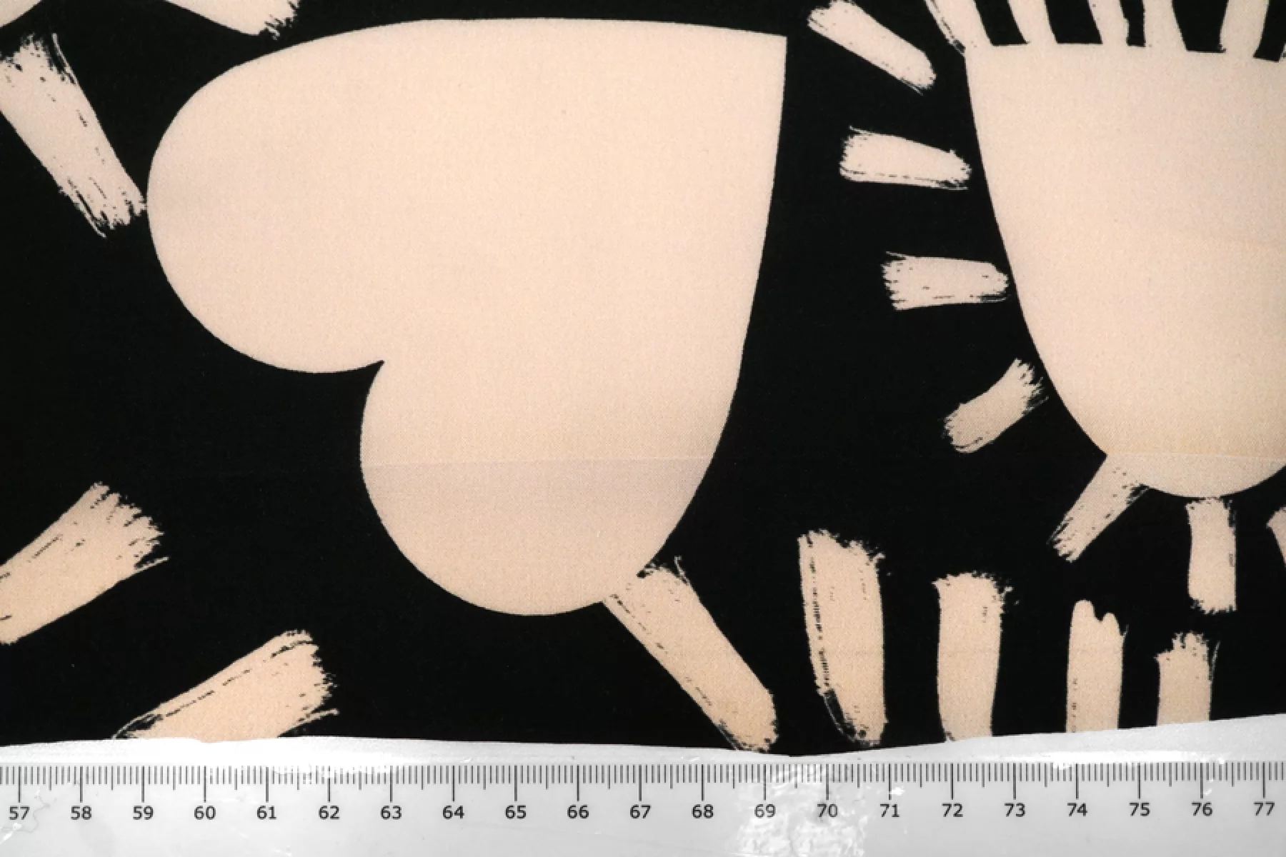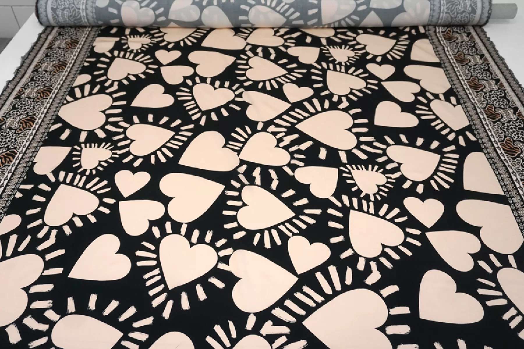 Классная и необычная плательно-блузочная вискоза, штапель, черного цвета с принтом в виде крупных сердец, а также бордюров с обеих сторон по кромке ( около 19 см ) в виде абстрактных полос и анималистичных пятен зебры, жирафа, рептилии и леопарда. Смотрится нестандартно и интересно. Кроить можно в любом направлении. Тактильно материал приятный и мягкий. Не тянется, слегка просвечивает силуэт на просвет. Хорошо драпируется и совсем немного держит форму. Плетение плотное. Используем на платья, рубашки, юбки и не только. При необходимости используйте подкладочный материал. Обязательно учитывайте усадку 5-10%