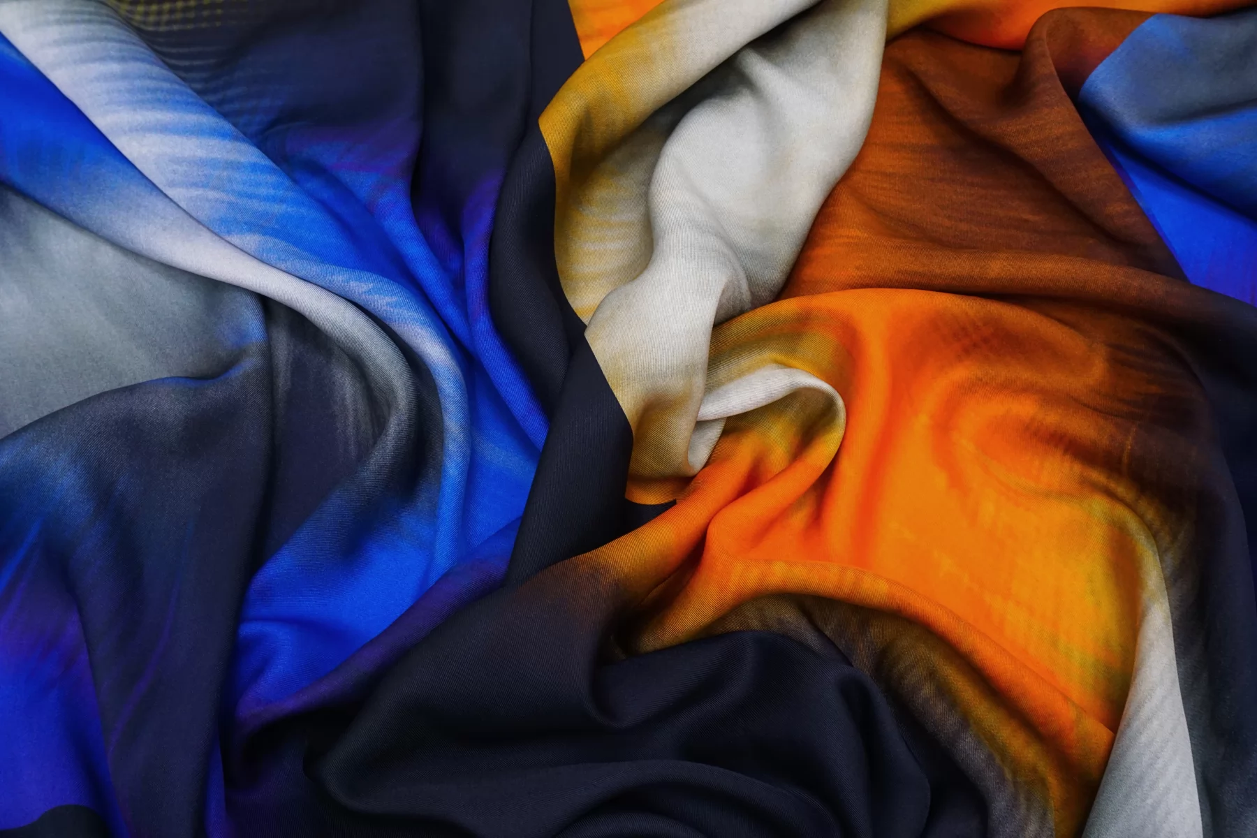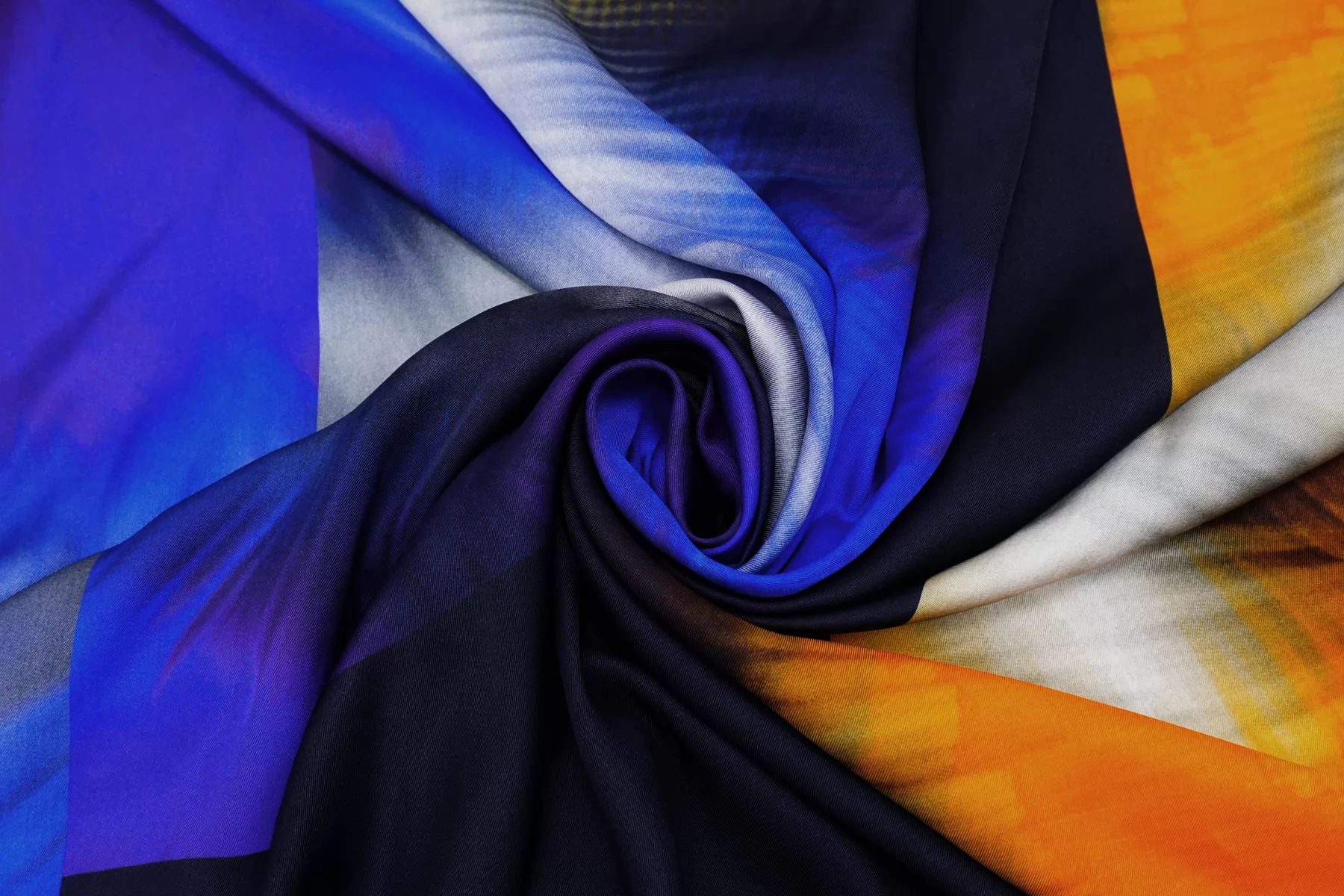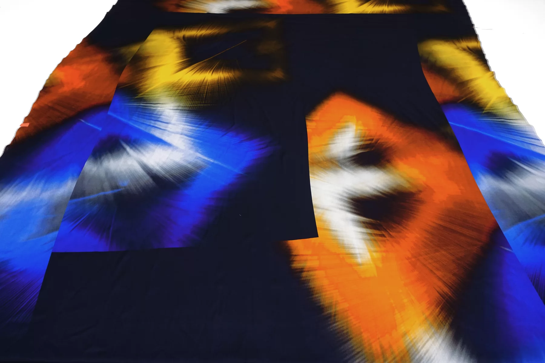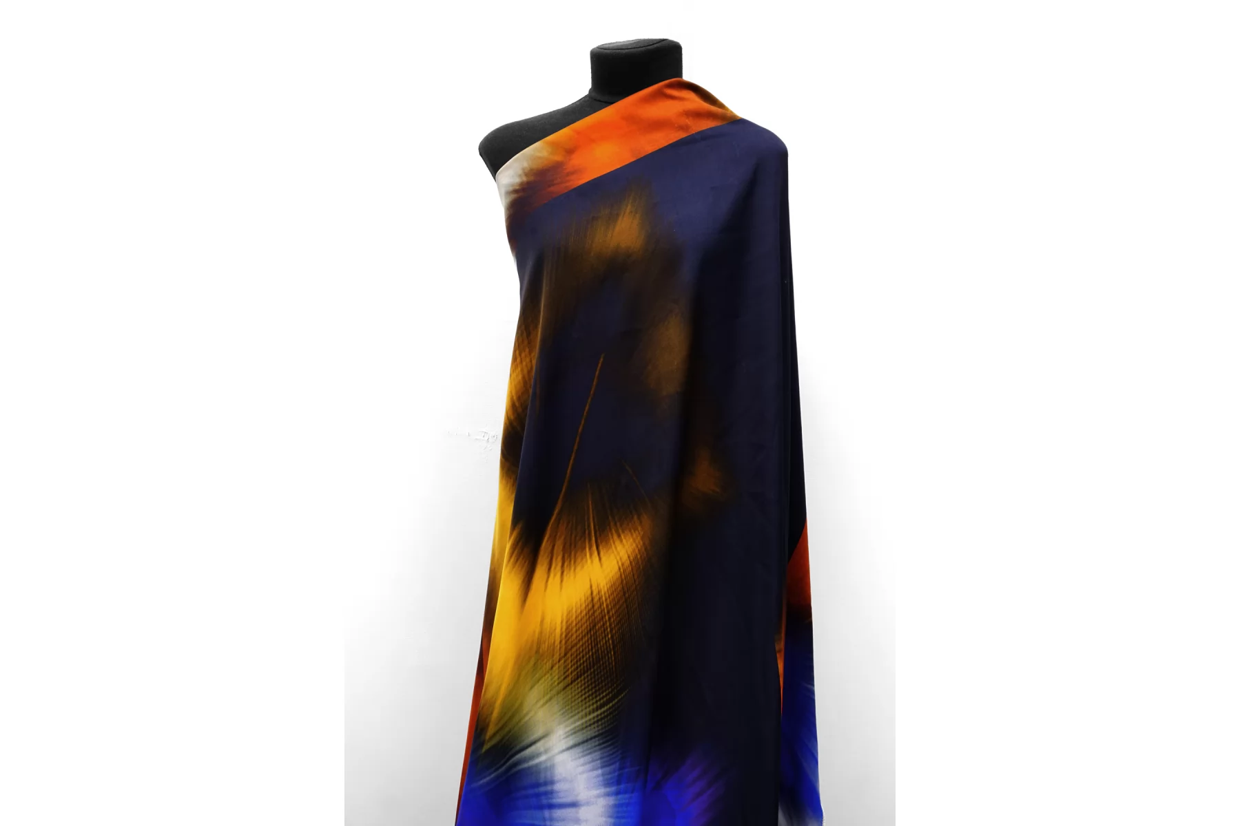 ВНИМАНИЕ! Ткань режется по купонам, длина купона 178 см, цена за купон -3417,6 руб. Плательная вискоза от бренда Max Mara, диагонального плетения, с абстрактным принтом, основной фон сине-черно фиолетовый, и на нем всполохи разных цветов, напоминает тай-дай. Материал тактильно очень приятный, гладкий и очень мягкий. Слегка холодящий тактильно. Красив в складке и хорошо драпируется. Не тянется. Легкий и струящийся. Слегка просвечивает силуэт на просвет. Шикарный вариант на одежду в бельевом стиле, на платье, халат, кимоно, блузку или юбку. Обязательно учитывайте усадку 5-10%. Шить изделия из данного материала рекомендуем тонкой иглой.