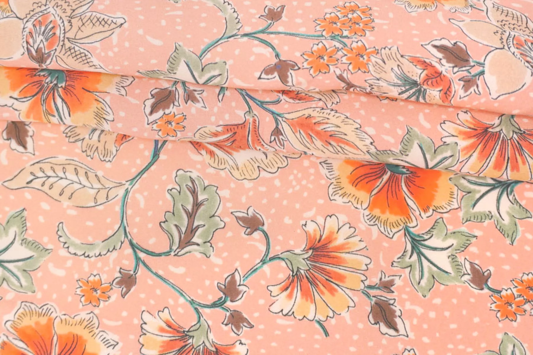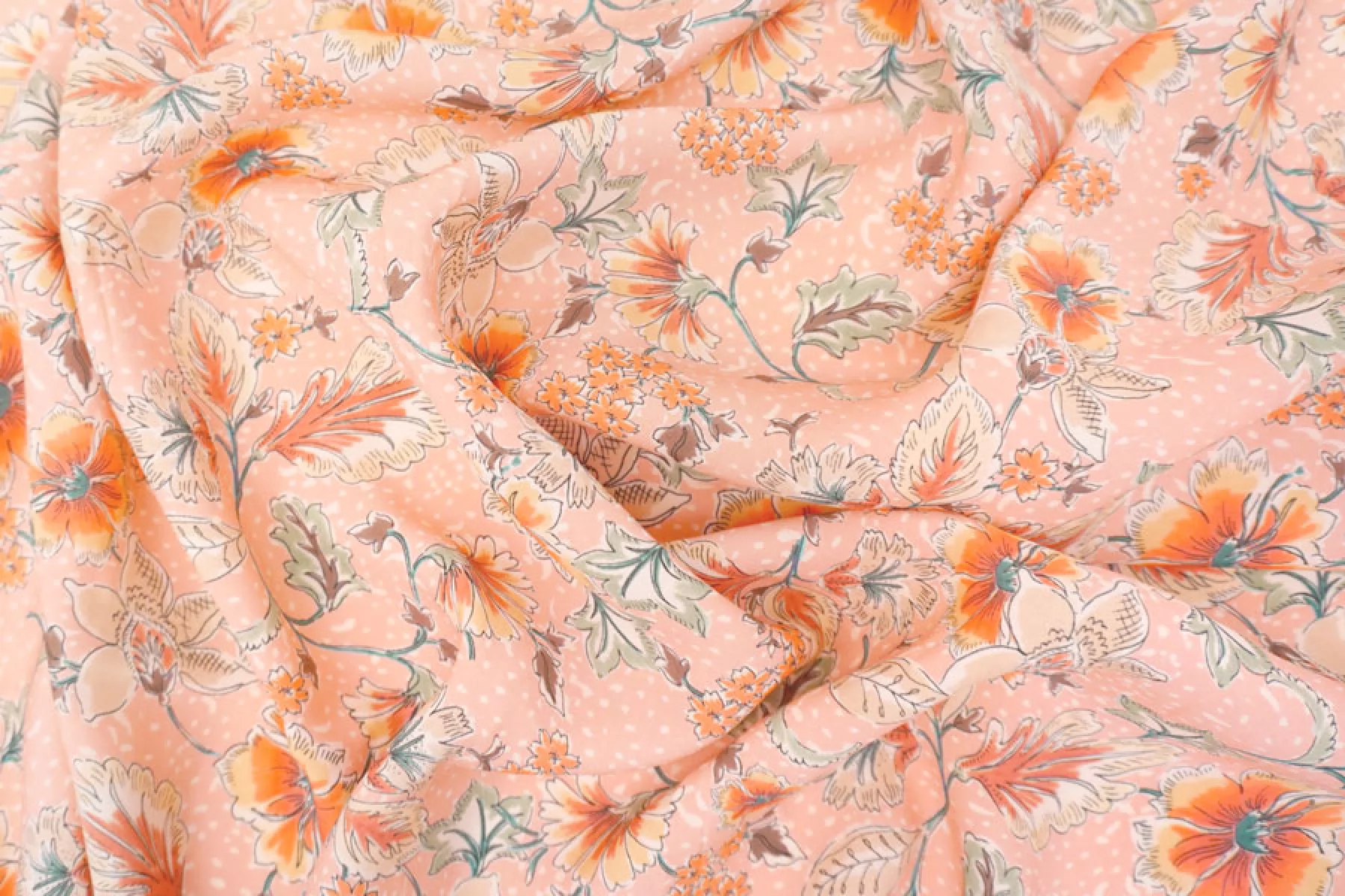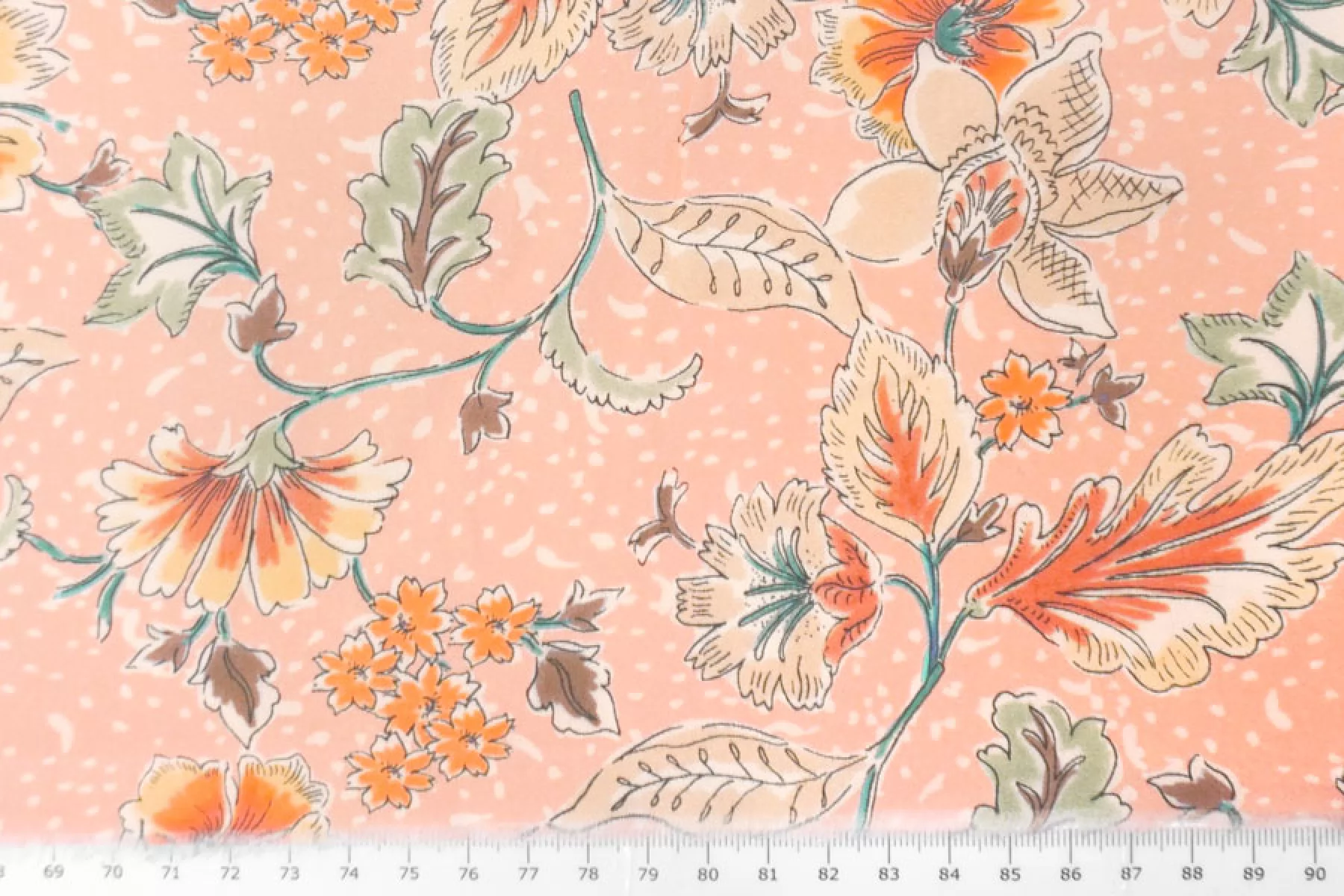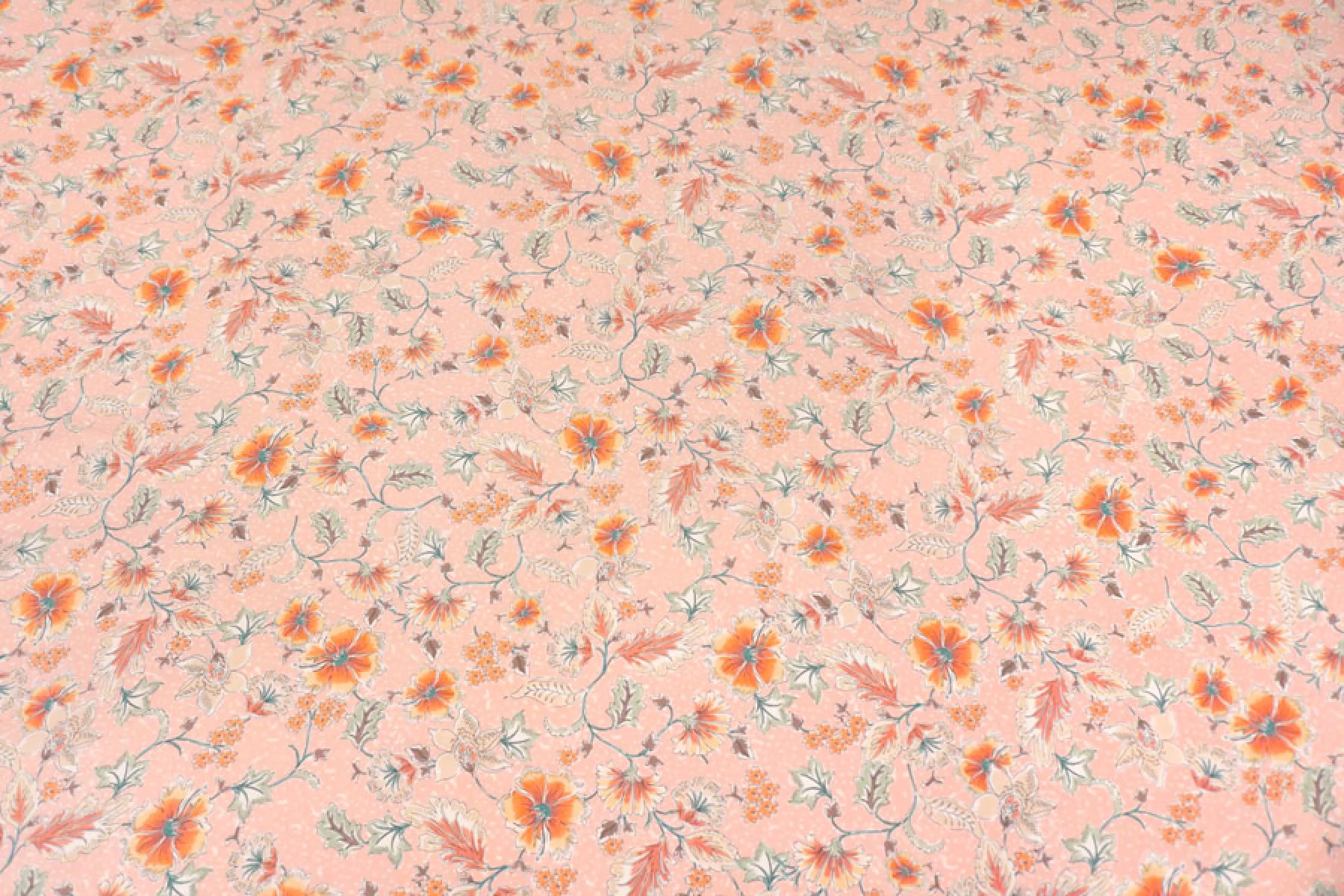 Плательная вискоза пудрово-персикового оттенка в цветочный принт в оттенках бежевого, коричневого, оранжевого, приглушенного желтого и зеленого. Тактильно гладкая, приятная, с необычной пластикой. Не тянется, не просвечивает. Тонкая, но при этом плотная. Не тянется. Практически не мнется. Прекрасна в своей пластике. Подойдет на платья, блузки или юбки, а также одежду в пижамном стиле. Обязательно учитывайте усадку 5-10%.