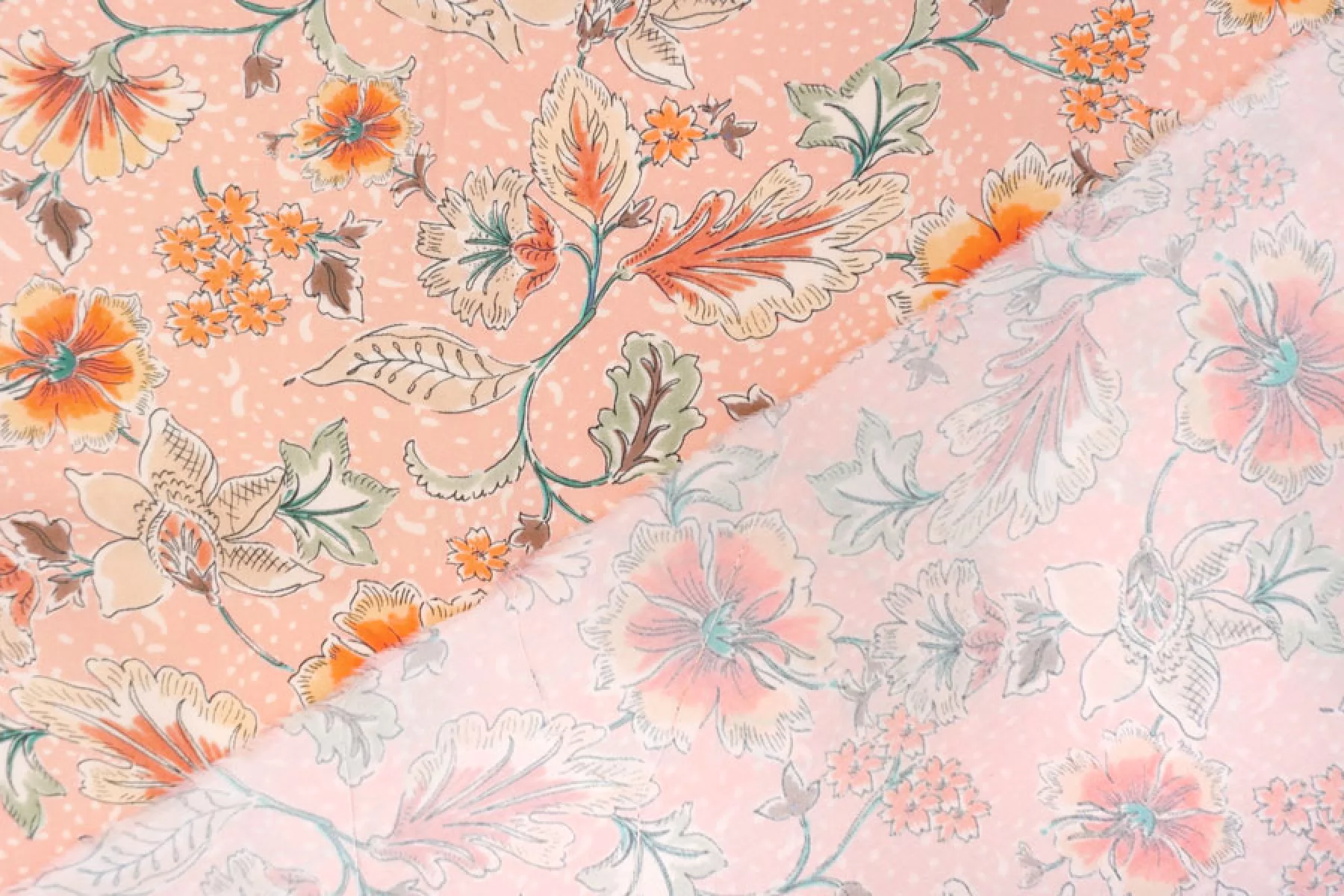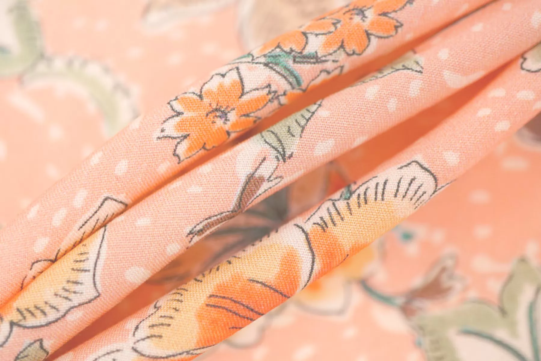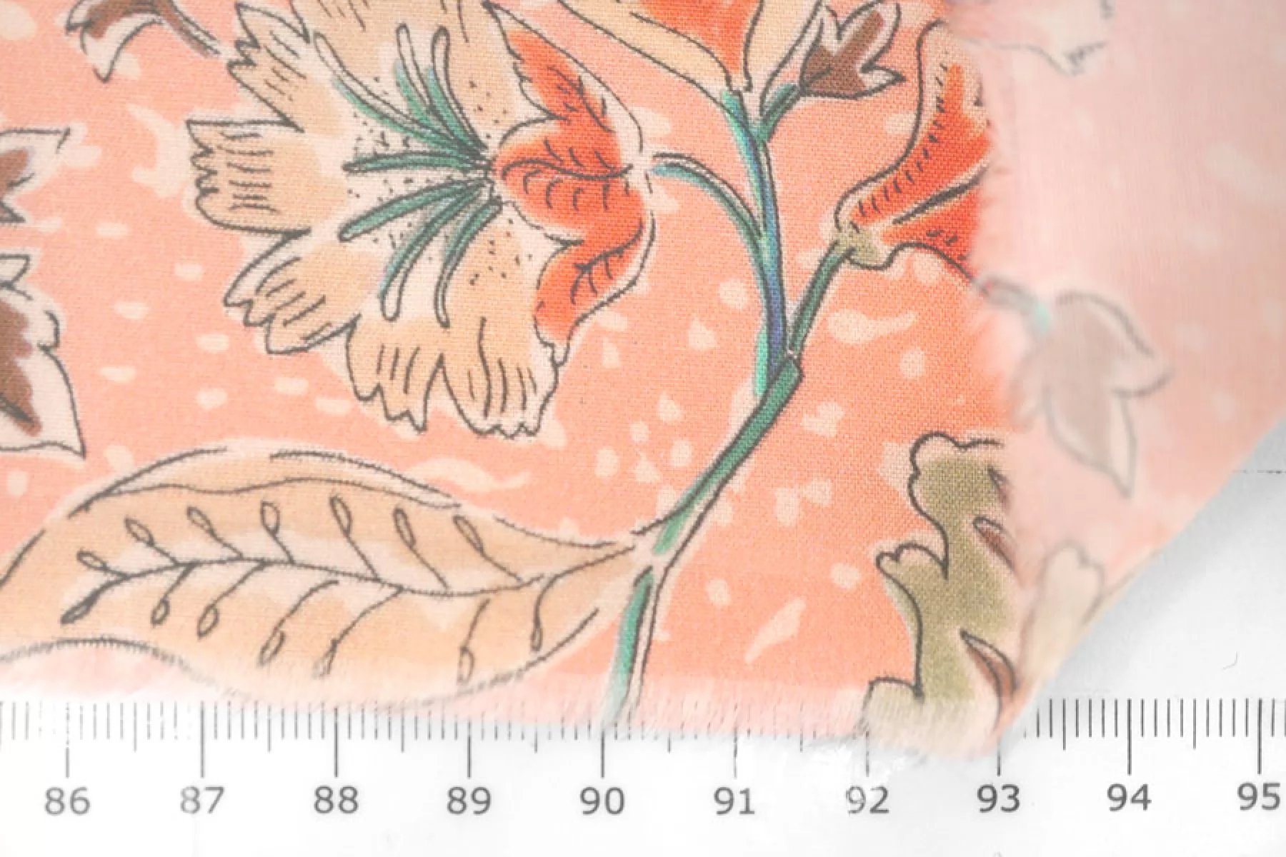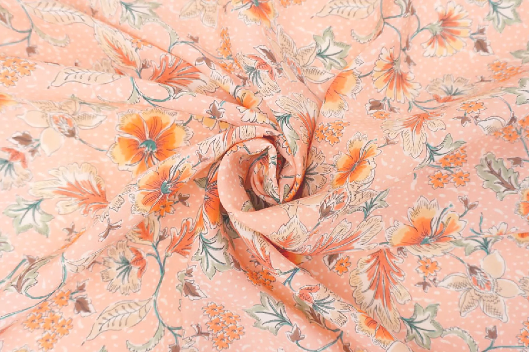 Плательная вискоза пудрово-персикового оттенка в цветочный принт в оттенках бежевого, коричневого, оранжевого, приглушенного желтого и зеленого. Тактильно гладкая, приятная, с необычной пластикой. Не тянется, не просвечивает. Тонкая, но при этом плотная. Не тянется. Практически не мнется. Прекрасна в своей пластике. Подойдет на платья, блузки или юбки, а также одежду в пижамном стиле. Обязательно учитывайте усадку 5-10%.