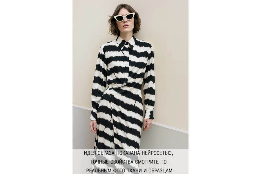 Плательно-блузочная вискоза сатинового переплетения с абстрактным принтом в бежево-черной цветовой гамме. Тактильно очень приятная, мягкая и гладкая, с легким лоском. Не тянется, совсем немного просвечивает силуэт на просвет. Легкая и струящаяся, красива в пластике . Форму держит совсем немного и интересно выглядит в складке. Шьем платье, блузку или юбку, а так же подойдет для одежды в бельевом стиле. Обязательно учитывайте усадку 5-10%. Шить изделия из данного материала рекомендуем тонкой иглой.