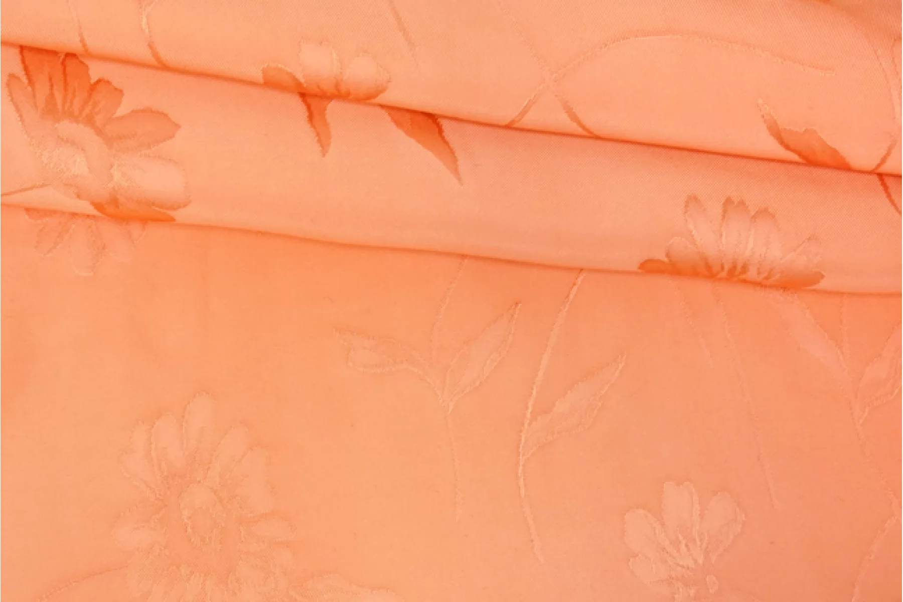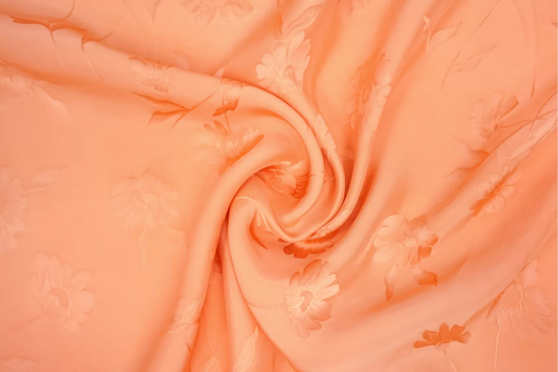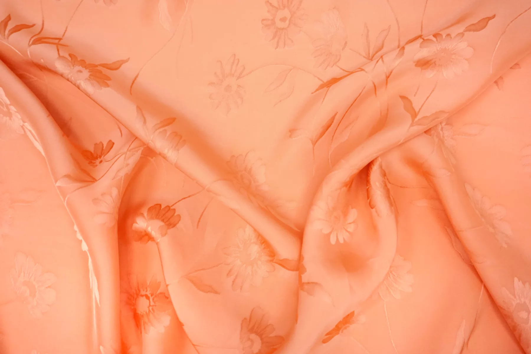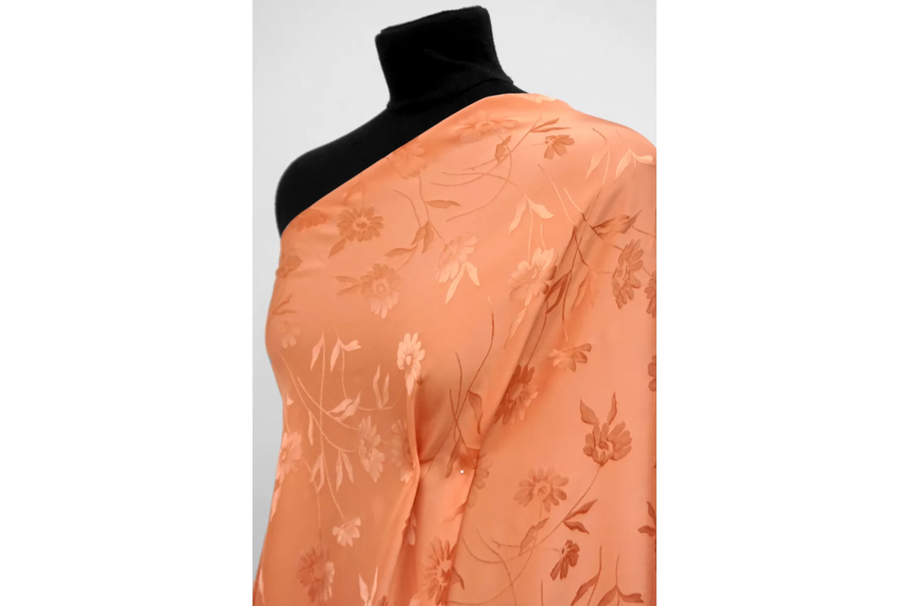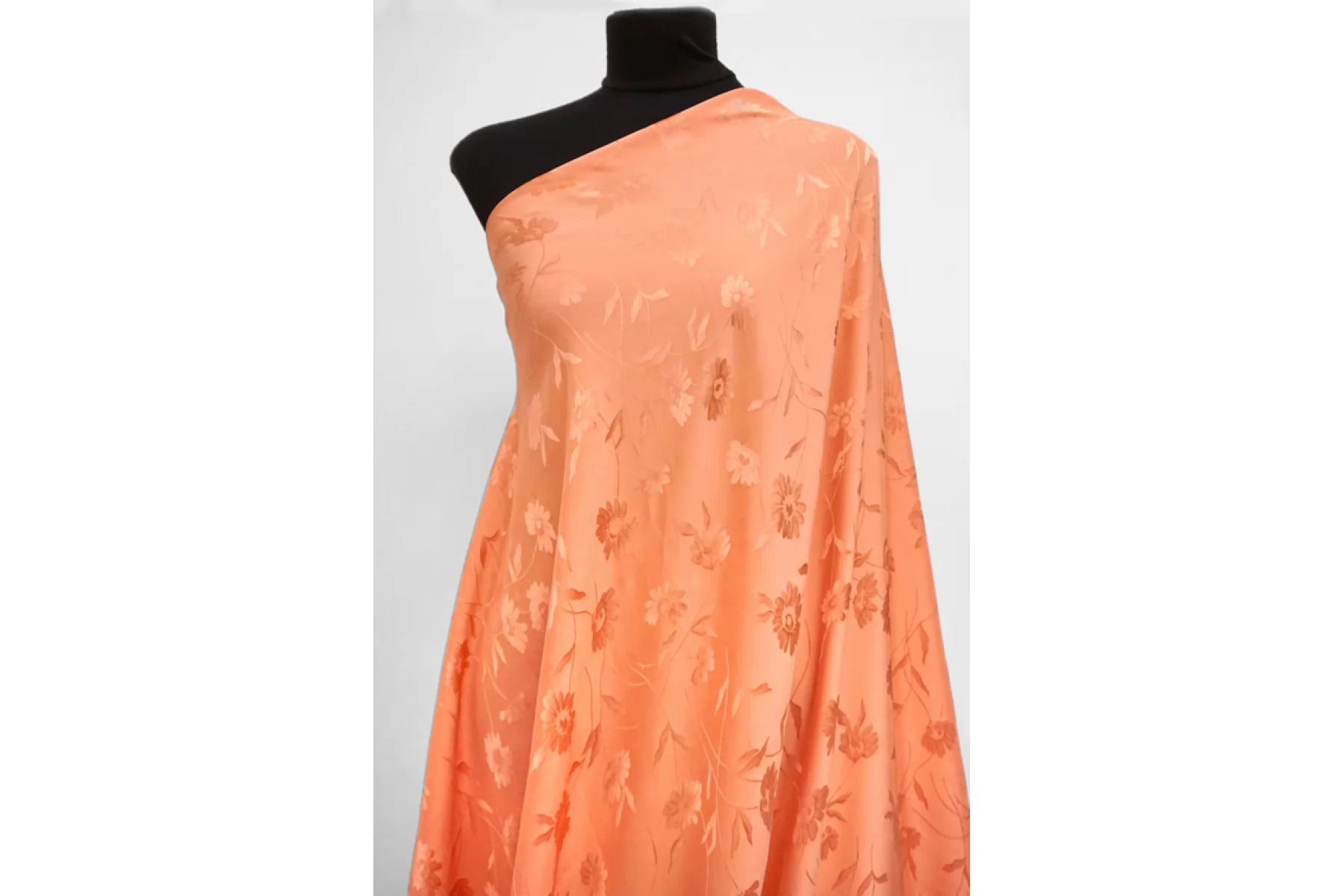Очень классная жаккардовая вискоза от GUCCI персикового оттенка с выработкой цветочного узора. Тактильно очень приятная, мягкая, пластичная, гладкая и скользящая. Не просвечивает, при этом полотно нетолстое. Не тянется. С красивым лоском. Немного сминается. Красива в складках и своей пластике. Шьем платья, юбки, кимоно и одежду в пижамном стиле. Уход за материалом деликатный. При необходимости используйте подкладочный материал. Учитываем усадку порядка 5-10%.