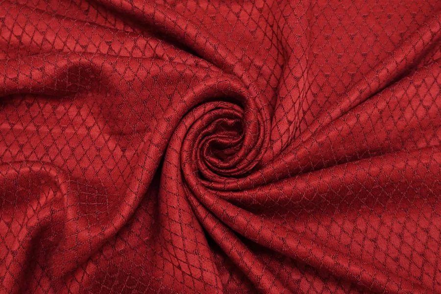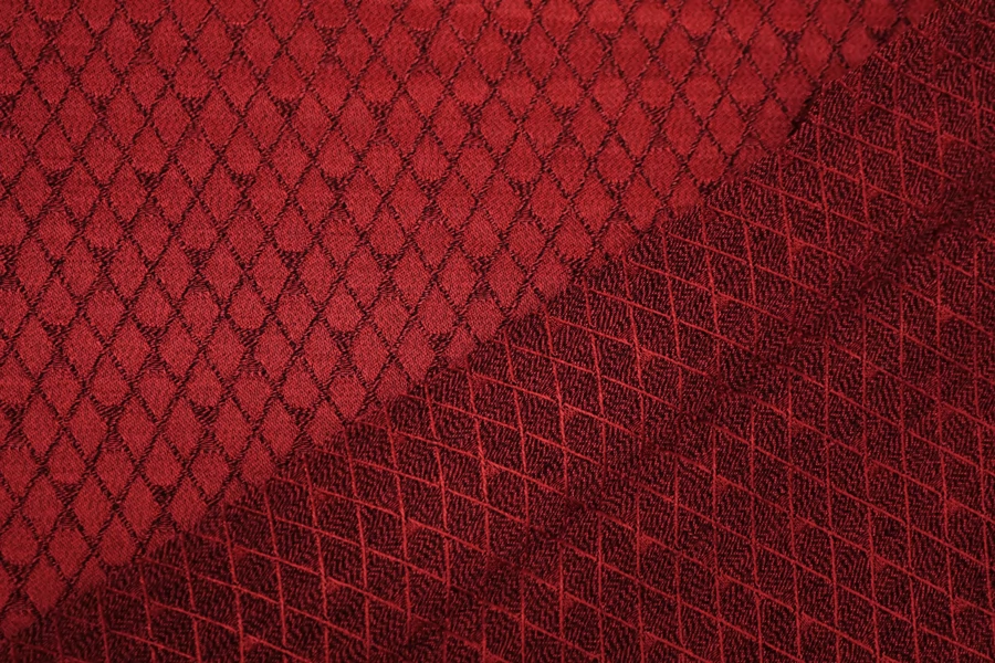 Красивая жаккардовая купра с вискозой из нитей бордового и чёрного цвета, с узором-ромбами. Тактильно приятная, гладкая. Обладает мягким блеском. Пластичная, плательной плотности. Не тянется. Не просвечивает. Красиво струится. Вариант на платья, юбки, костюмы в пижамном стиле. При необходимости используйте подкладочный материал. Обязательно учитывайте усадку 5-10%.