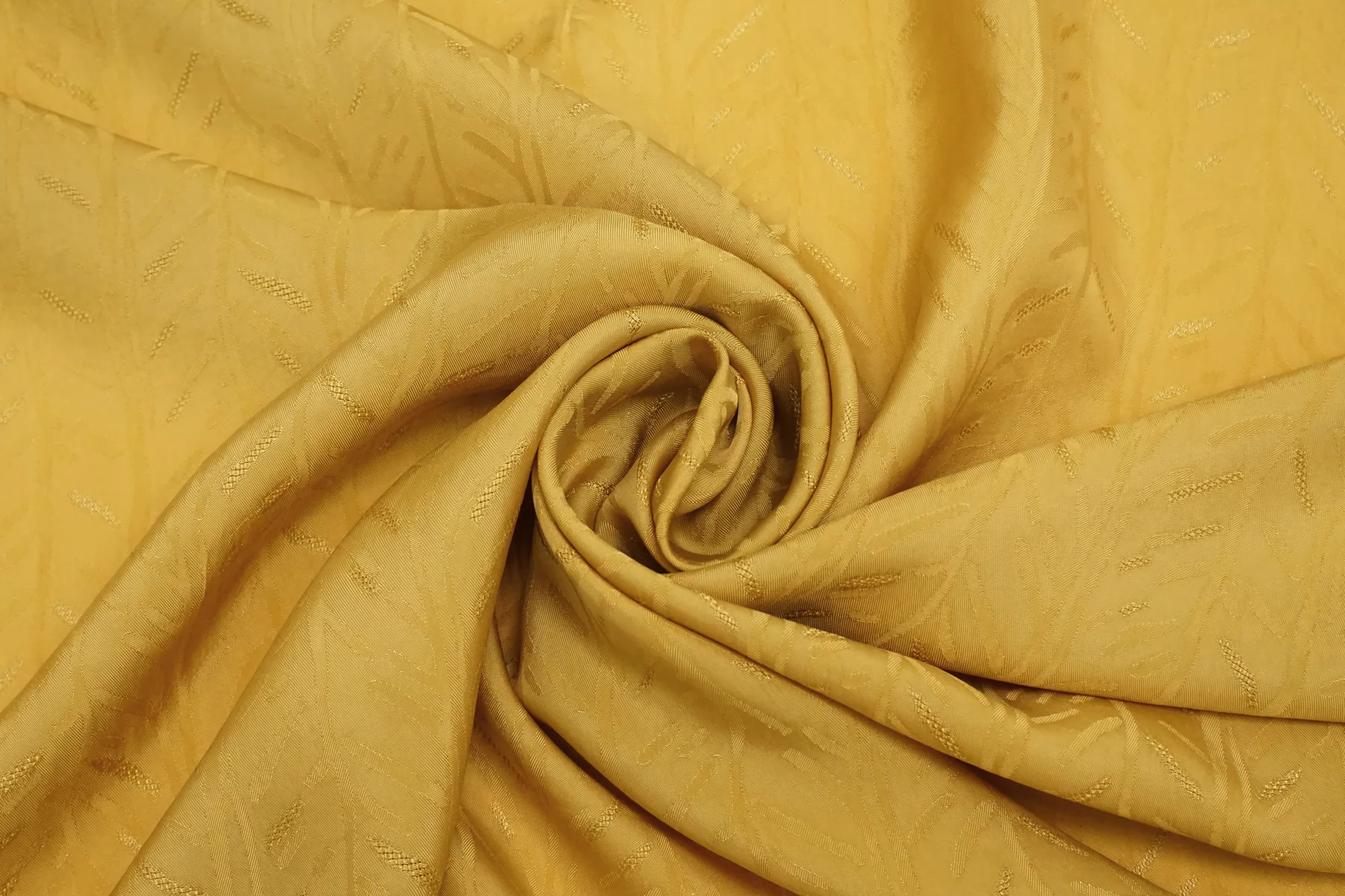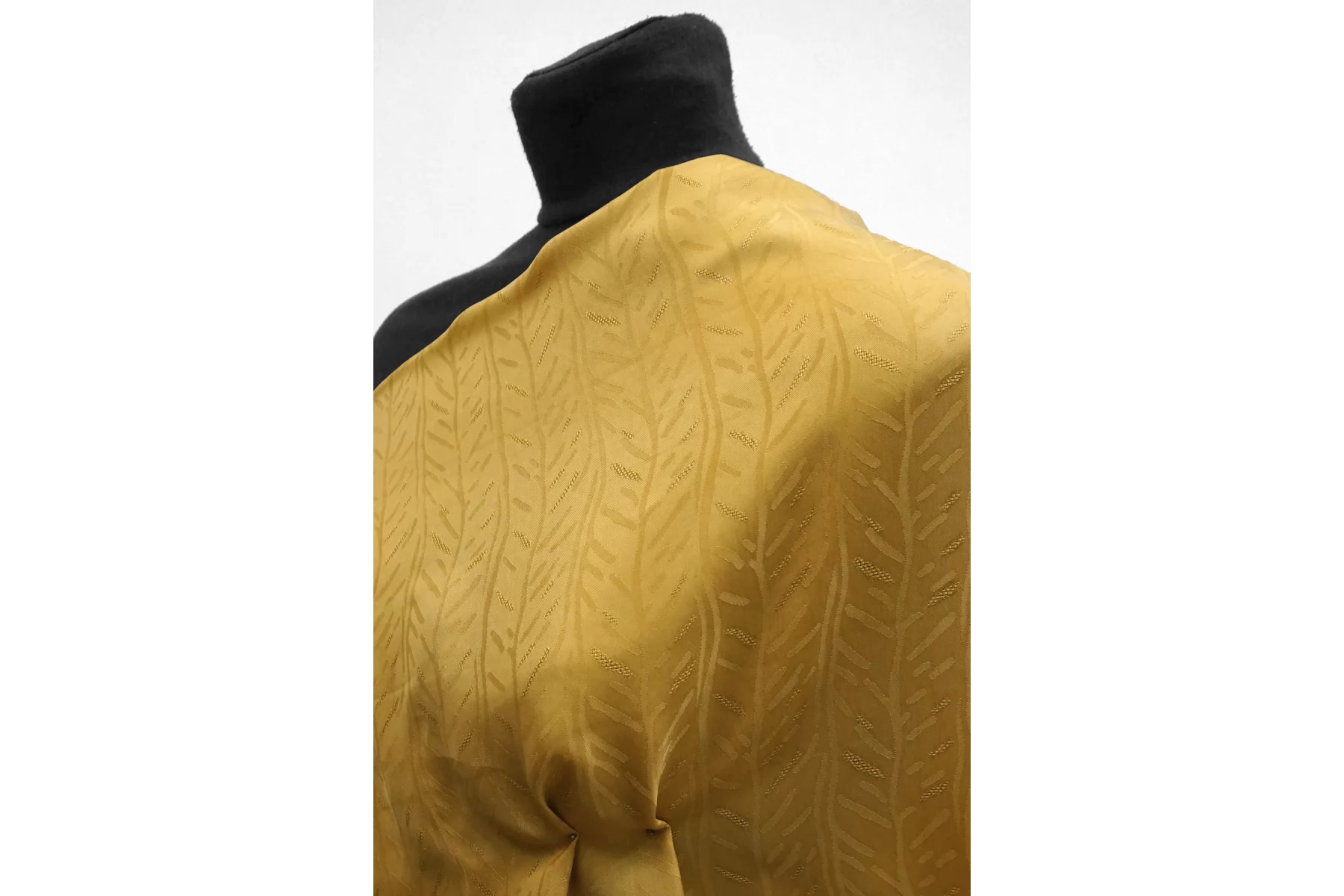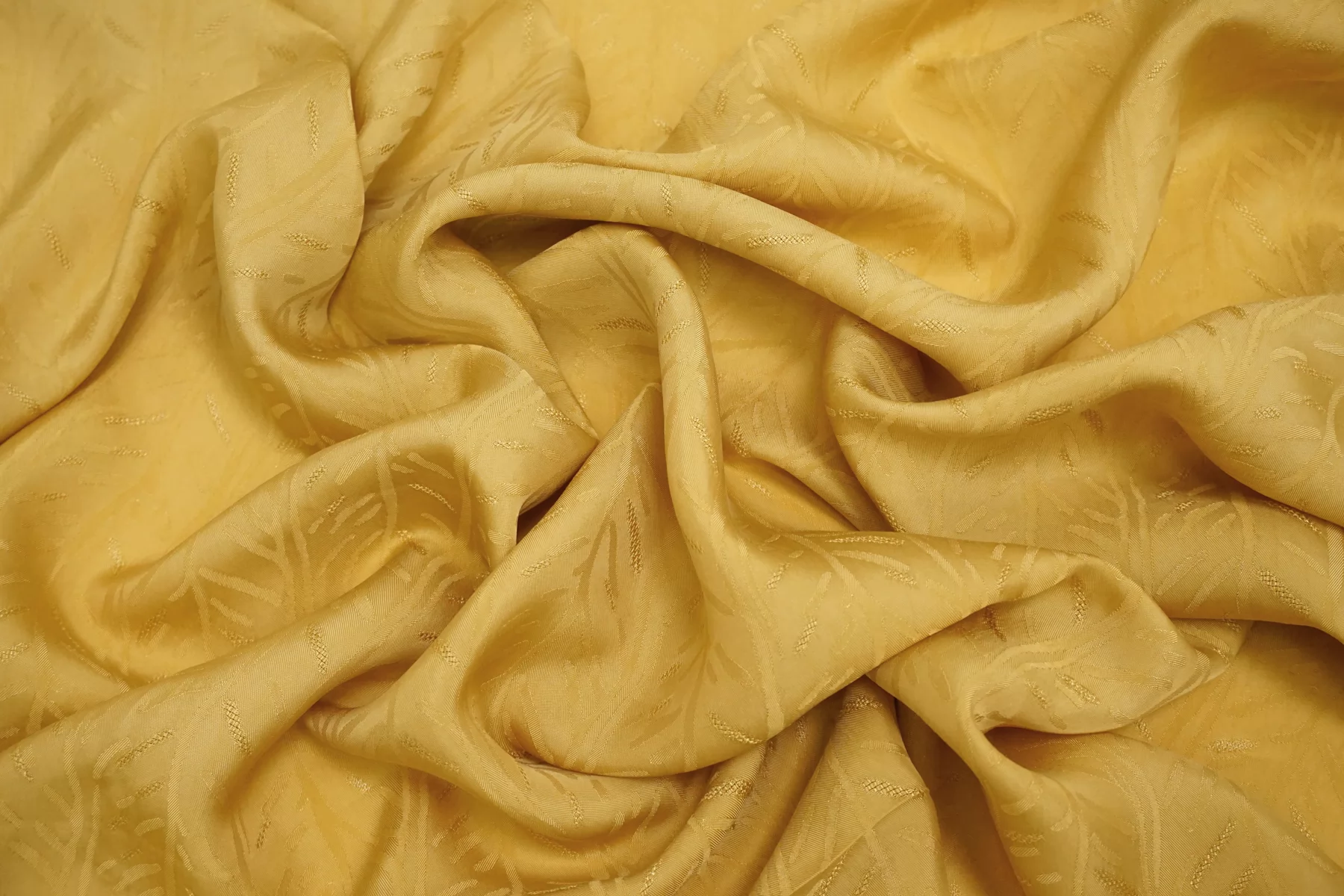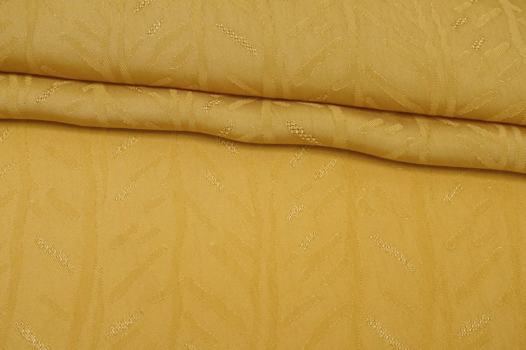 Красивая плательная вискоза, с жаккардовой орнаментальной выработкой. Цвет разбелённый, горчично-жёлтый. Пластичная, гладкая, скользящая ткань. Минимально просвечивает силуэт. Не тянется. Немного мнется. Красива в движении. Форму слегка держит. Прекрасно подойдет на платья, блузки, юбки. При необходимости используйте подкладочный материал. Обязательно учитывайте усадку порядка 5-10%