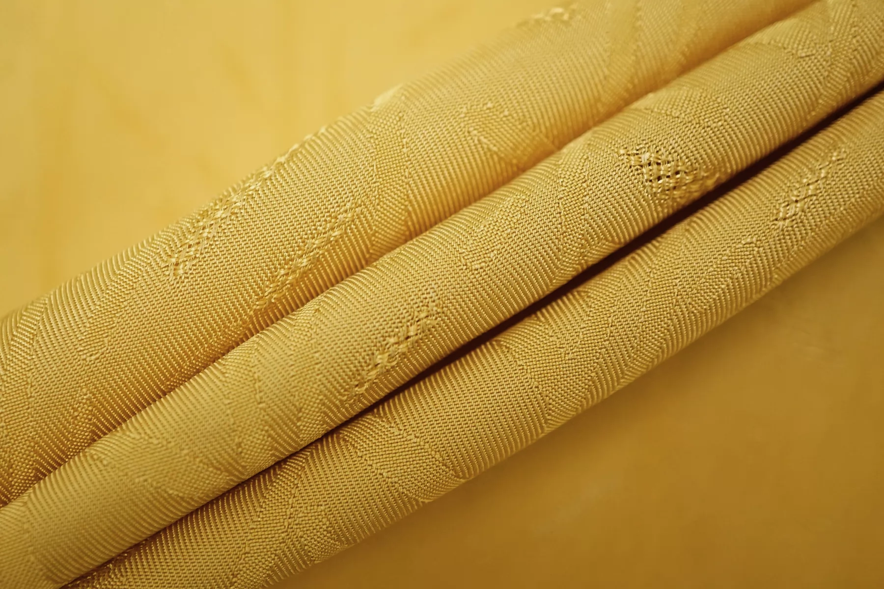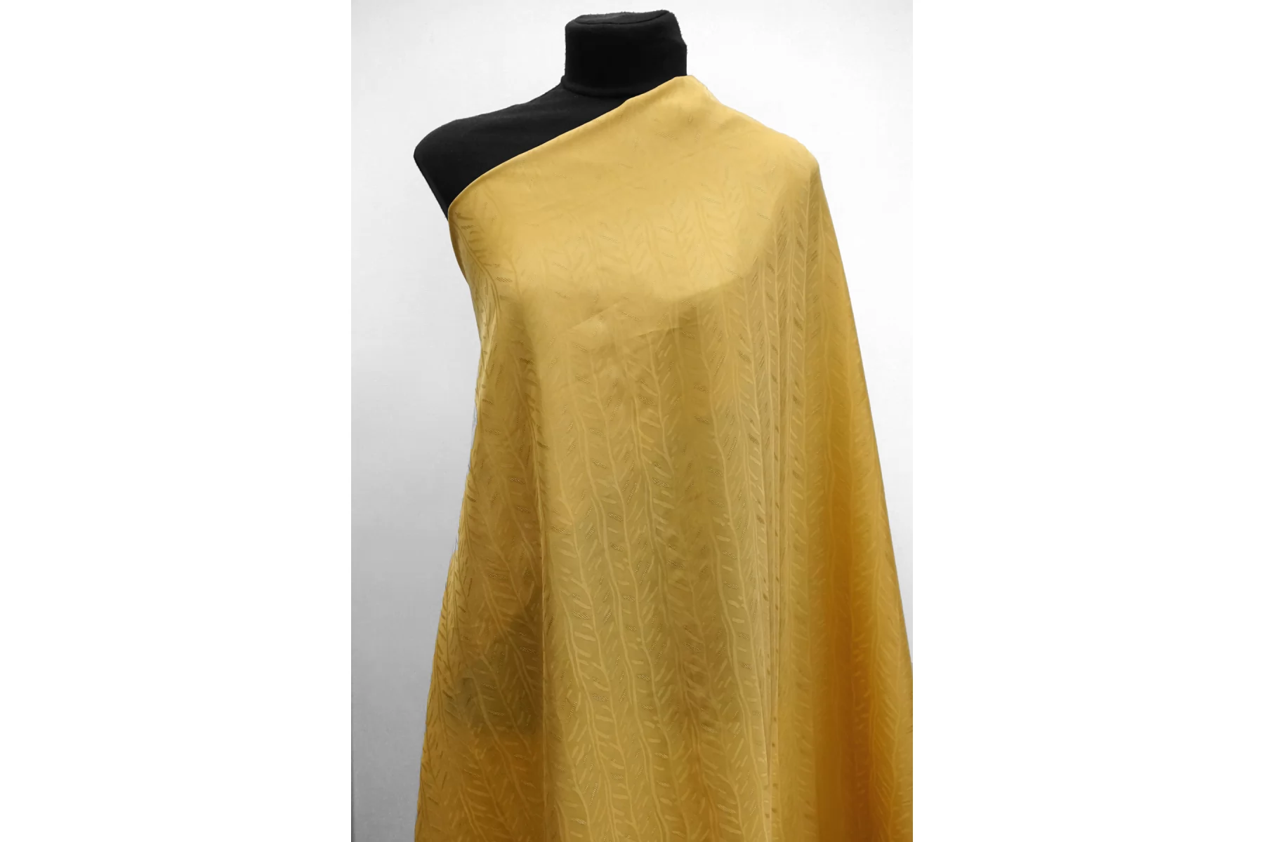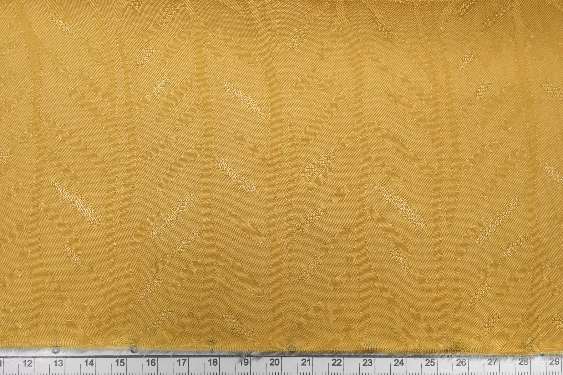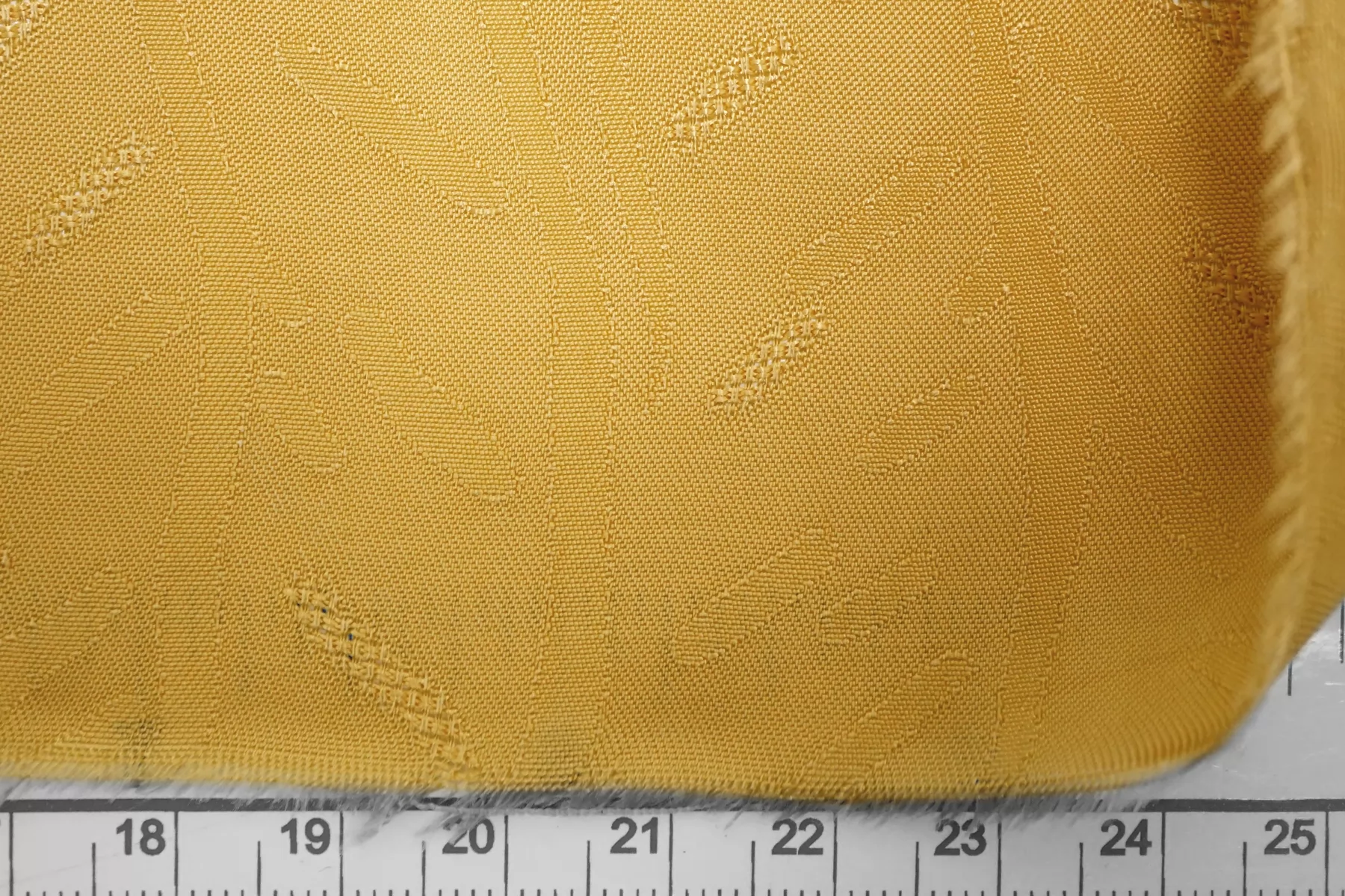 Красивая плательная вискоза, с жаккардовой орнаментальной выработкой. Цвет разбелённый, горчично-жёлтый. Пластичная, гладкая, скользящая ткань. Минимально просвечивает силуэт. Не тянется. Немного мнется. Красива в движении. Форму слегка держит. Прекрасно подойдет на платья, блузки, юбки. При необходимости используйте подкладочный материал. Обязательно учитывайте усадку порядка 5-10%